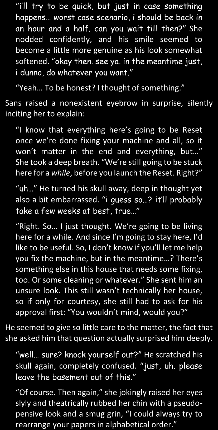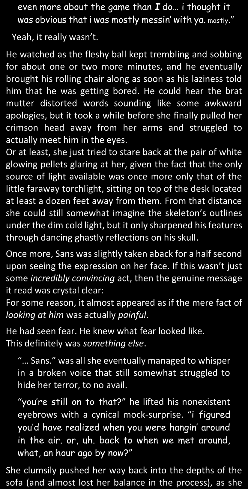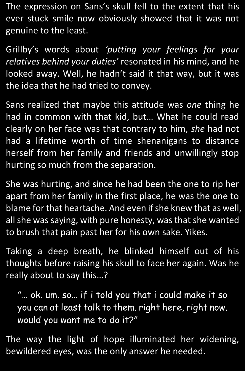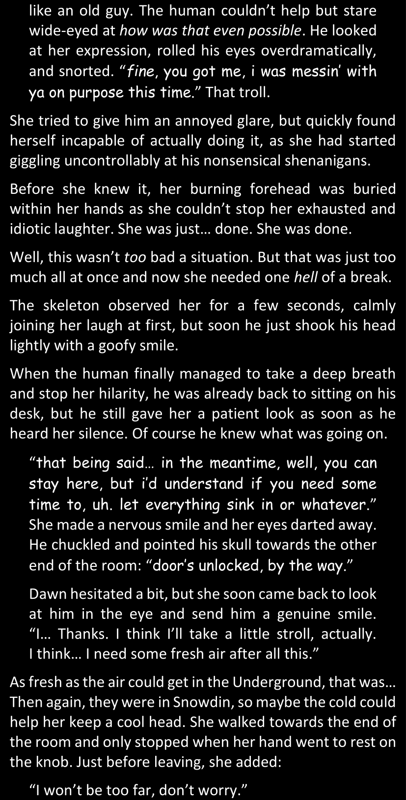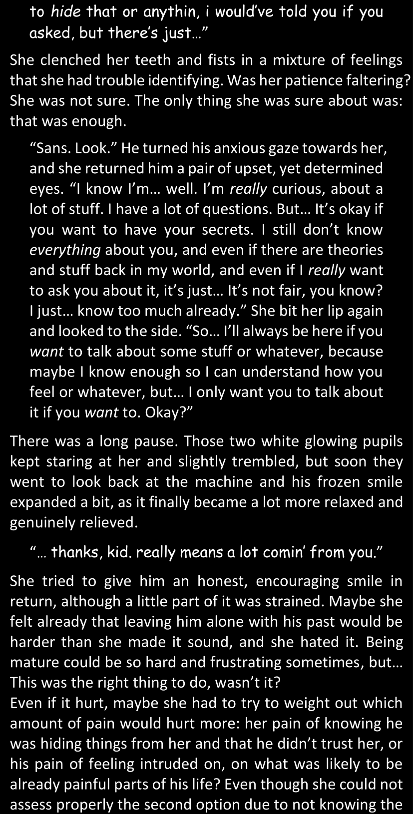 There was no worded response from Definitely-Not-Sans. She thought she might have heard a distant outburst of laughter, but it stopped abruptly and she hadn’t seen him move. He was still standing in the shadows, staring at her with an unreadable total lack of expression, both his hands deeply buried into his pockets.