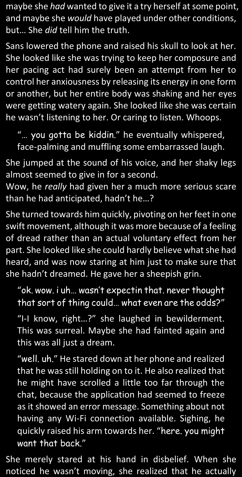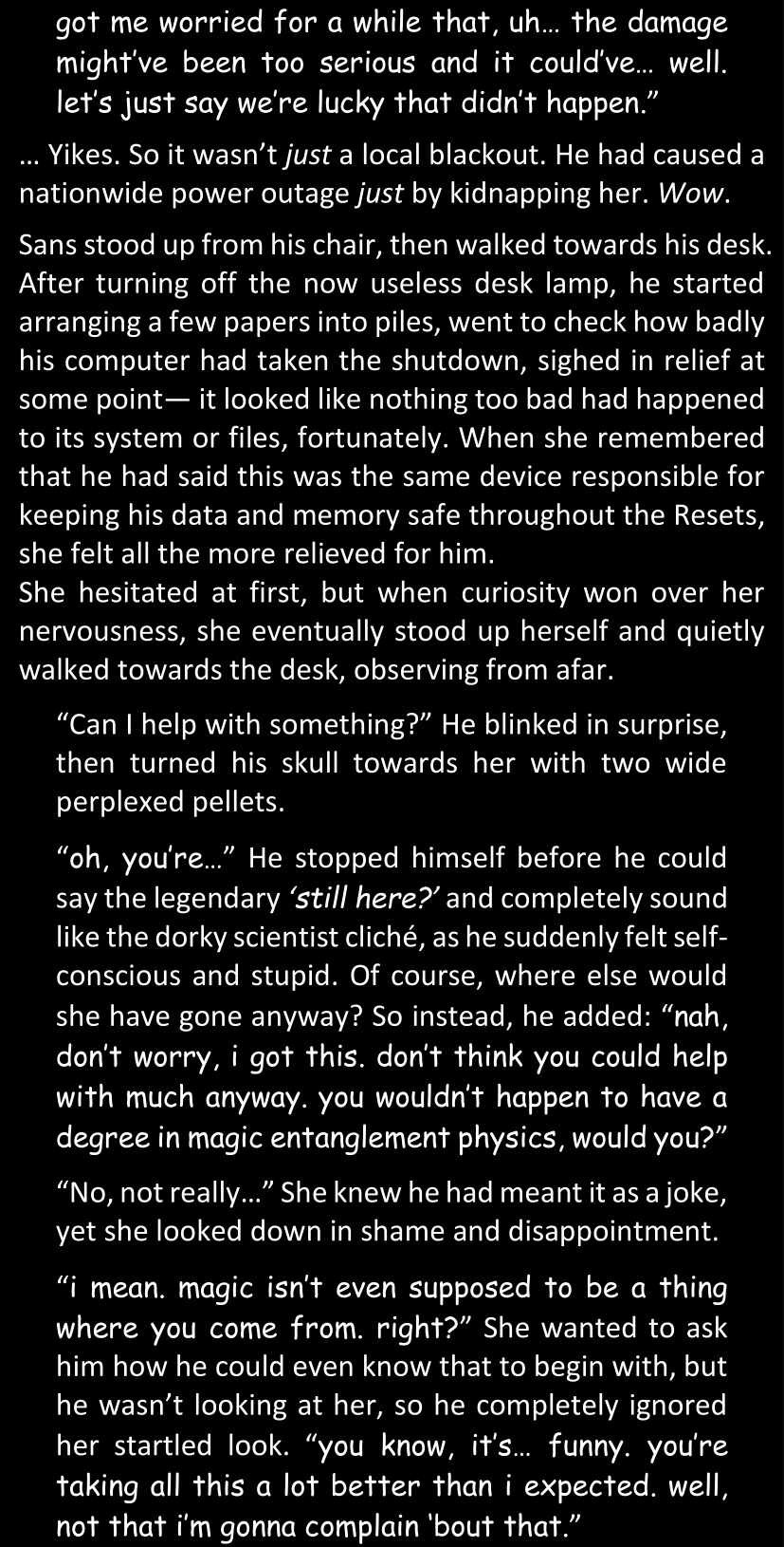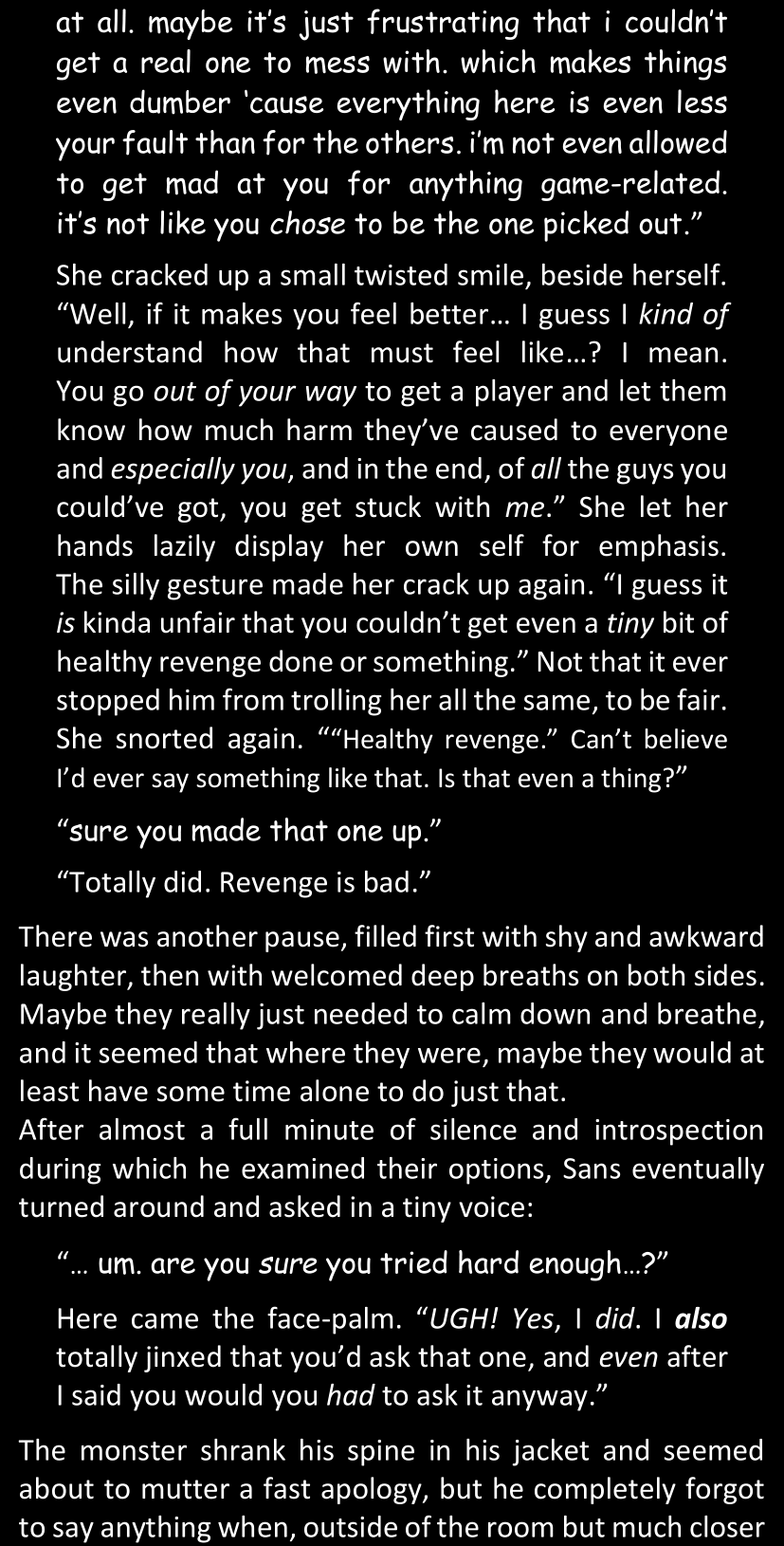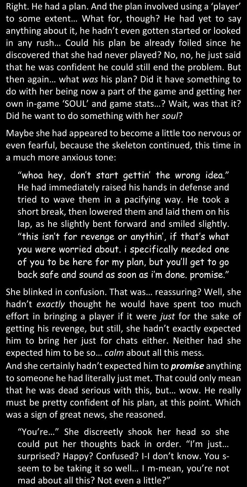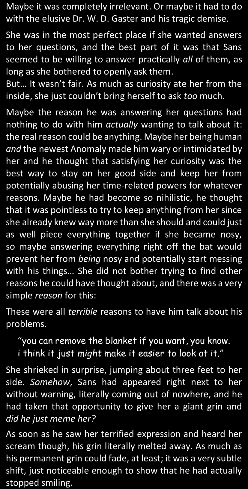 There was no worded response from Definitely-Not-Sans. She thought she might have heard a distant outburst of laughter, but it stopped abruptly and she hadn’t seen him move. He was still standing in the shadows, staring at her with an unreadable total lack of expression, both his hands deeply buried into his pockets.