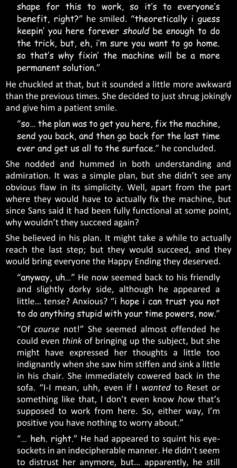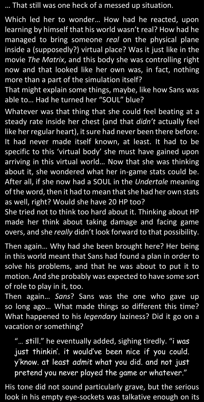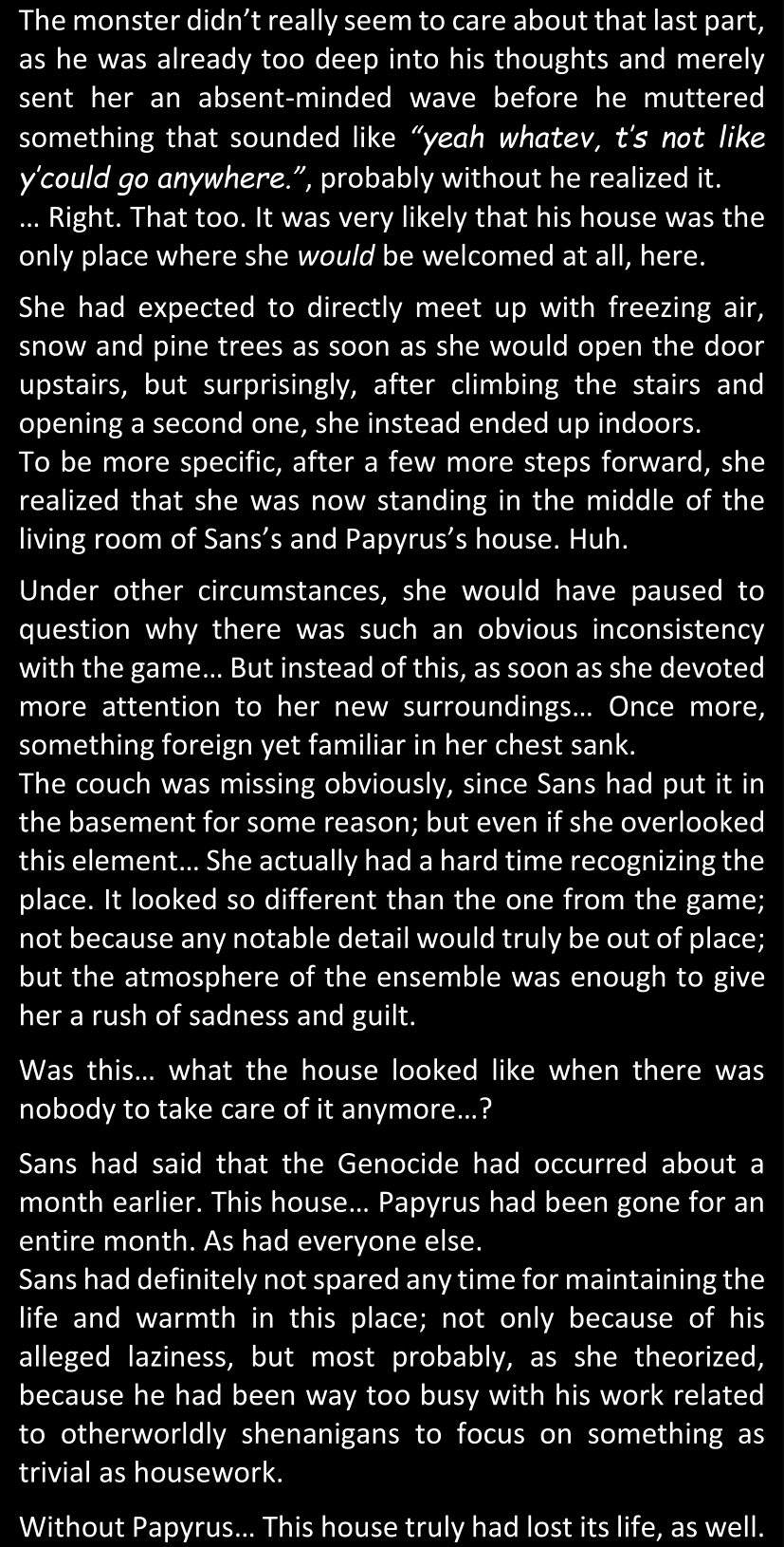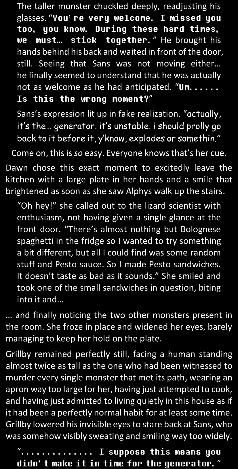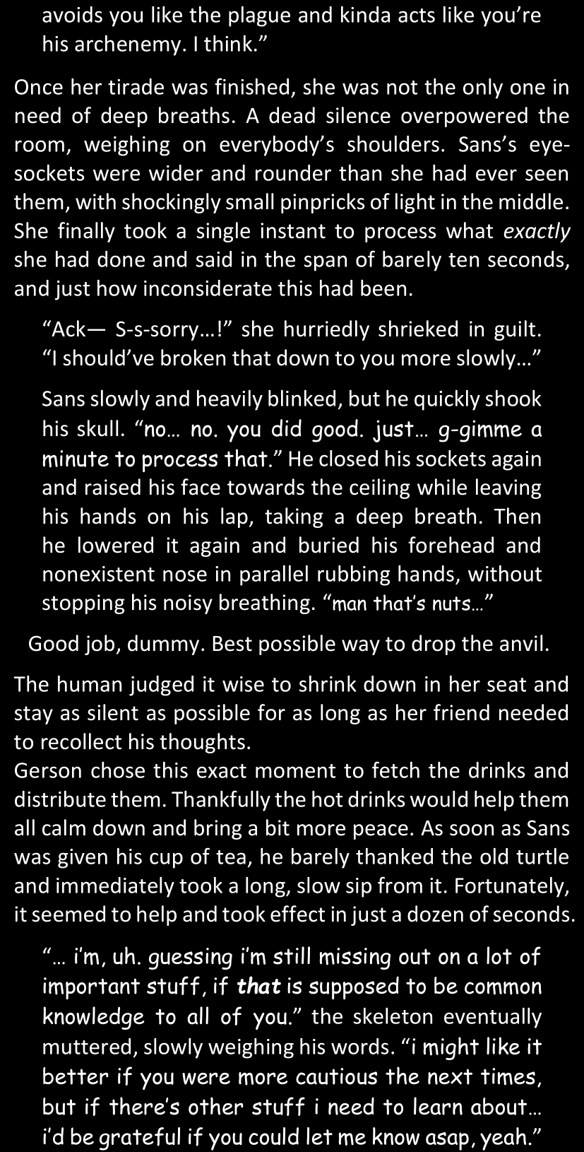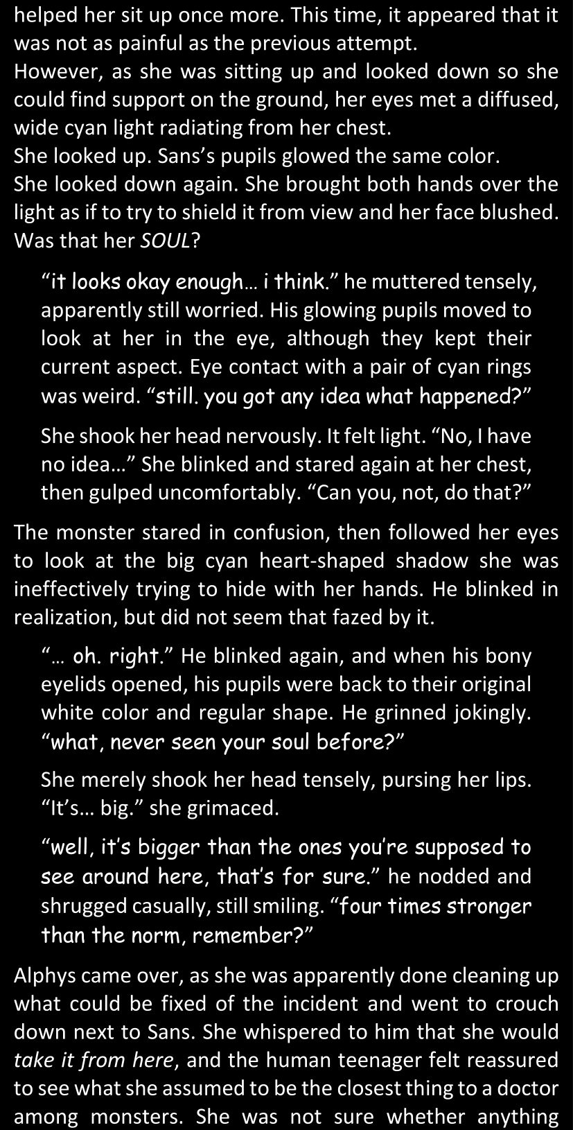 There was no worded response from Definitely-Not-Sans. She thought she might have heard a distant outburst of laughter, but it stopped abruptly and she hadn’t seen him move. He was still standing in the shadows, staring at her with an unreadable total lack of expression, both his hands deeply buried into his pockets.