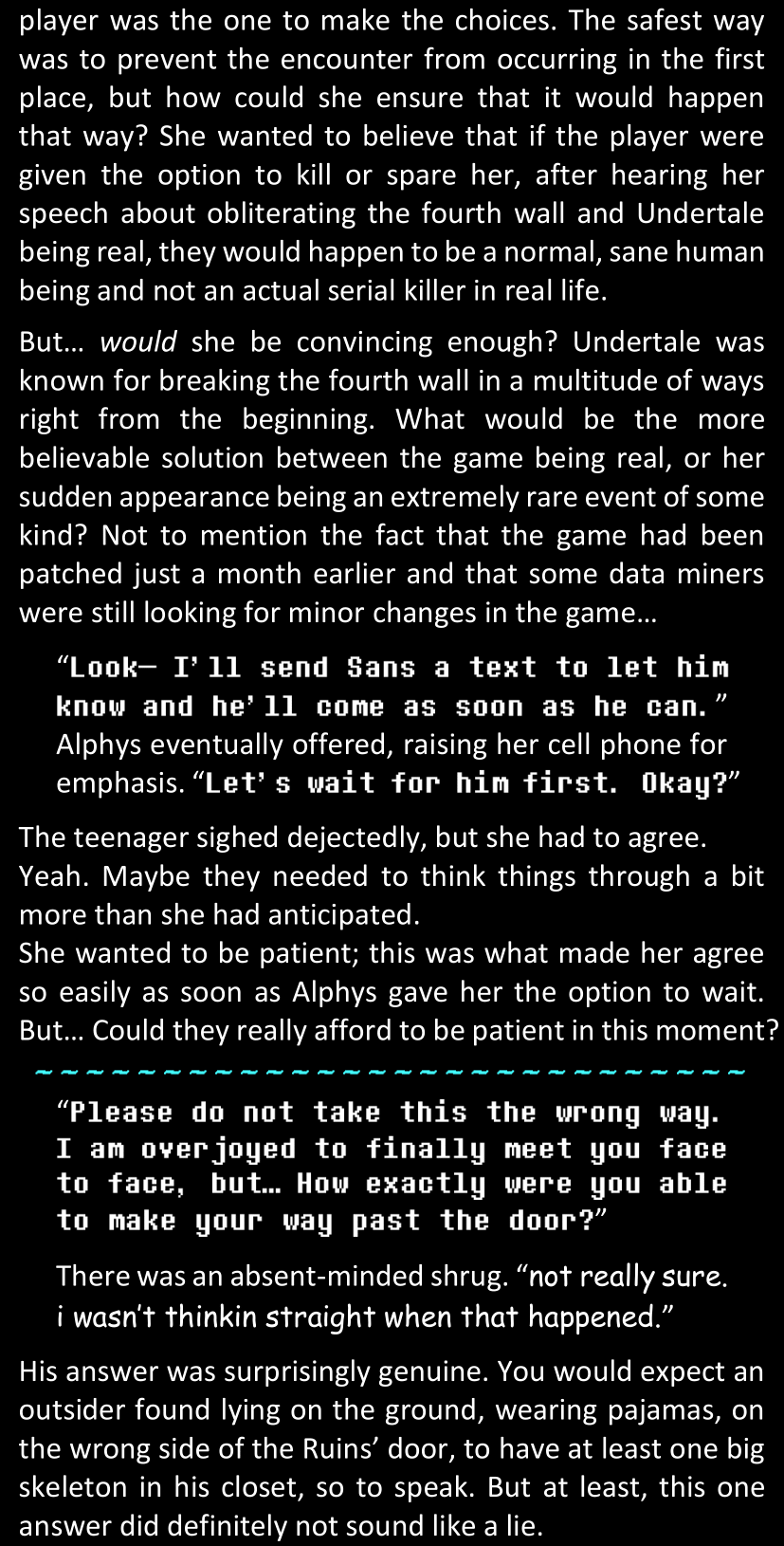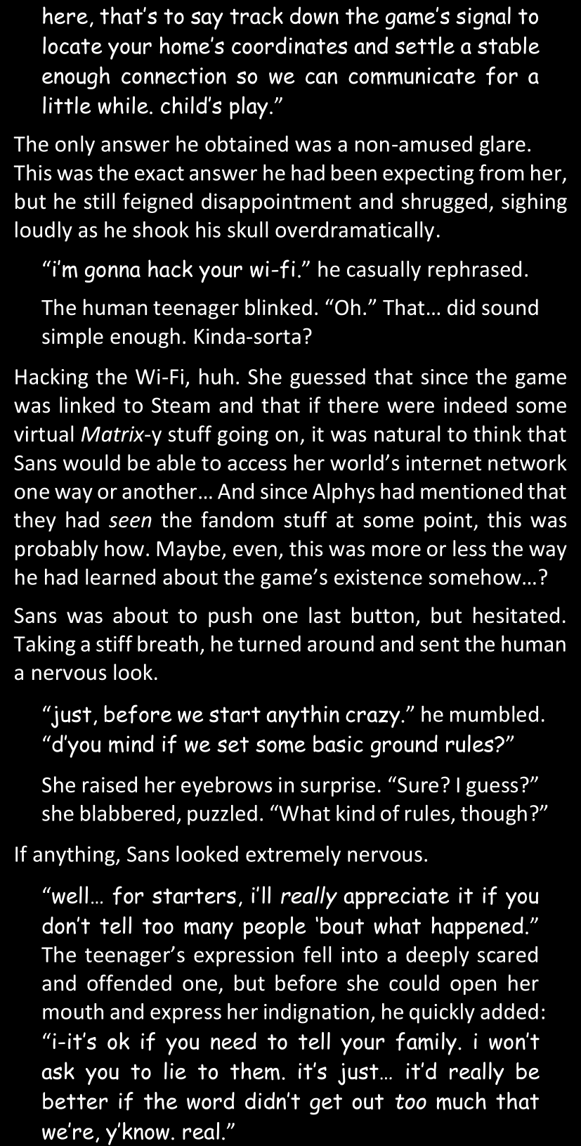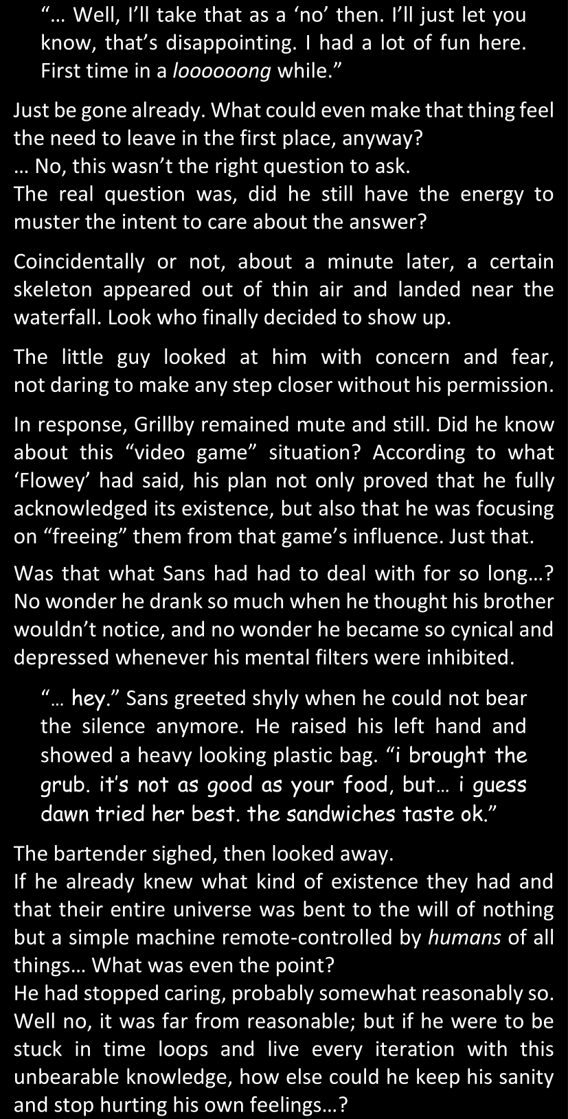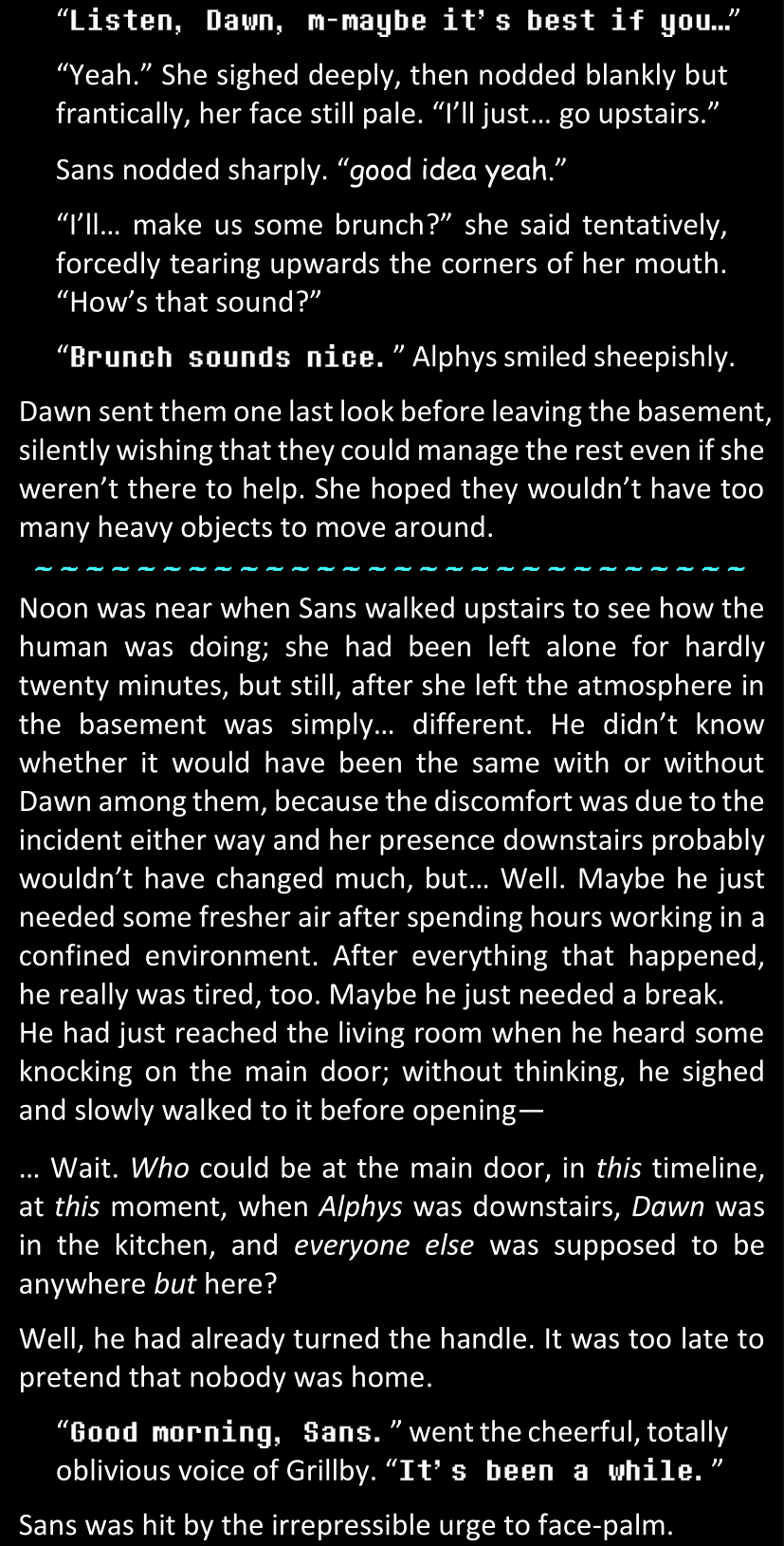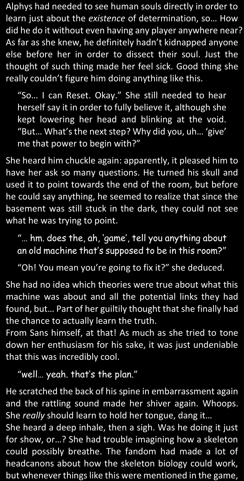 There was no worded response from Definitely-Not-Sans. She thought she might have heard a distant outburst of laughter, but it stopped abruptly and she hadn’t seen him move. He was still standing in the shadows, staring at her with an unreadable total lack of expression, both his hands deeply buried into his pockets.