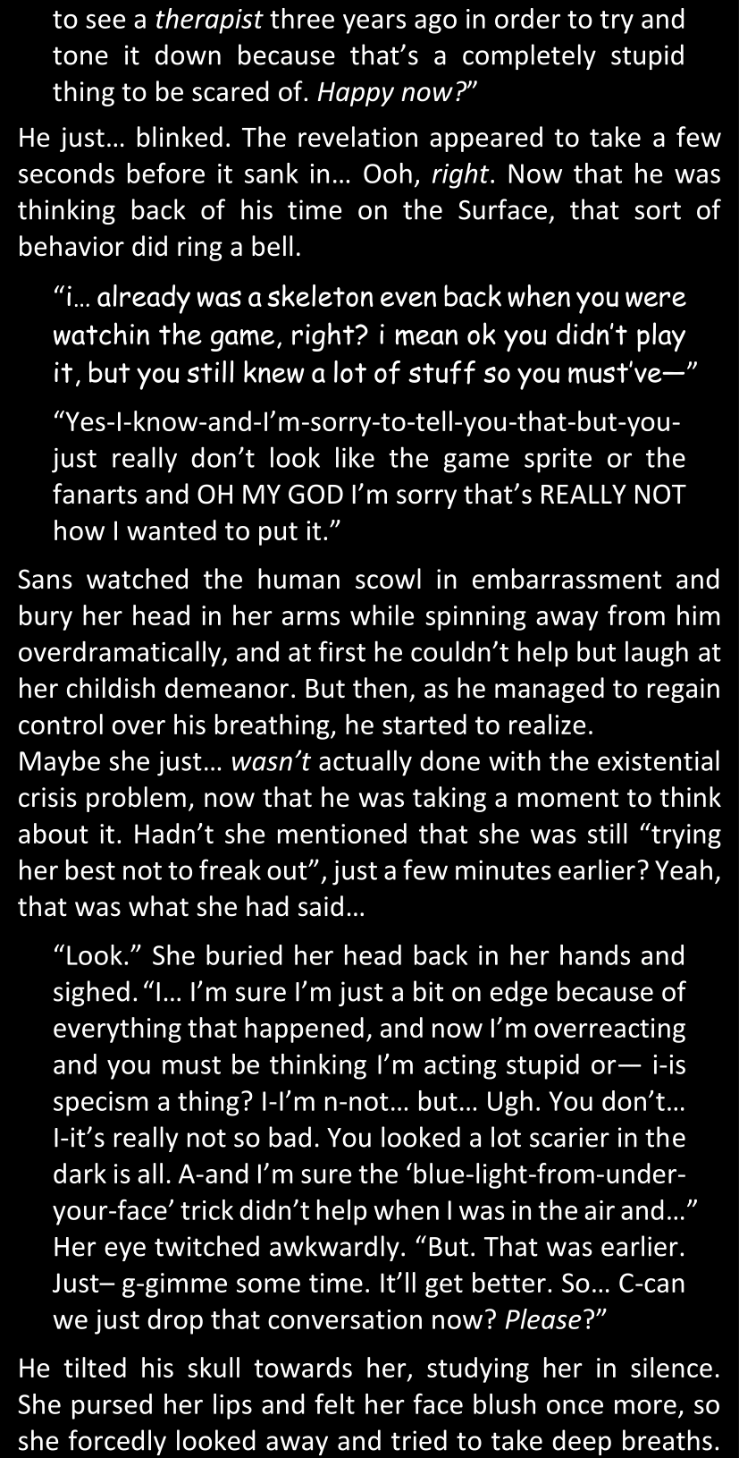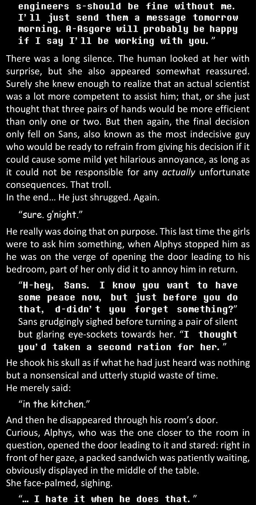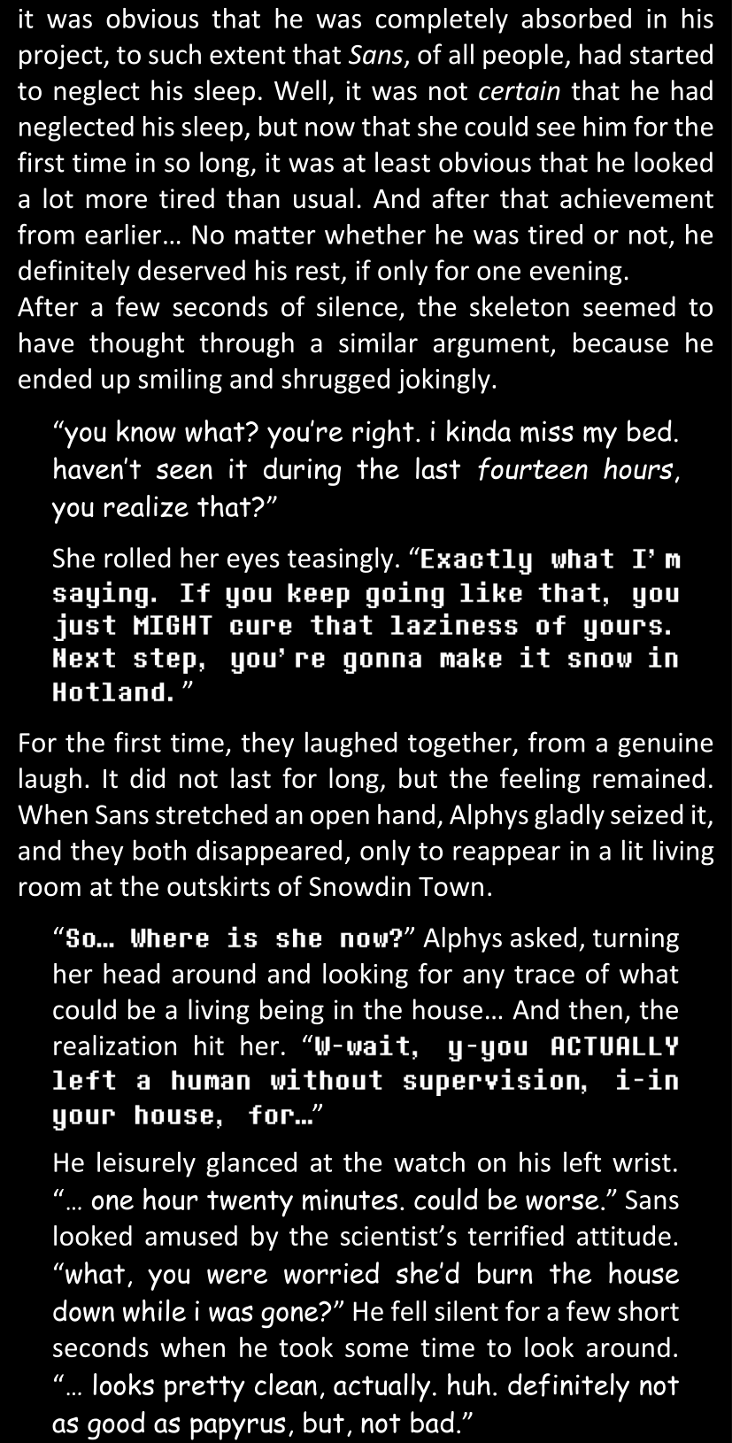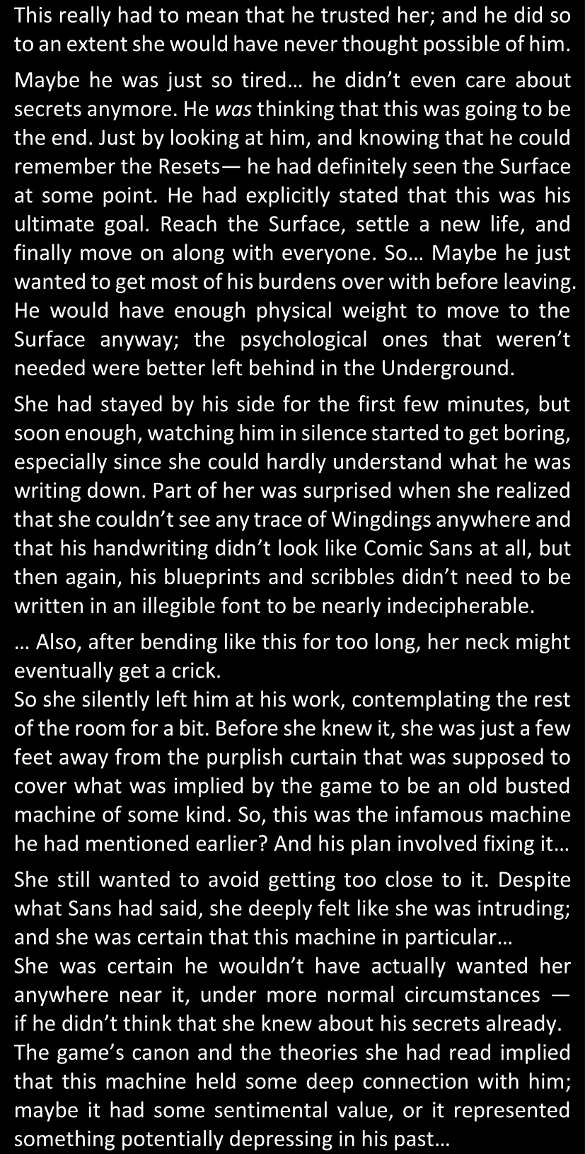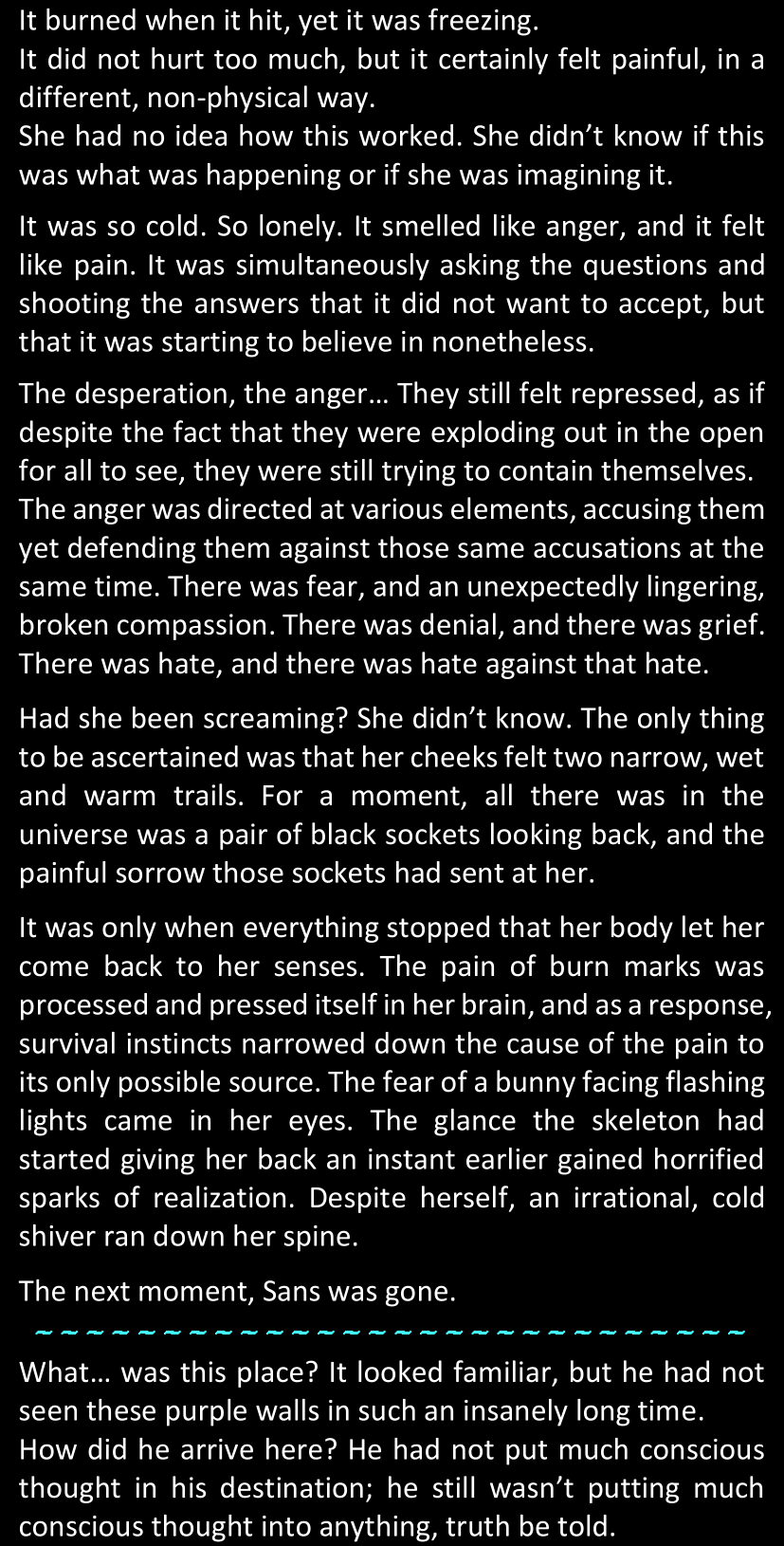 There was no worded response from Definitely-Not-Sans. She thought she might have heard a distant outburst of laughter, but it stopped abruptly and she hadn’t seen him move. He was still standing in the shadows, staring at her with an unreadable total lack of expression, both his hands deeply buried into his pockets.