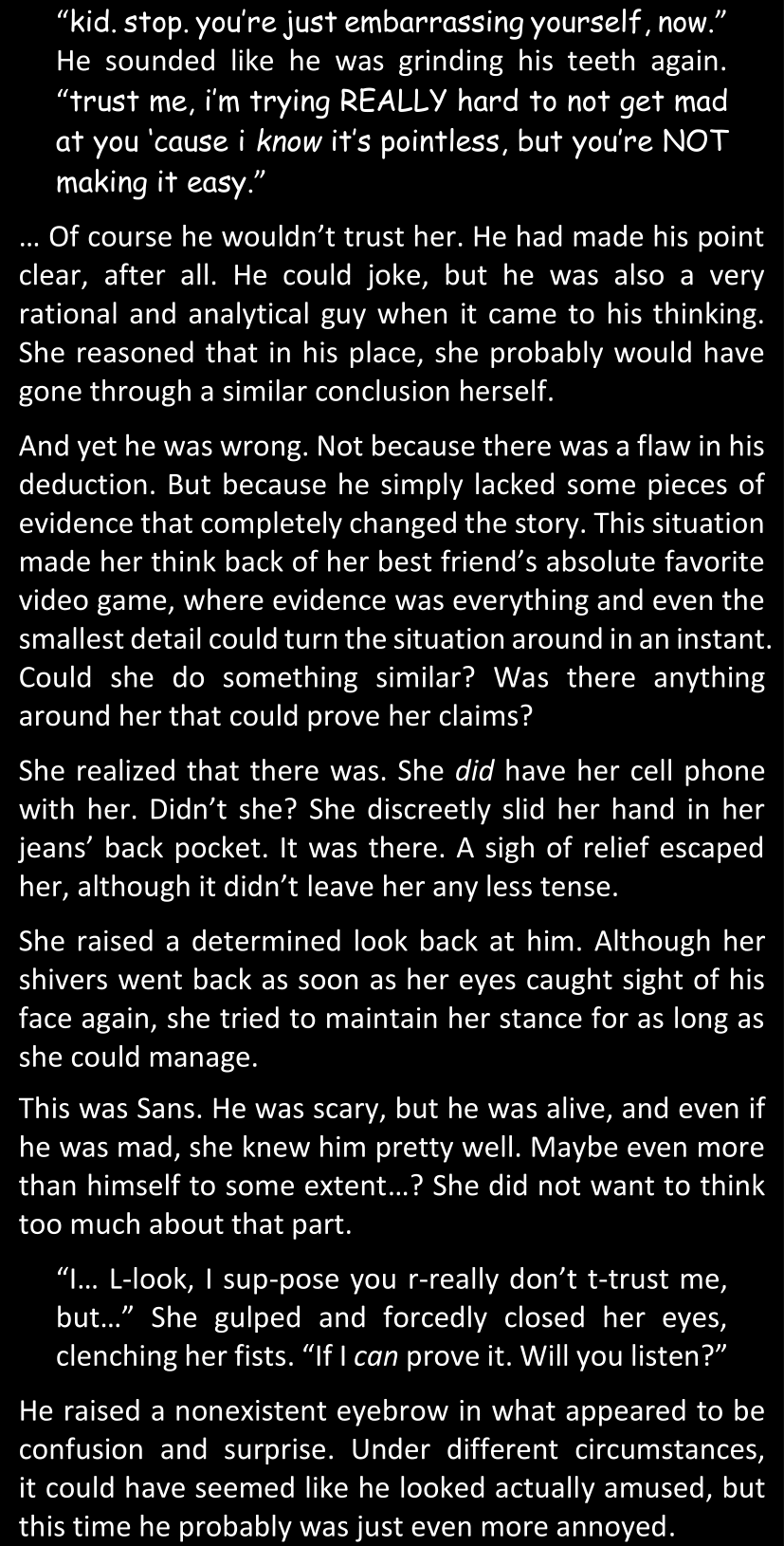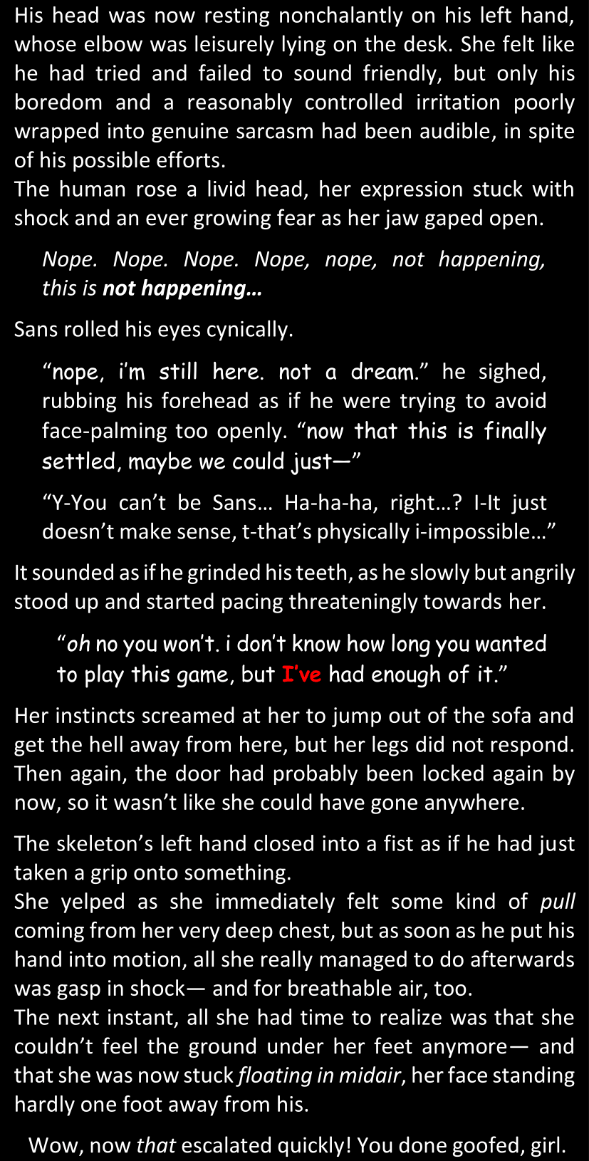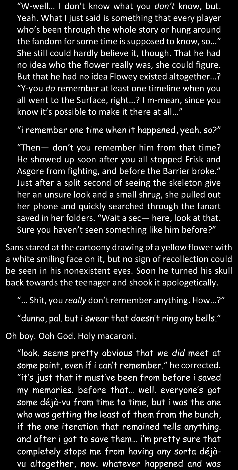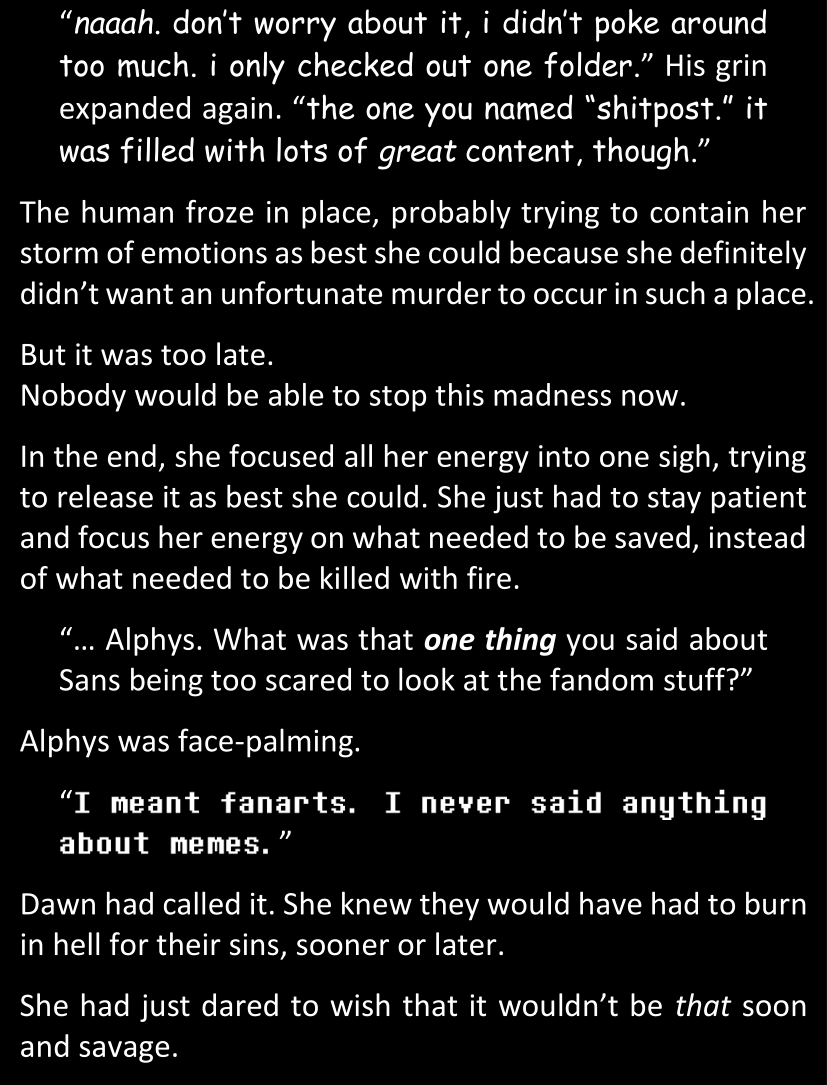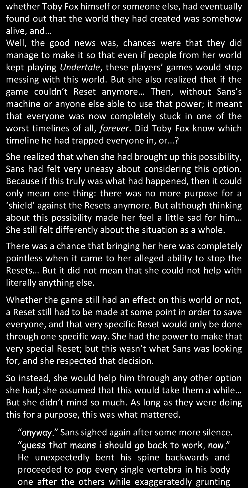 There was no worded response from Definitely-Not-Sans. She thought she might have heard a distant outburst of laughter, but it stopped abruptly and she hadn’t seen him move. He was still standing in the shadows, staring at her with an unreadable total lack of expression, both his hands deeply buried into his pockets.