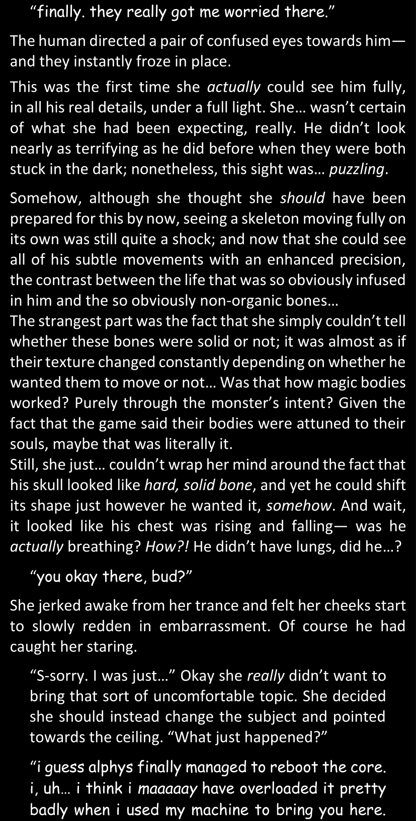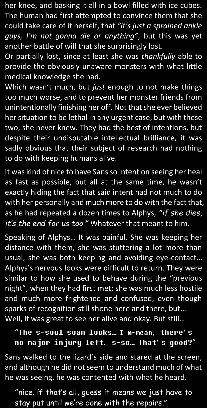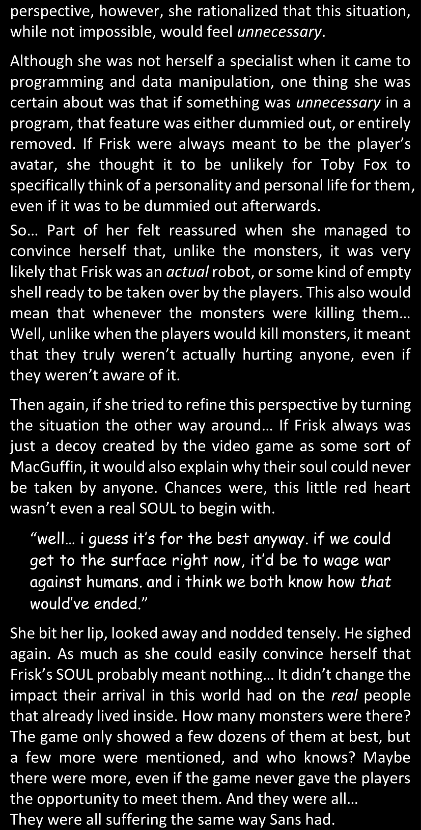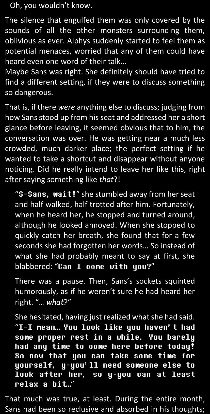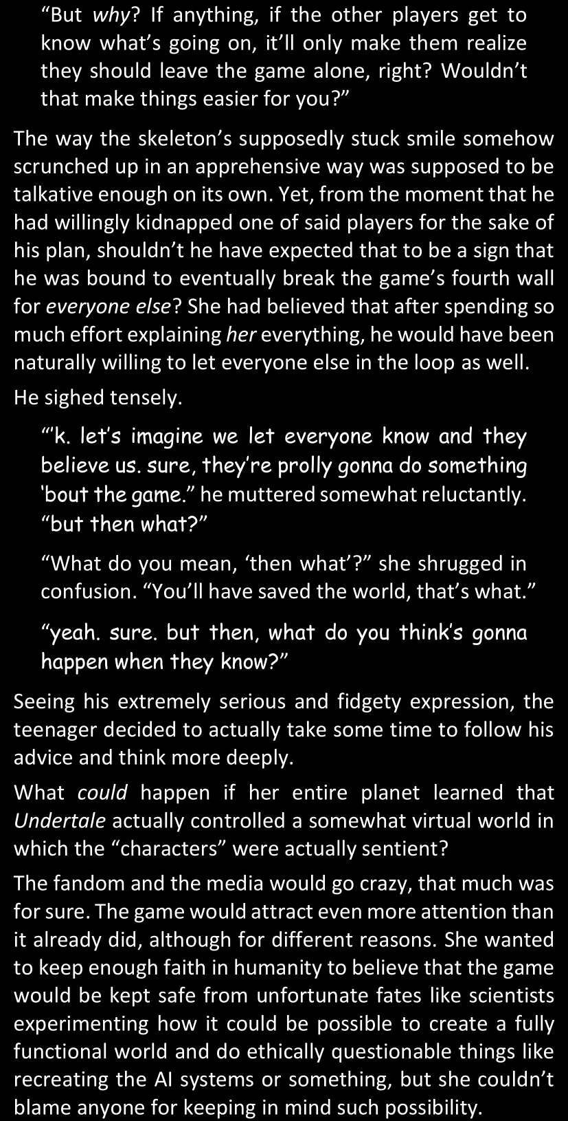 There was no worded response from Definitely-Not-Sans. She thought she might have heard a distant outburst of laughter, but it stopped abruptly and she hadn’t seen him move. He was still standing in the shadows, staring at her with an unreadable total lack of expression, both his hands deeply buried into his pockets.