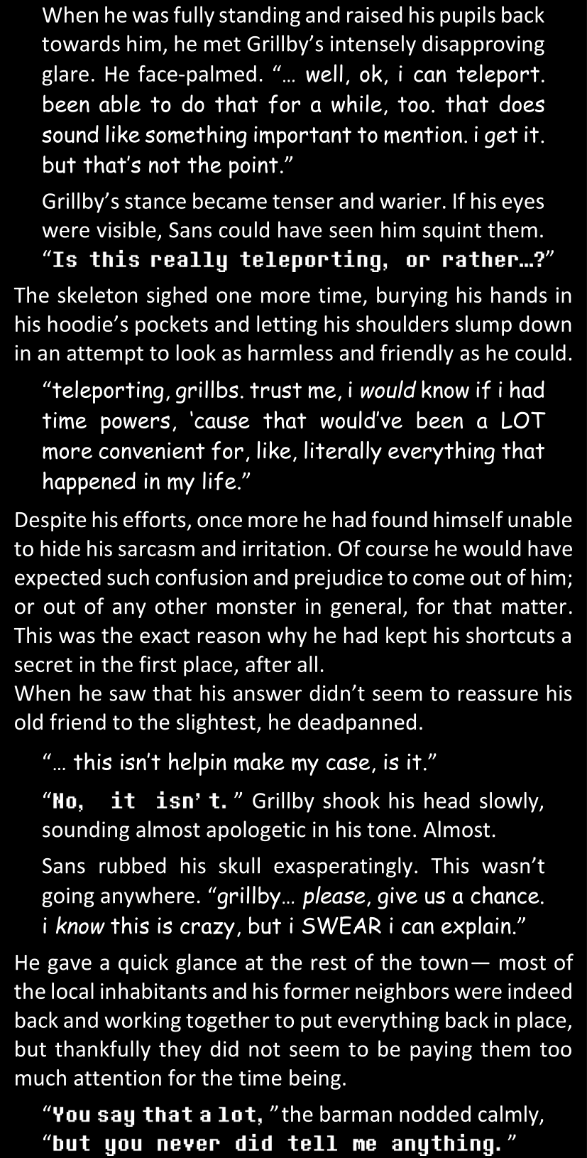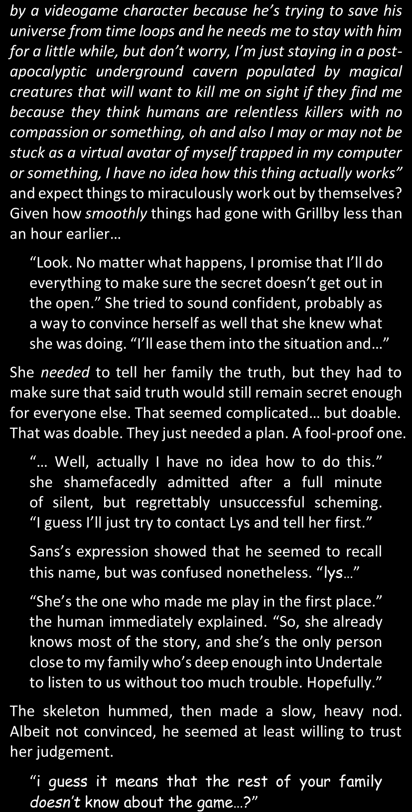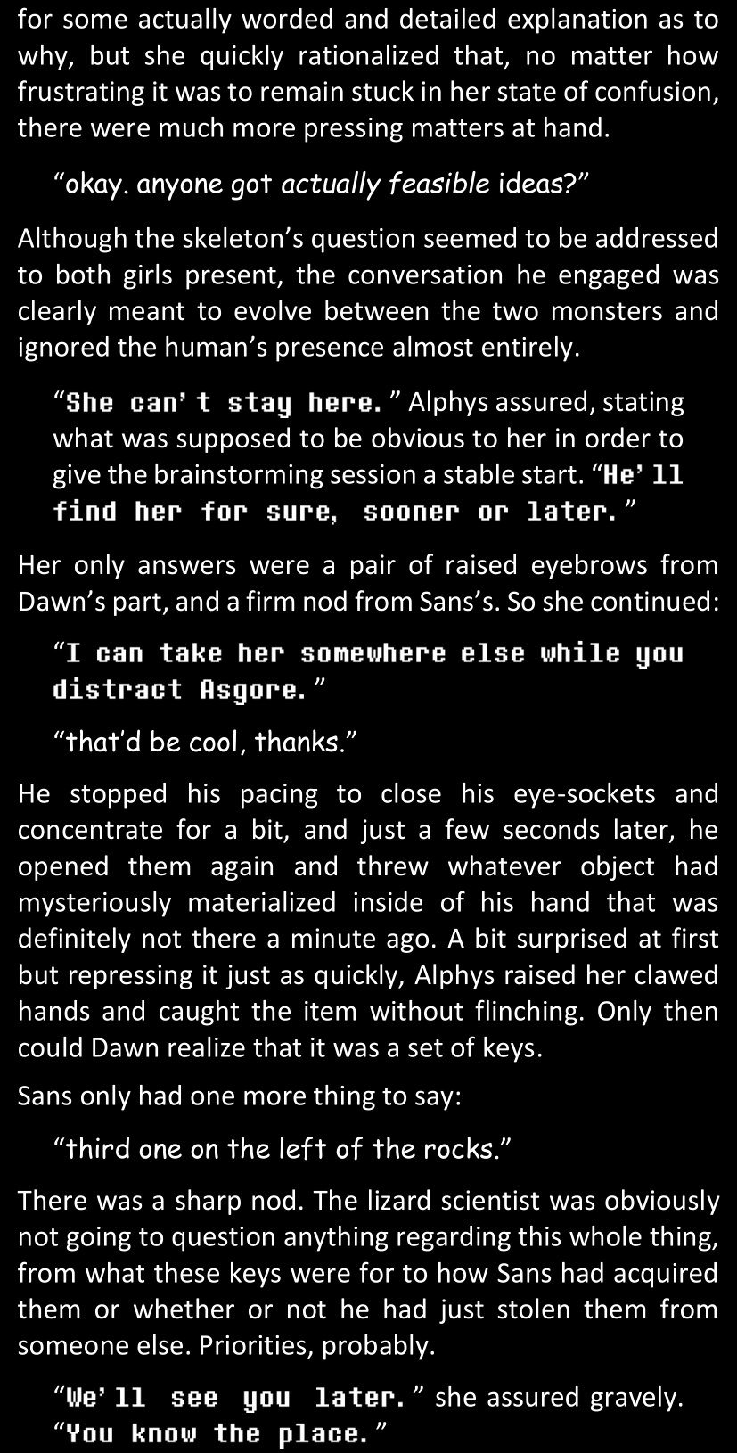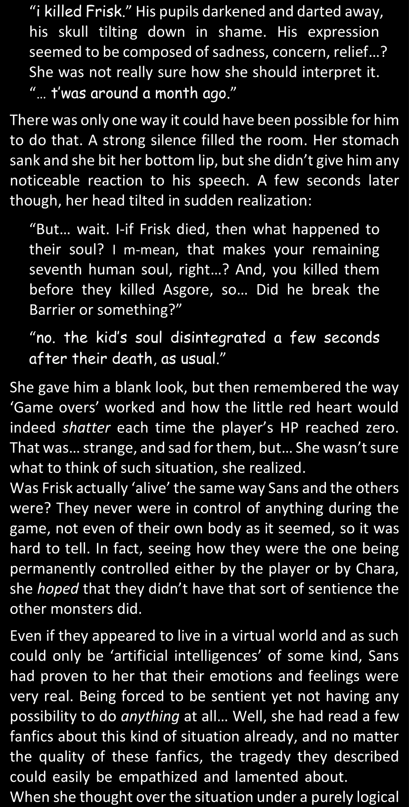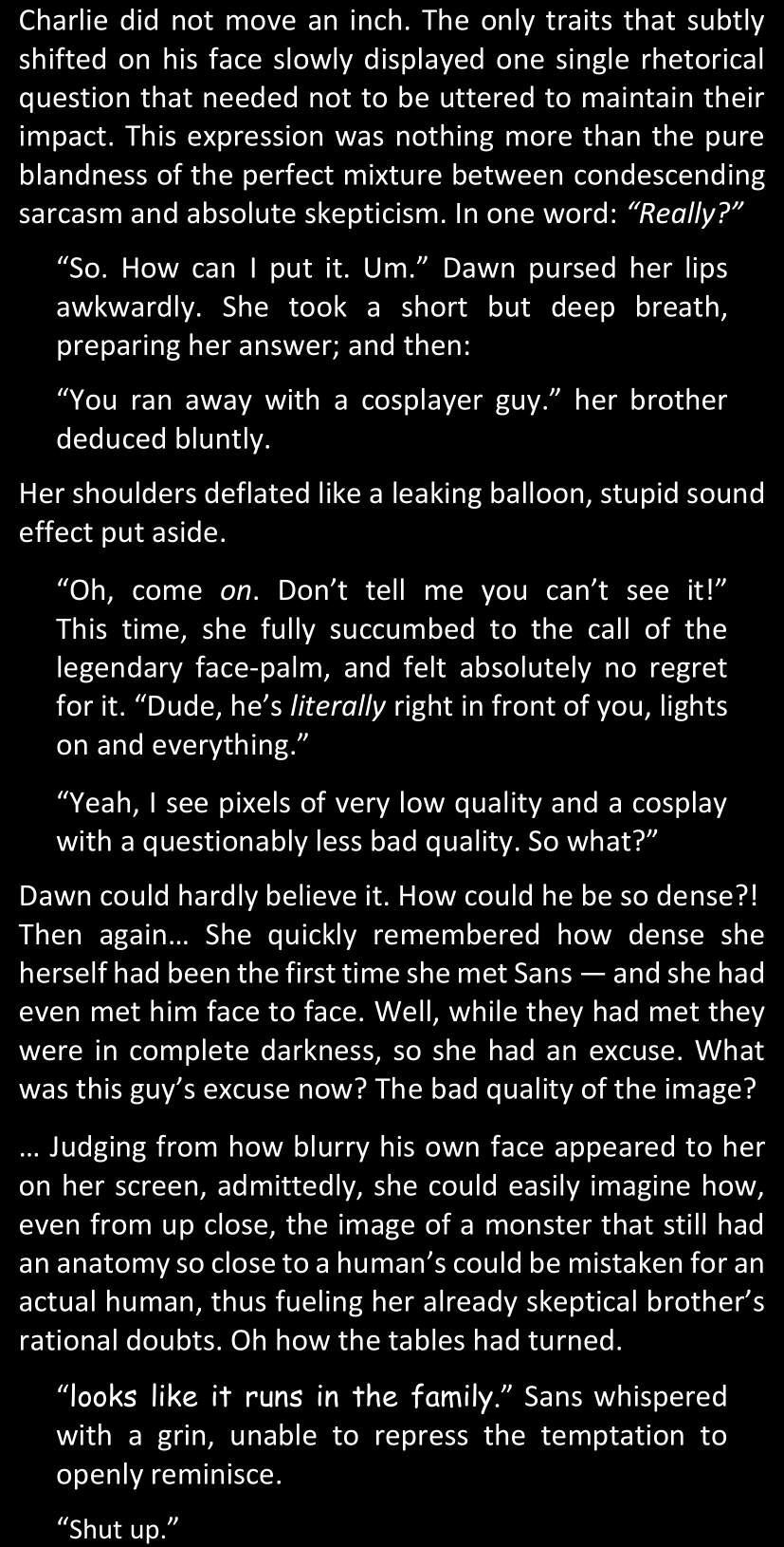 There was no worded response from Definitely-Not-Sans. She thought she might have heard a distant outburst of laughter, but it stopped abruptly and she hadn’t seen him move. He was still standing in the shadows, staring at her with an unreadable total lack of expression, both his hands deeply buried into his pockets.
