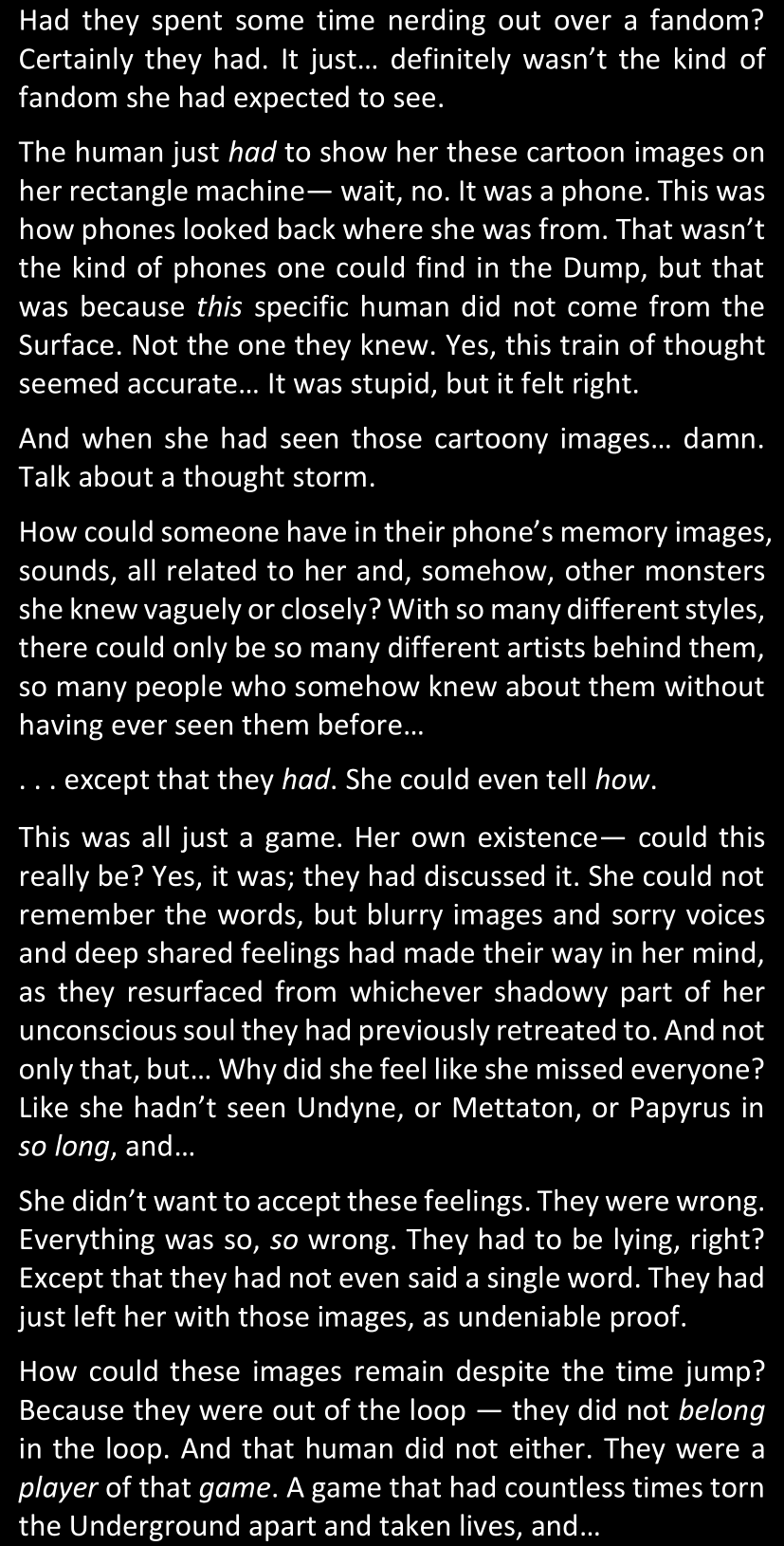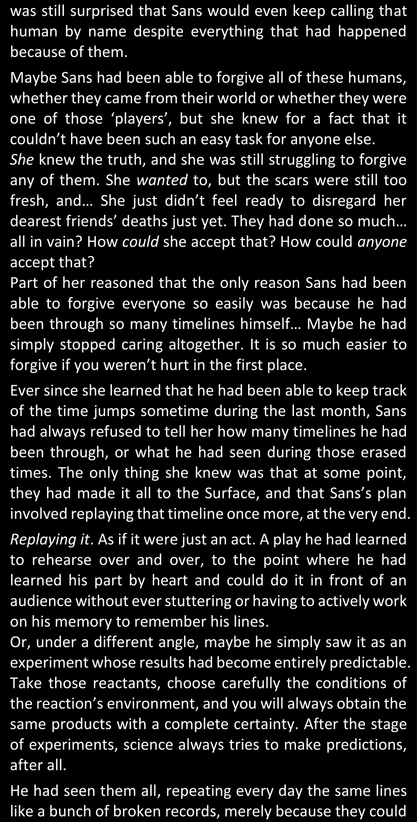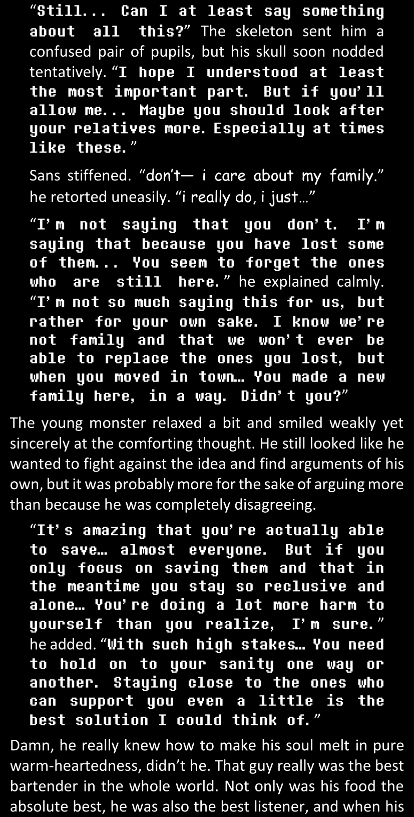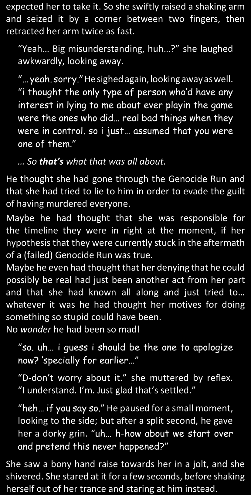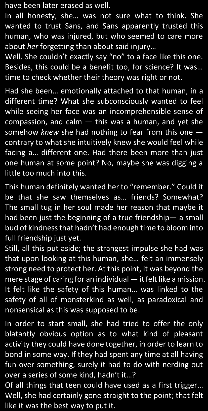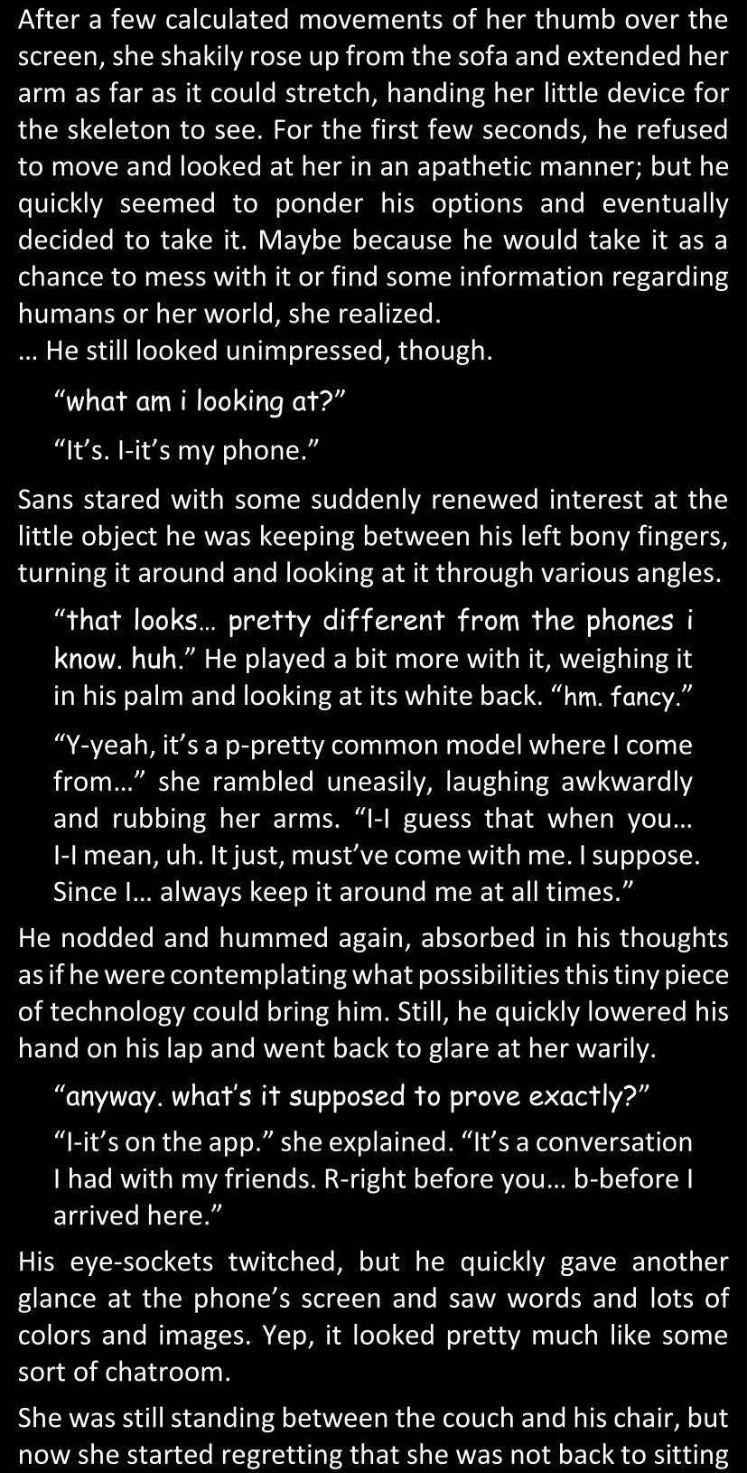 There was no worded response from Definitely-Not-Sans. She thought she might have heard a distant outburst of laughter, but it stopped abruptly and she hadn’t seen him move. He was still standing in the shadows, staring at her with an unreadable total lack of expression, both his hands deeply buried into his pockets.