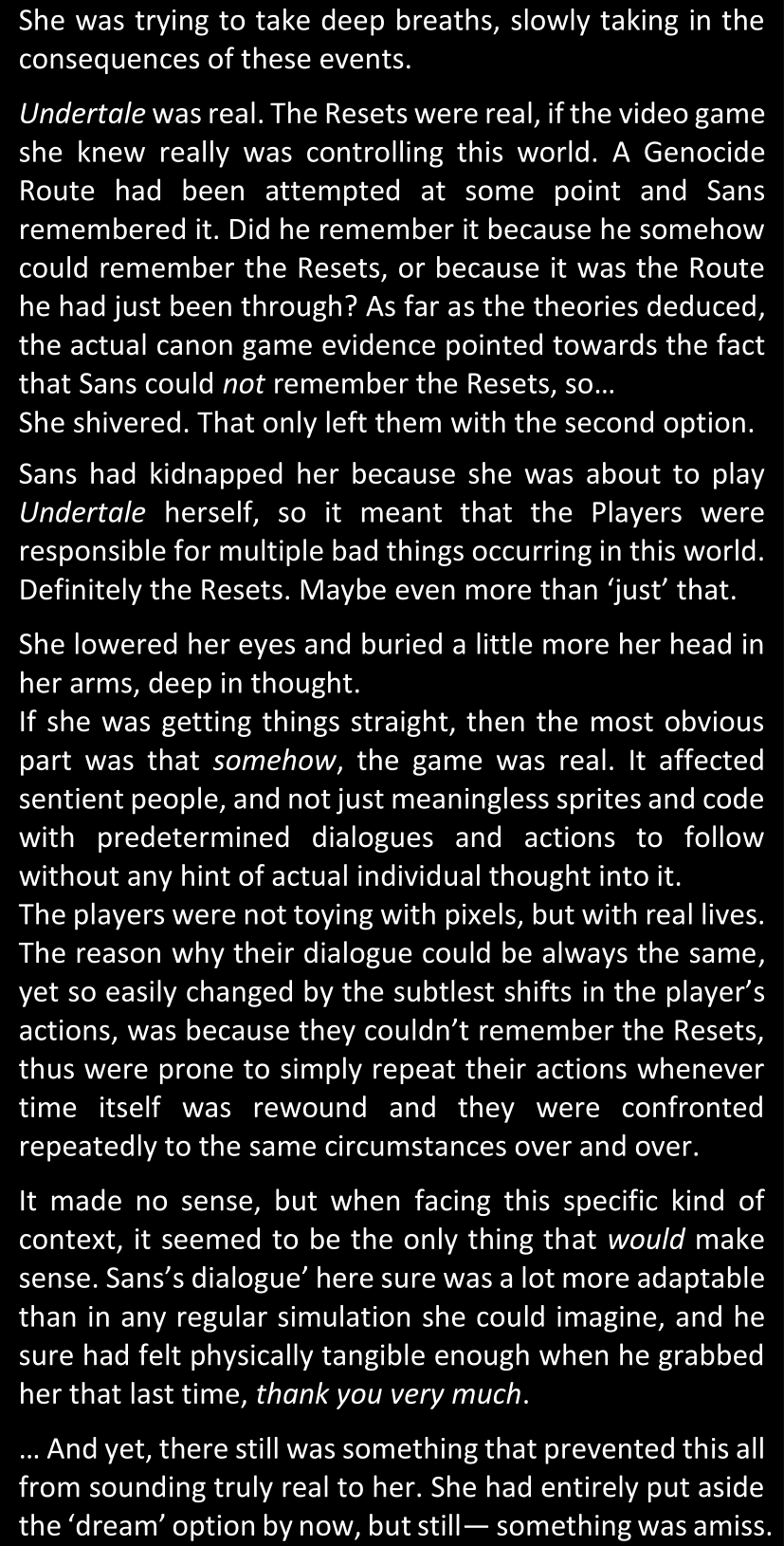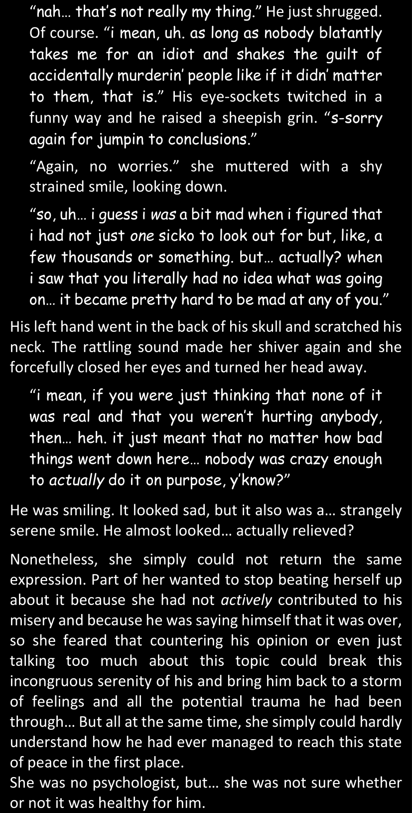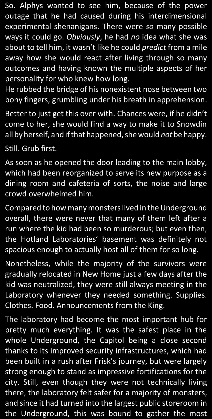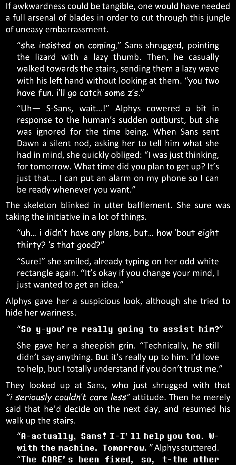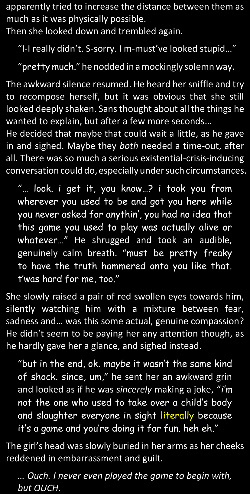 There was no worded response from Definitely-Not-Sans. She thought she might have heard a distant outburst of laughter, but it stopped abruptly and she hadn’t seen him move. He was still standing in the shadows, staring at her with an unreadable total lack of expression, both his hands deeply buried into his pockets.