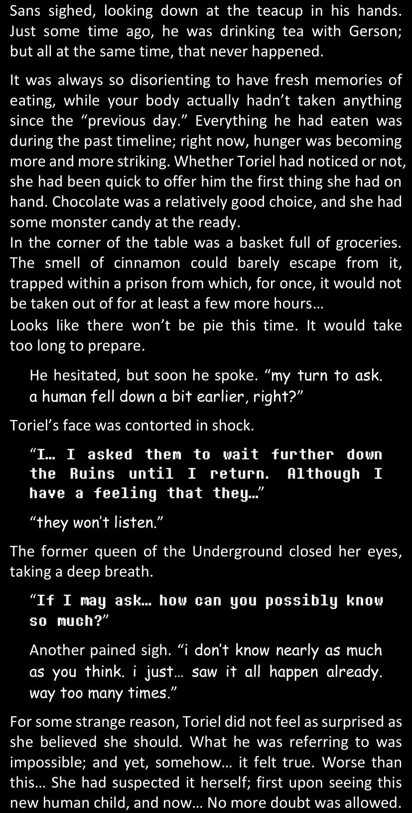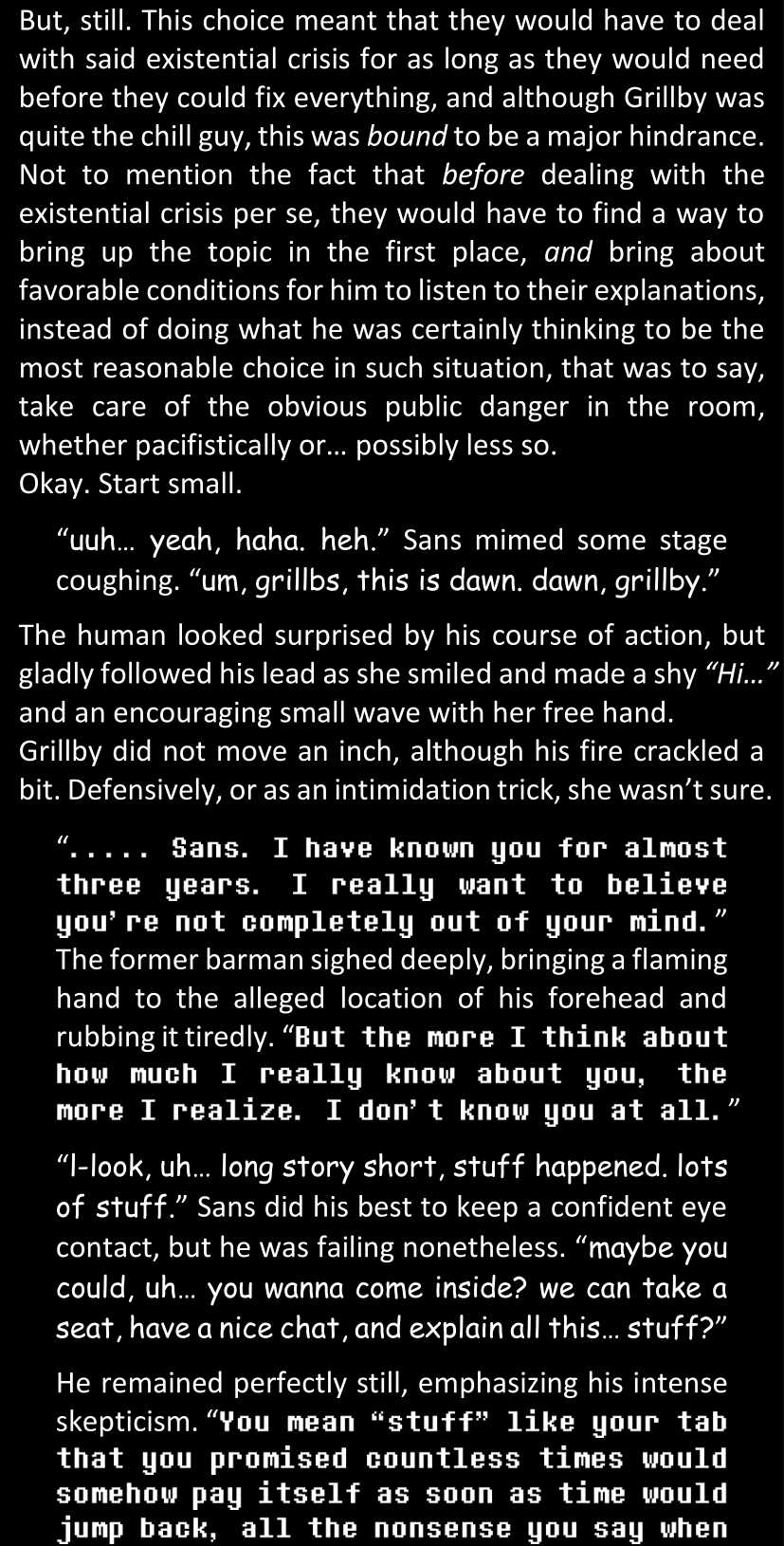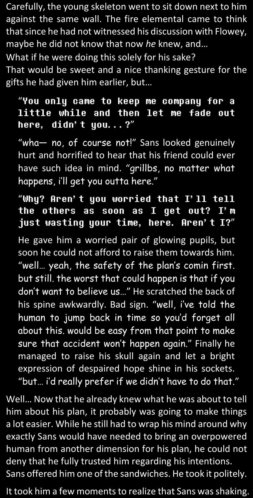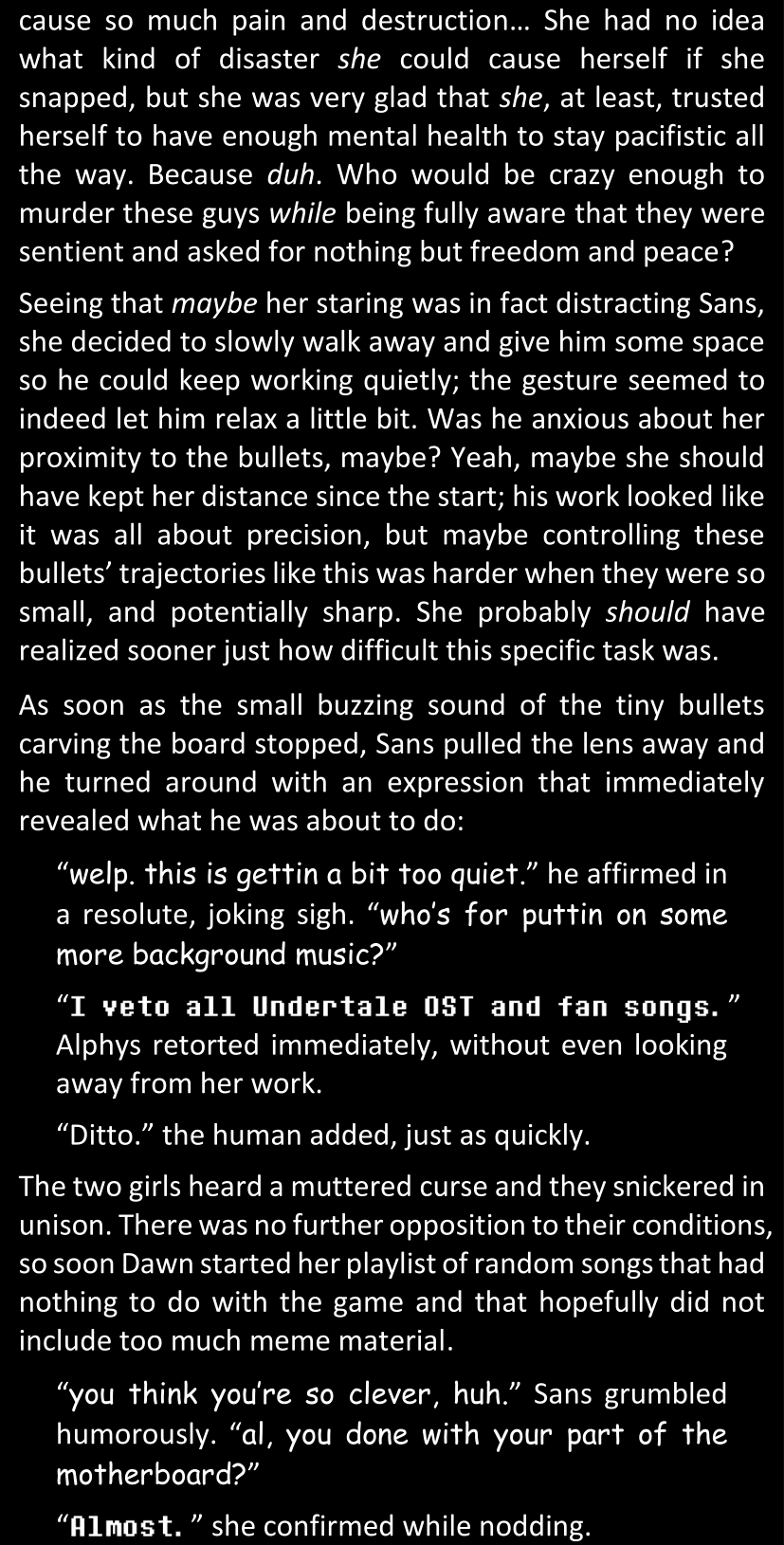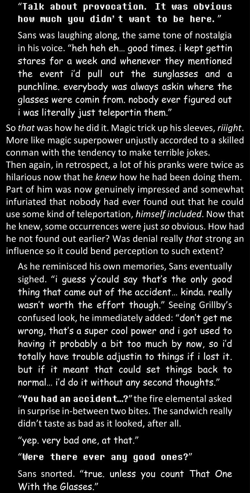 There was no worded response from Definitely-Not-Sans. She thought she might have heard a distant outburst of laughter, but it stopped abruptly and she hadn’t seen him move. He was still standing in the shadows, staring at her with an unreadable total lack of expression, both his hands deeply buried into his pockets.