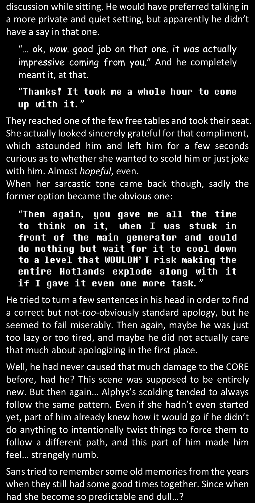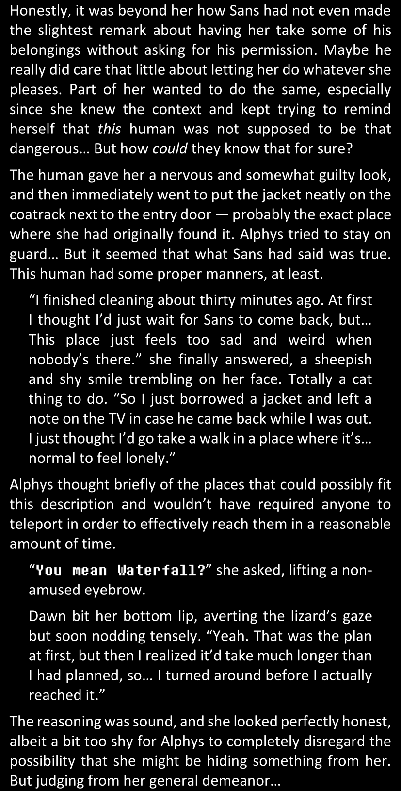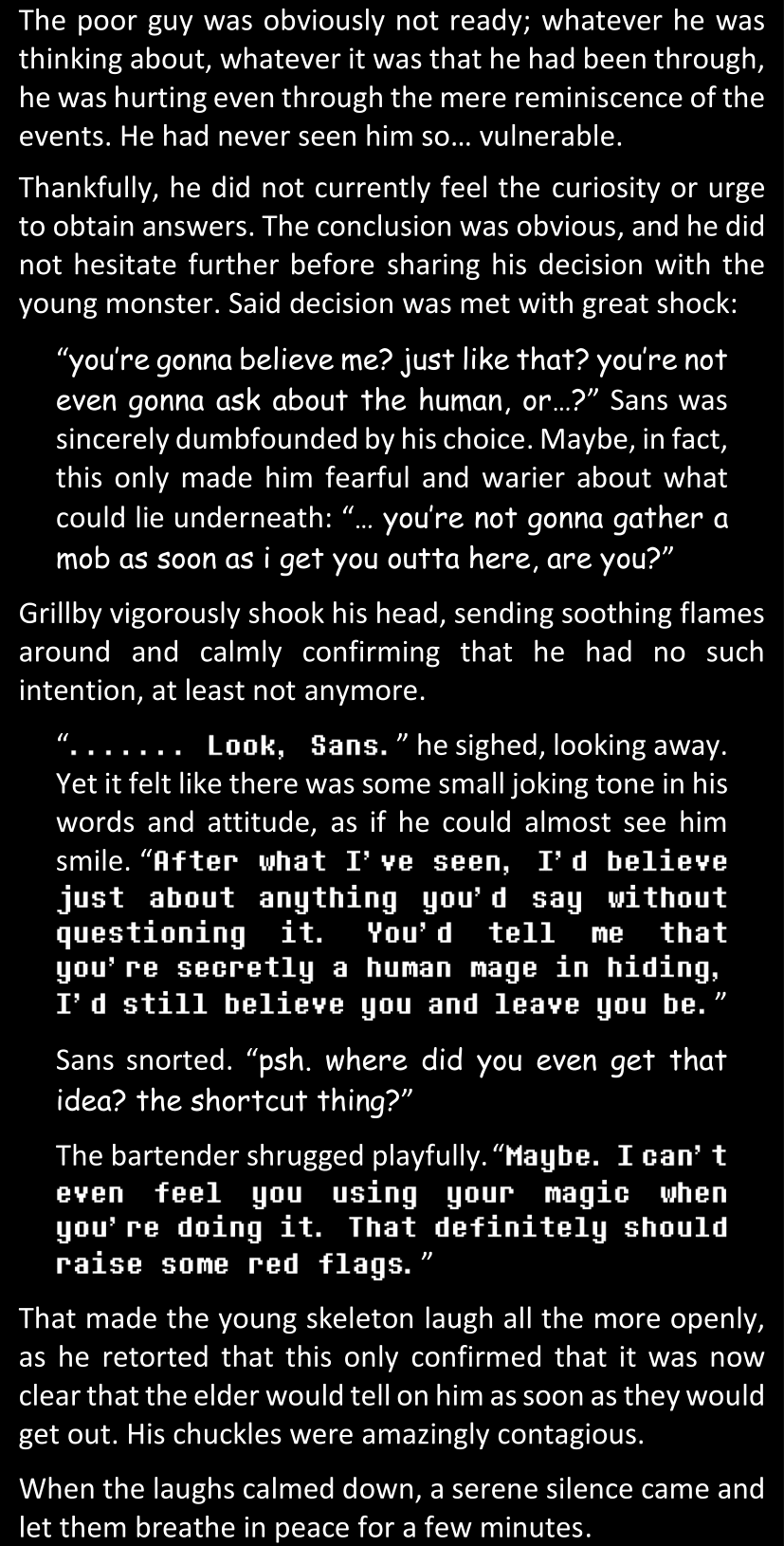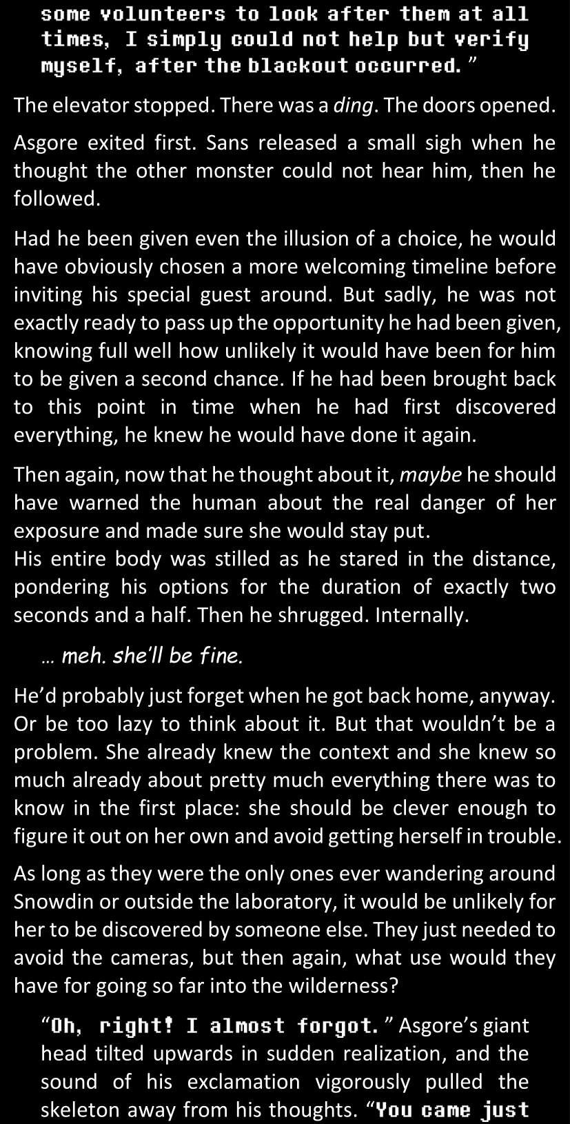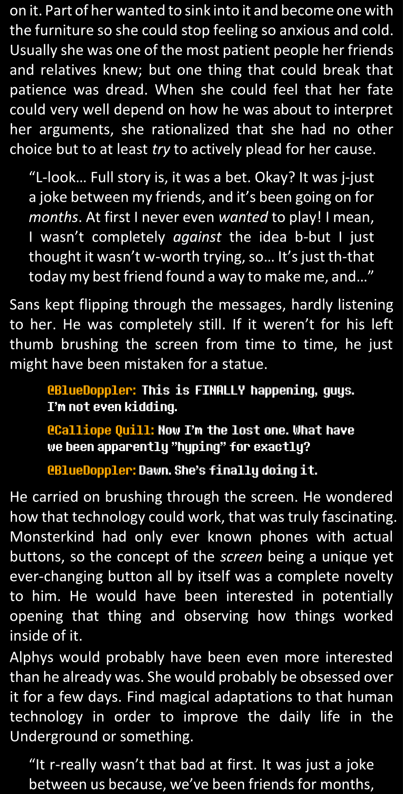 There was no worded response from Definitely-Not-Sans. She thought she might have heard a distant outburst of laughter, but it stopped abruptly and she hadn’t seen him move. He was still standing in the shadows, staring at her with an unreadable total lack of expression, both his hands deeply buried into his pockets.