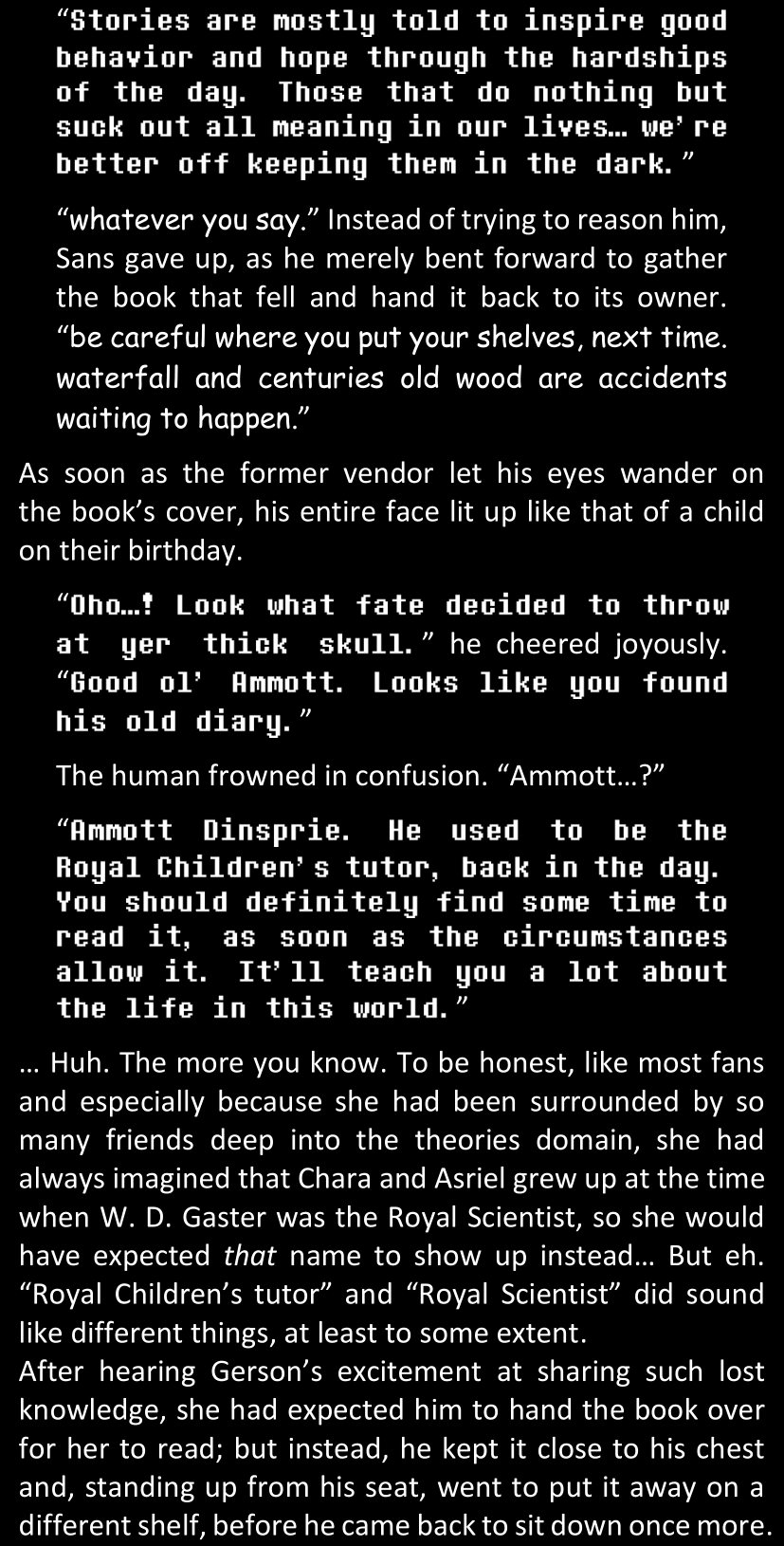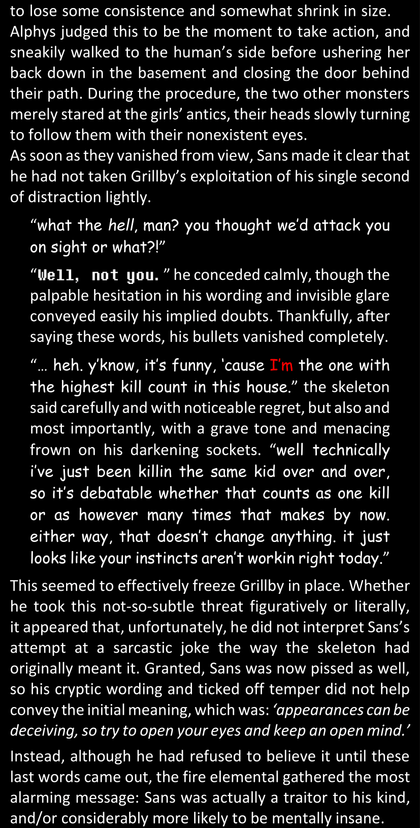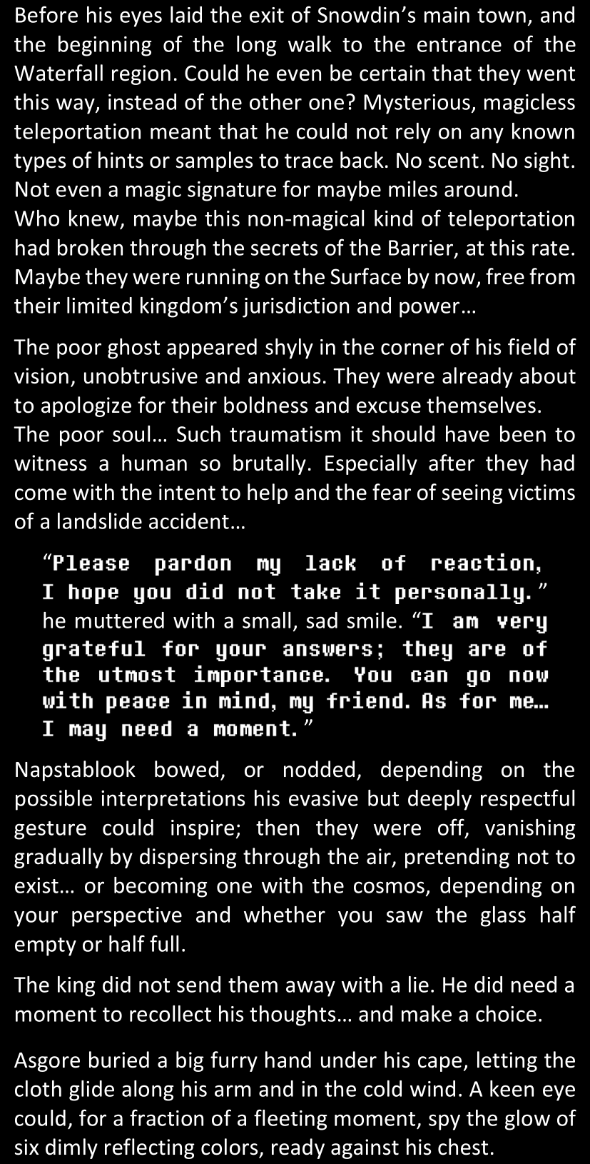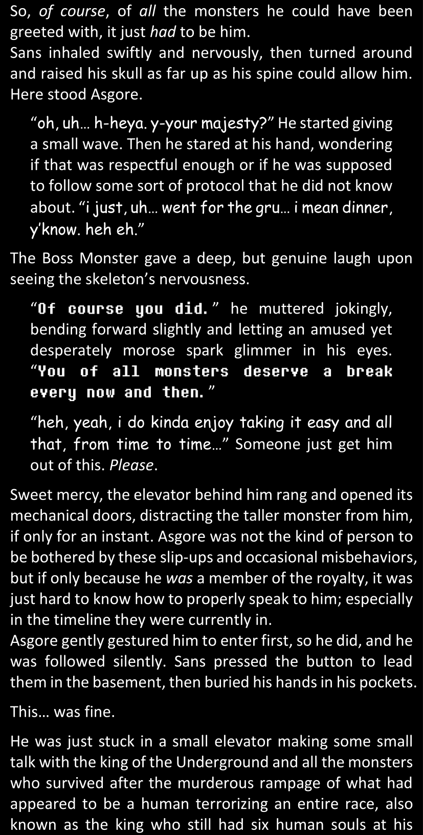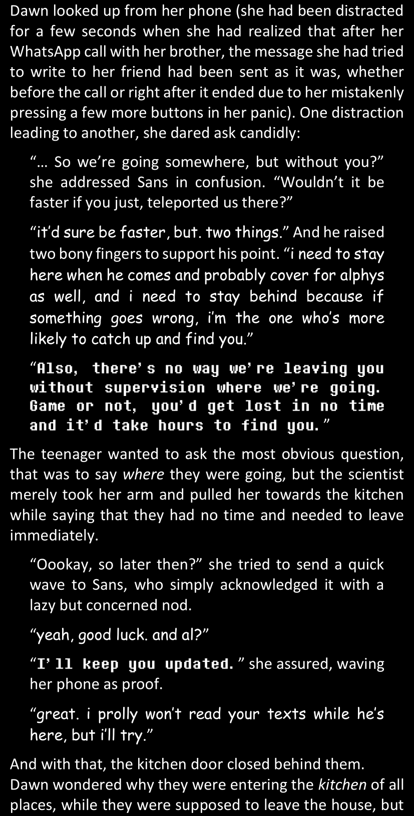 There was no worded response from Definitely-Not-Sans. She thought she might have heard a distant outburst of laughter, but it stopped abruptly and she hadn’t seen him move. He was still standing in the shadows, staring at her with an unreadable total lack of expression, both his hands deeply buried into his pockets.