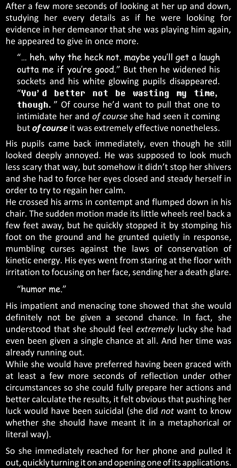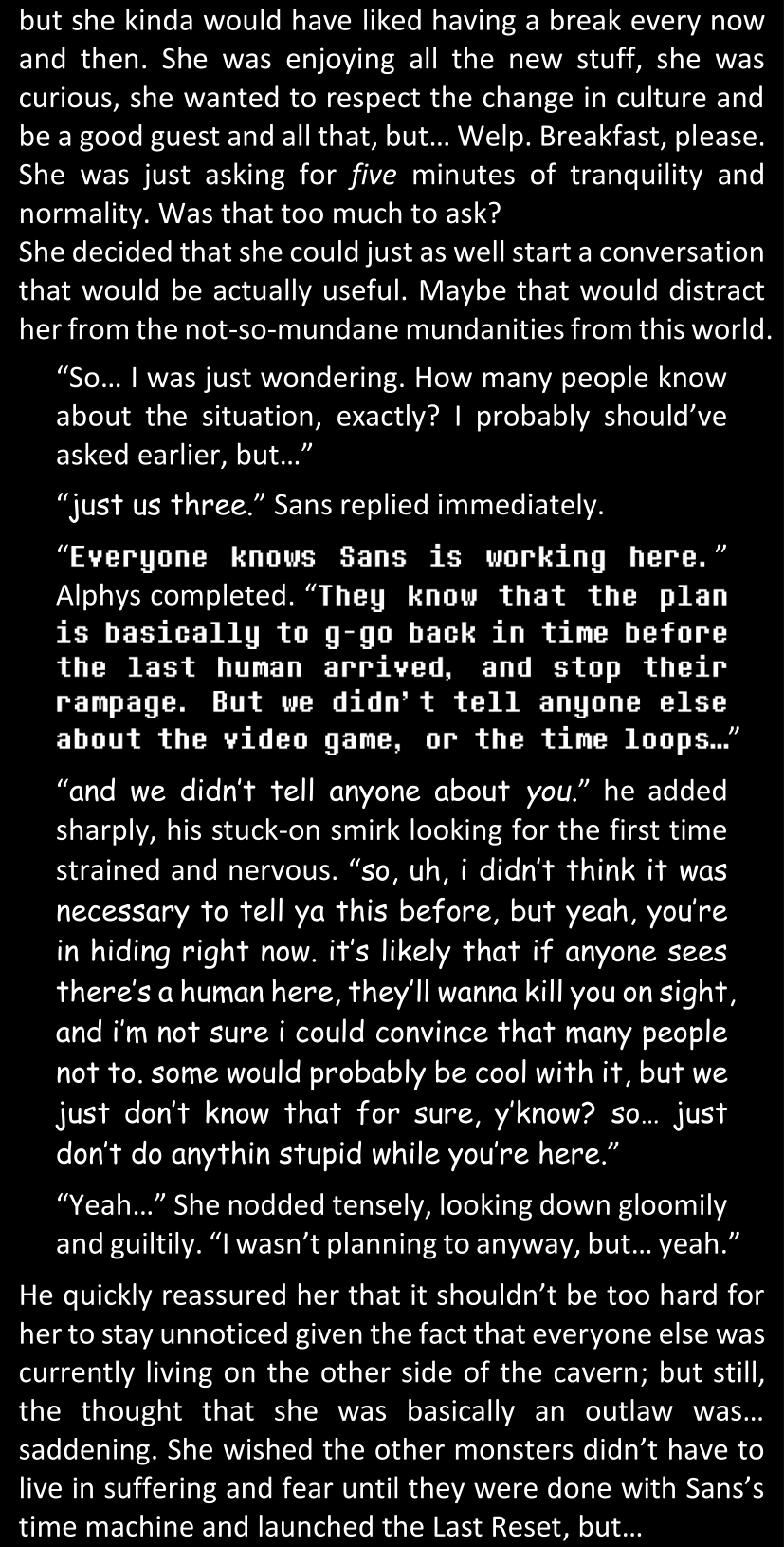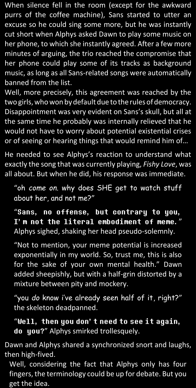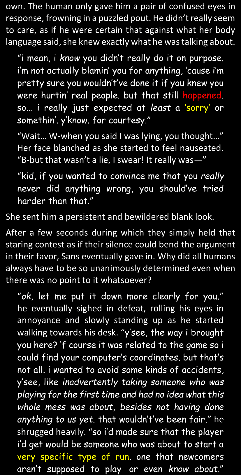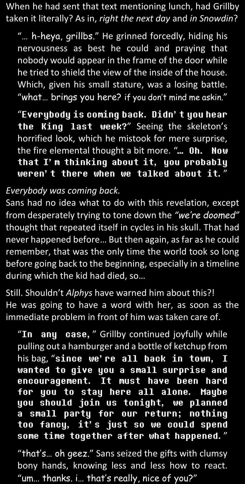 There was no worded response from Definitely-Not-Sans. She thought she might have heard a distant outburst of laughter, but it stopped abruptly and she hadn’t seen him move. He was still standing in the shadows, staring at her with an unreadable total lack of expression, both his hands deeply buried into his pockets.