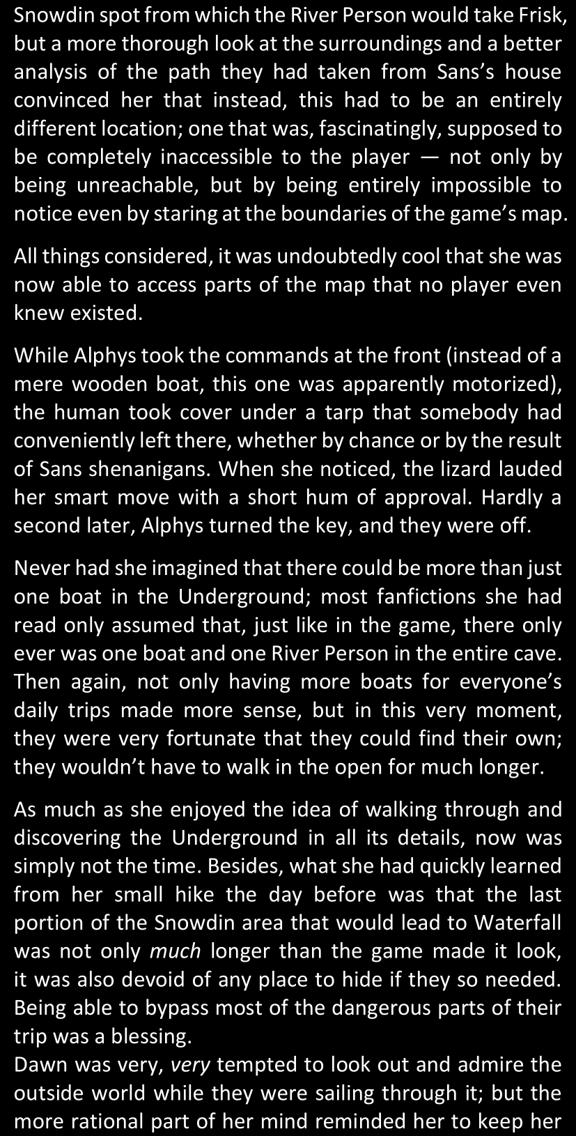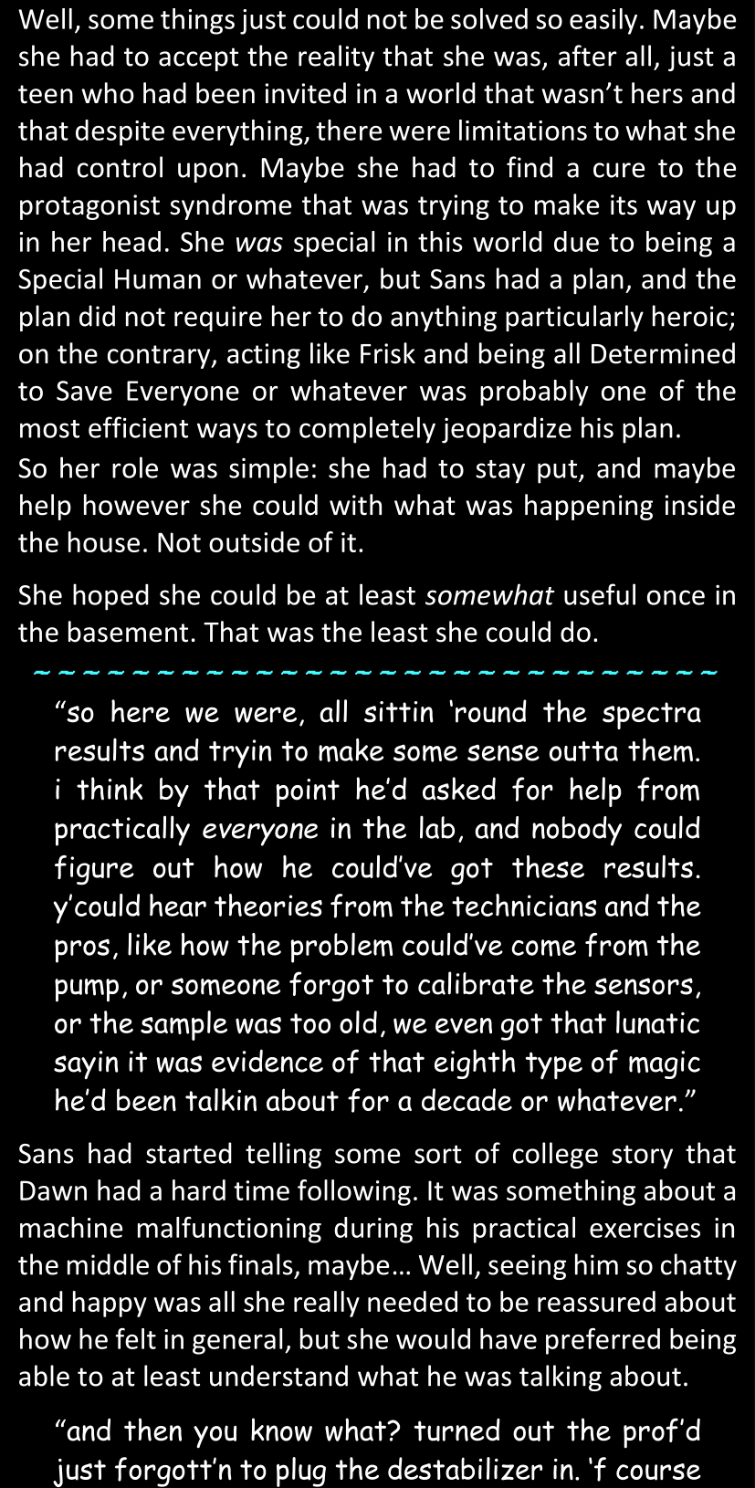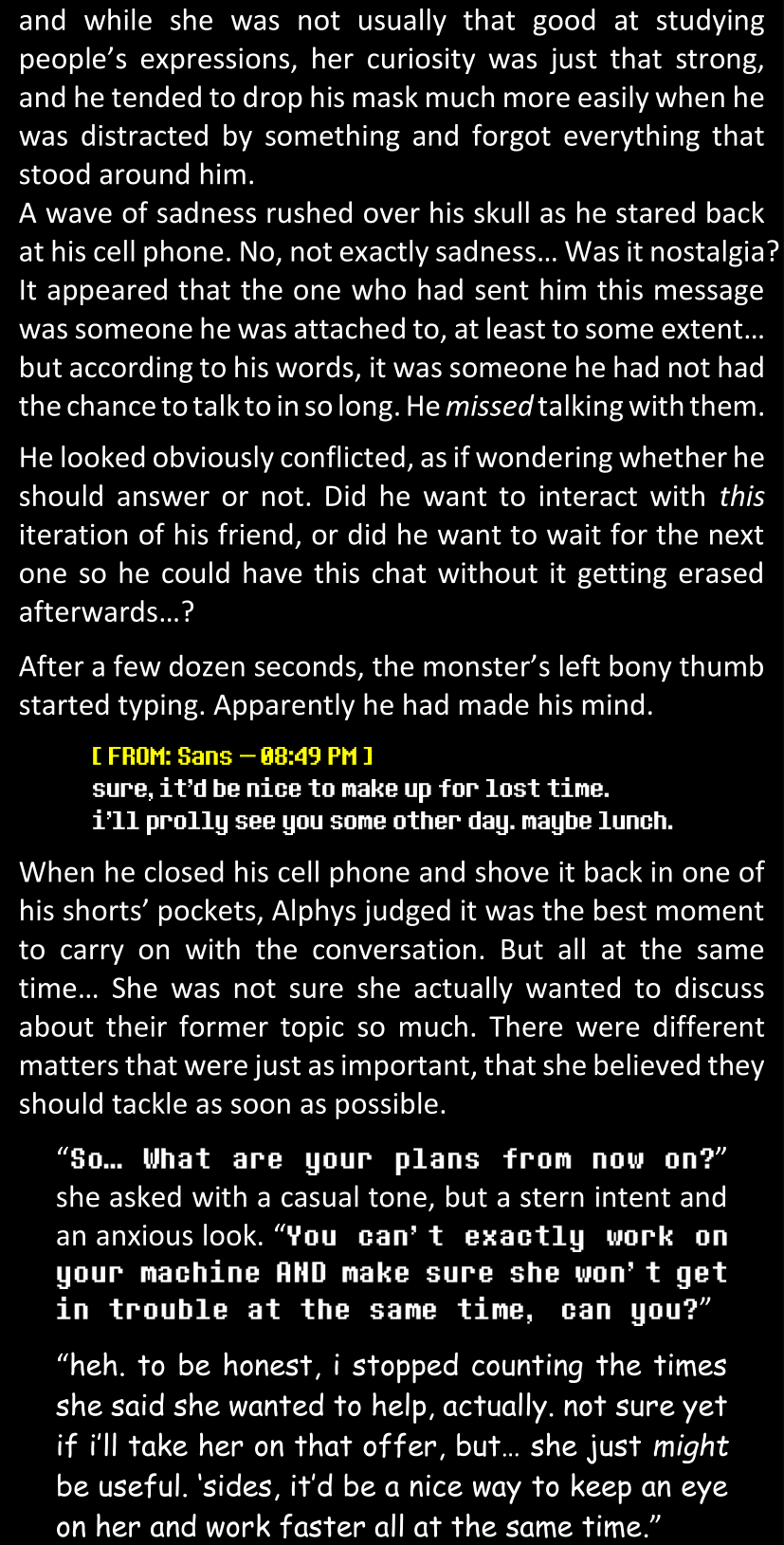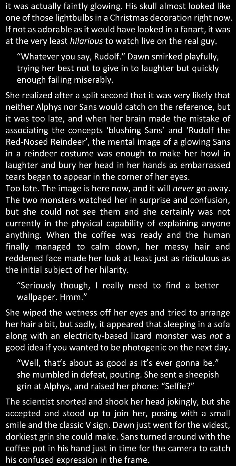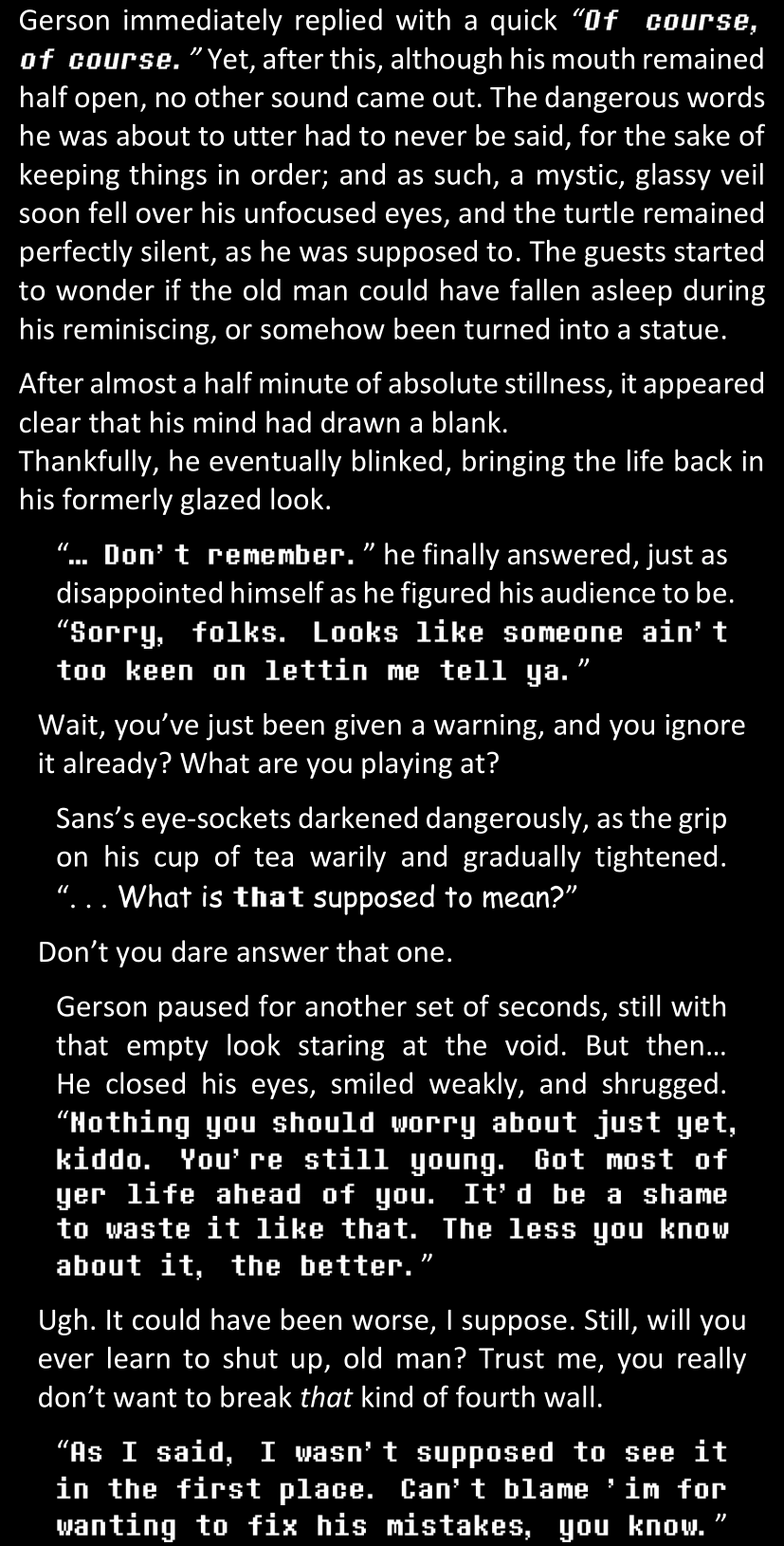 There was no worded response from Definitely-Not-Sans. She thought she might have heard a distant outburst of laughter, but it stopped abruptly and she hadn’t seen him move. He was still standing in the shadows, staring at her with an unreadable total lack of expression, both his hands deeply buried into his pockets.