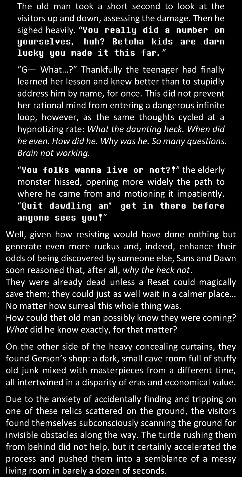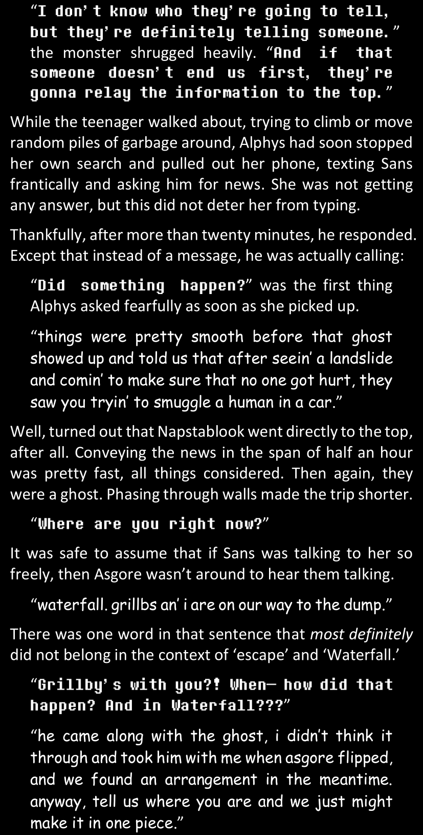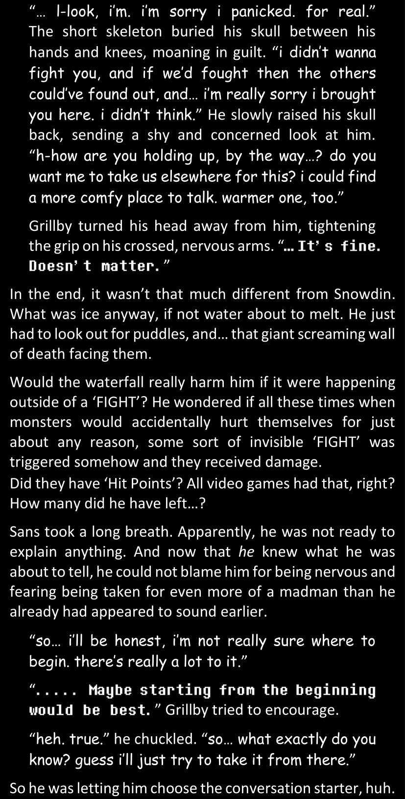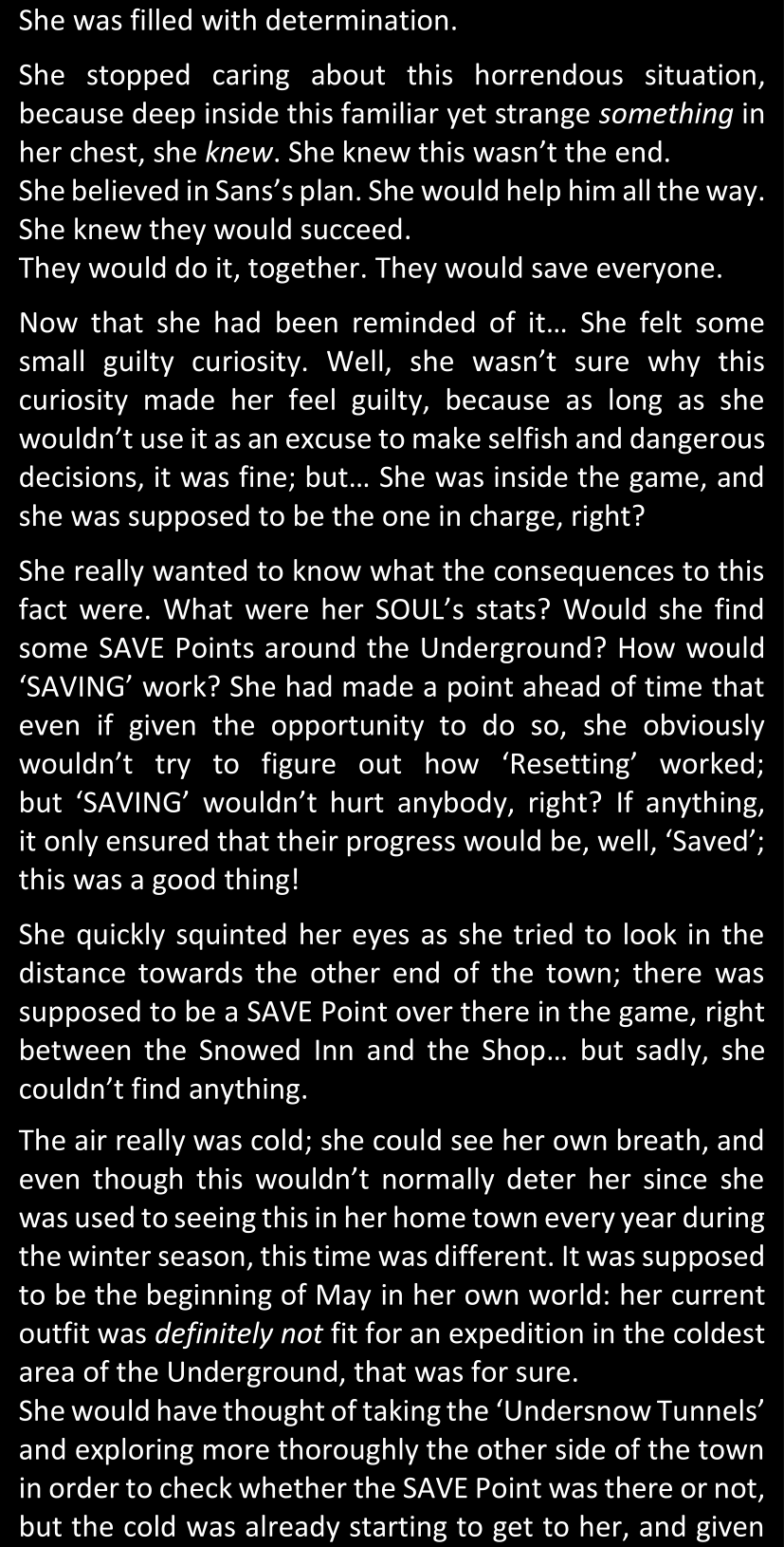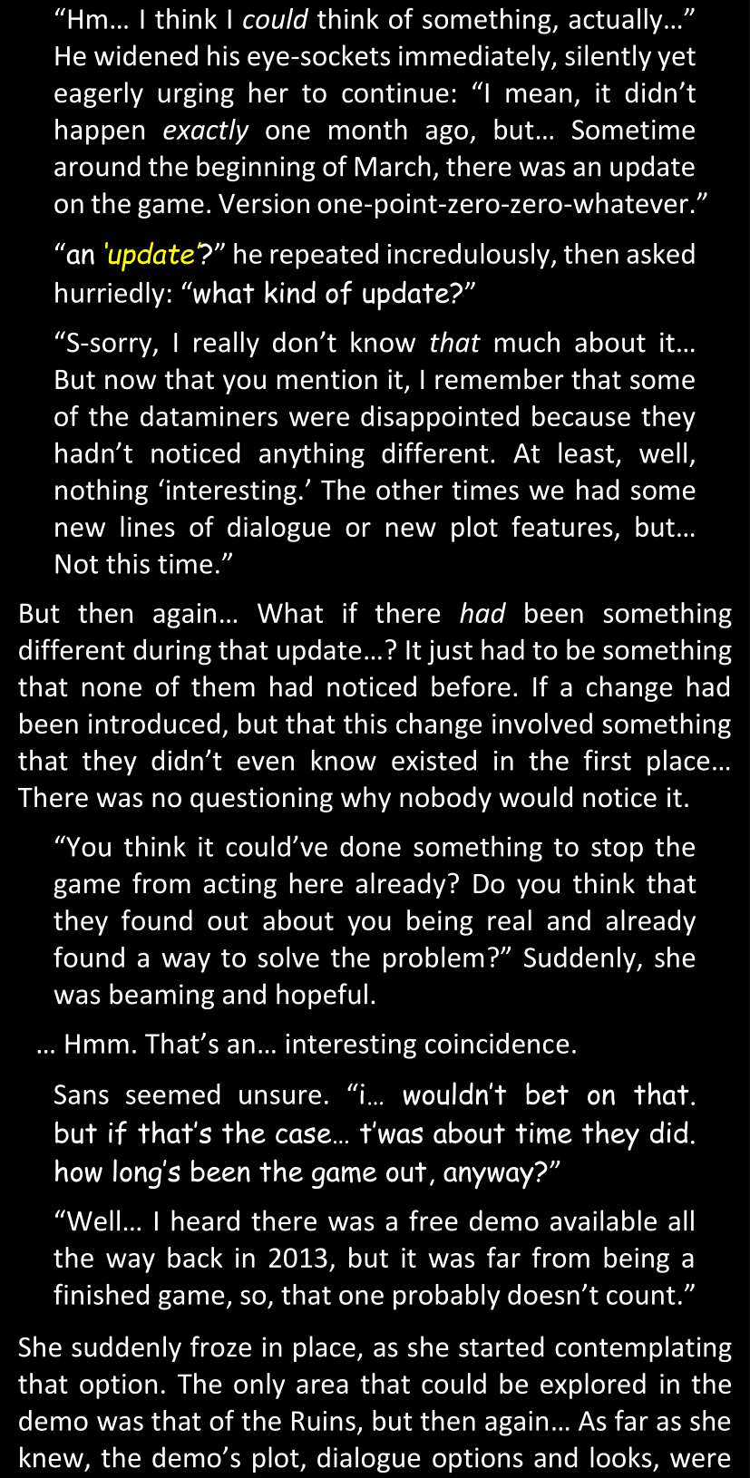 There was no worded response from Definitely-Not-Sans. She thought she might have heard a distant outburst of laughter, but it stopped abruptly and she hadn’t seen him move. He was still standing in the shadows, staring at her with an unreadable total lack of expression, both his hands deeply buried into his pockets.