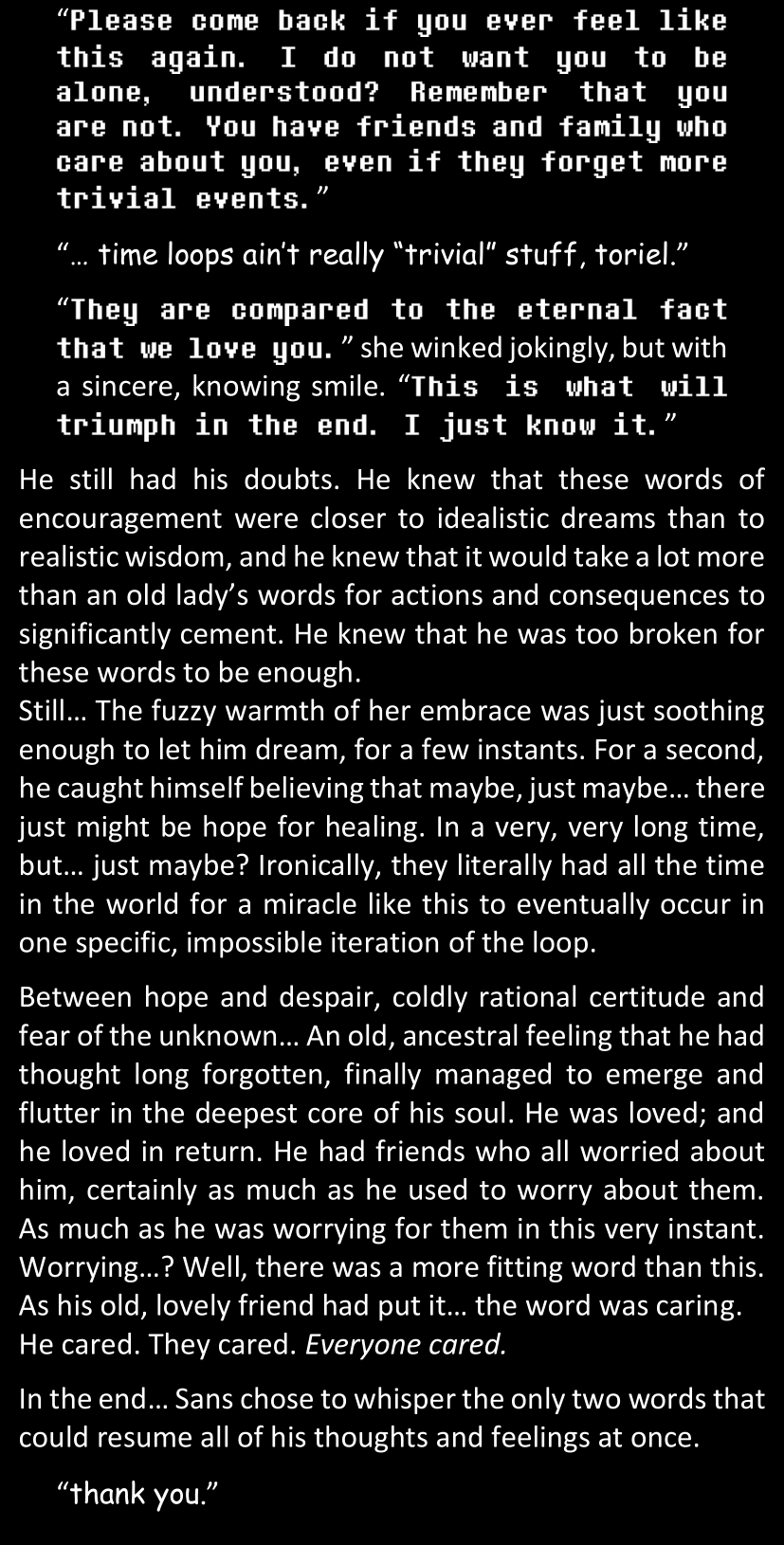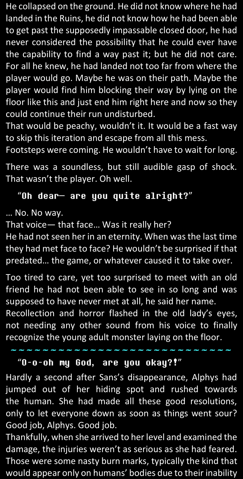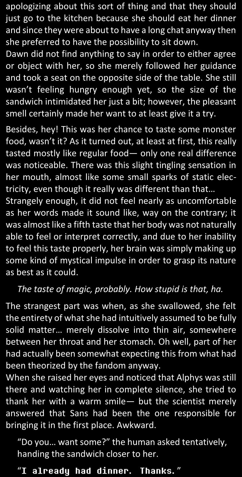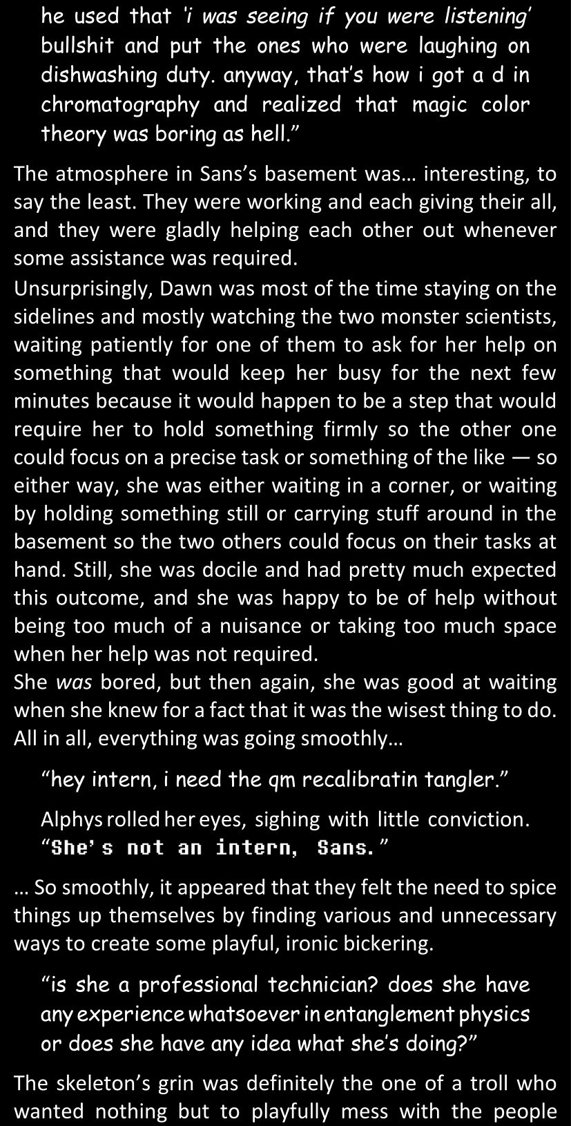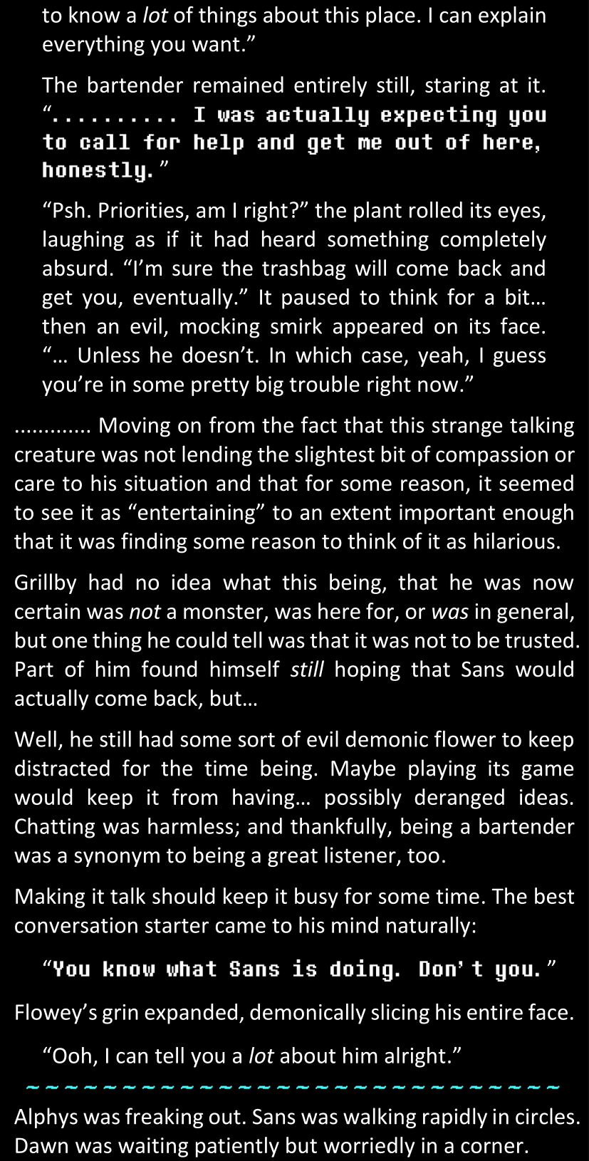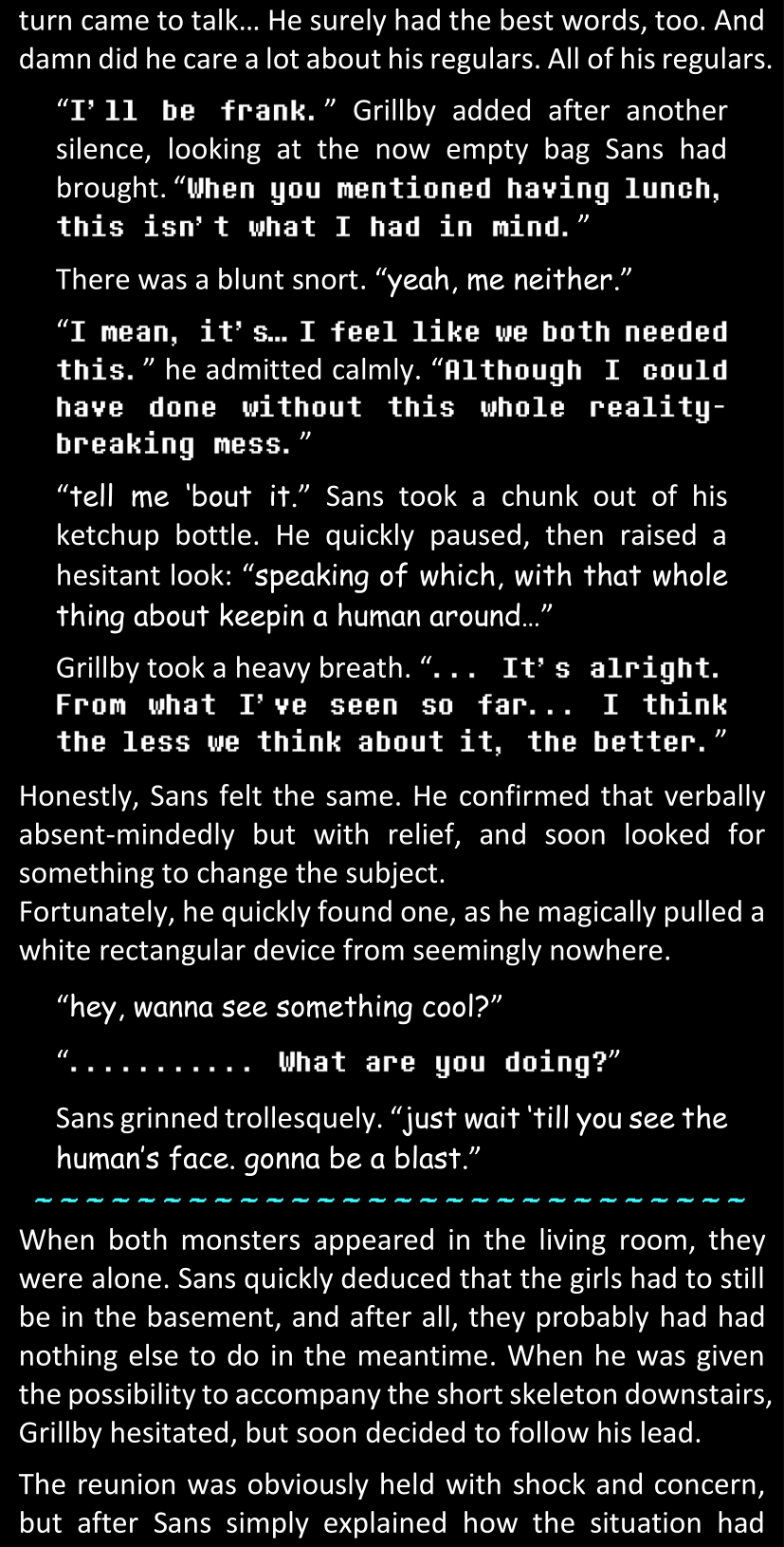 There was no worded response from Definitely-Not-Sans. She thought she might have heard a distant outburst of laughter, but it stopped abruptly and she hadn’t seen him move. He was still standing in the shadows, staring at her with an unreadable total lack of expression, both his hands deeply buried into his pockets.