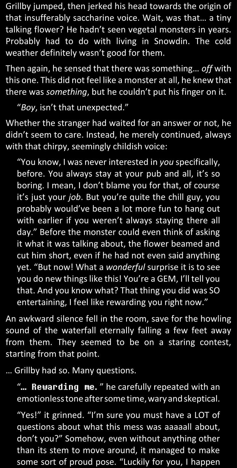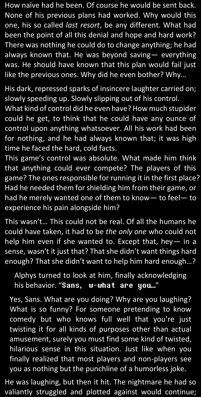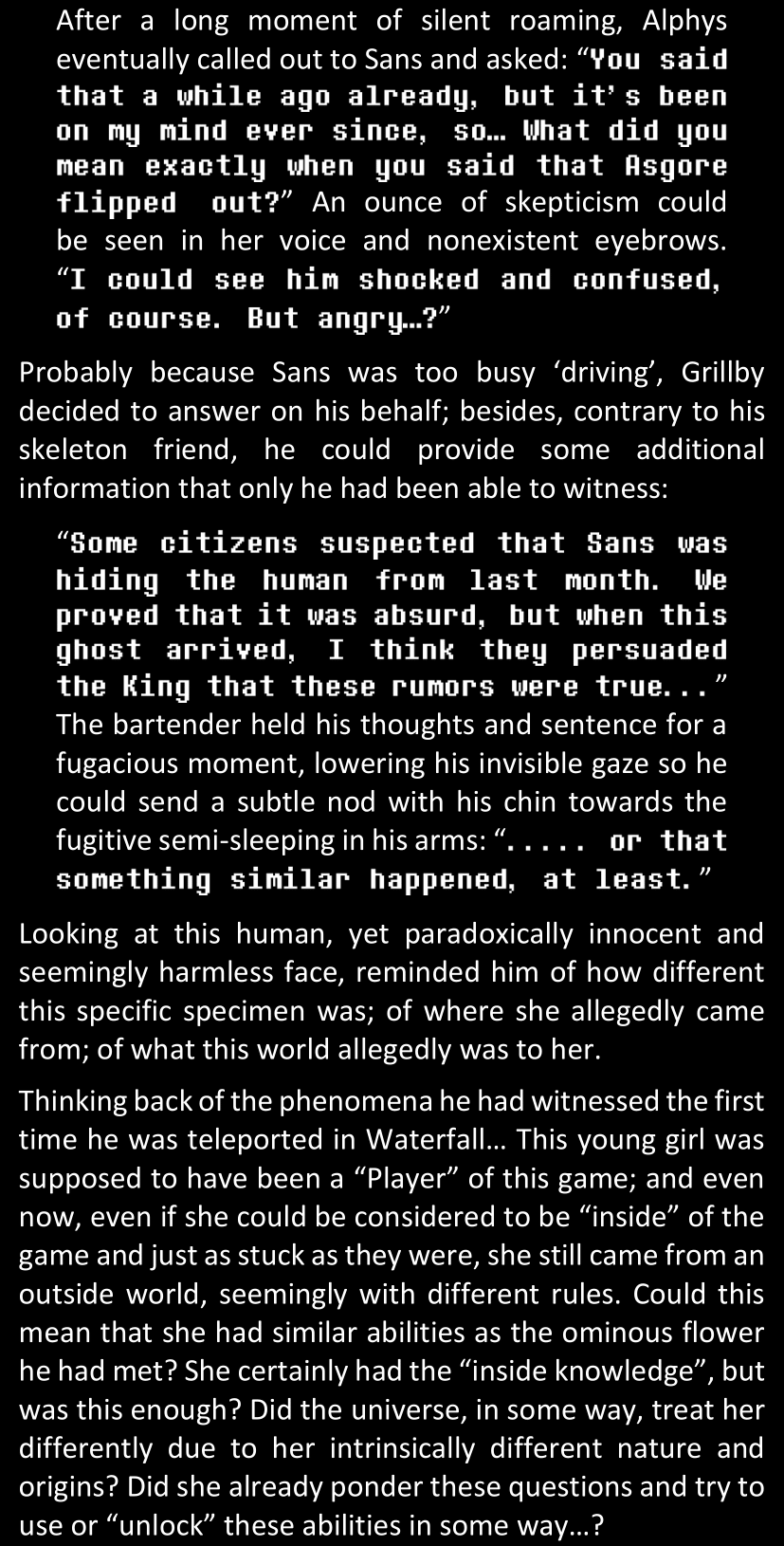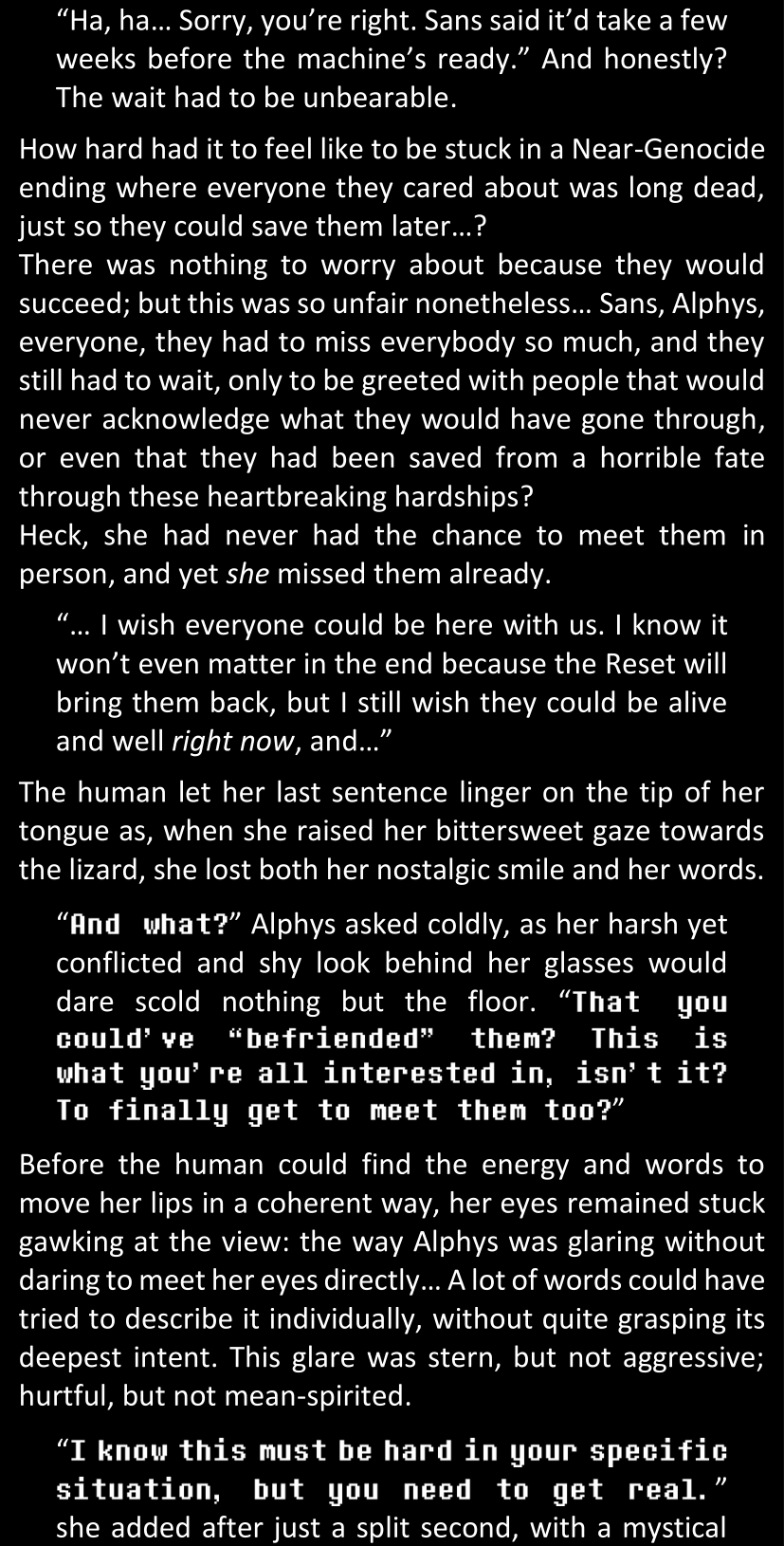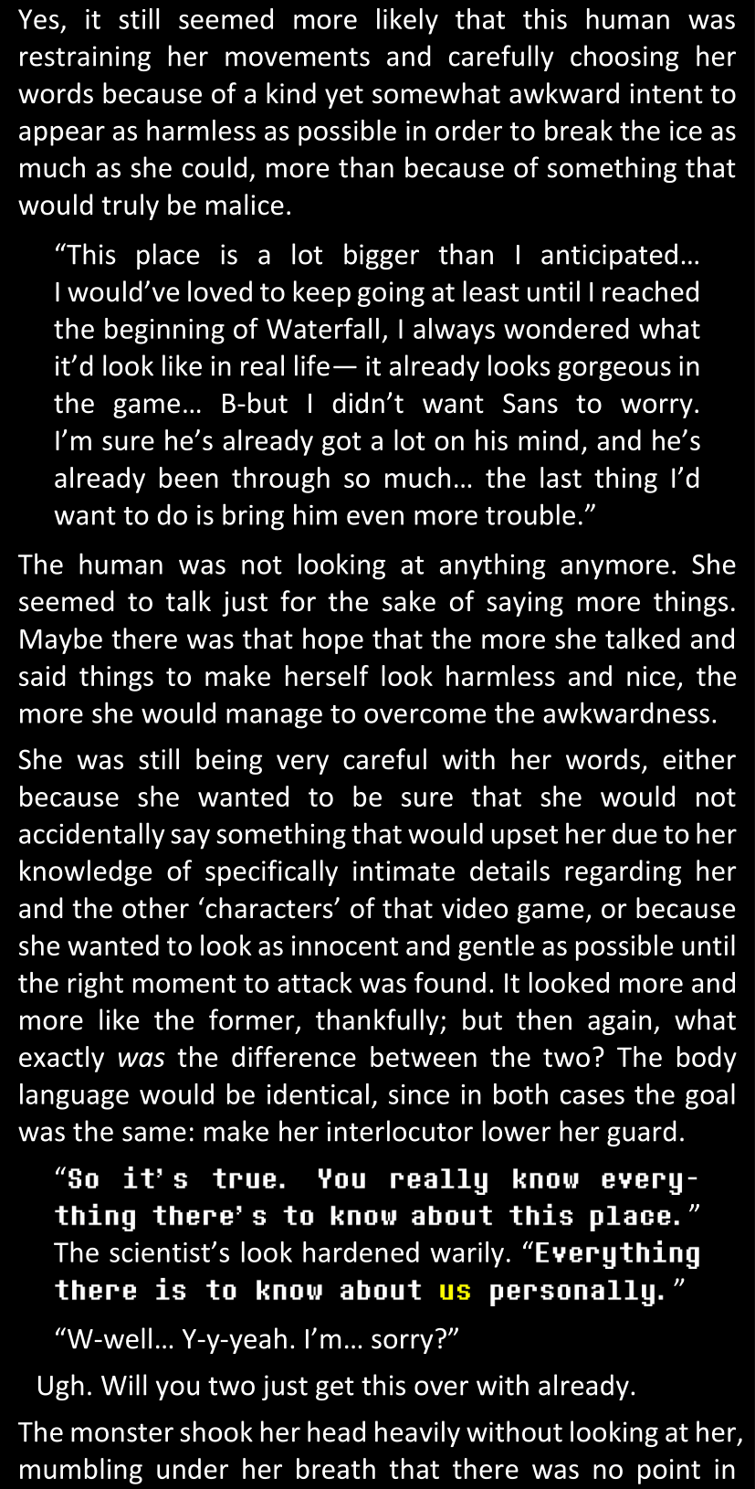There was no worded response from Definitely-Not-Sans. She thought she might have heard a distant outburst of laughter, but it stopped abruptly and she hadn’t seen him move. He was still standing in the shadows, staring at her with an unreadable total lack of expression, both his hands deeply buried into his pockets.