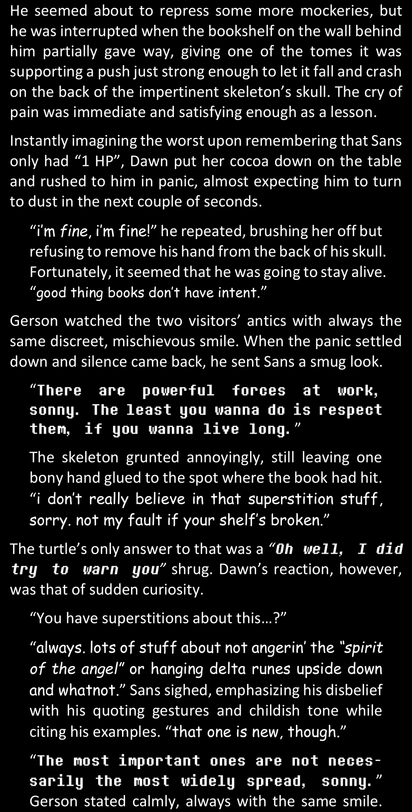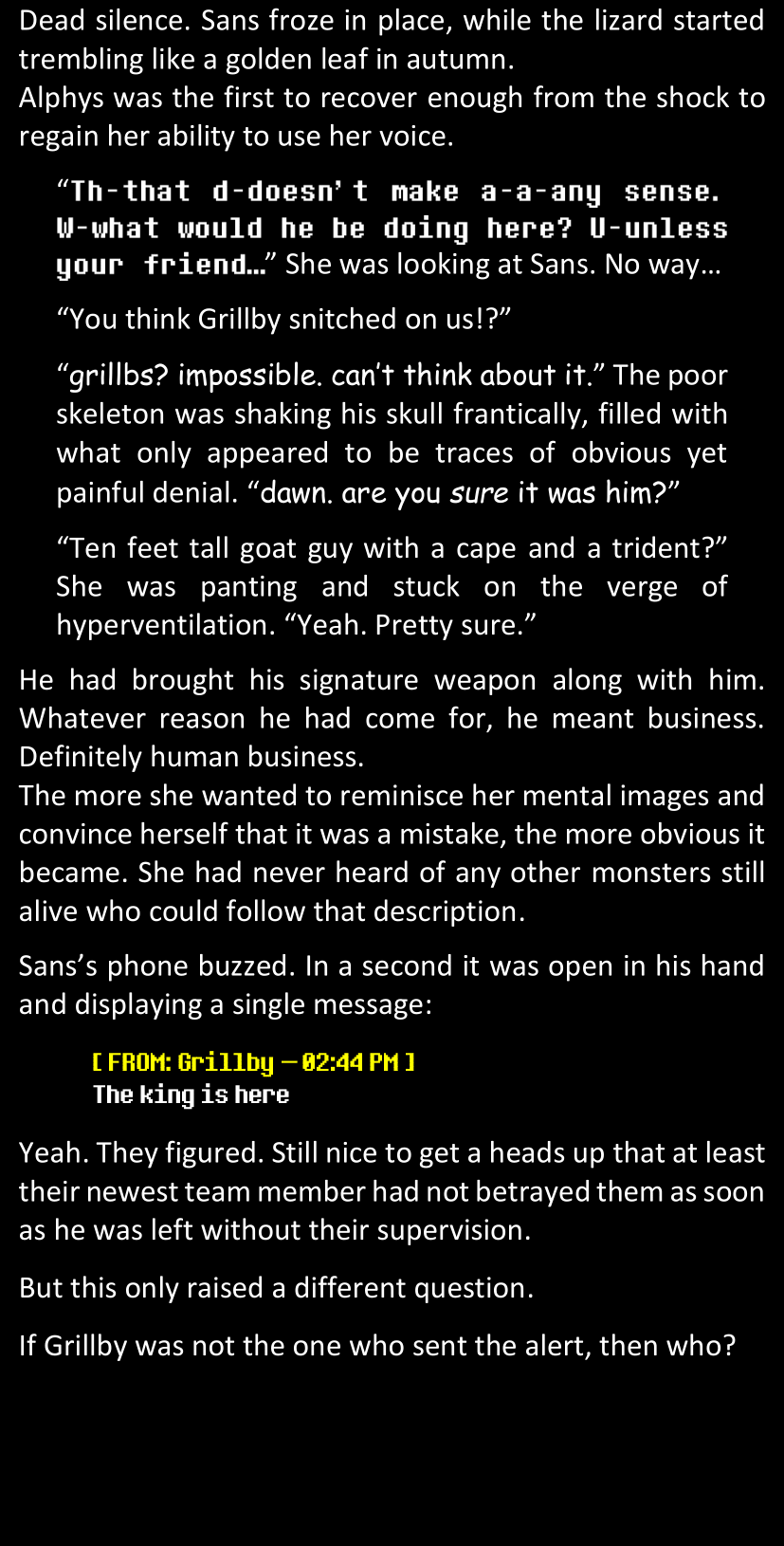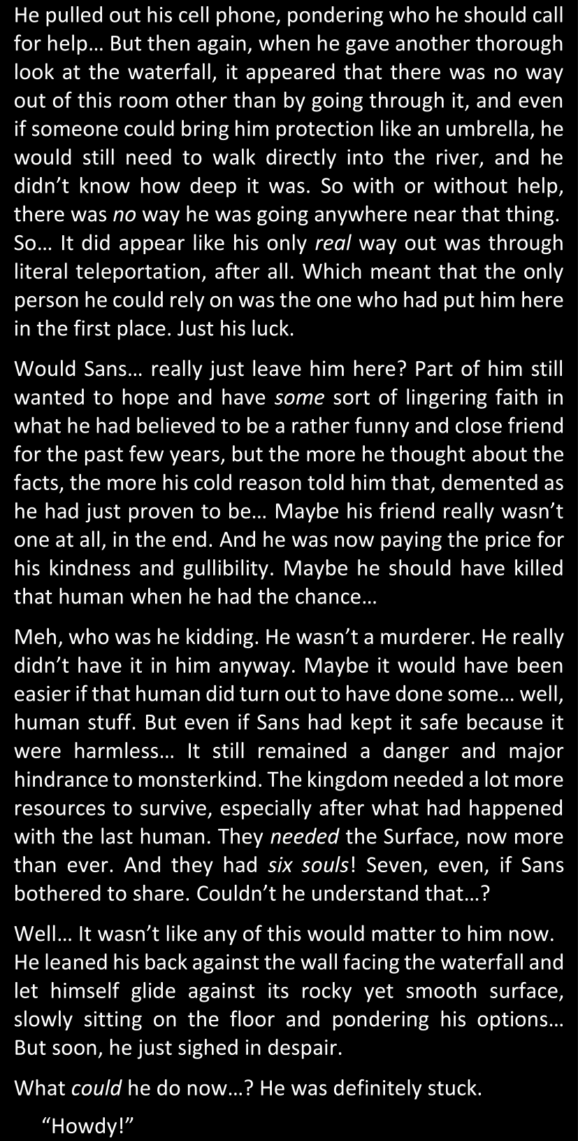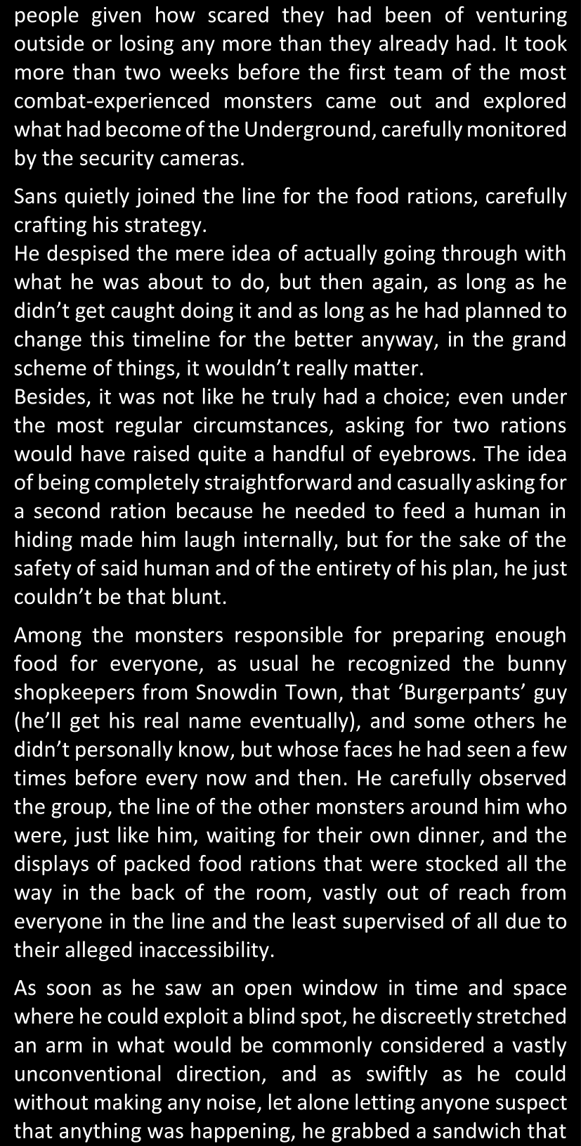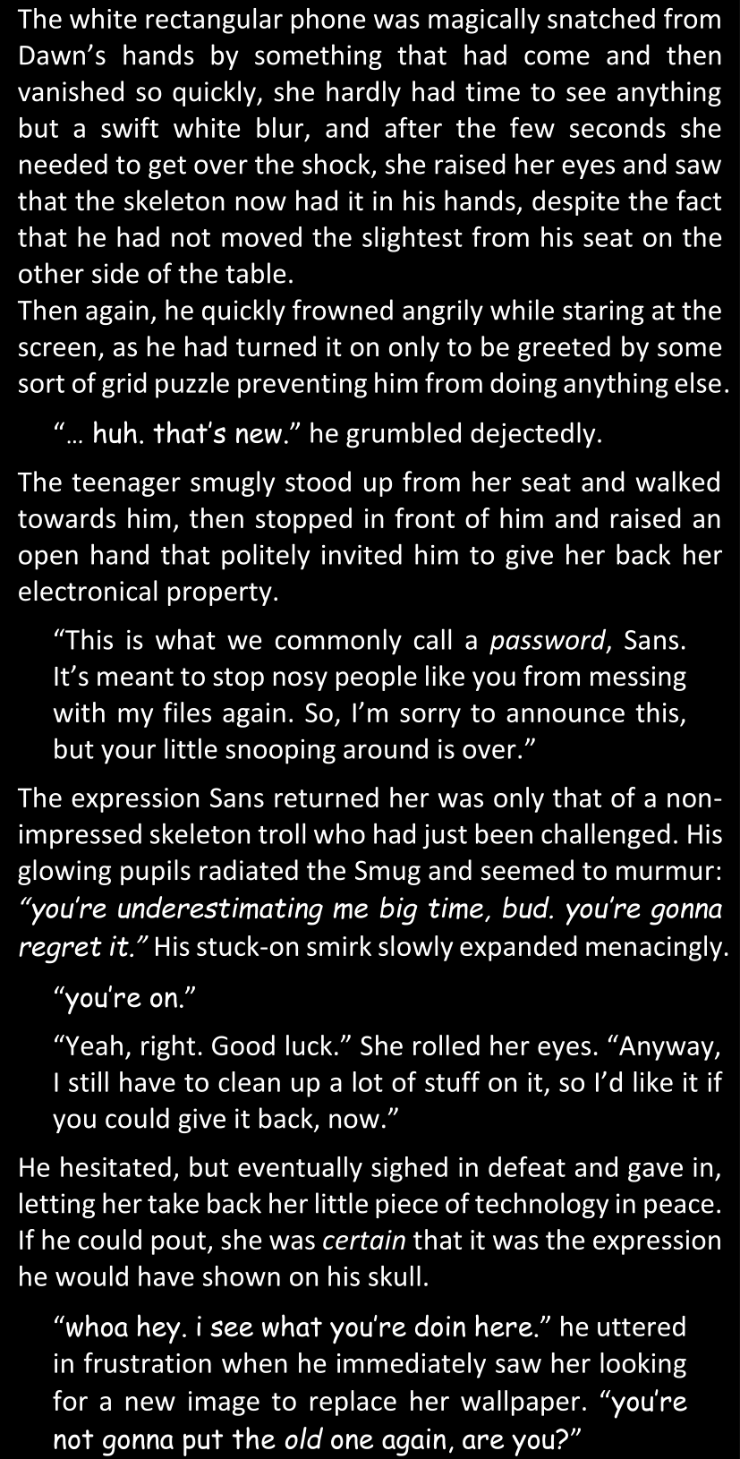 There was no worded response from Definitely-Not-Sans. She thought she might have heard a distant outburst of laughter, but it stopped abruptly and she hadn’t seen him move. He was still standing in the shadows, staring at her with an unreadable total lack of expression, both his hands deeply buried into his pockets.