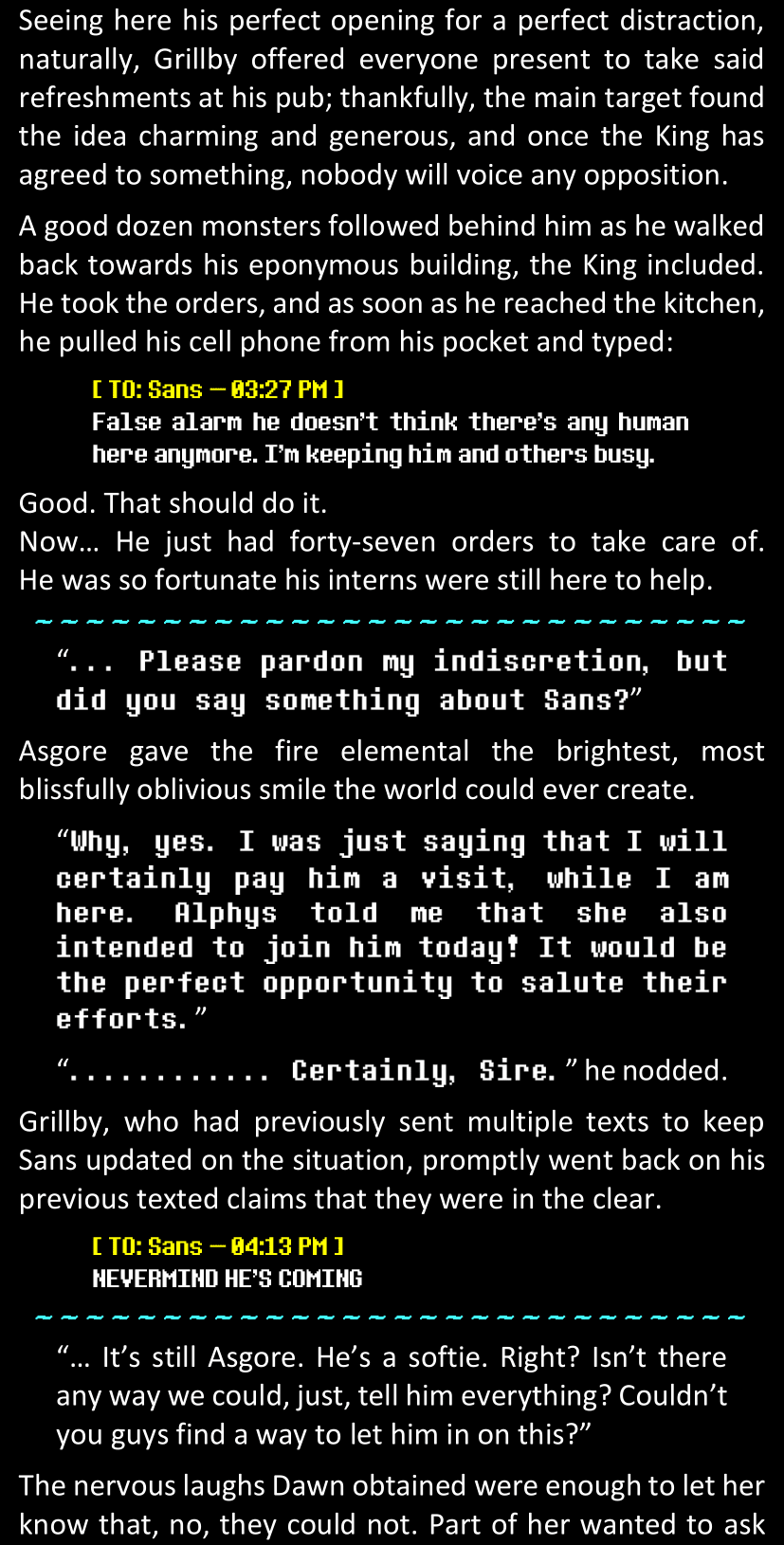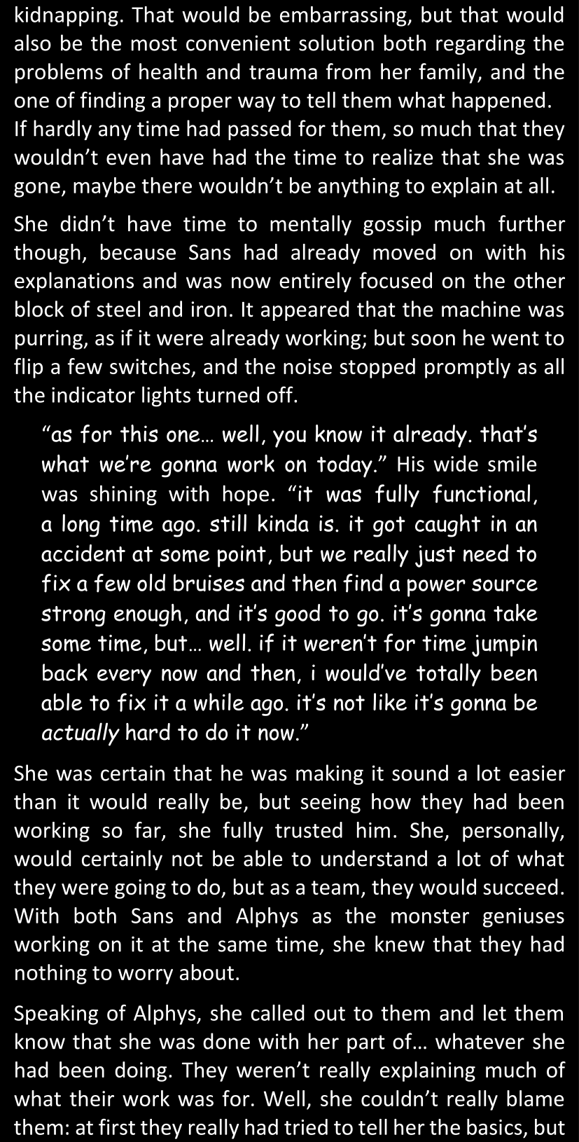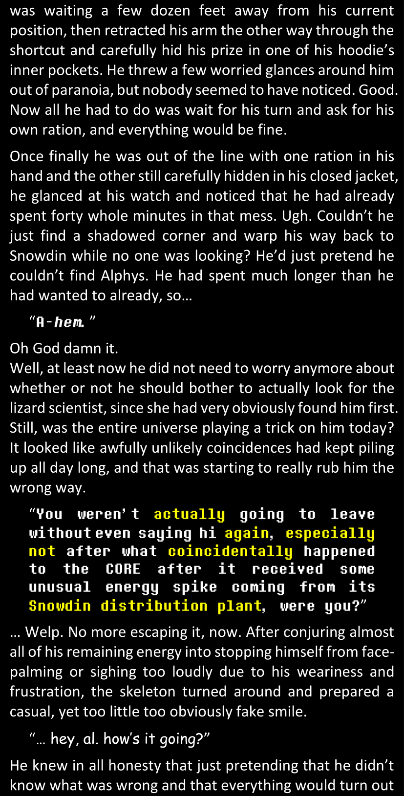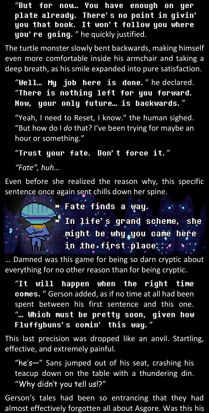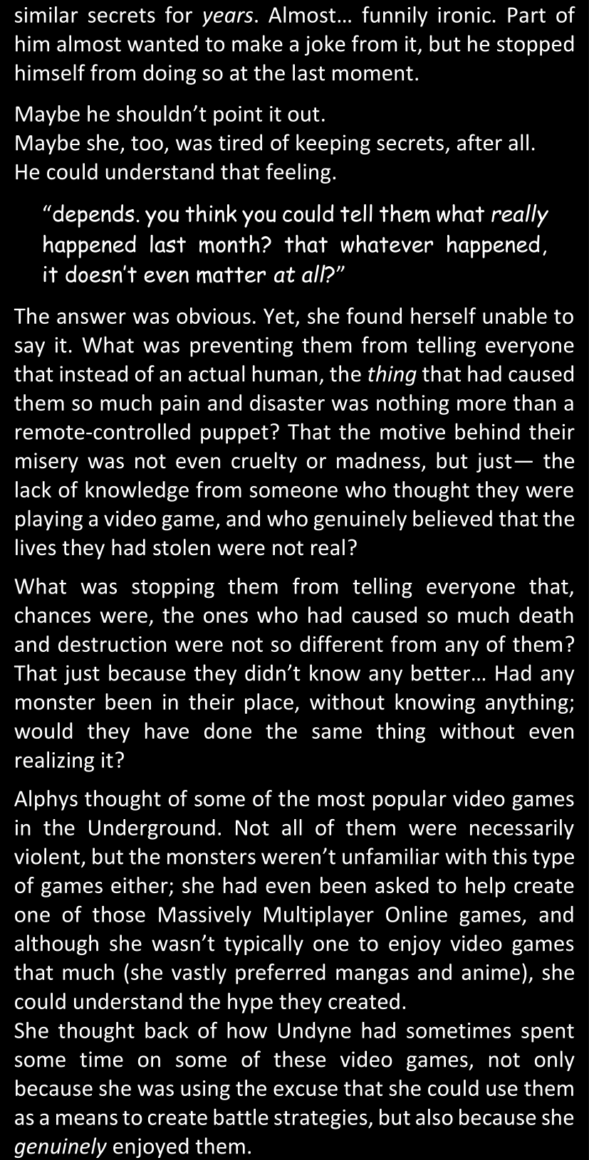 There was no worded response from Definitely-Not-Sans. She thought she might have heard a distant outburst of laughter, but it stopped abruptly and she hadn’t seen him move. He was still standing in the shadows, staring at her with an unreadable total lack of expression, both his hands deeply buried into his pockets.