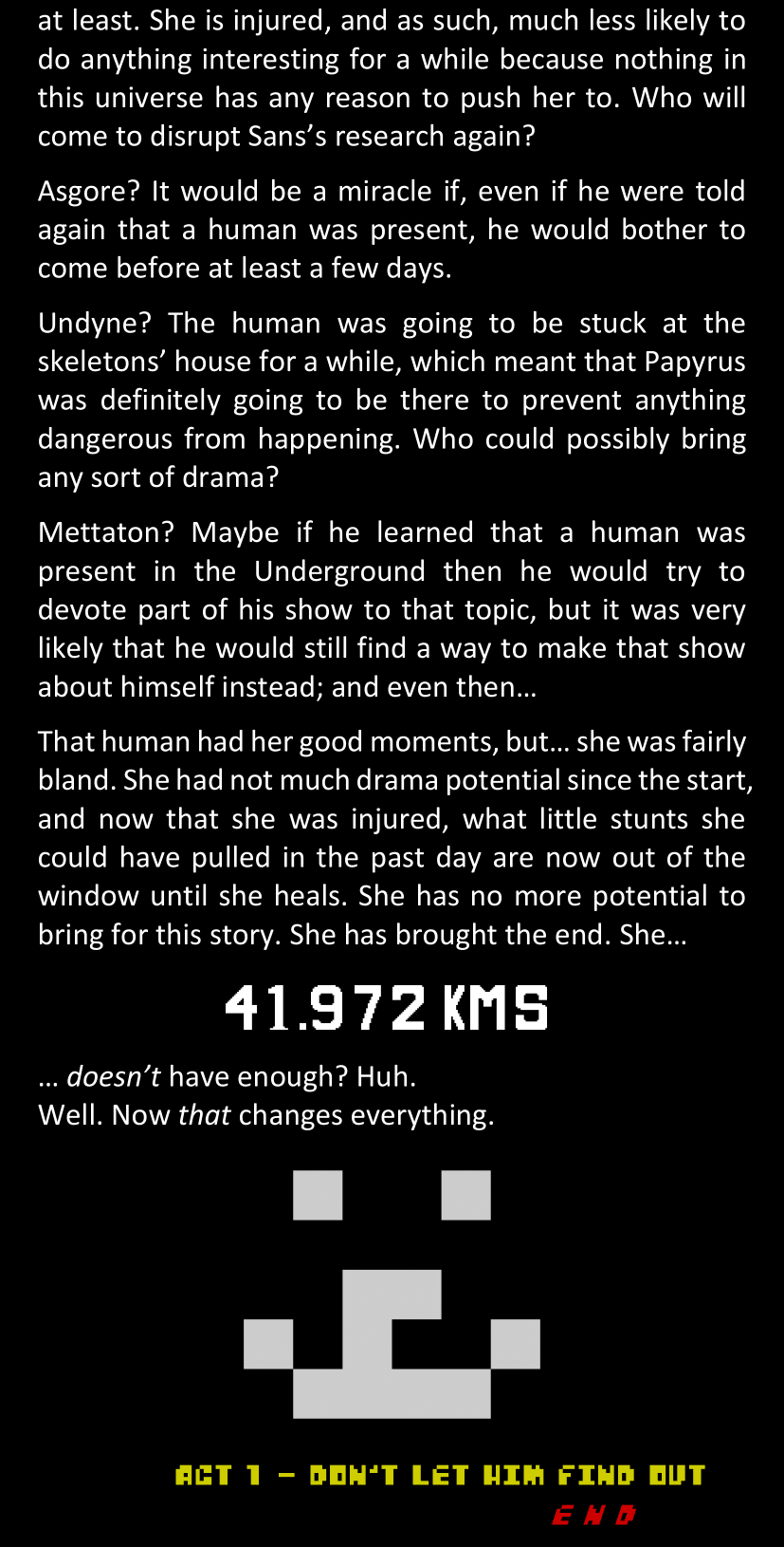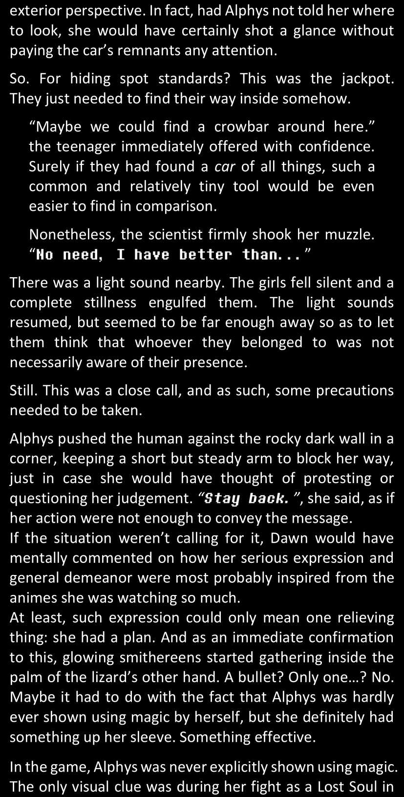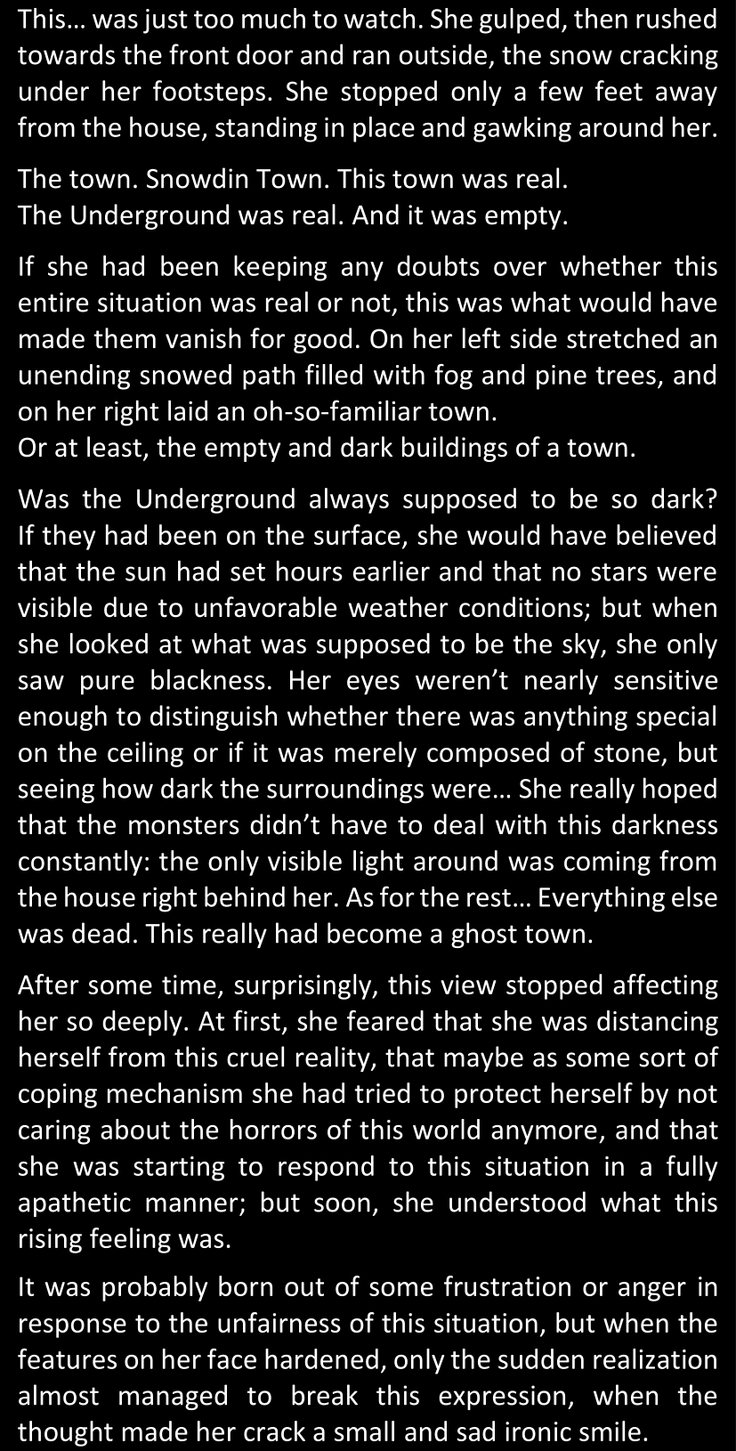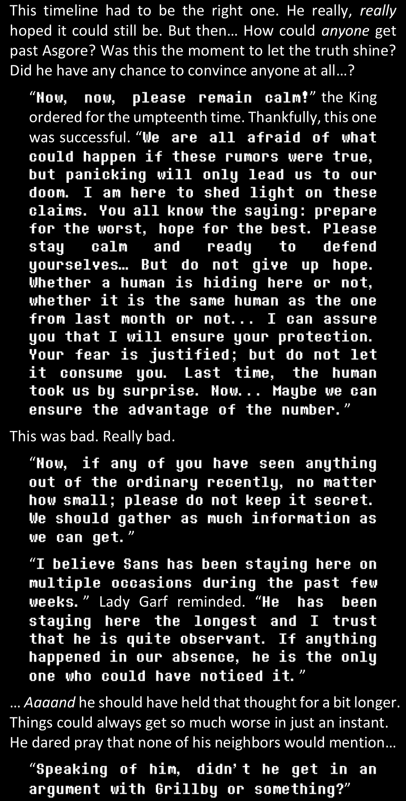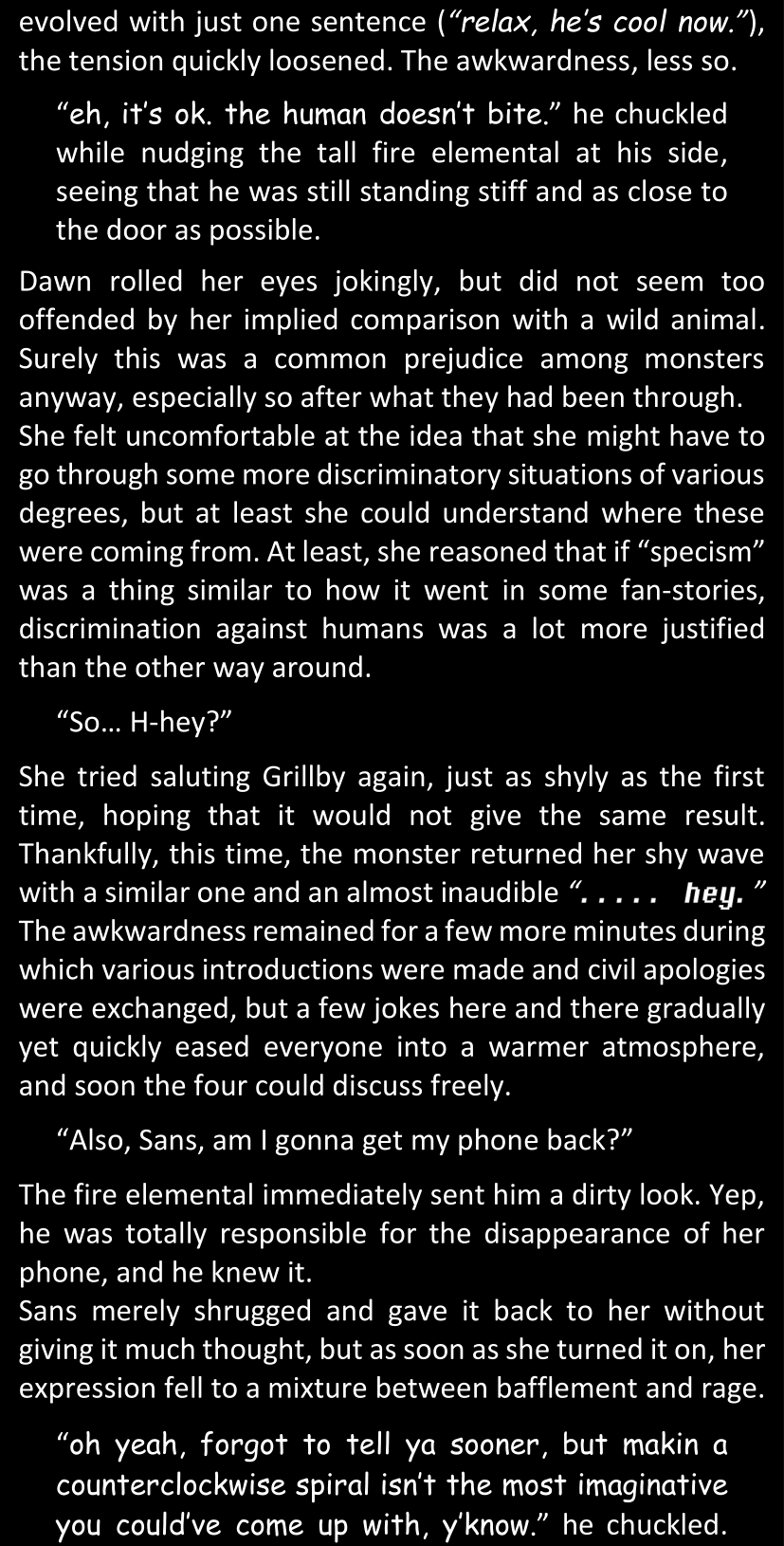 There was no worded response from Definitely-Not-Sans. She thought she might have heard a distant outburst of laughter, but it stopped abruptly and she hadn’t seen him move. He was still standing in the shadows, staring at her with an unreadable total lack of expression, both his hands deeply buried into his pockets.