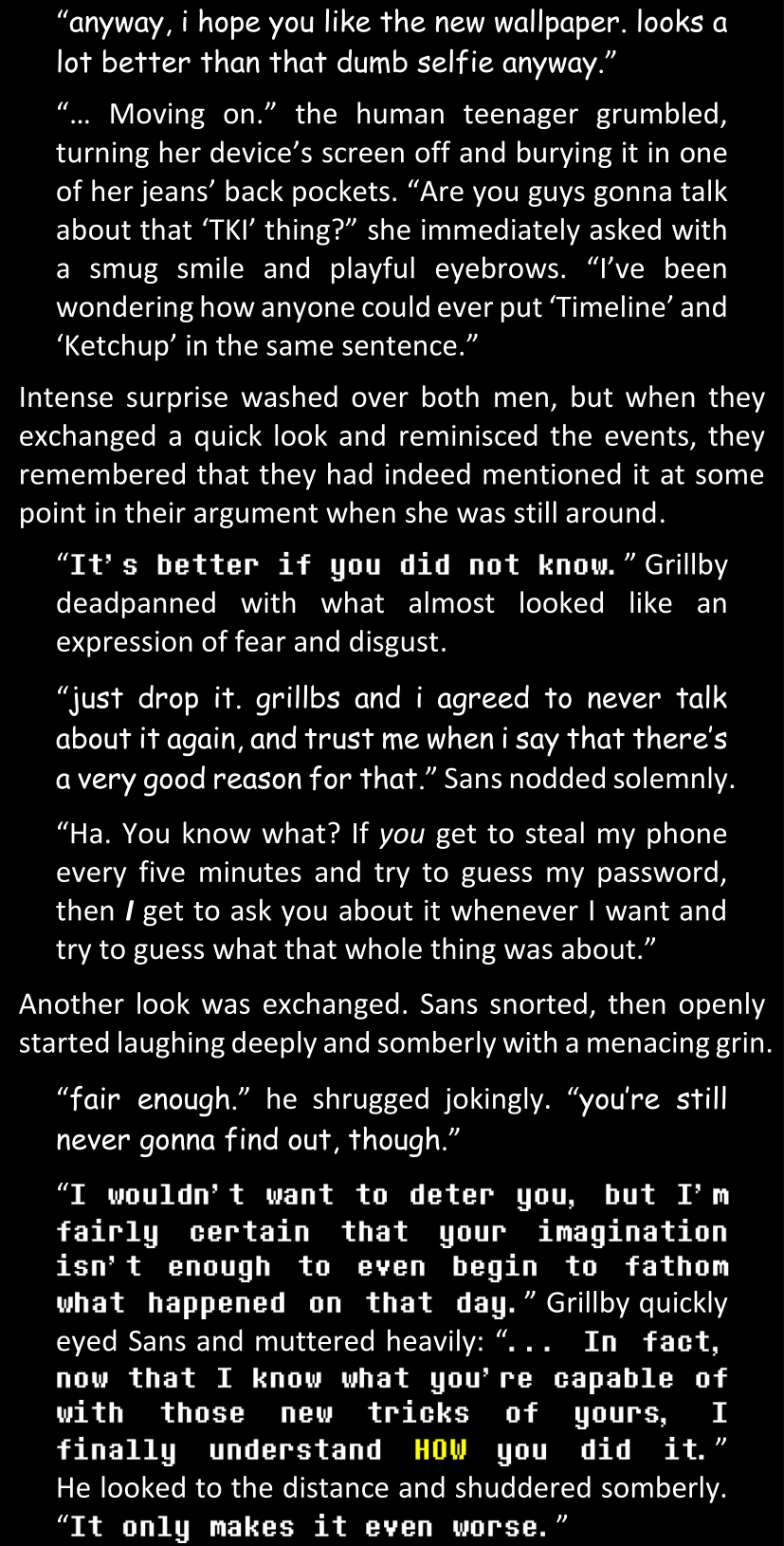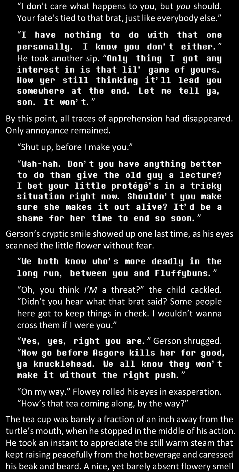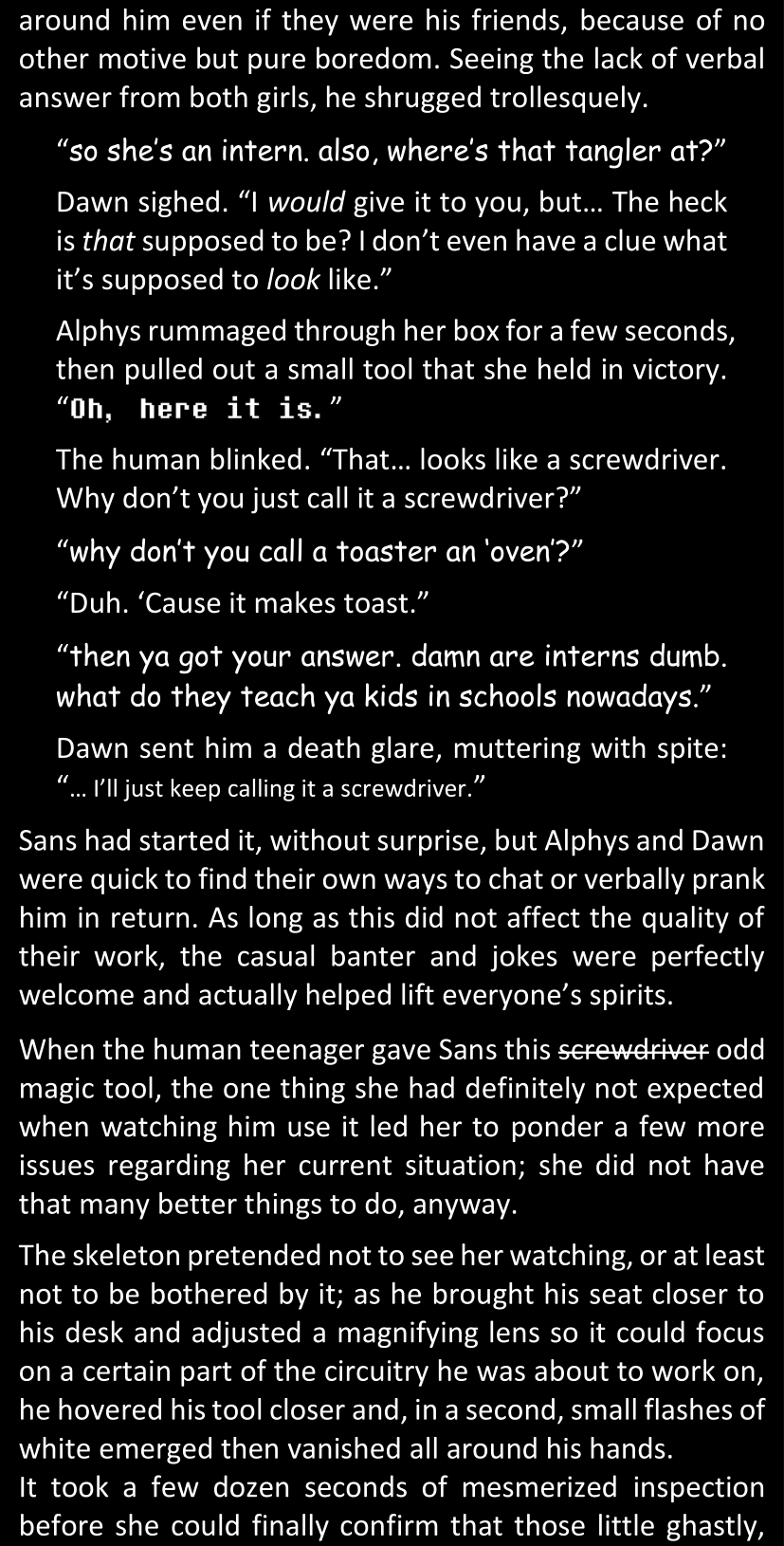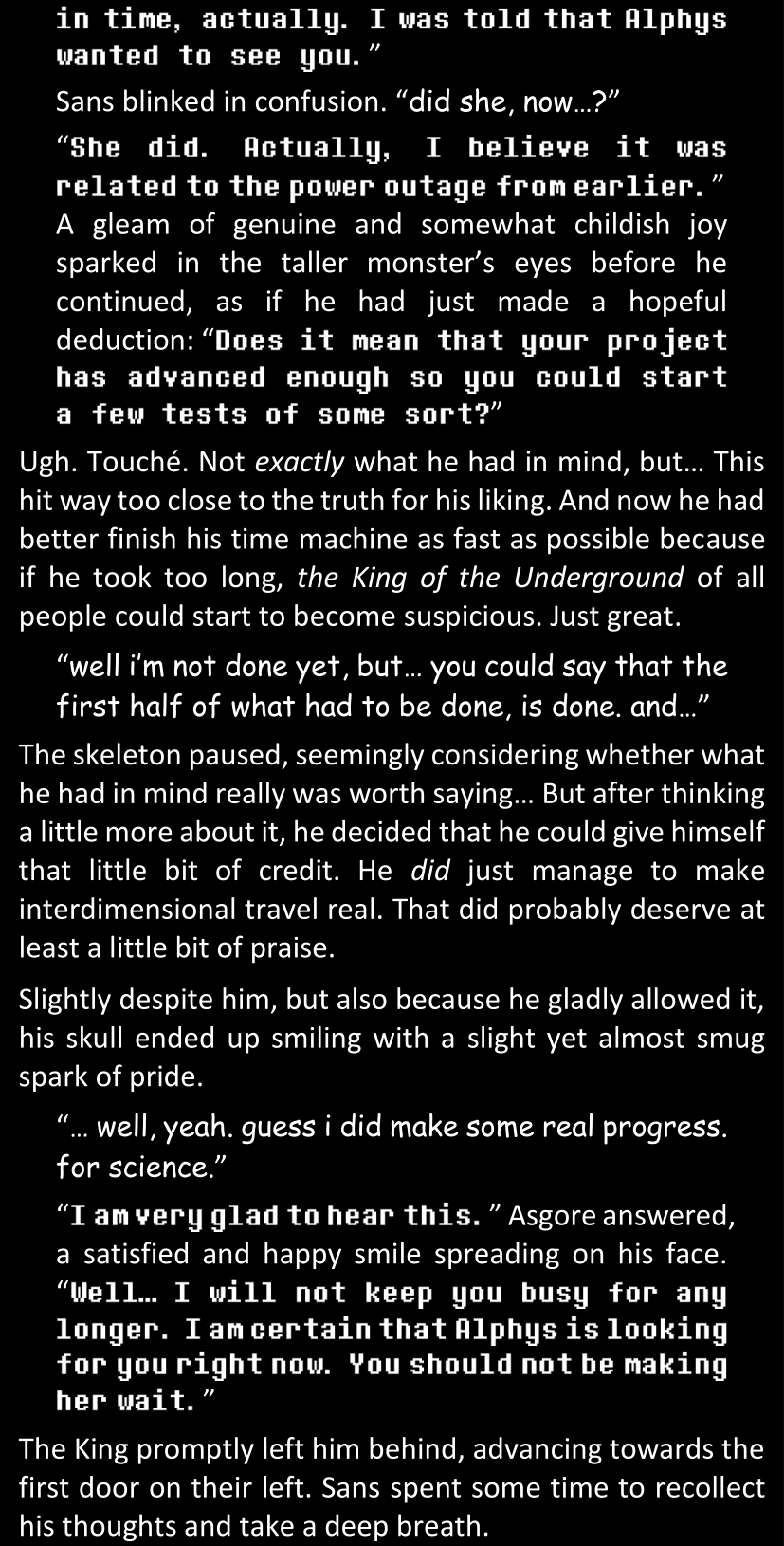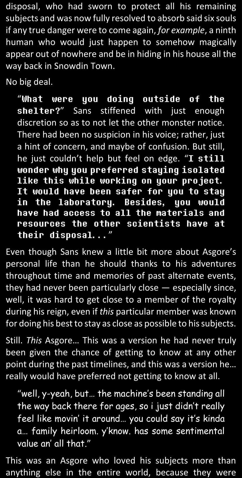 There was no worded response from Definitely-Not-Sans. She thought she might have heard a distant outburst of laughter, but it stopped abruptly and she hadn’t seen him move. He was still standing in the shadows, staring at her with an unreadable total lack of expression, both his hands deeply buried into his pockets.