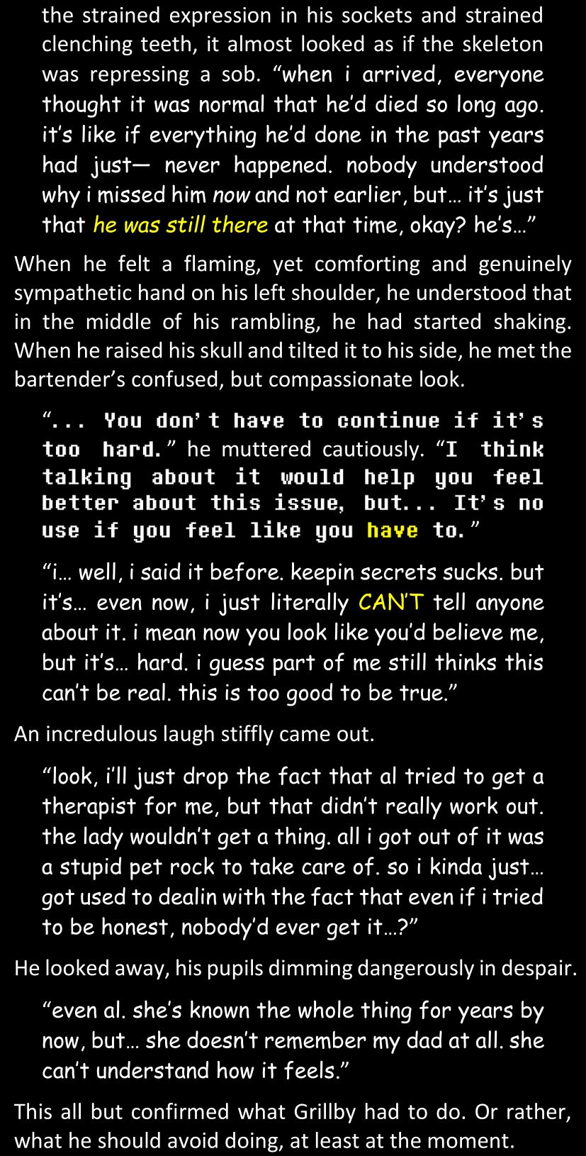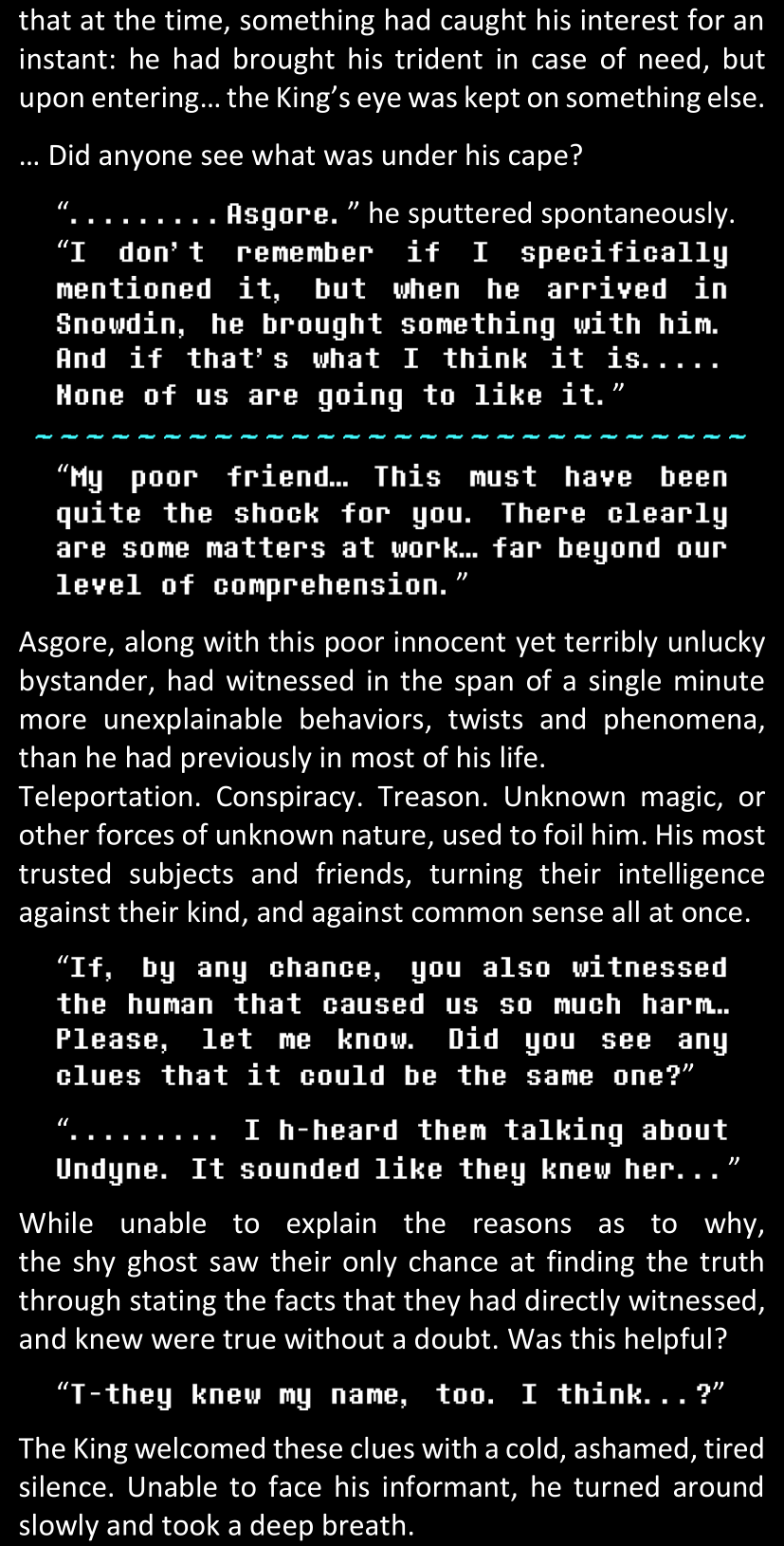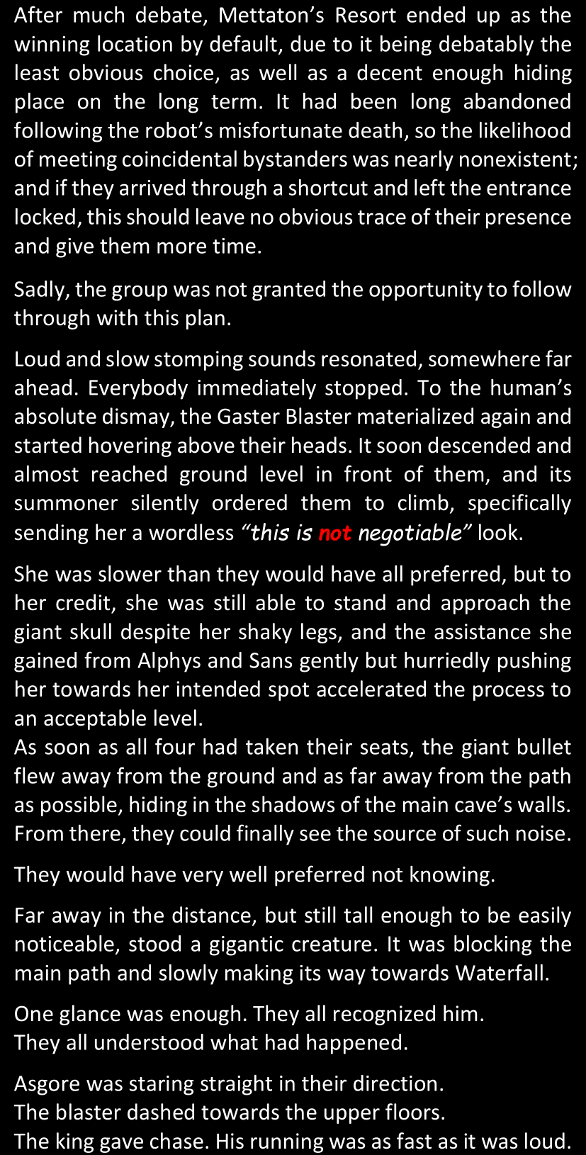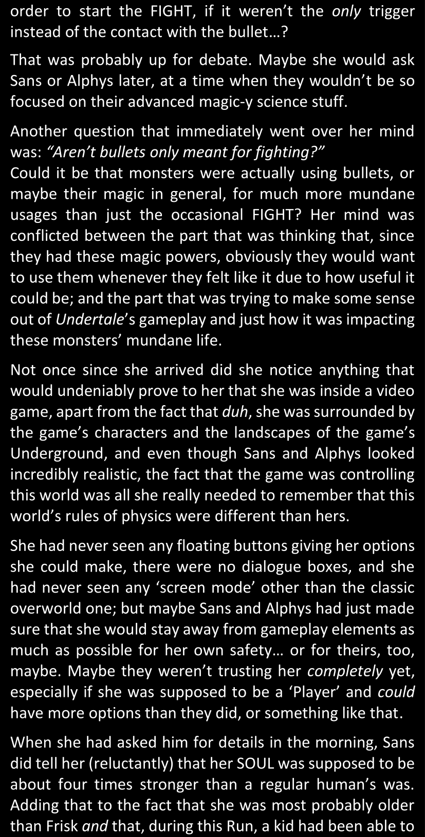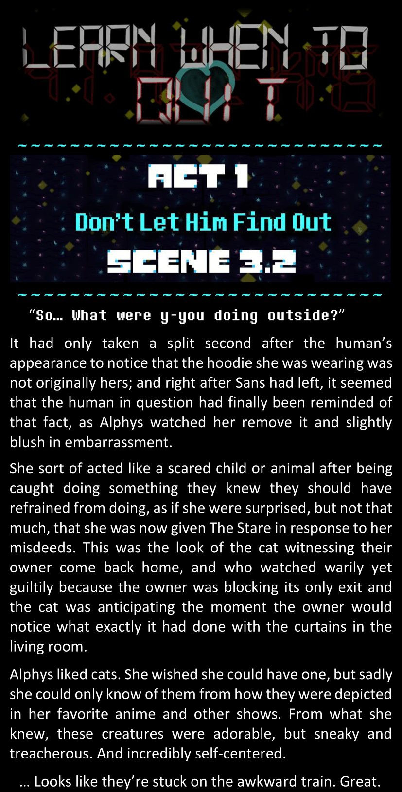 There was no worded response from Definitely-Not-Sans. She thought she might have heard a distant outburst of laughter, but it stopped abruptly and she hadn’t seen him move. He was still standing in the shadows, staring at her with an unreadable total lack of expression, both his hands deeply buried into his pockets.