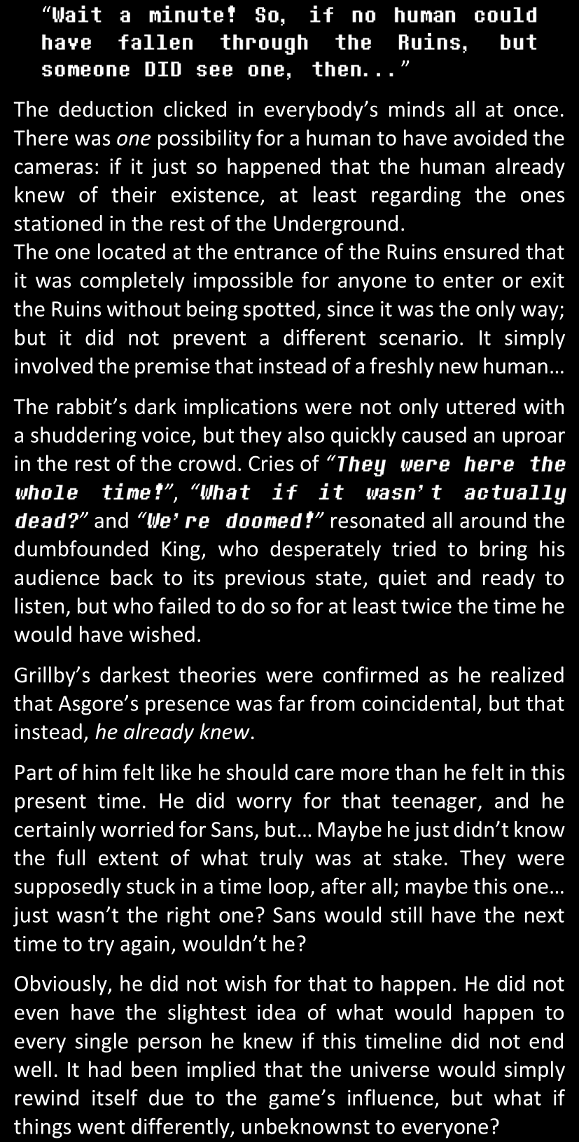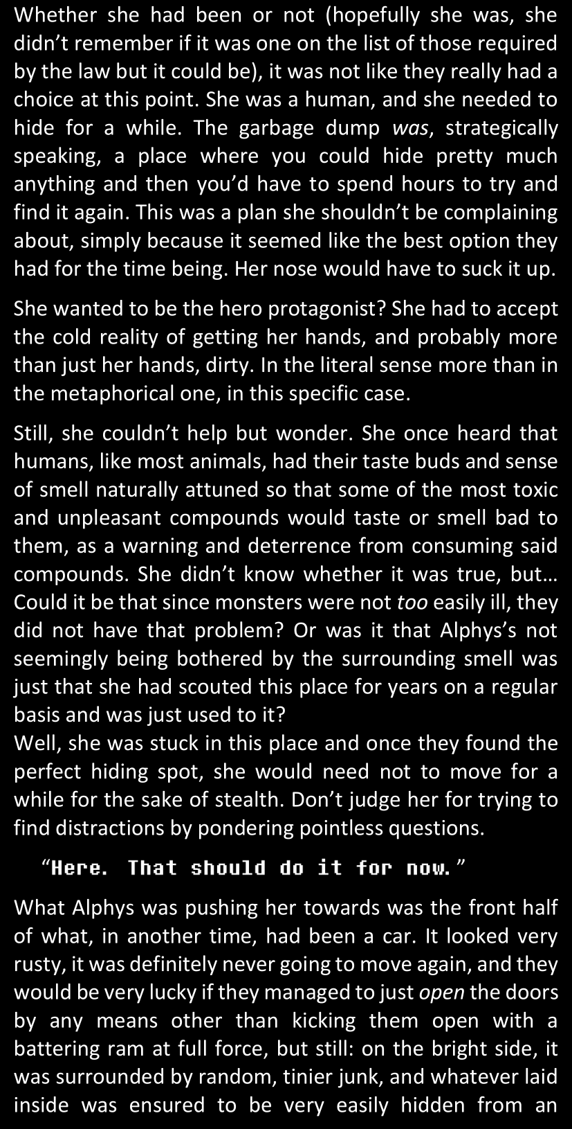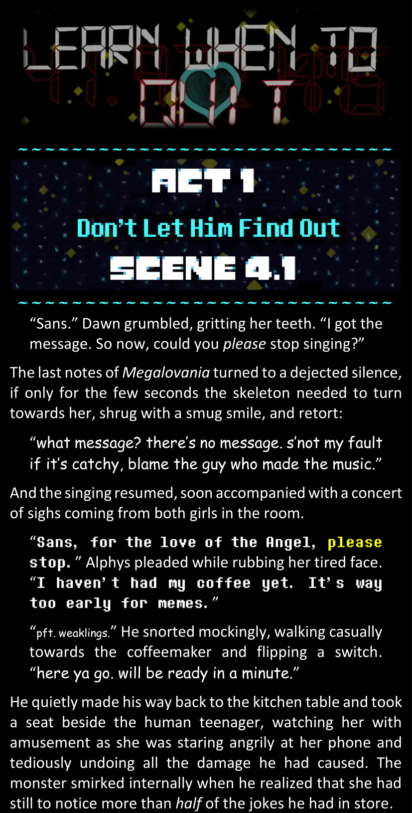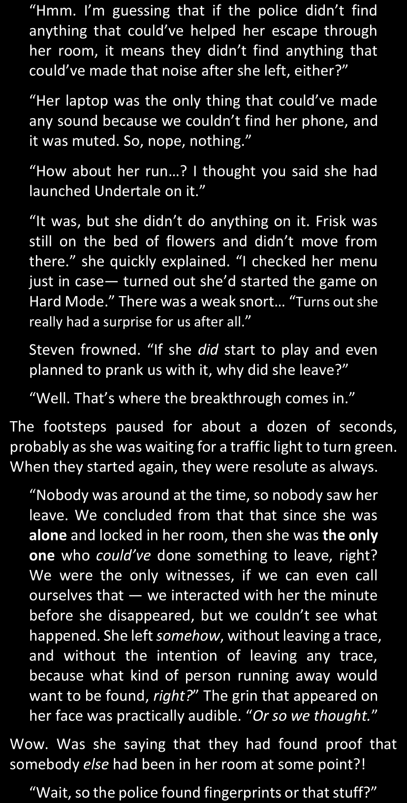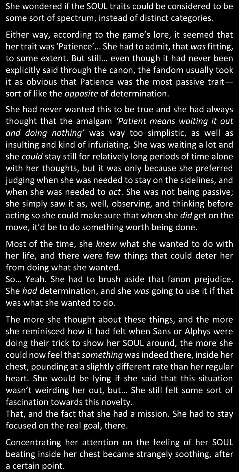 There was no worded response from Definitely-Not-Sans. She thought she might have heard a distant outburst of laughter, but it stopped abruptly and she hadn’t seen him move. He was still standing in the shadows, staring at her with an unreadable total lack of expression, both his hands deeply buried into his pockets.