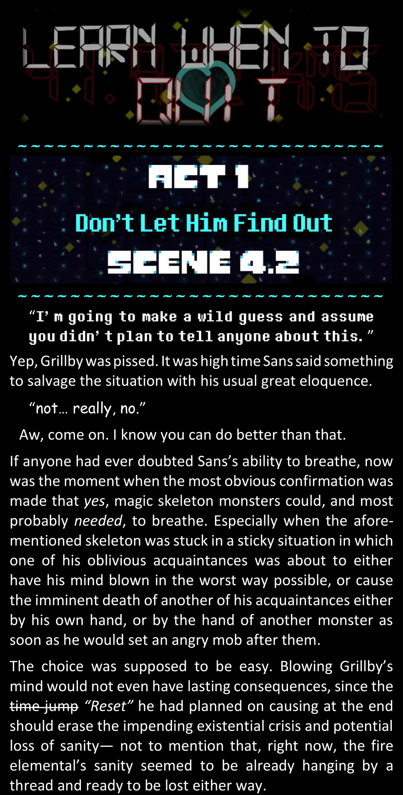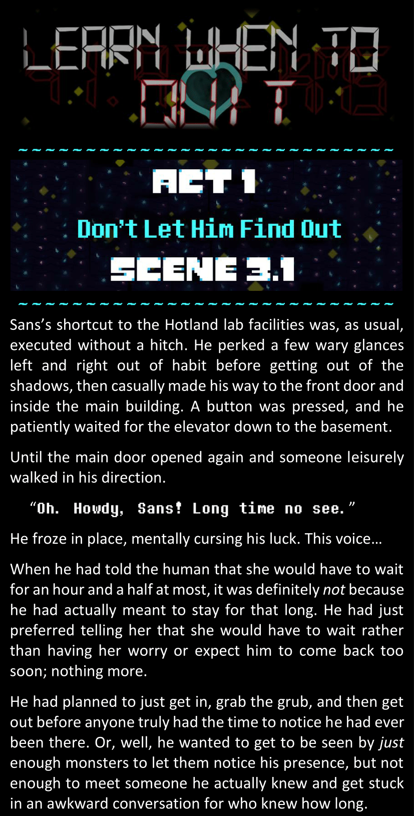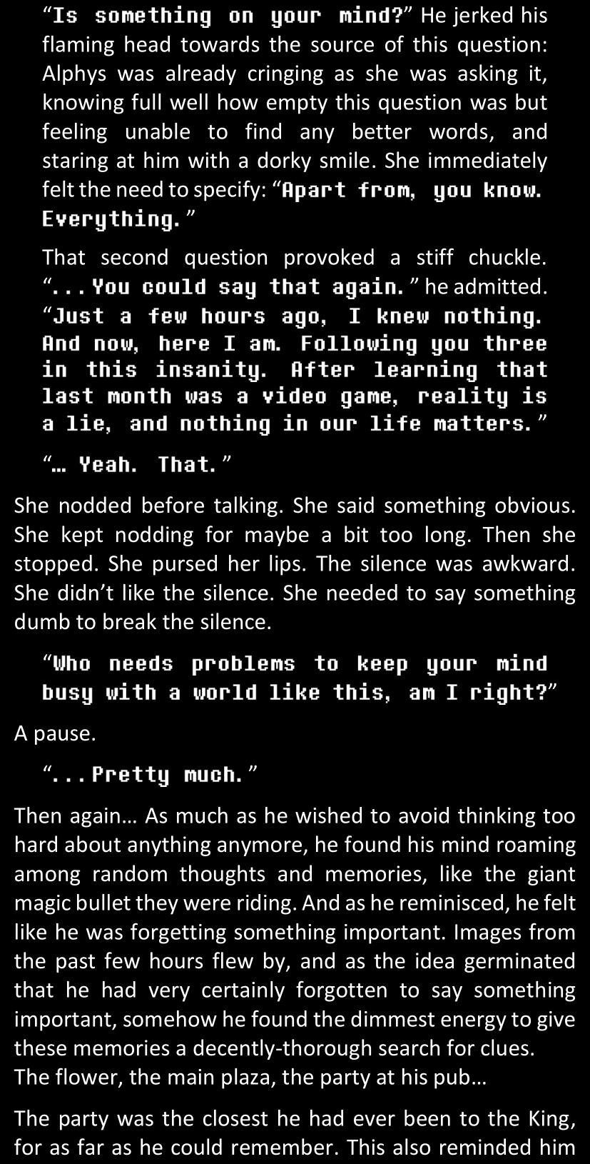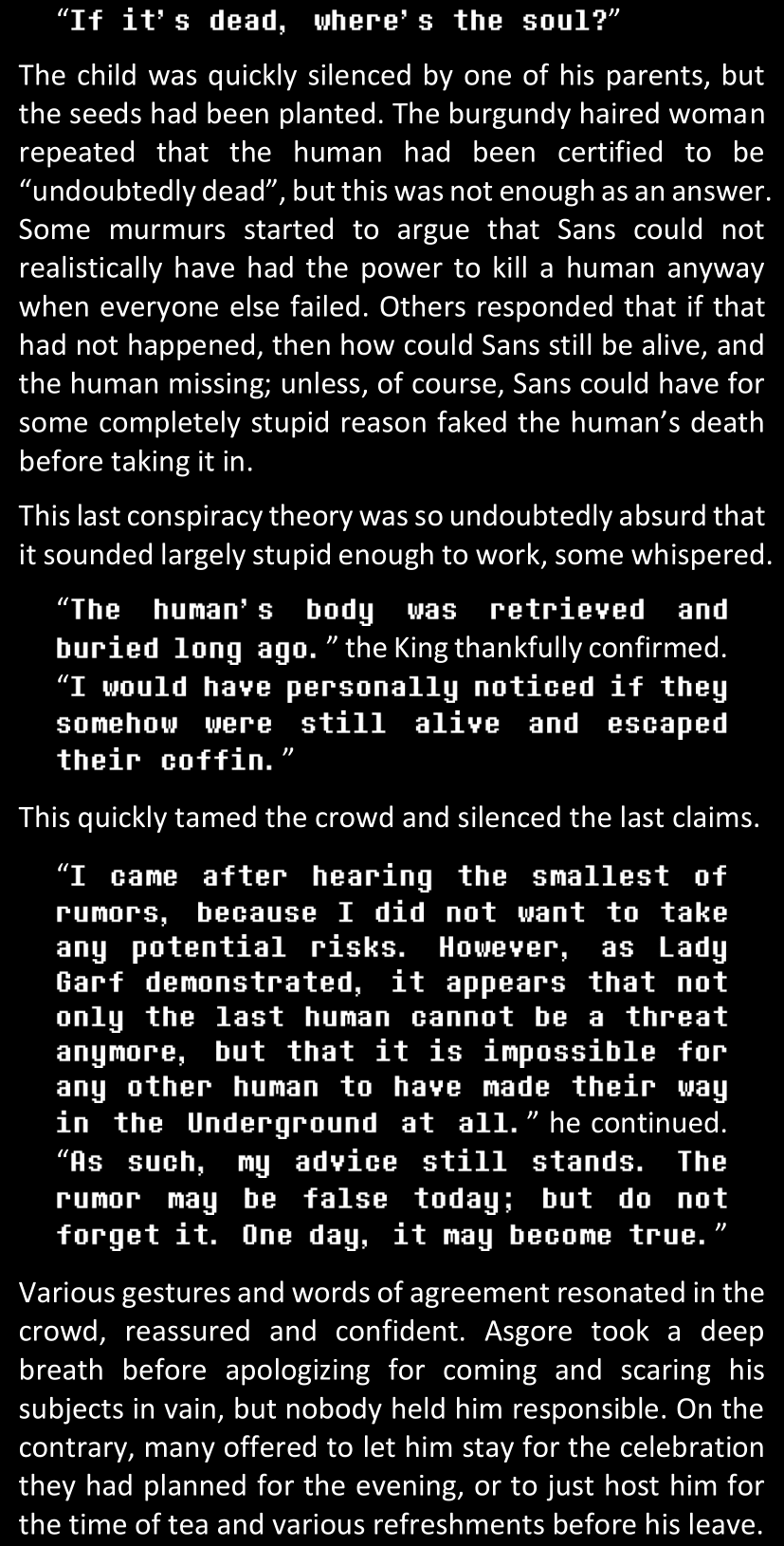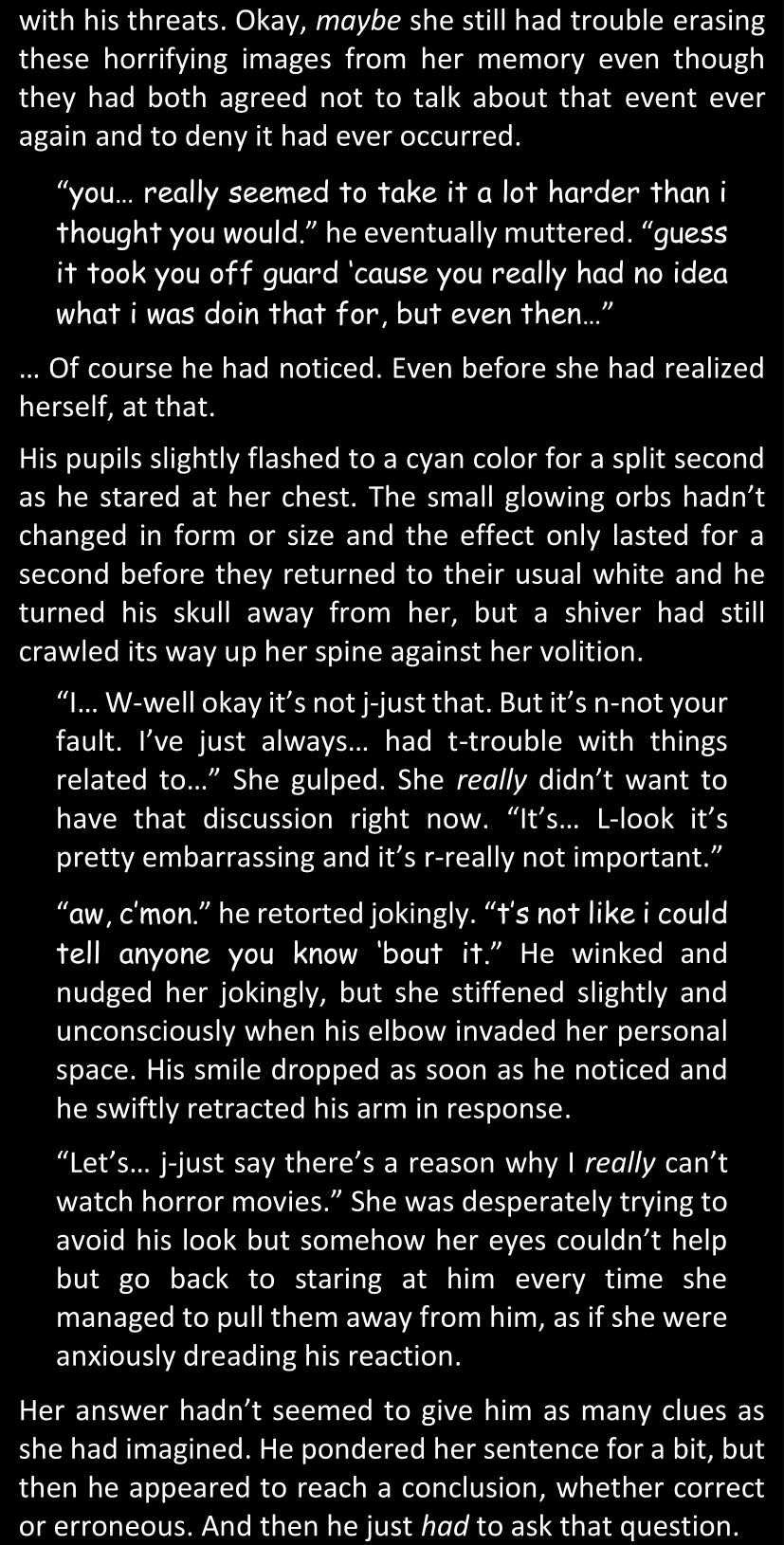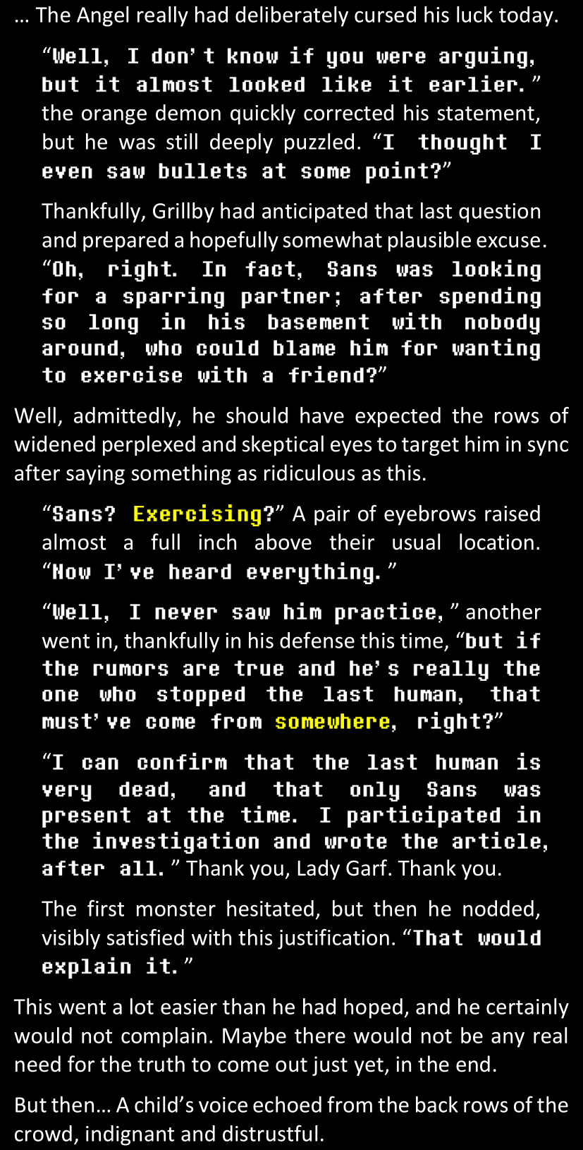 There was no worded response from Definitely-Not-Sans. She thought she might have heard a distant outburst of laughter, but it stopped abruptly and she hadn’t seen him move. He was still standing in the shadows, staring at her with an unreadable total lack of expression, both his hands deeply buried into his pockets.
