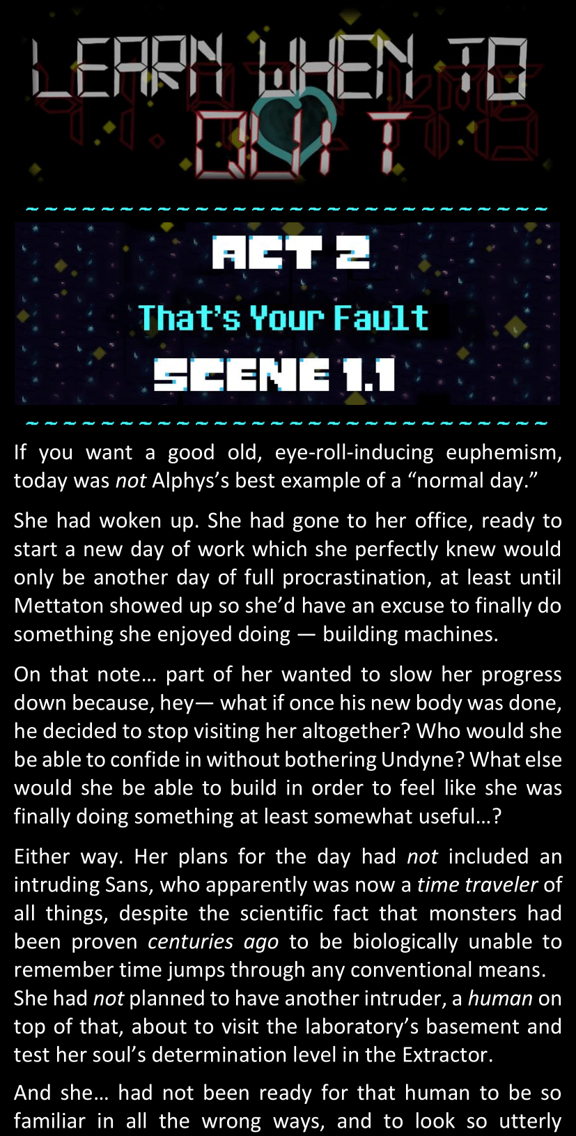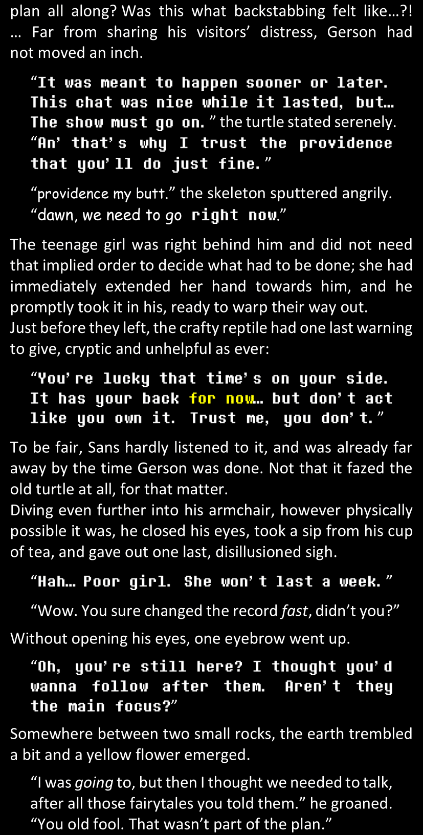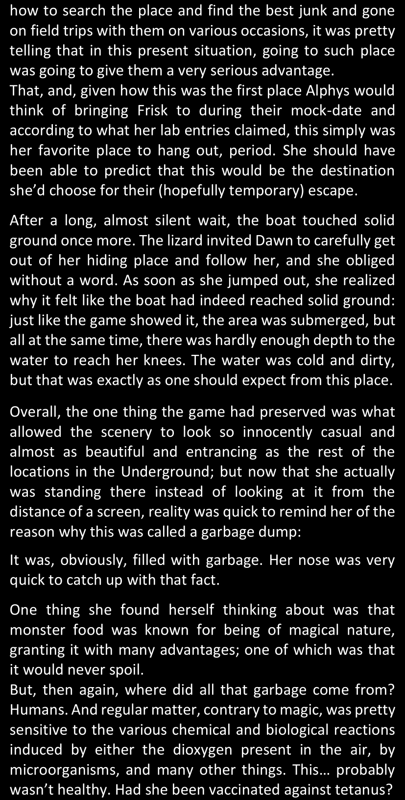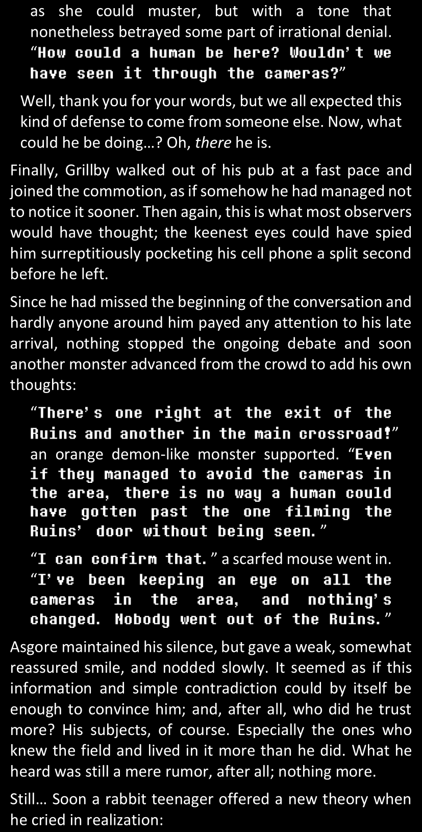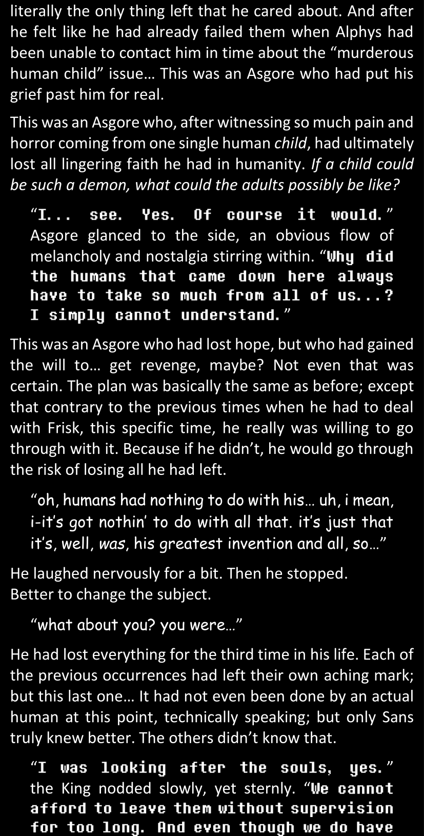 There was no worded response from Definitely-Not-Sans. She thought she might have heard a distant outburst of laughter, but it stopped abruptly and she hadn’t seen him move. He was still standing in the shadows, staring at her with an unreadable total lack of expression, both his hands deeply buried into his pockets.