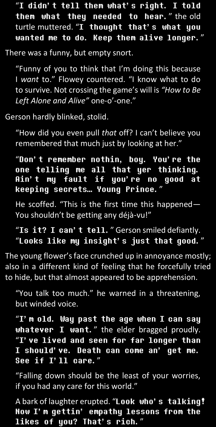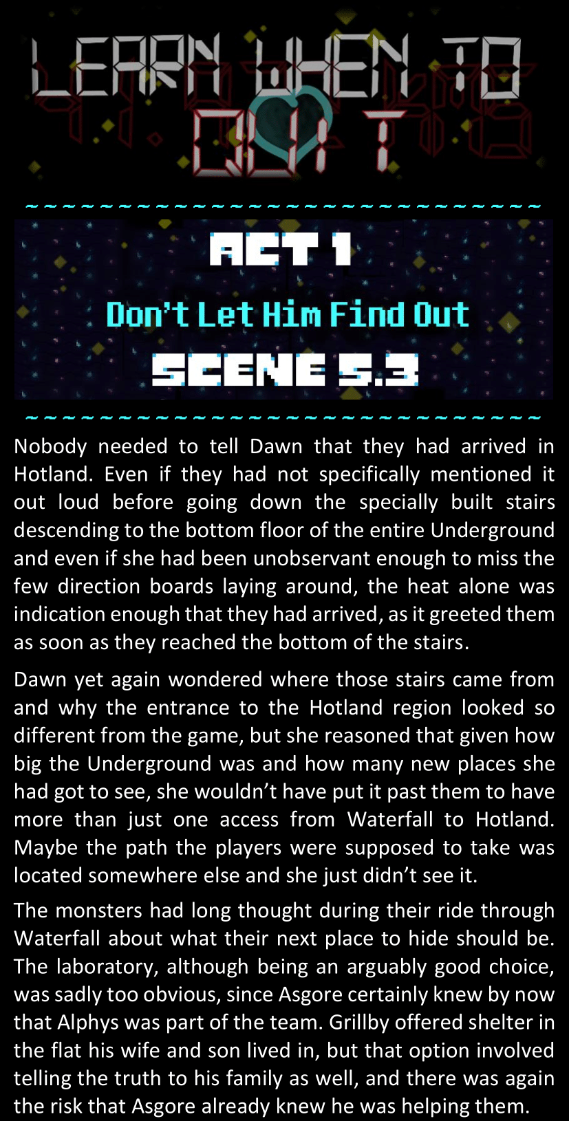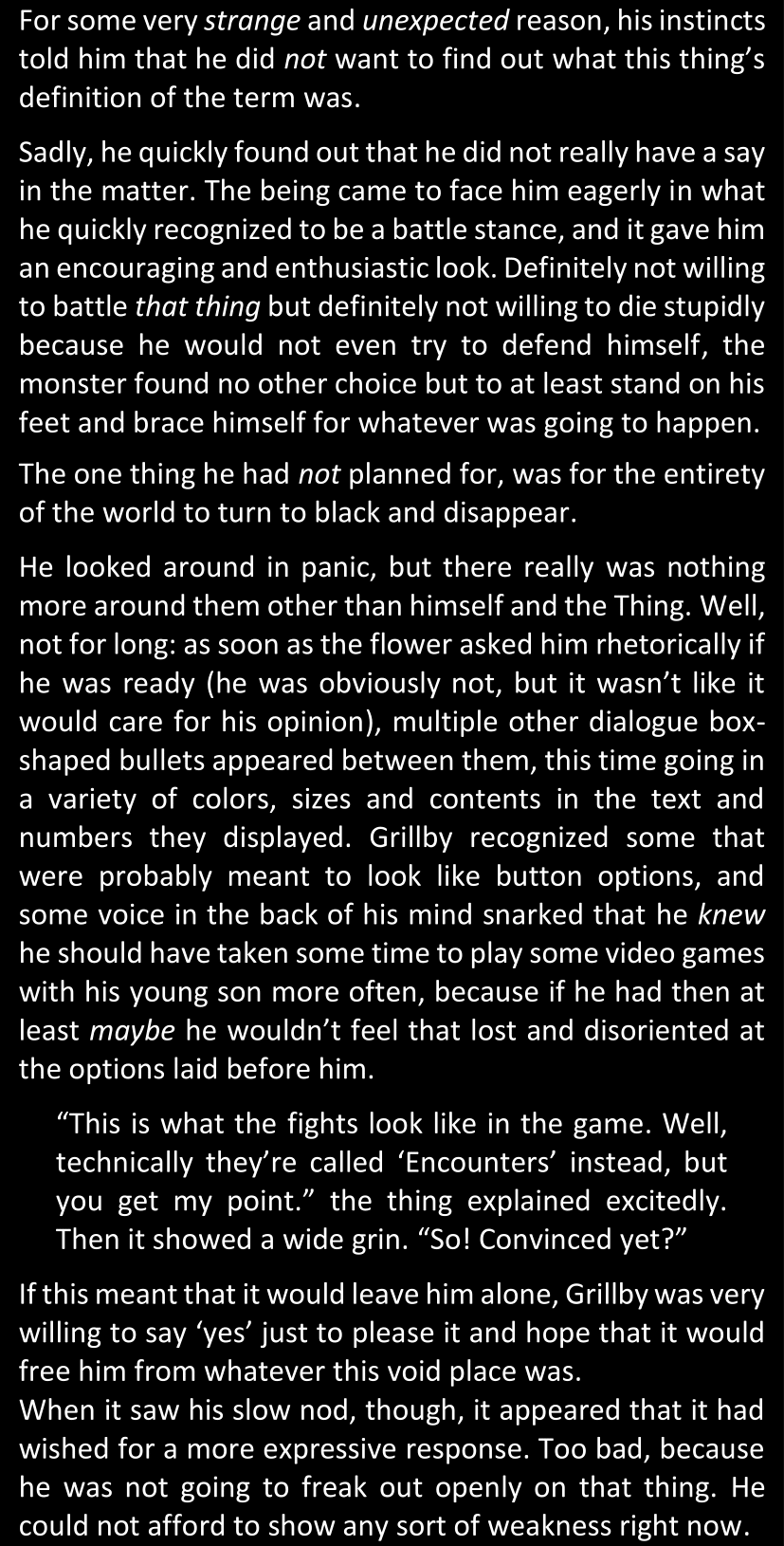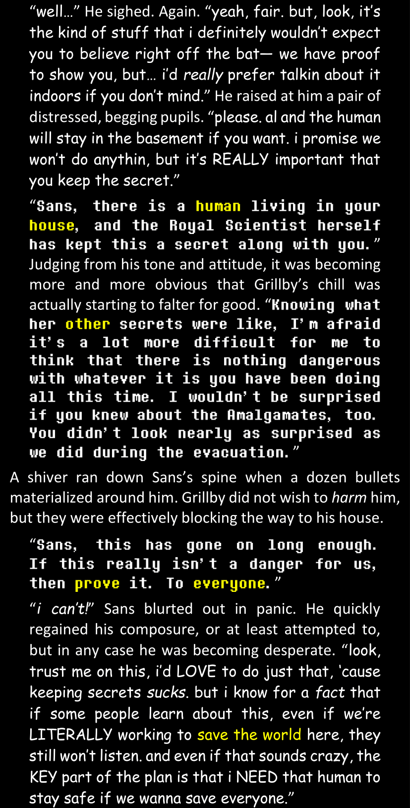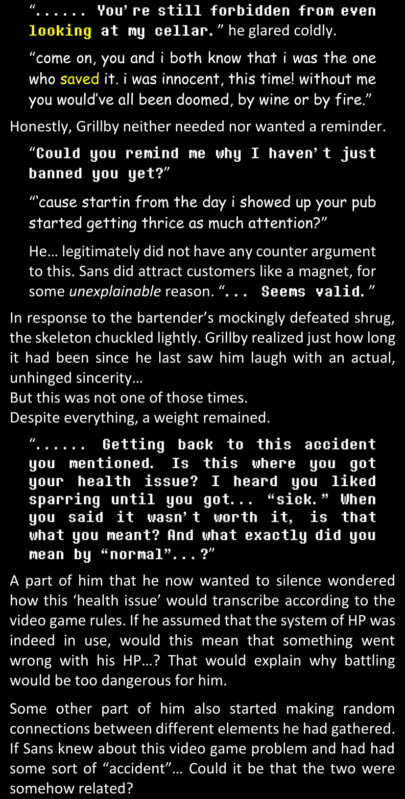 There was no worded response from Definitely-Not-Sans. She thought she might have heard a distant outburst of laughter, but it stopped abruptly and she hadn’t seen him move. He was still standing in the shadows, staring at her with an unreadable total lack of expression, both his hands deeply buried into his pockets.
