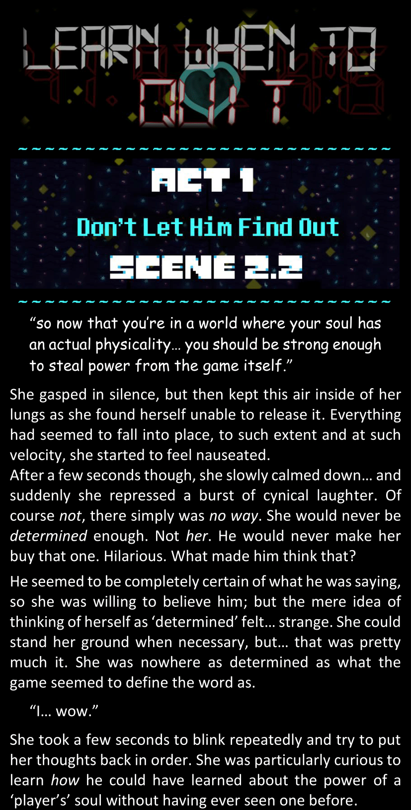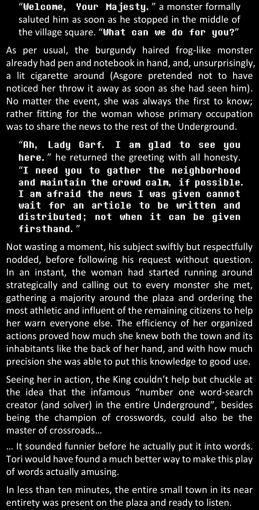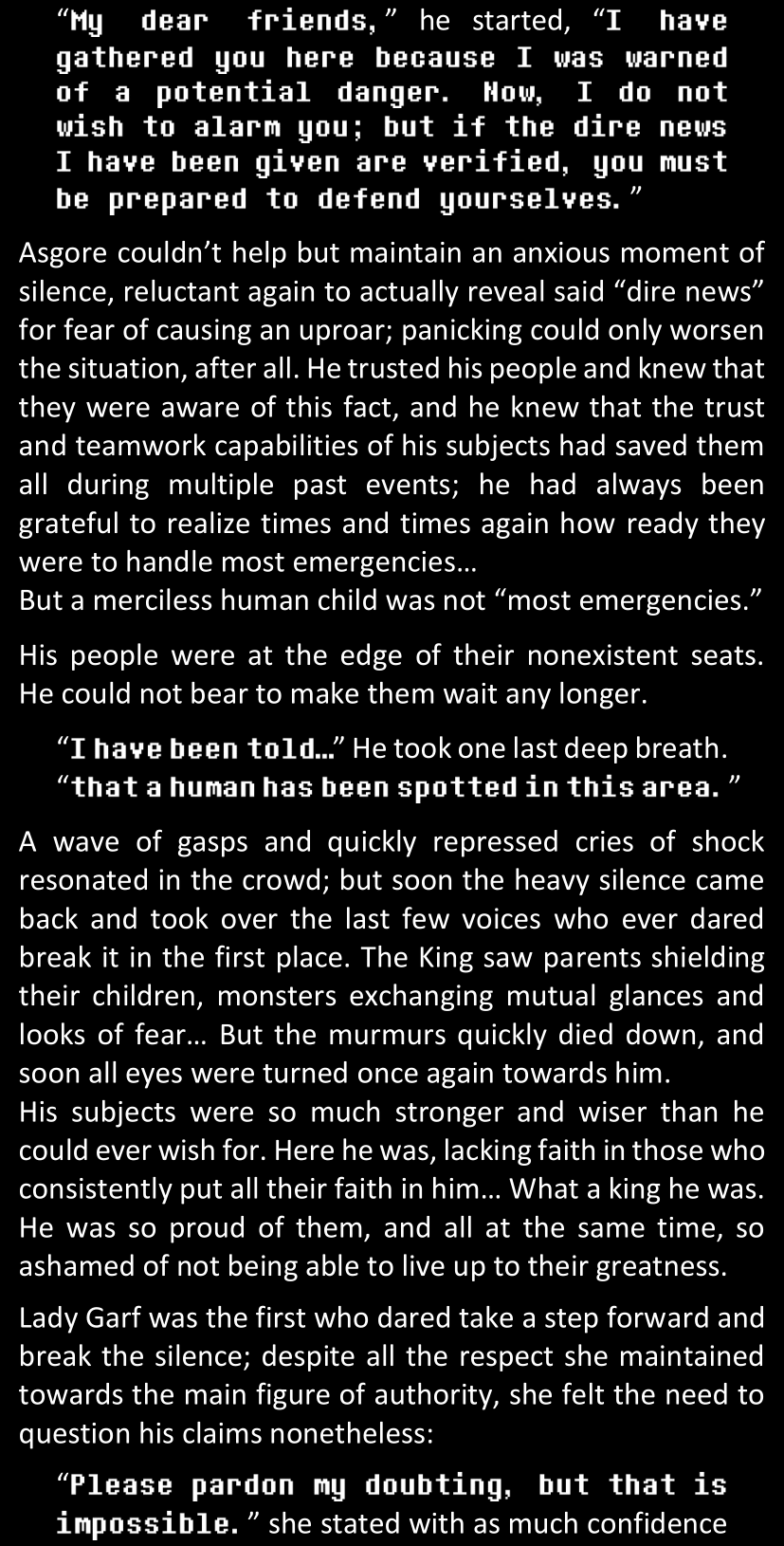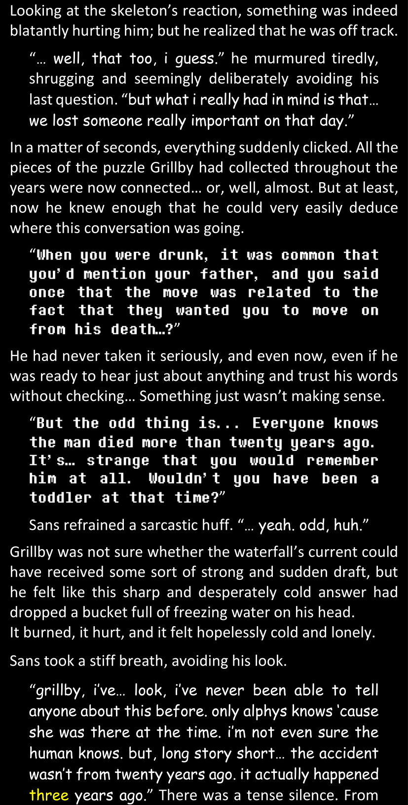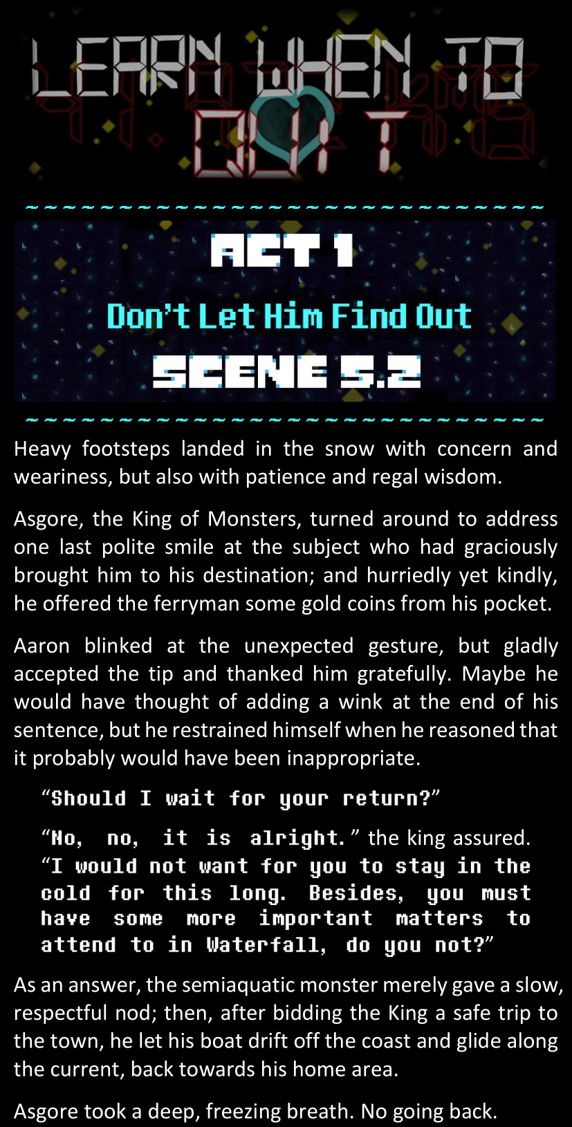 There was no worded response from Definitely-Not-Sans. She thought she might have heard a distant outburst of laughter, but it stopped abruptly and she hadn’t seen him move. He was still standing in the shadows, staring at her with an unreadable total lack of expression, both his hands deeply buried into his pockets.