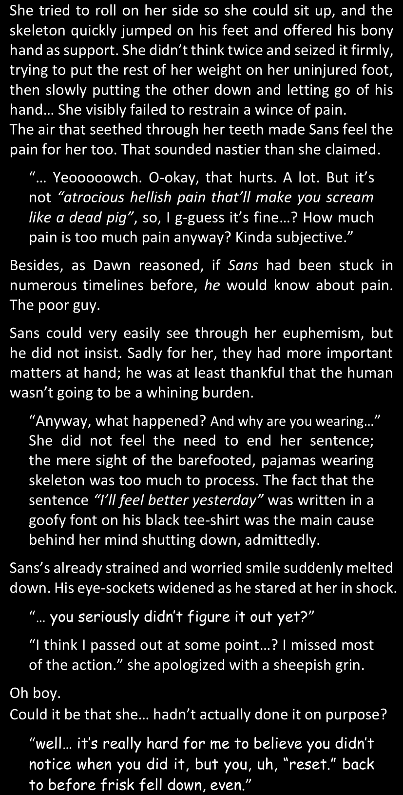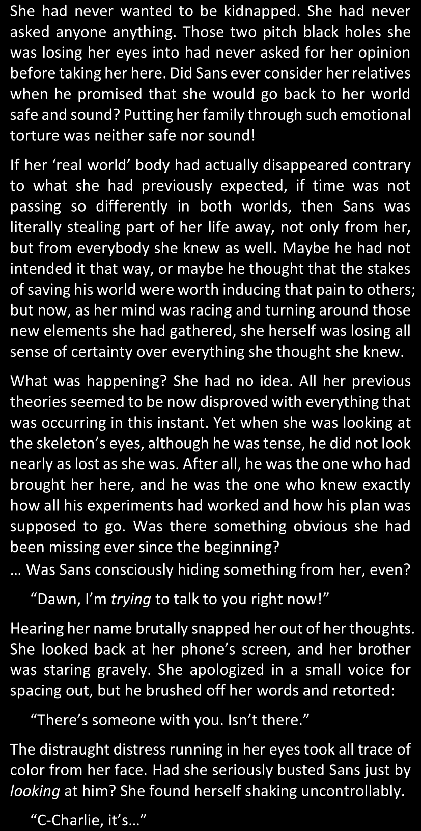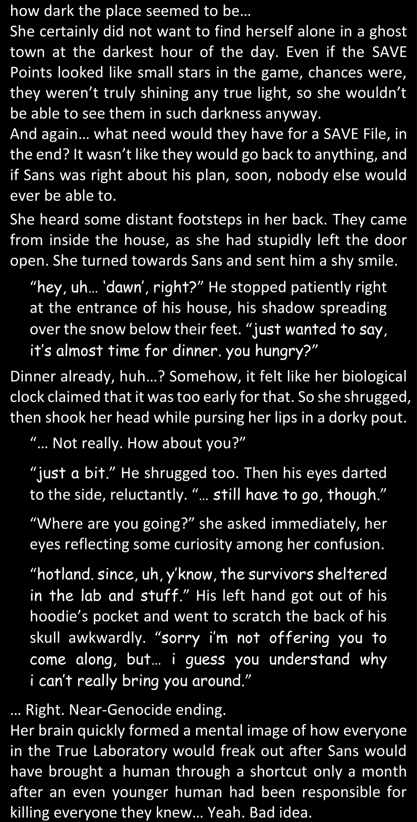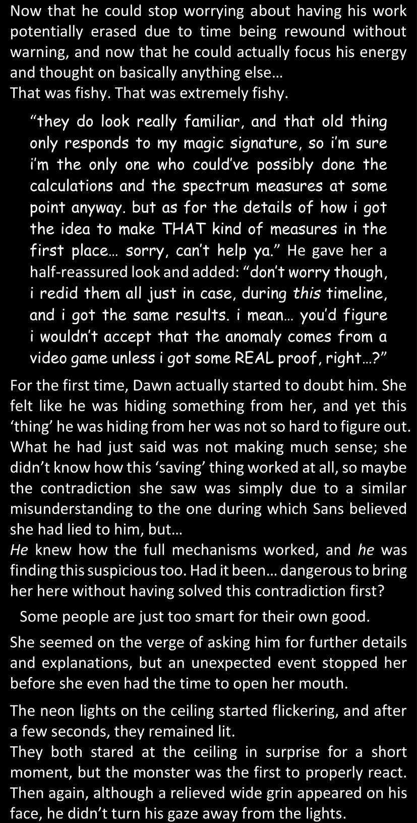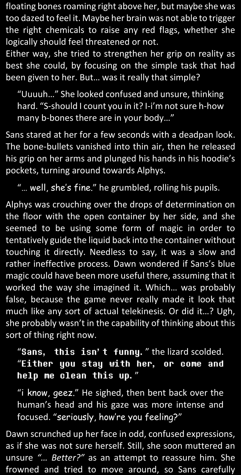 Even after she’s more awake and calmed down, Dawn is still scared of Sans and avoids looking at him. When she asks him what happened to the player while she was unconscious, Sans tells her that he once again had no other choice but to kill Frisk and that this time, they did not Reload for the two hours that followed. Dawn grows some more resentment as she wonders why Sans wasn’t able to get the player on their side, and why he was so adamant on being the only one to ever talk to them; but she doesn’t ask him anything else, feeling too uncomfortable to continue the conversation. Some more doubts appear in her mind (“Maybe he simply doesn’t want or need the player to be on their side for some reason?”), but the mental image of Sans’s cold-blooded face upon killing Frisk makes her too afraid to continue digging, as she is growing more and more terrified of what could happen if her suspicions were right.