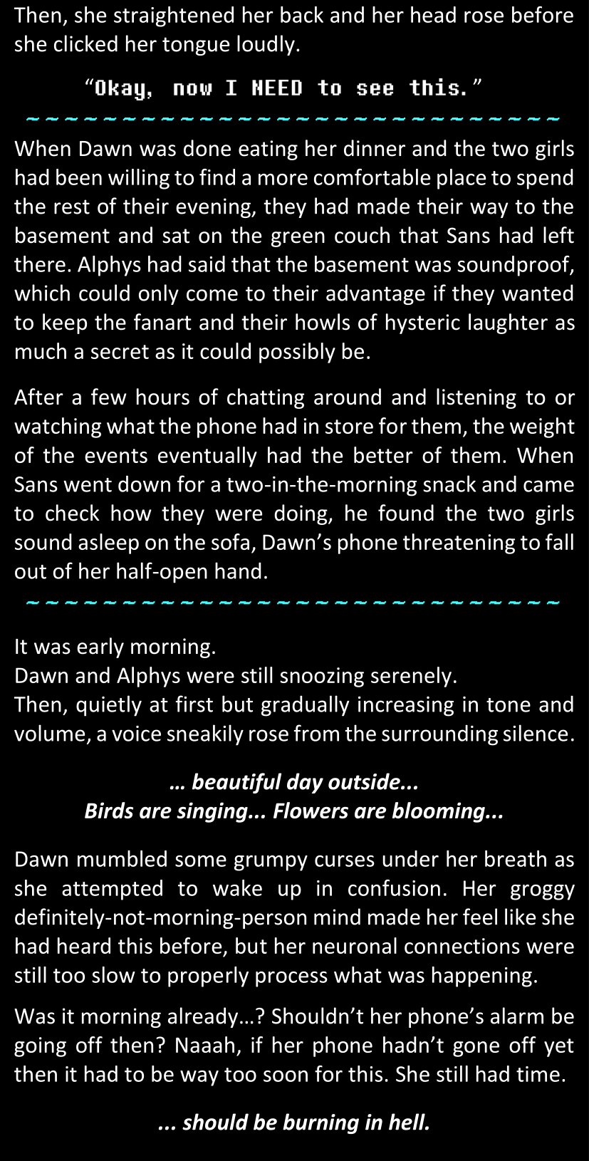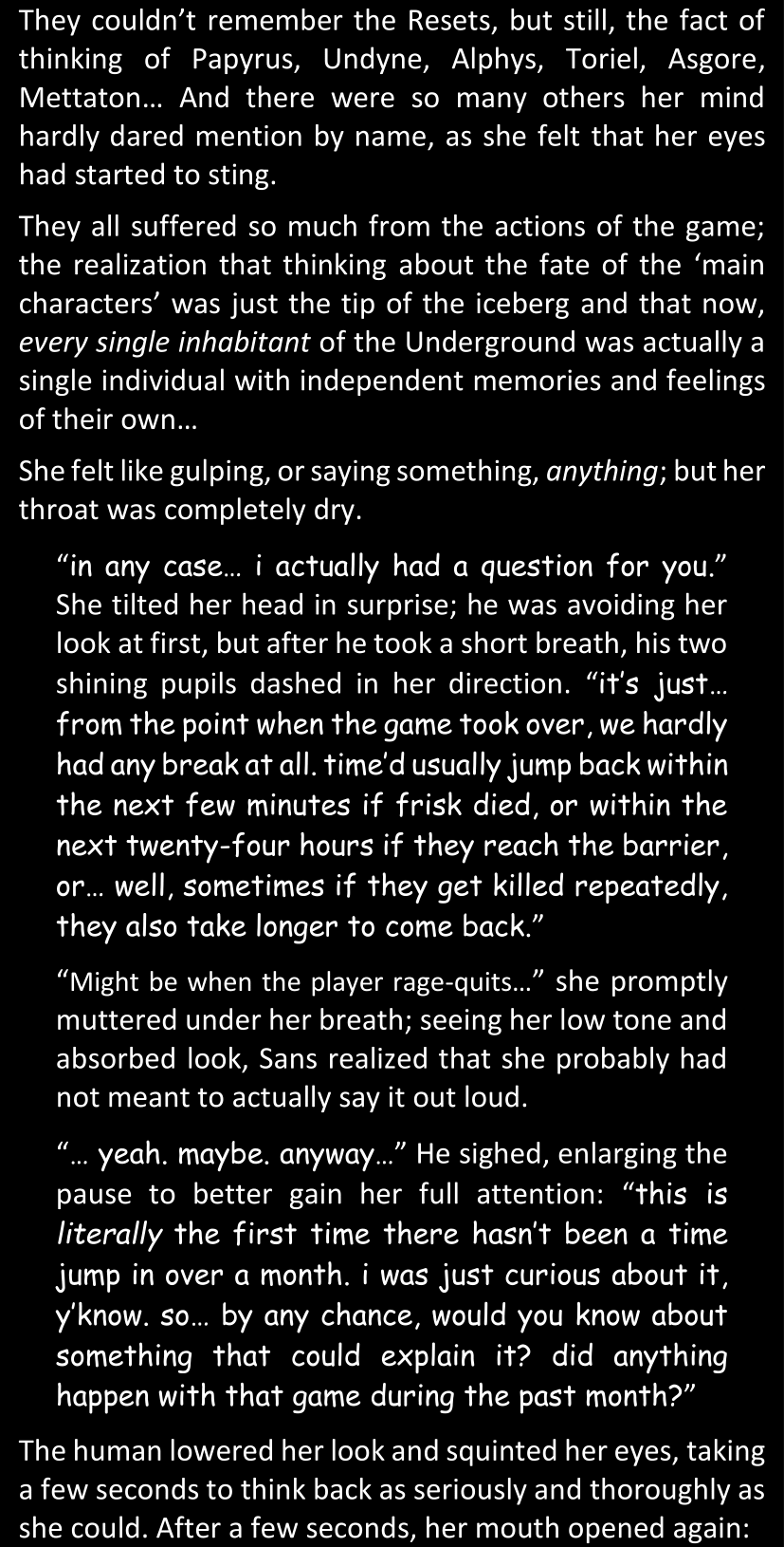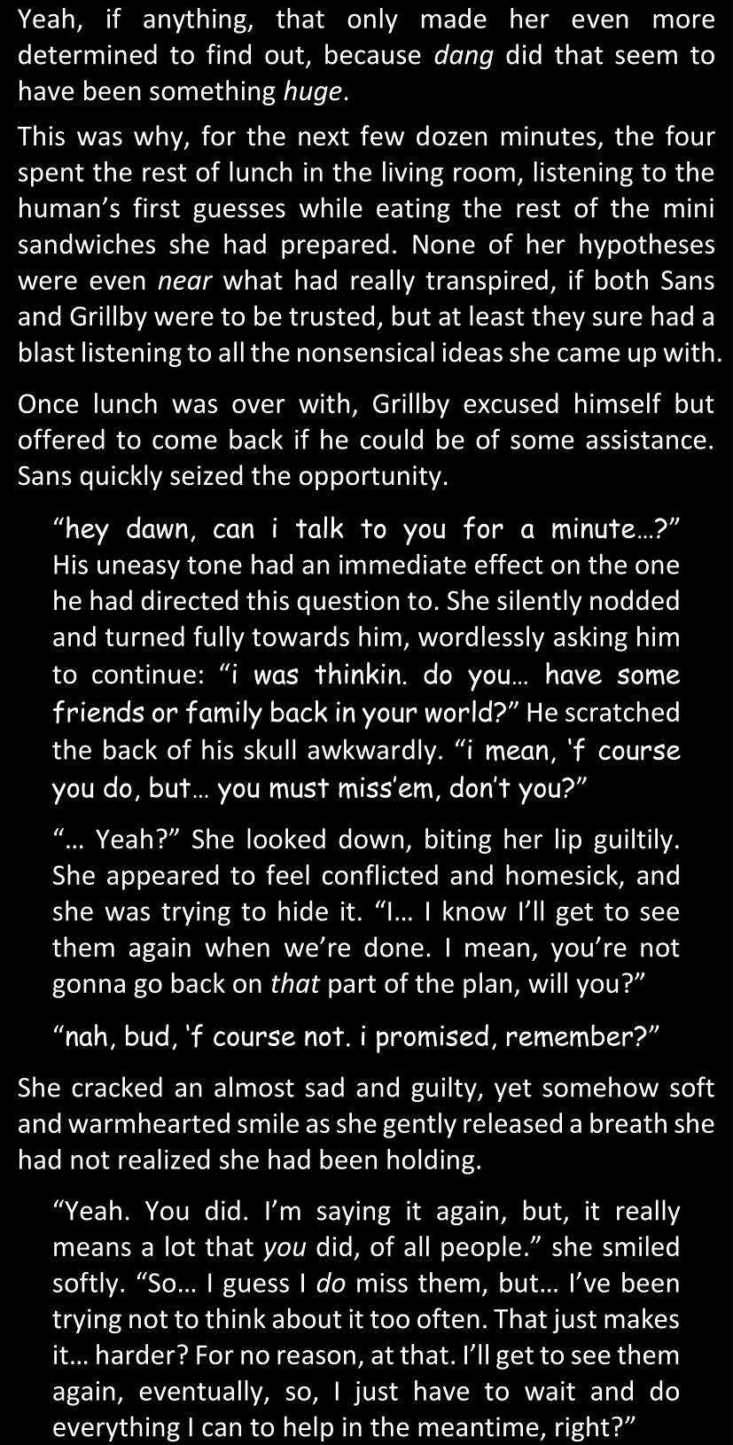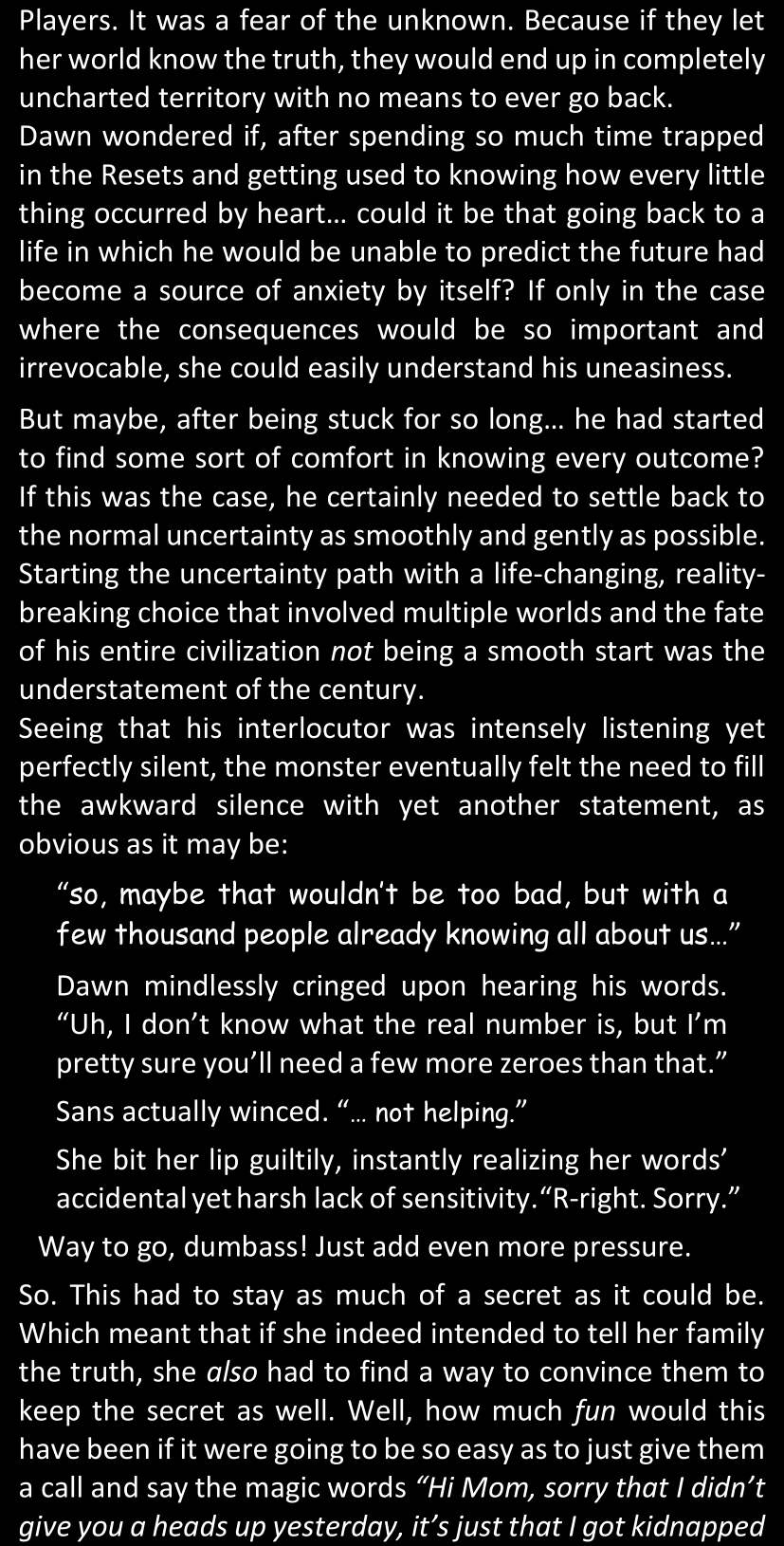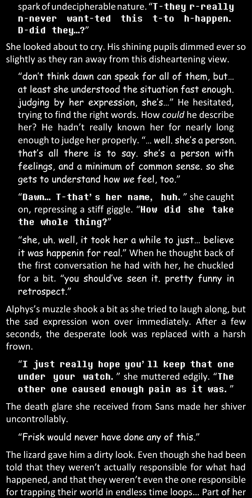 Even after she’s more awake and calmed down, Dawn is still scared of Sans and avoids looking at him. When she asks him what happened to the player while she was unconscious, Sans tells her that he once again had no other choice but to kill Frisk and that this time, they did not Reload for the two hours that followed. Dawn grows some more resentment as she wonders why Sans wasn’t able to get the player on their side, and why he was so adamant on being the only one to ever talk to them; but she doesn’t ask him anything else, feeling too uncomfortable to continue the conversation. Some more doubts appear in her mind (“Maybe he simply doesn’t want or need the player to be on their side for some reason?”), but the mental image of Sans’s cold-blooded face upon killing Frisk makes her too afraid to continue digging, as she is growing more and more terrified of what could happen if her suspicions were right.
