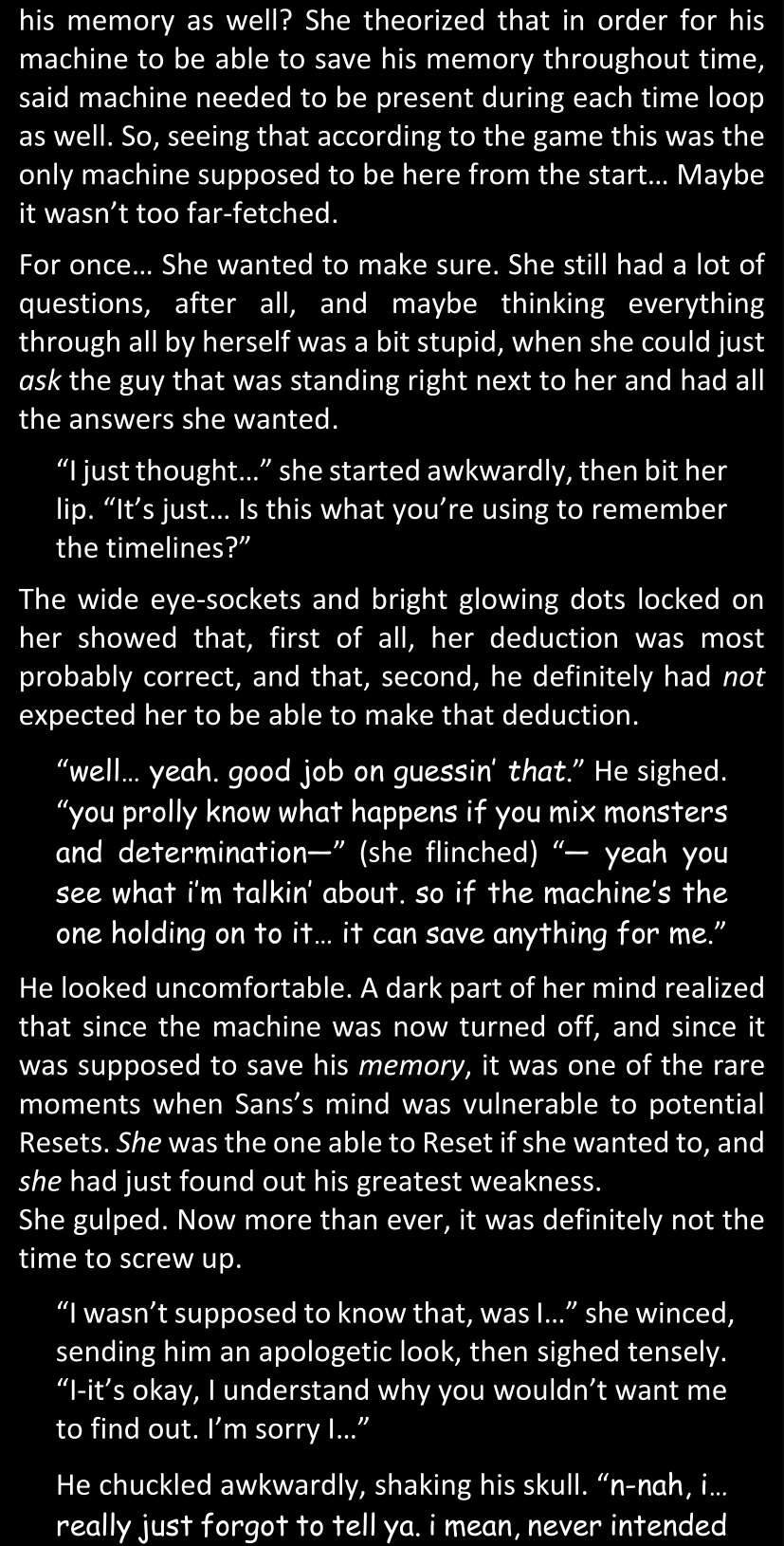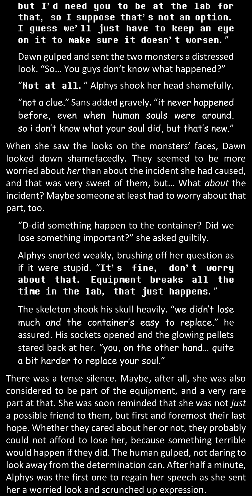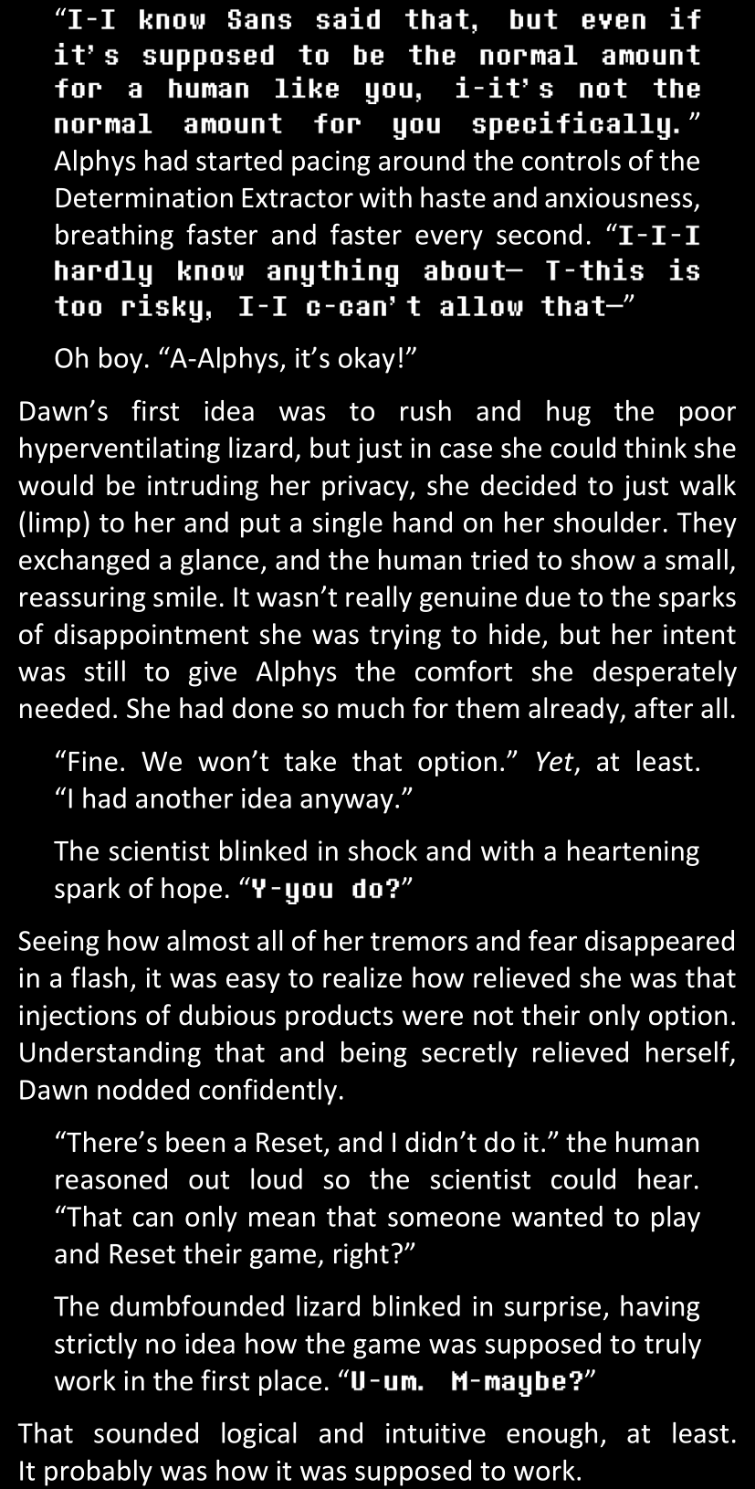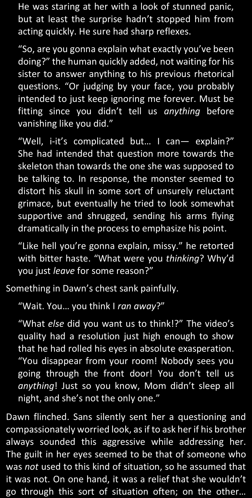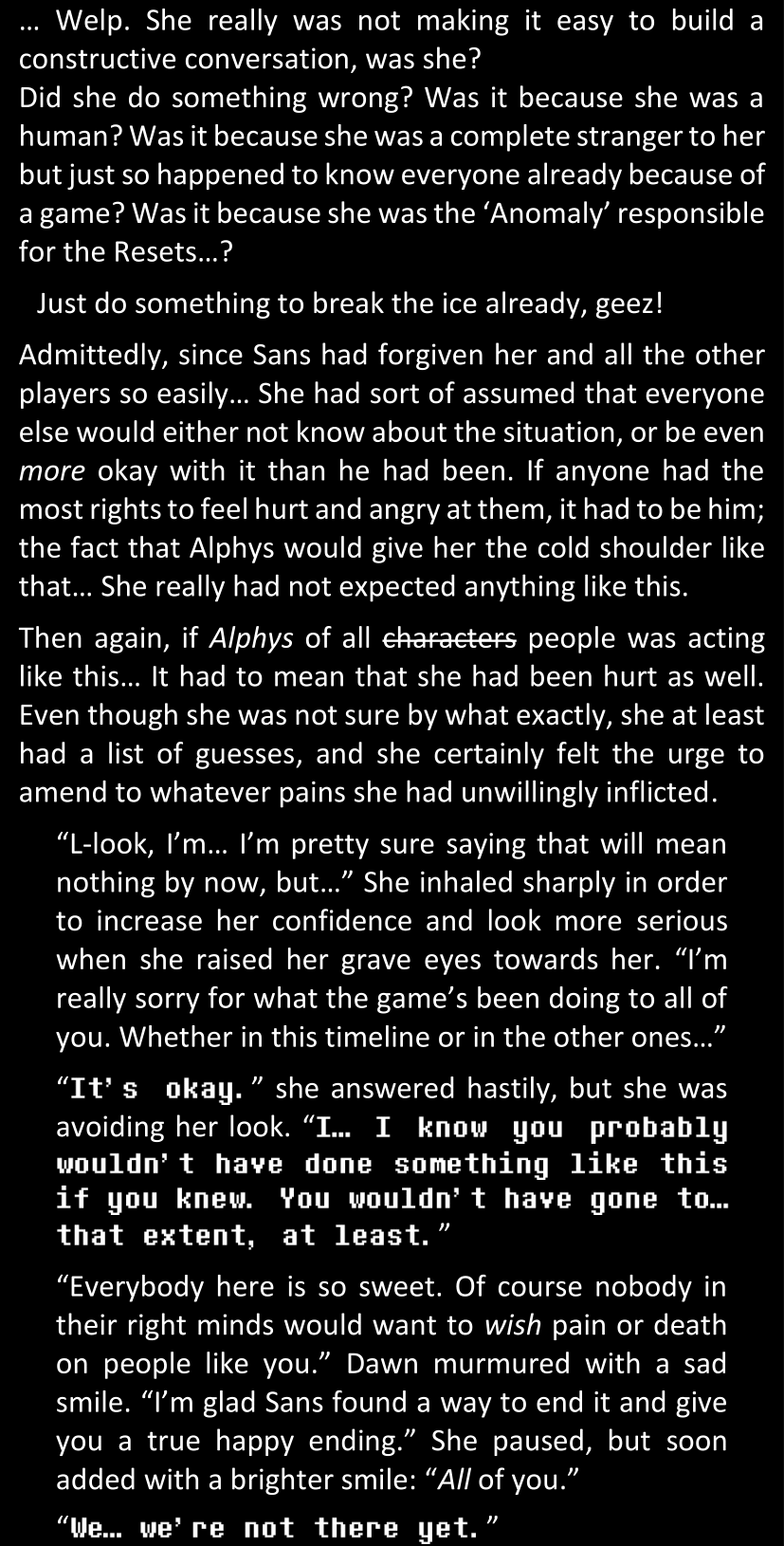 Even after she’s more awake and calmed down, Dawn is still scared of Sans and avoids looking at him. When she asks him what happened to the player while she was unconscious, Sans tells her that he once again had no other choice but to kill Frisk and that this time, they did not Reload for the two hours that followed. Dawn grows some more resentment as she wonders why Sans wasn’t able to get the player on their side, and why he was so adamant on being the only one to ever talk to them; but she doesn’t ask him anything else, feeling too uncomfortable to continue the conversation. Some more doubts appear in her mind (“Maybe he simply doesn’t want or need the player to be on their side for some reason?”), but the mental image of Sans’s cold-blooded face upon killing Frisk makes her too afraid to continue digging, as she is growing more and more terrified of what could happen if her suspicions were right.