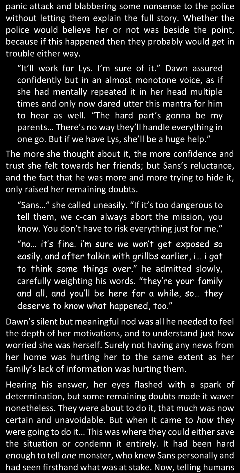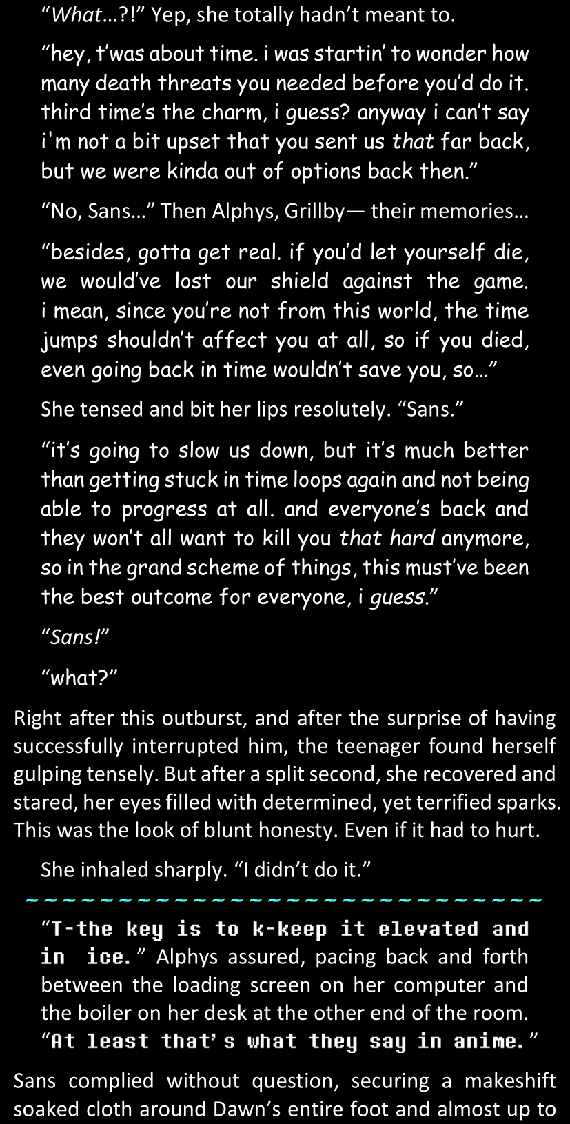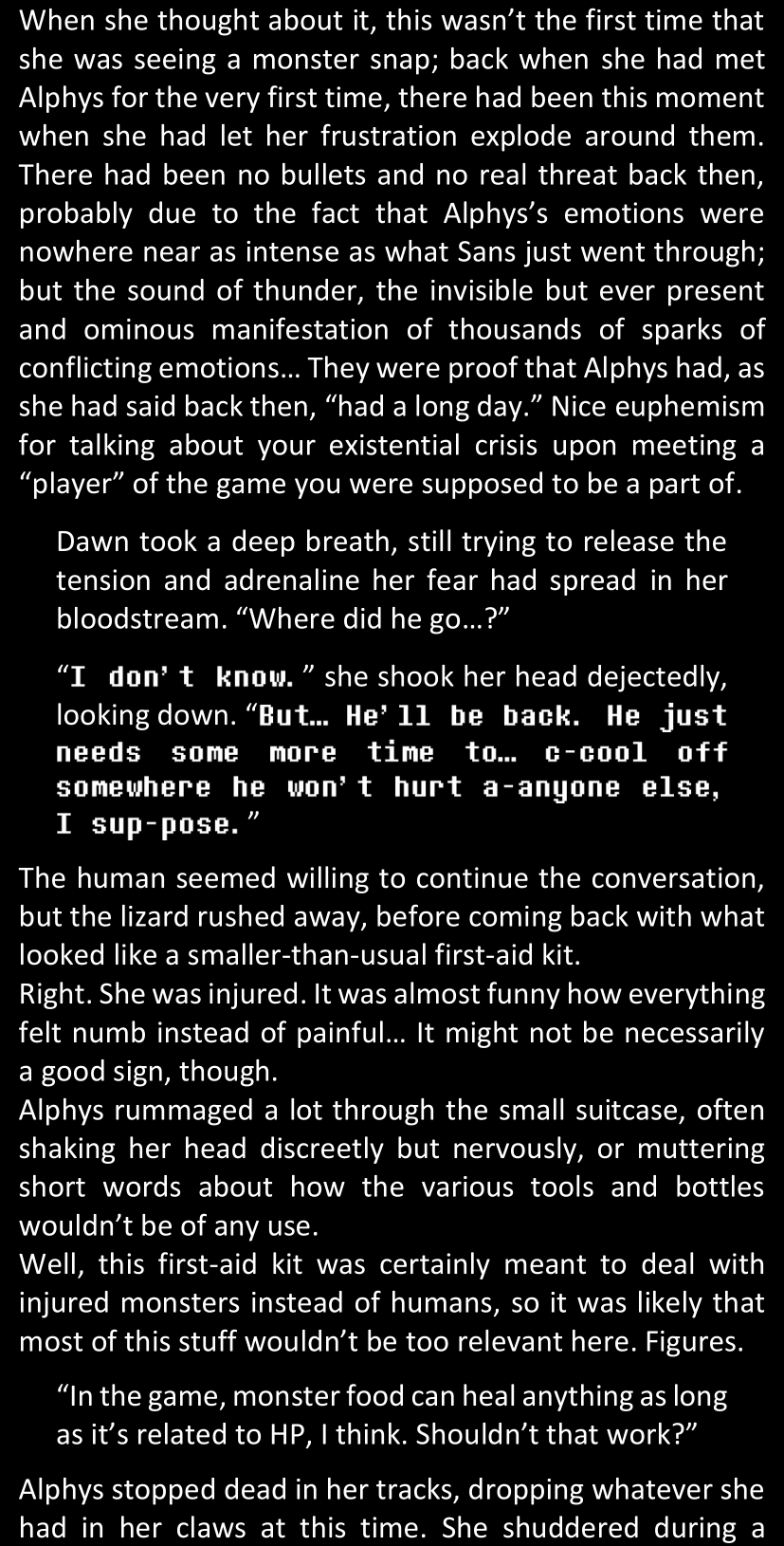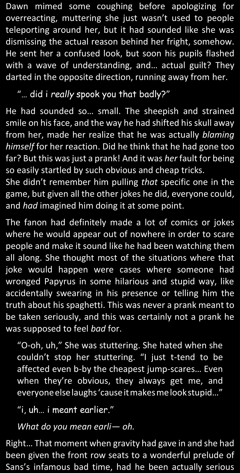 Even after she’s more awake and calmed down, Dawn is still scared of Sans and avoids looking at him. When she asks him what happened to the player while she was unconscious, Sans tells her that he once again had no other choice but to kill Frisk and that this time, they did not Reload for the two hours that followed. Dawn grows some more resentment as she wonders why Sans wasn’t able to get the player on their side, and why he was so adamant on being the only one to ever talk to them; but she doesn’t ask him anything else, feeling too uncomfortable to continue the conversation. Some more doubts appear in her mind (“Maybe he simply doesn’t want or need the player to be on their side for some reason?”), but the mental image of Sans’s cold-blooded face upon killing Frisk makes her too afraid to continue digging, as she is growing more and more terrified of what could happen if her suspicions were right.