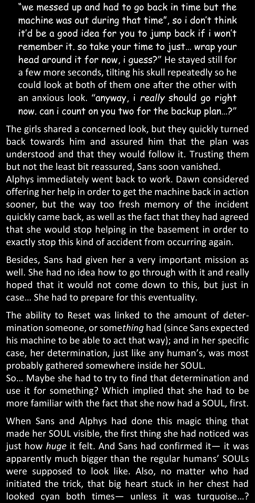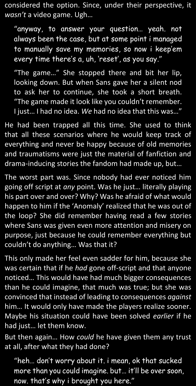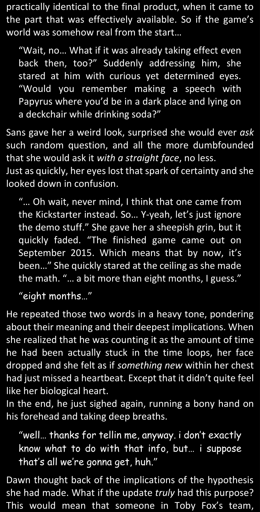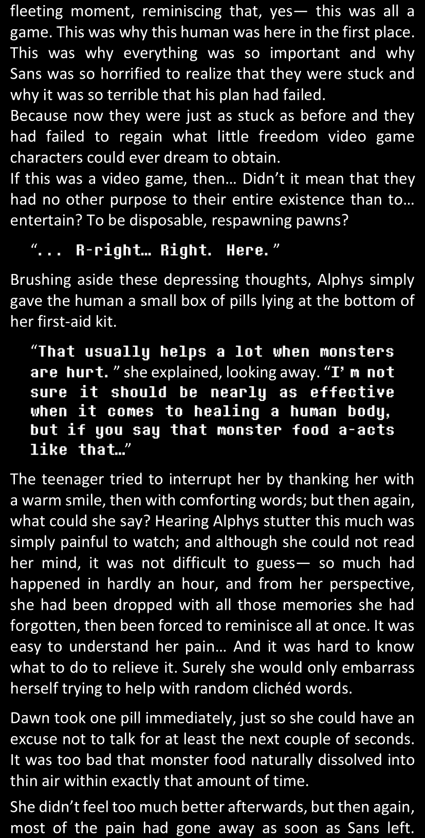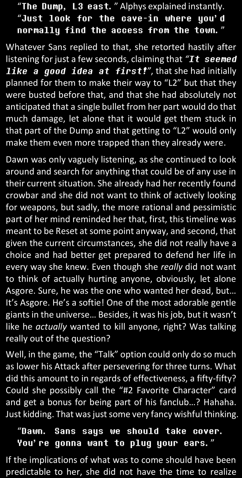 Even after she’s more awake and calmed down, Dawn is still scared of Sans and avoids looking at him. When she asks him what happened to the player while she was unconscious, Sans tells her that he once again had no other choice but to kill Frisk and that this time, they did not Reload for the two hours that followed. Dawn grows some more resentment as she wonders why Sans wasn’t able to get the player on their side, and why he was so adamant on being the only one to ever talk to them; but she doesn’t ask him anything else, feeling too uncomfortable to continue the conversation. Some more doubts appear in her mind (“Maybe he simply doesn’t want or need the player to be on their side for some reason?”), but the mental image of Sans’s cold-blooded face upon killing Frisk makes her too afraid to continue digging, as she is growing more and more terrified of what could happen if her suspicions were right.