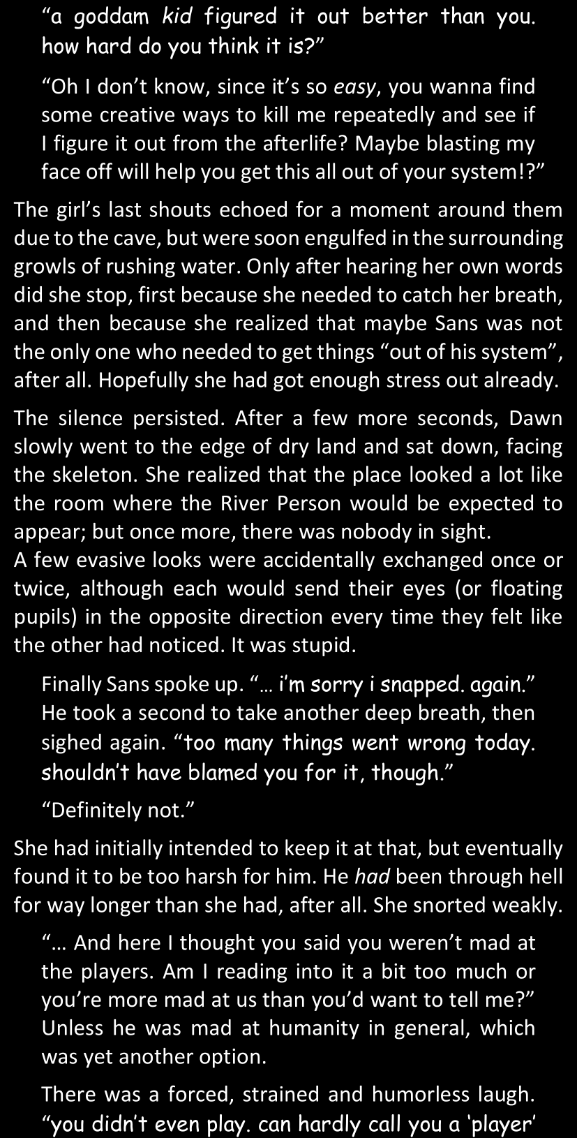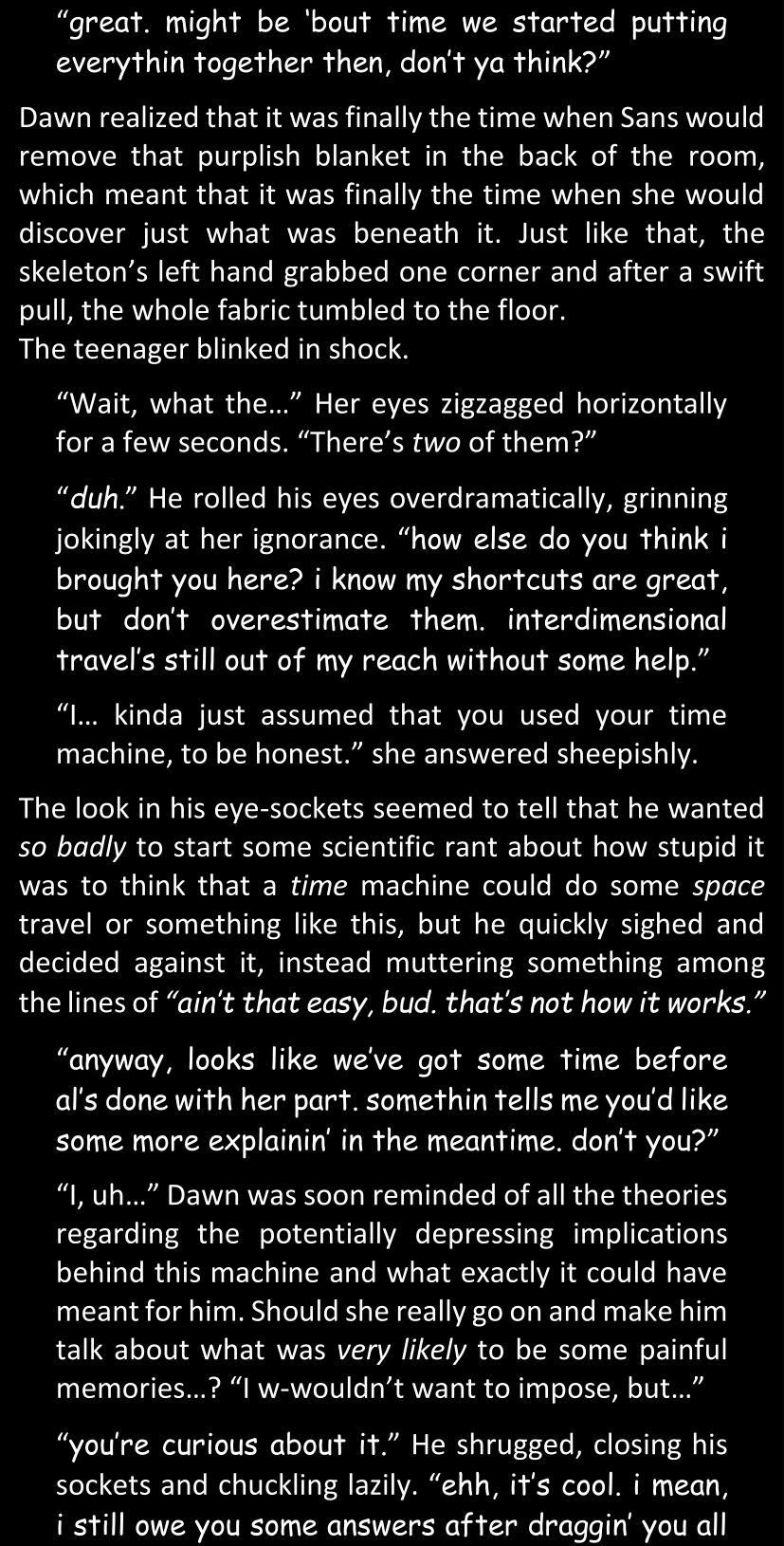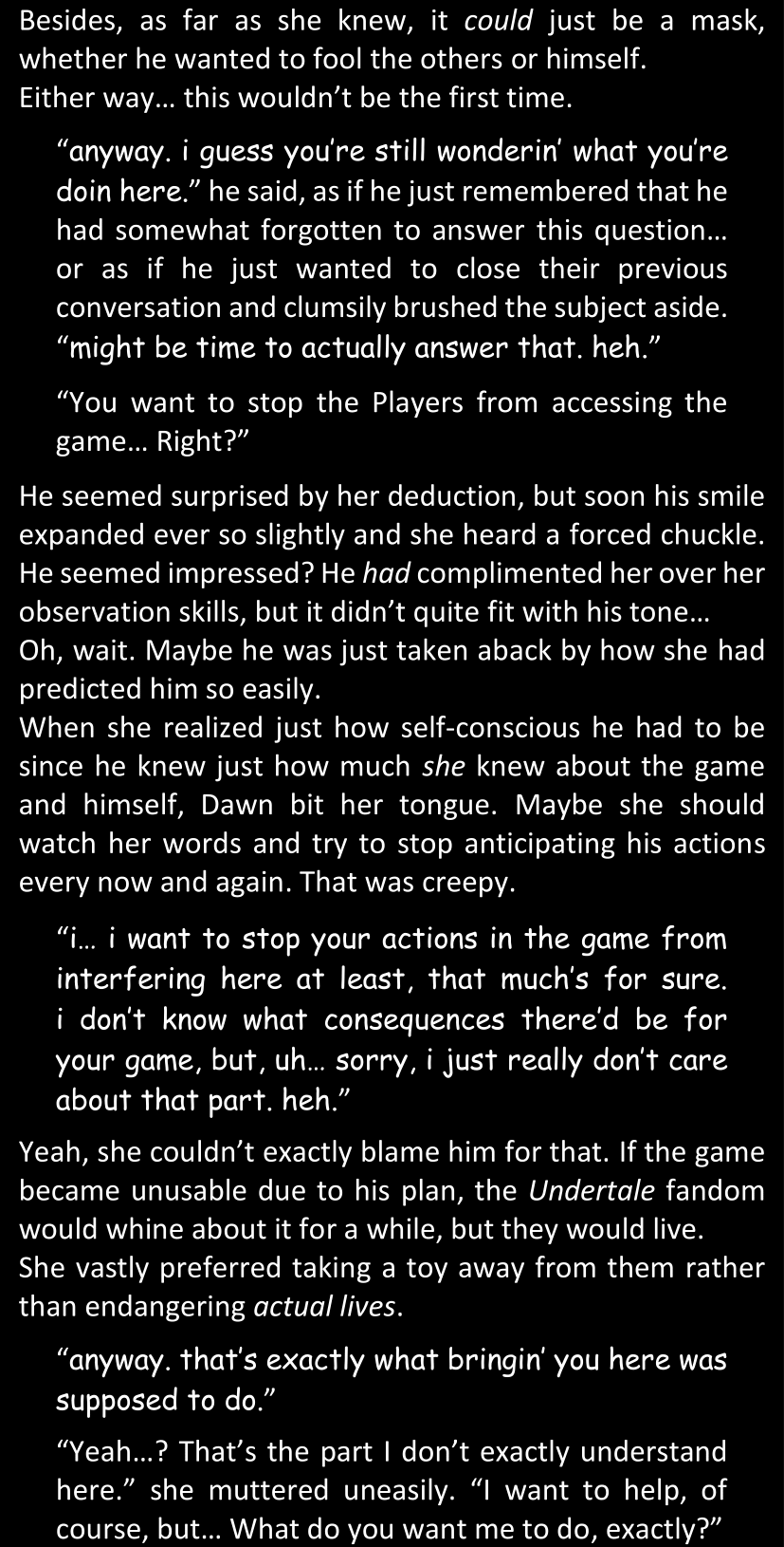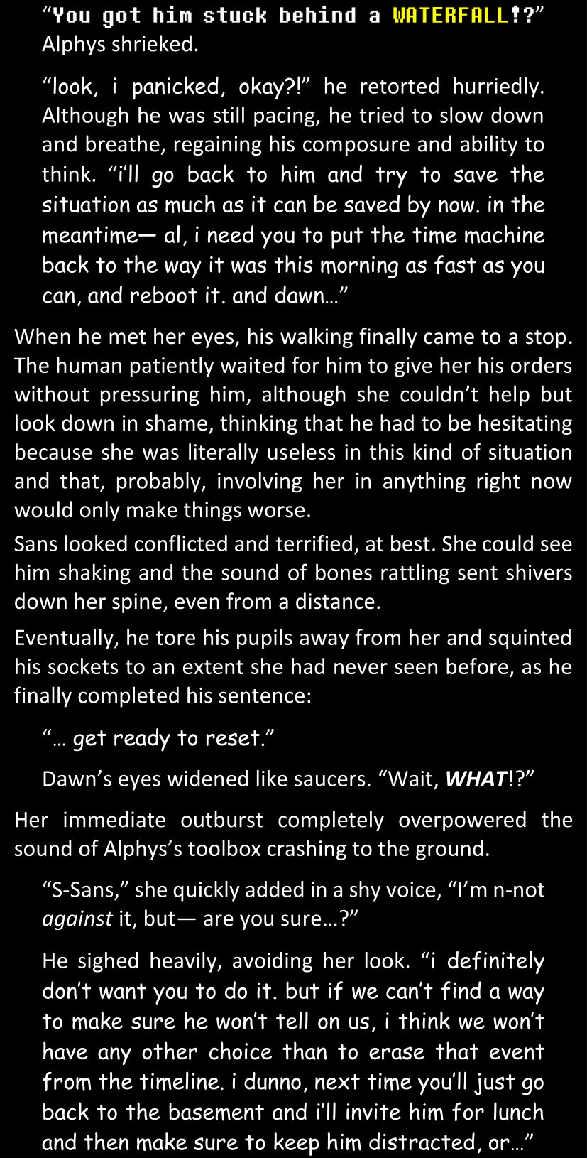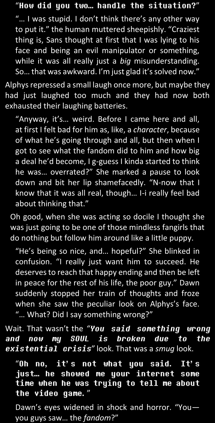 Even after she’s more awake and calmed down, Dawn is still scared of Sans and avoids looking at him. When she asks him what happened to the player while she was unconscious, Sans tells her that he once again had no other choice but to kill Frisk and that this time, they did not Reload for the two hours that followed. Dawn grows some more resentment as she wonders why Sans wasn’t able to get the player on their side, and why he was so adamant on being the only one to ever talk to them; but she doesn’t ask him anything else, feeling too uncomfortable to continue the conversation. Some more doubts appear in her mind (“Maybe he simply doesn’t want or need the player to be on their side for some reason?”), but the mental image of Sans’s cold-blooded face upon killing Frisk makes her too afraid to continue digging, as she is growing more and more terrified of what could happen if her suspicions were right.