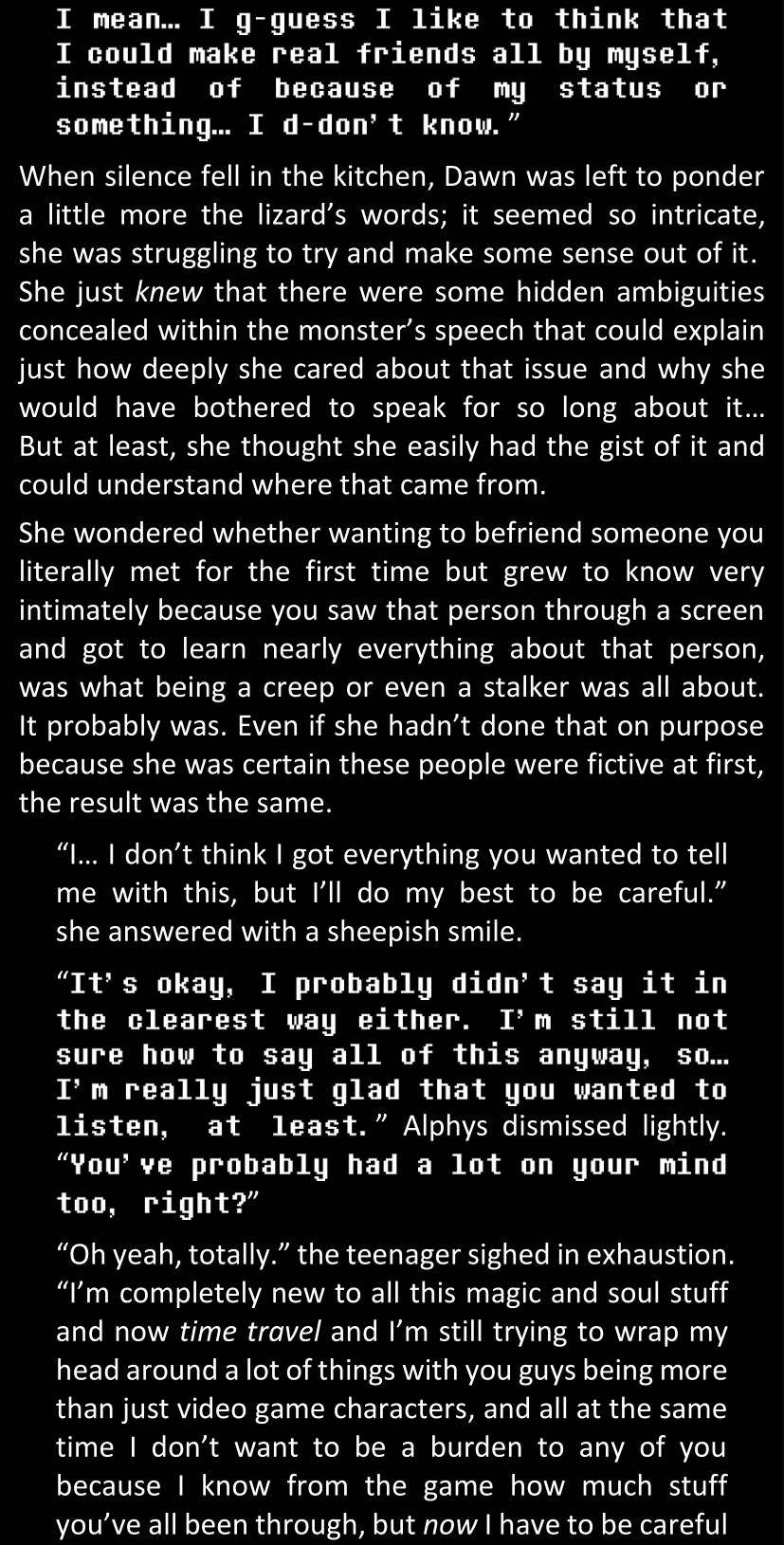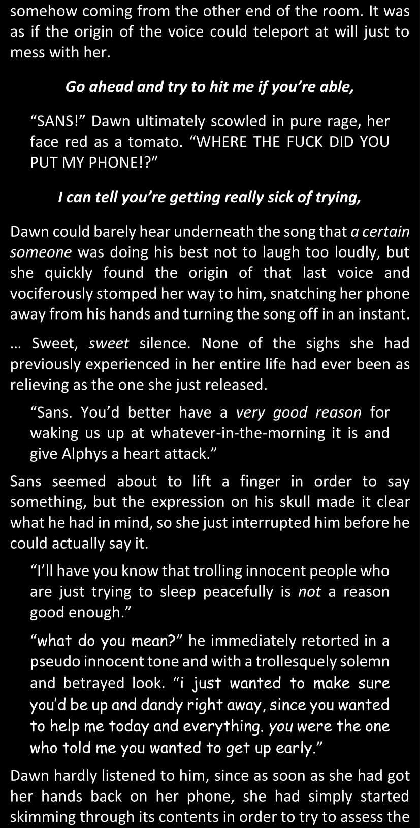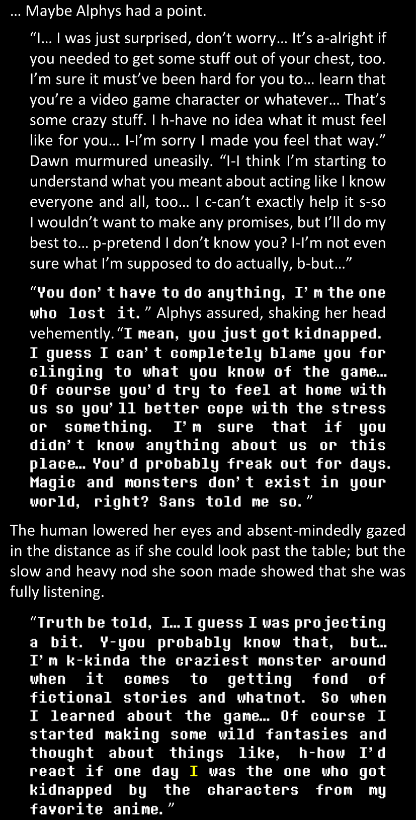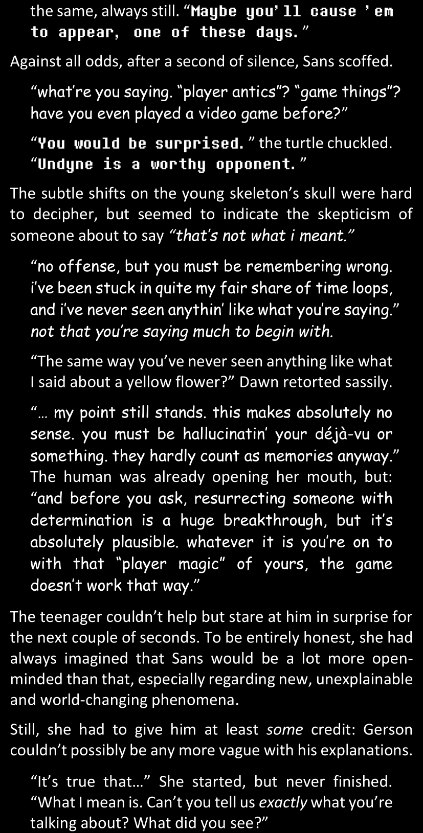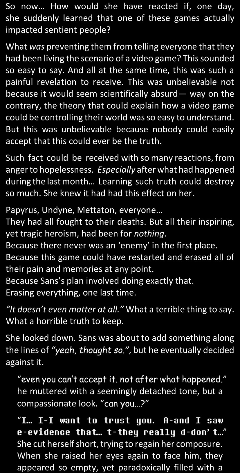 Even after she’s more awake and calmed down, Dawn is still scared of Sans and avoids looking at him. When she asks him what happened to the player while she was unconscious, Sans tells her that he once again had no other choice but to kill Frisk and that this time, they did not Reload for the two hours that followed. Dawn grows some more resentment as she wonders why Sans wasn’t able to get the player on their side, and why he was so adamant on being the only one to ever talk to them; but she doesn’t ask him anything else, feeling too uncomfortable to continue the conversation. Some more doubts appear in her mind (“Maybe he simply doesn’t want or need the player to be on their side for some reason?”), but the mental image of Sans’s cold-blooded face upon killing Frisk makes her too afraid to continue digging, as she is growing more and more terrified of what could happen if her suspicions were right.