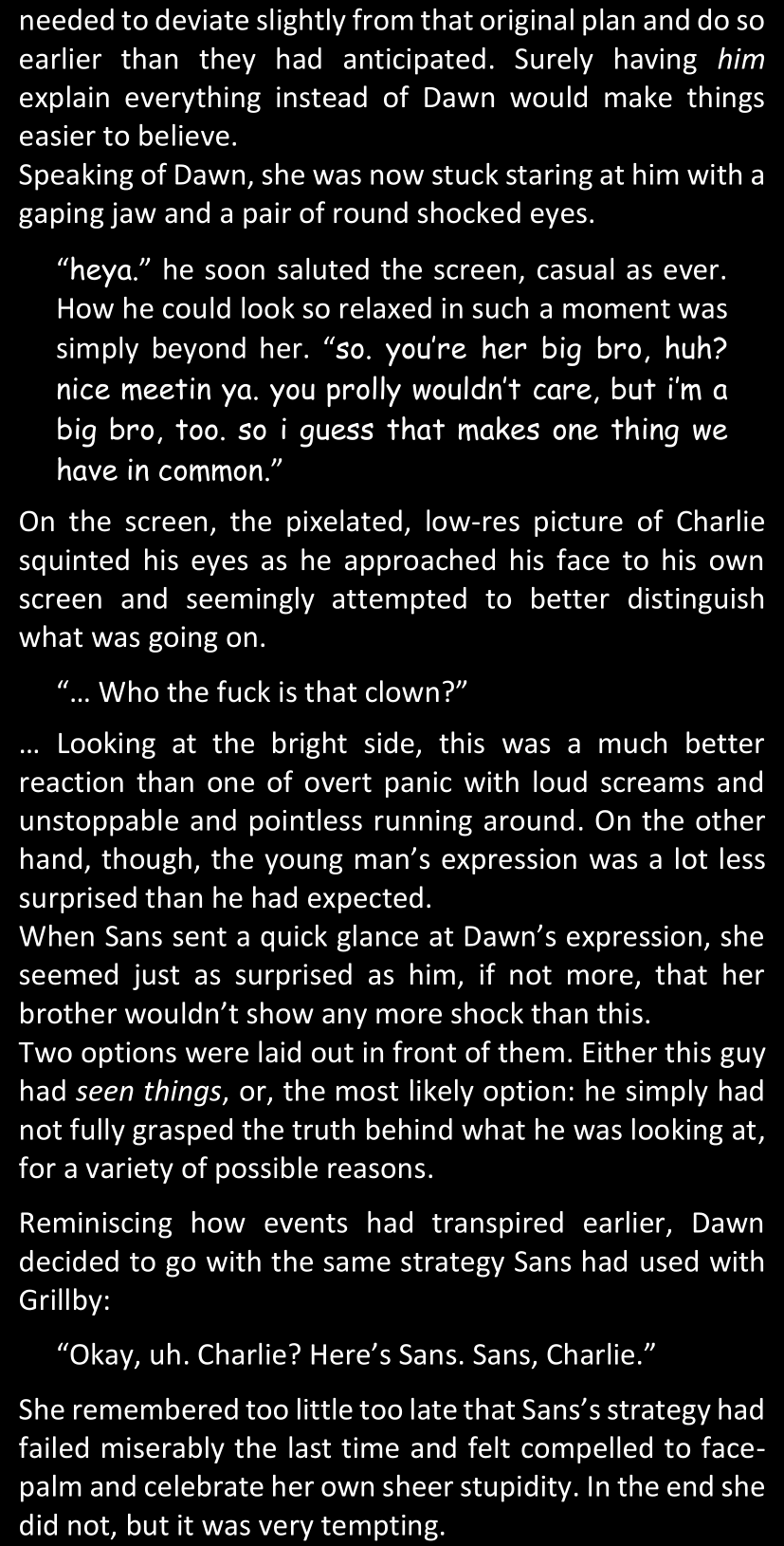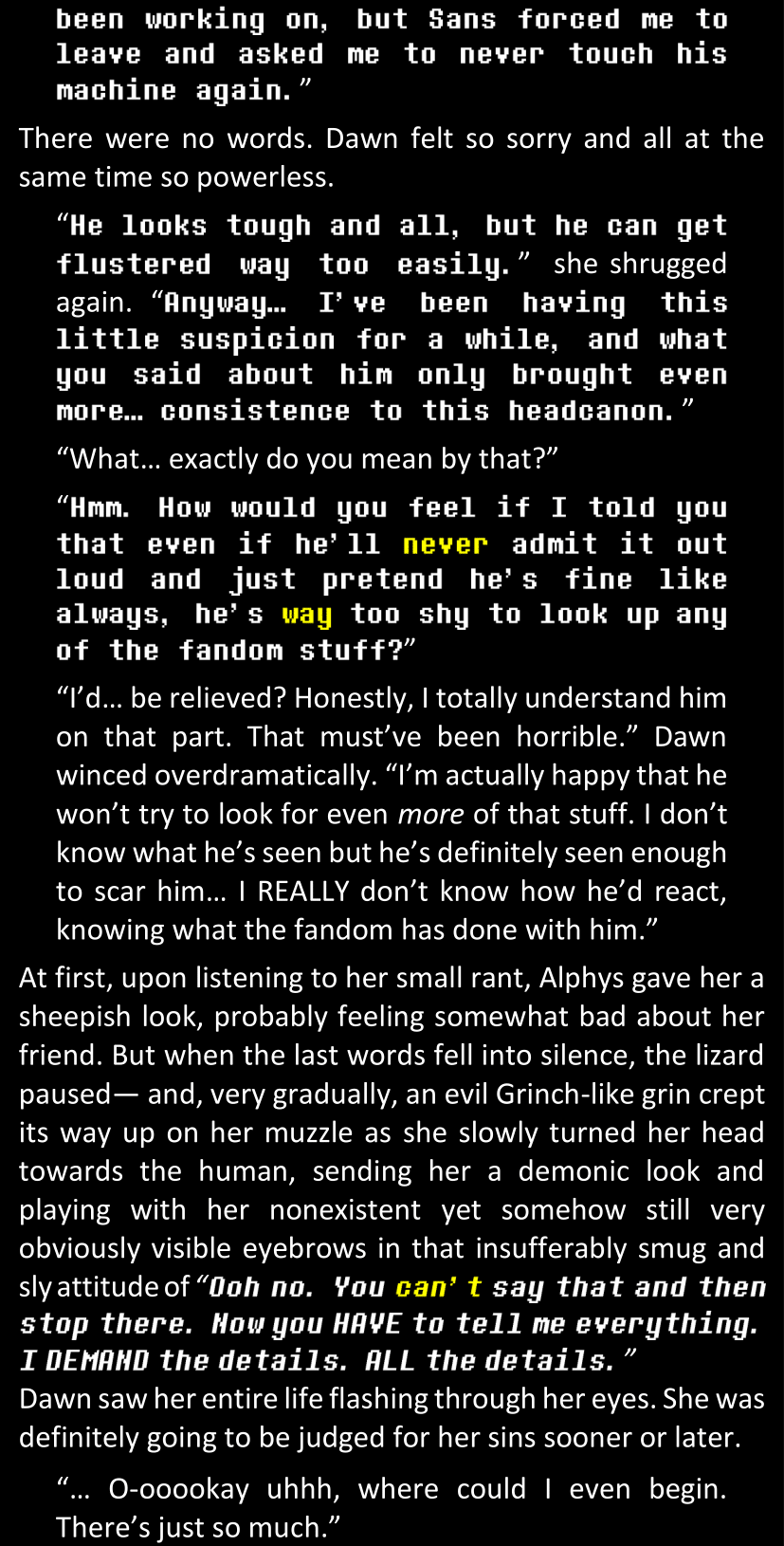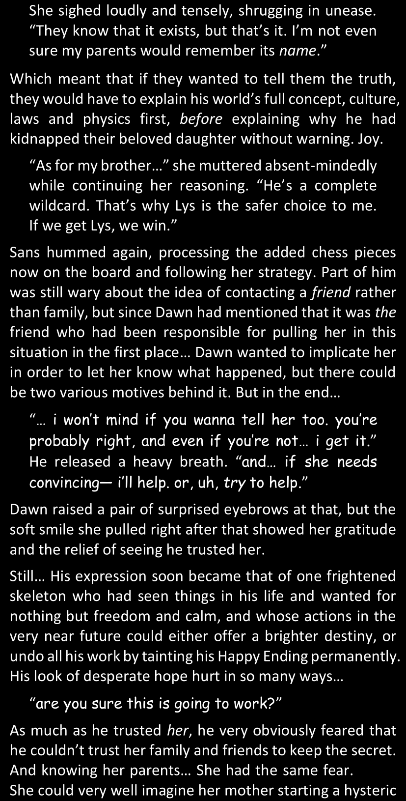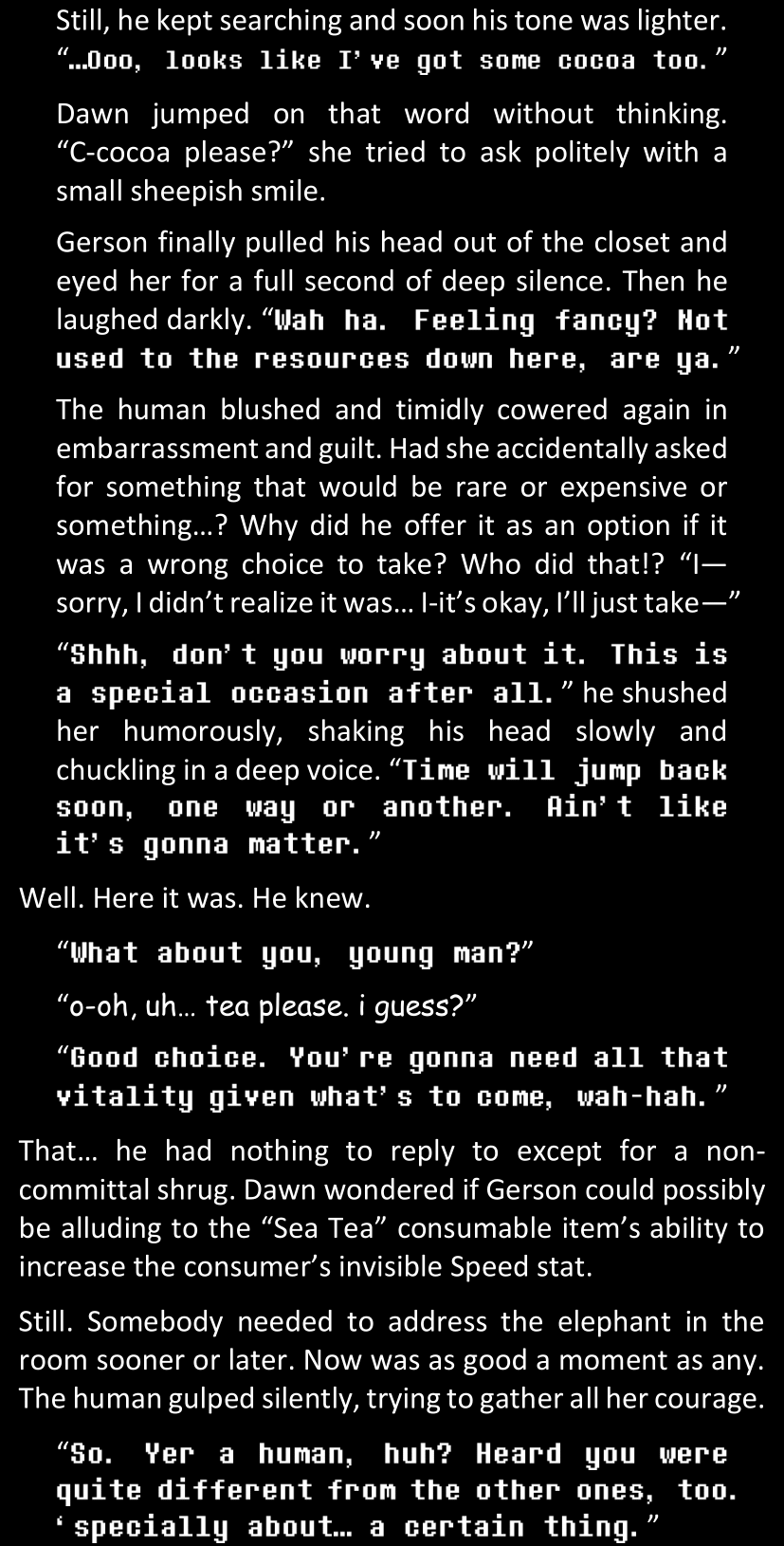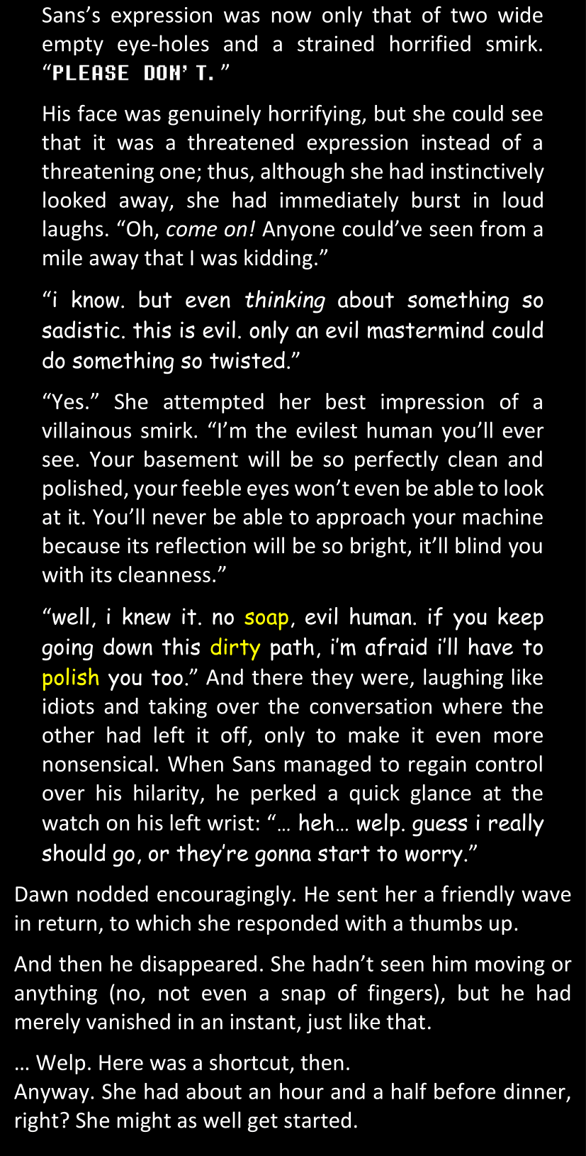 Even after she’s more awake and calmed down, Dawn is still scared of Sans and avoids looking at him. When she asks him what happened to the player while she was unconscious, Sans tells her that he once again had no other choice but to kill Frisk and that this time, they did not Reload for the two hours that followed. Dawn grows some more resentment as she wonders why Sans wasn’t able to get the player on their side, and why he was so adamant on being the only one to ever talk to them; but she doesn’t ask him anything else, feeling too uncomfortable to continue the conversation. Some more doubts appear in her mind (“Maybe he simply doesn’t want or need the player to be on their side for some reason?”), but the mental image of Sans’s cold-blooded face upon killing Frisk makes her too afraid to continue digging, as she is growing more and more terrified of what could happen if her suspicions were right.