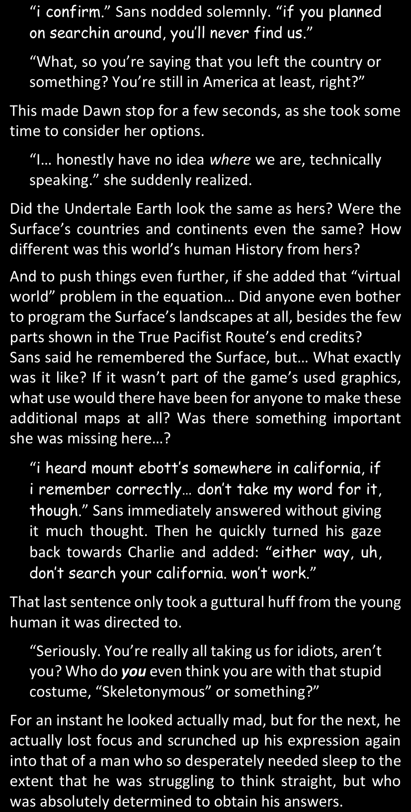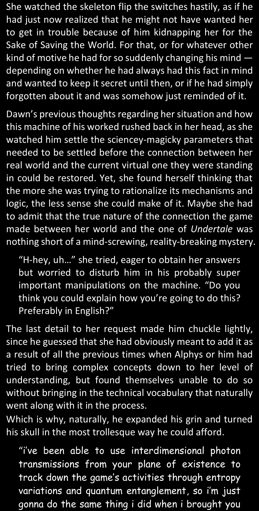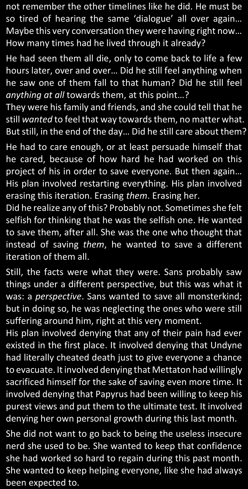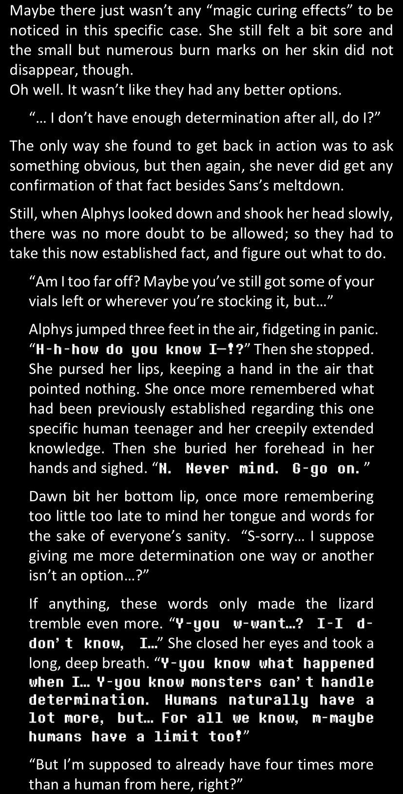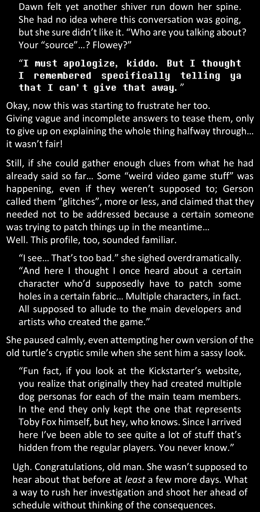 Even after she’s more awake and calmed down, Dawn is still scared of Sans and avoids looking at him. When she asks him what happened to the player while she was unconscious, Sans tells her that he once again had no other choice but to kill Frisk and that this time, they did not Reload for the two hours that followed. Dawn grows some more resentment as she wonders why Sans wasn’t able to get the player on their side, and why he was so adamant on being the only one to ever talk to them; but she doesn’t ask him anything else, feeling too uncomfortable to continue the conversation. Some more doubts appear in her mind (“Maybe he simply doesn’t want or need the player to be on their side for some reason?”), but the mental image of Sans’s cold-blooded face upon killing Frisk makes her too afraid to continue digging, as she is growing more and more terrified of what could happen if her suspicions were right.