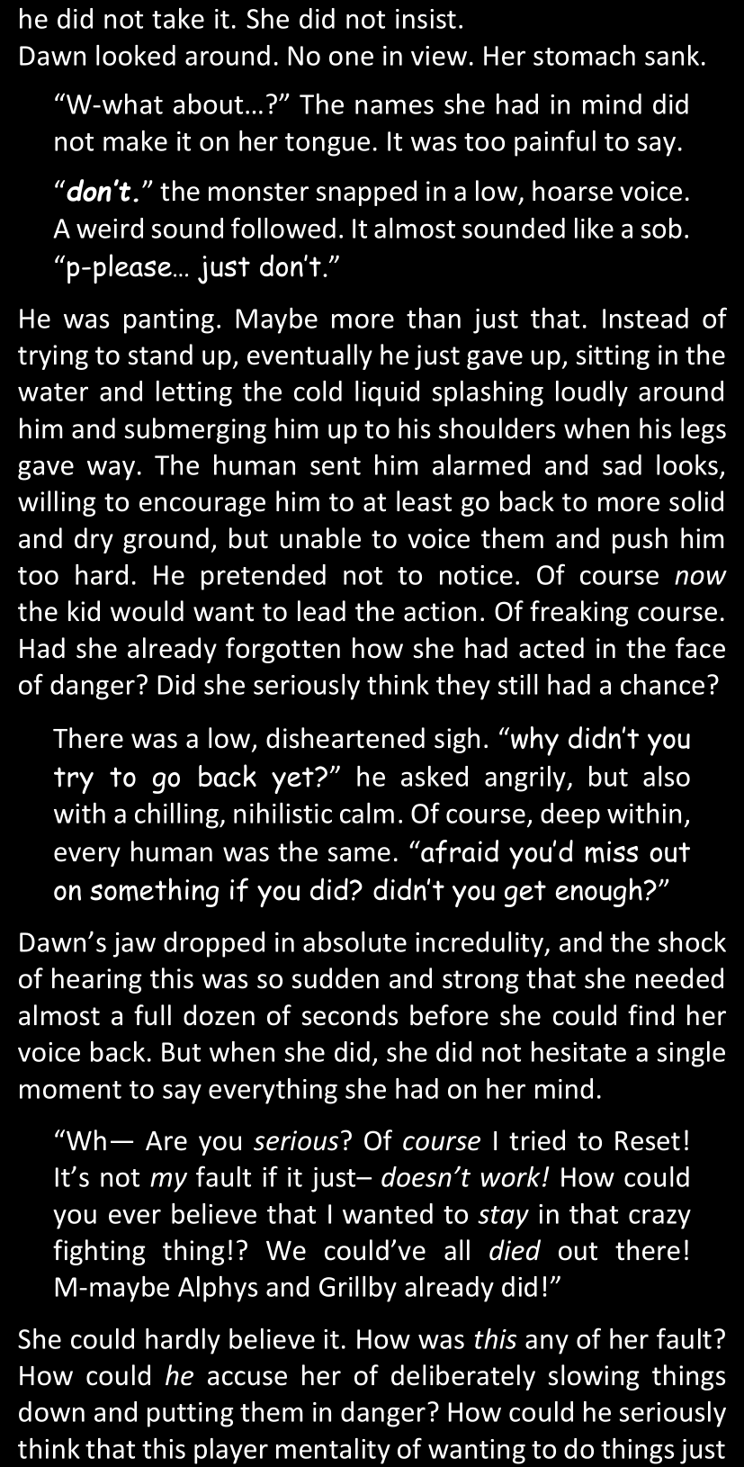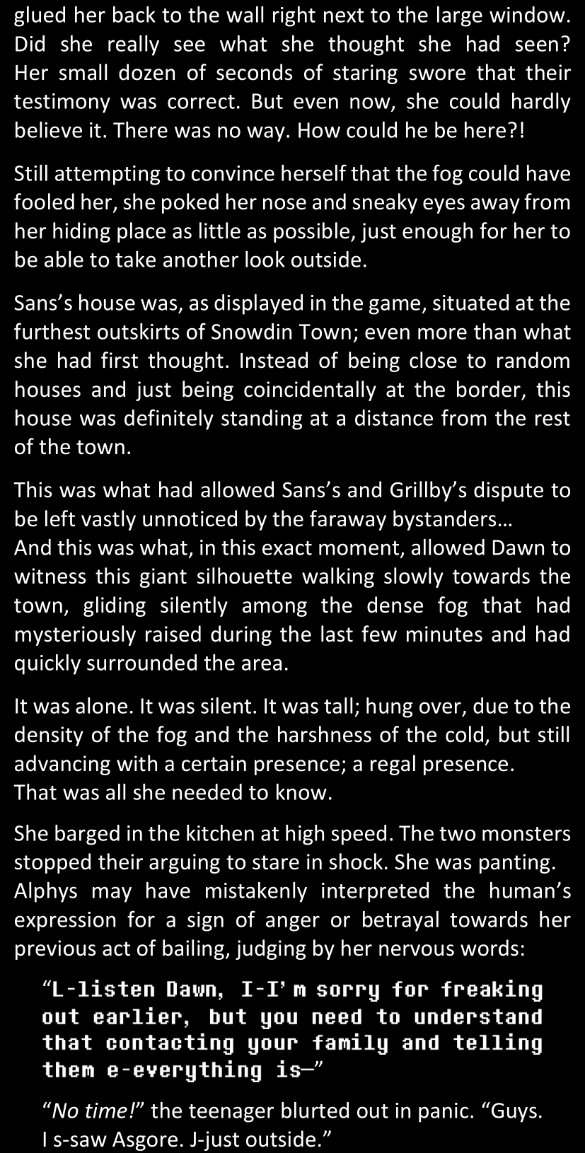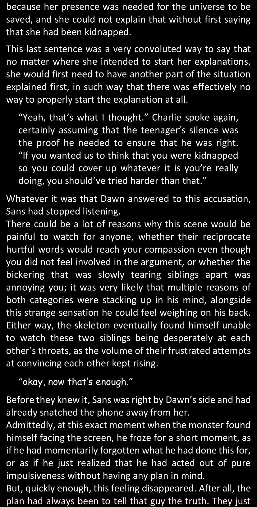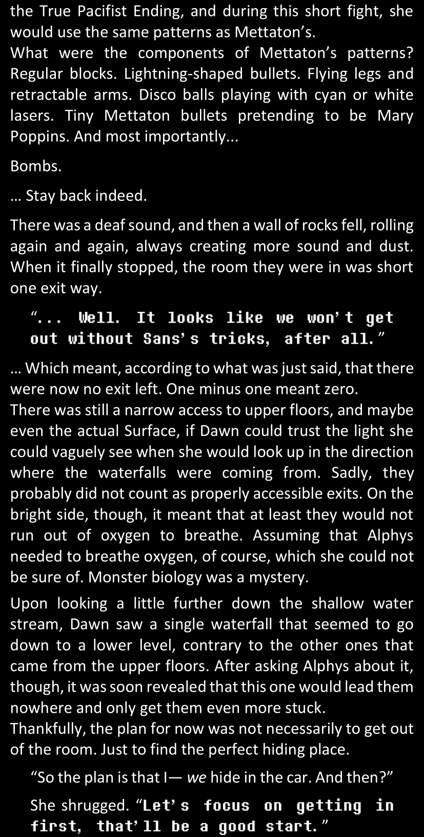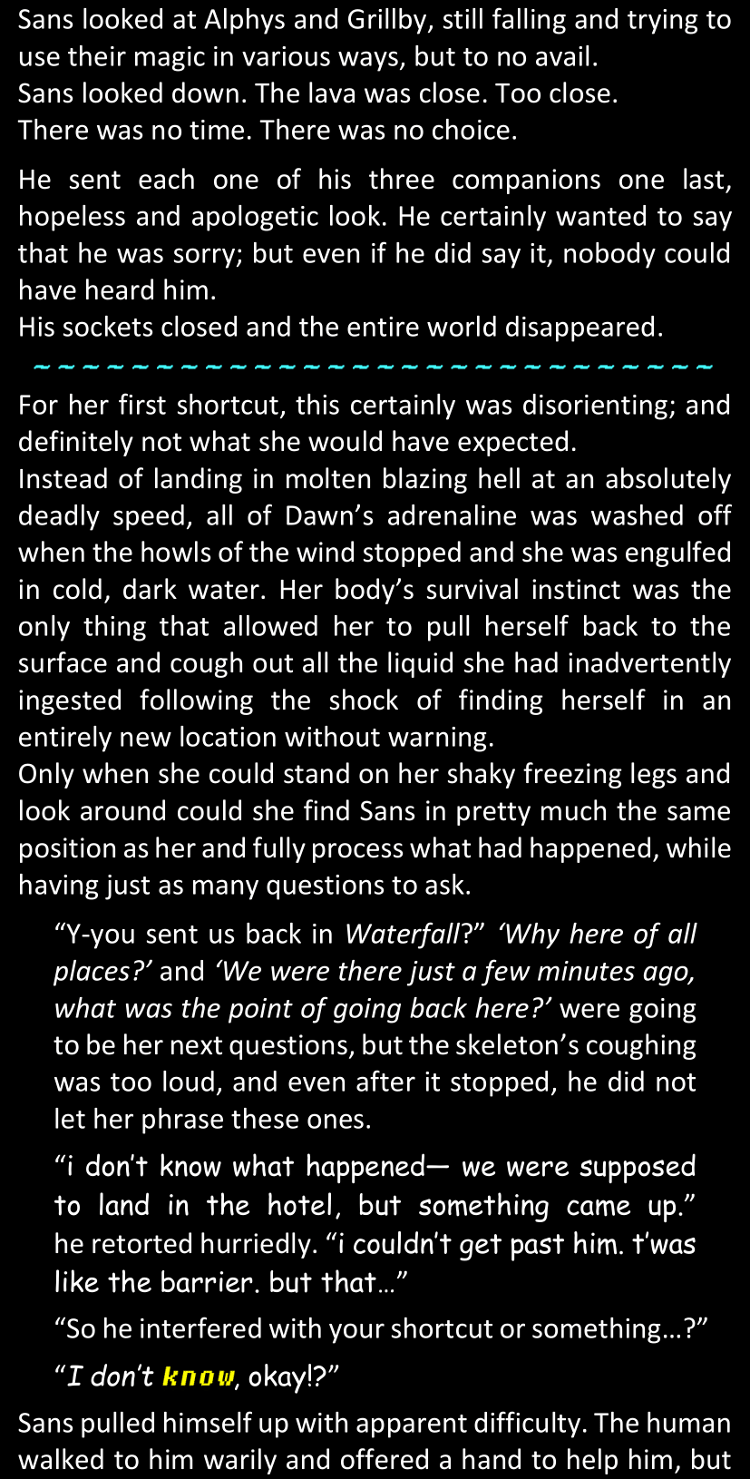 Even after she’s more awake and calmed down, Dawn is still scared of Sans and avoids looking at him. When she asks him what happened to the player while she was unconscious, Sans tells her that he once again had no other choice but to kill Frisk and that this time, they did not Reload for the two hours that followed. Dawn grows some more resentment as she wonders why Sans wasn’t able to get the player on their side, and why he was so adamant on being the only one to ever talk to them; but she doesn’t ask him anything else, feeling too uncomfortable to continue the conversation. Some more doubts appear in her mind (“Maybe he simply doesn’t want or need the player to be on their side for some reason?”), but the mental image of Sans’s cold-blooded face upon killing Frisk makes her too afraid to continue digging, as she is growing more and more terrified of what could happen if her suspicions were right.