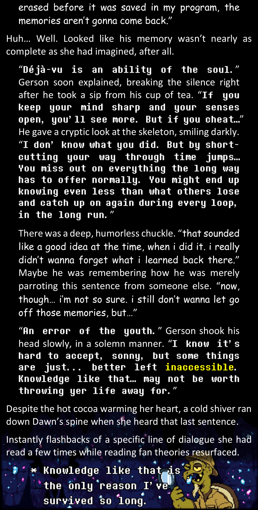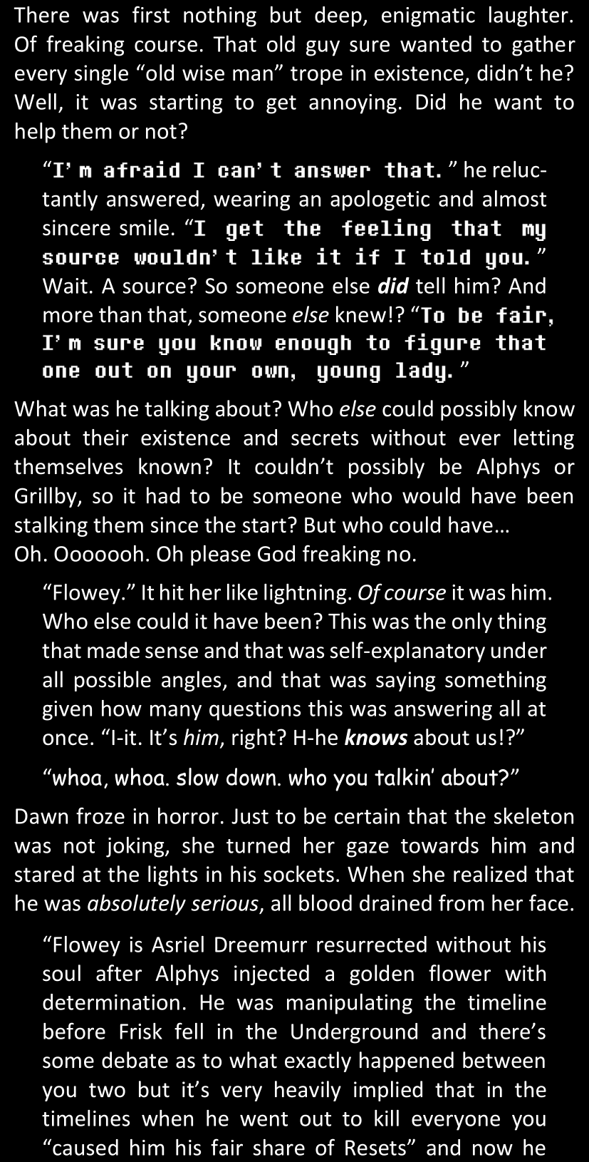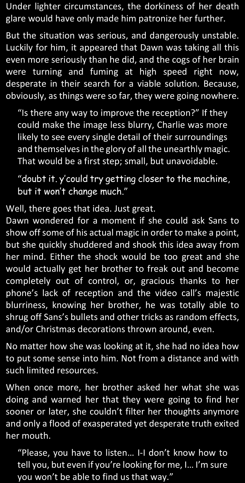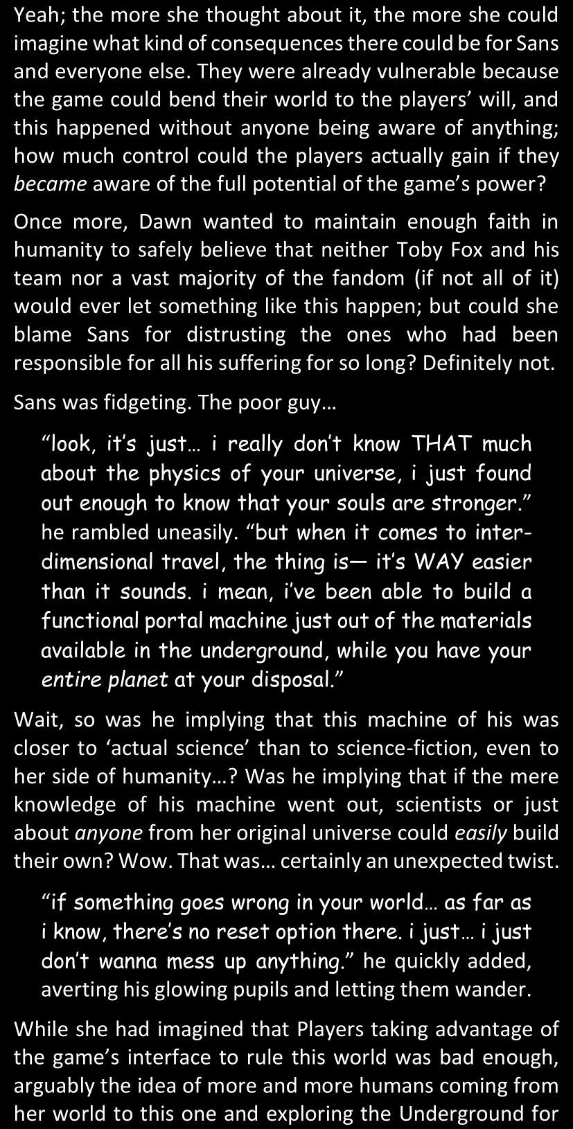Even after she’s more awake and calmed down, Dawn is still scared of Sans and avoids looking at him. When she asks him what happened to the player while she was unconscious, Sans tells her that he once again had no other choice but to kill Frisk and that this time, they did not Reload for the two hours that followed. Dawn grows some more resentment as she wonders why Sans wasn’t able to get the player on their side, and why he was so adamant on being the only one to ever talk to them; but she doesn’t ask him anything else, feeling too uncomfortable to continue the conversation. Some more doubts appear in her mind (“Maybe he simply doesn’t want or need the player to be on their side for some reason?”), but the mental image of Sans’s cold-blooded face upon killing Frisk makes her too afraid to continue digging, as she is growing more and more terrified of what could happen if her suspicions were right.
