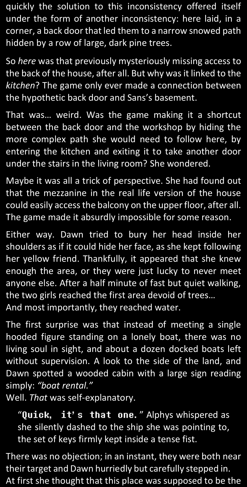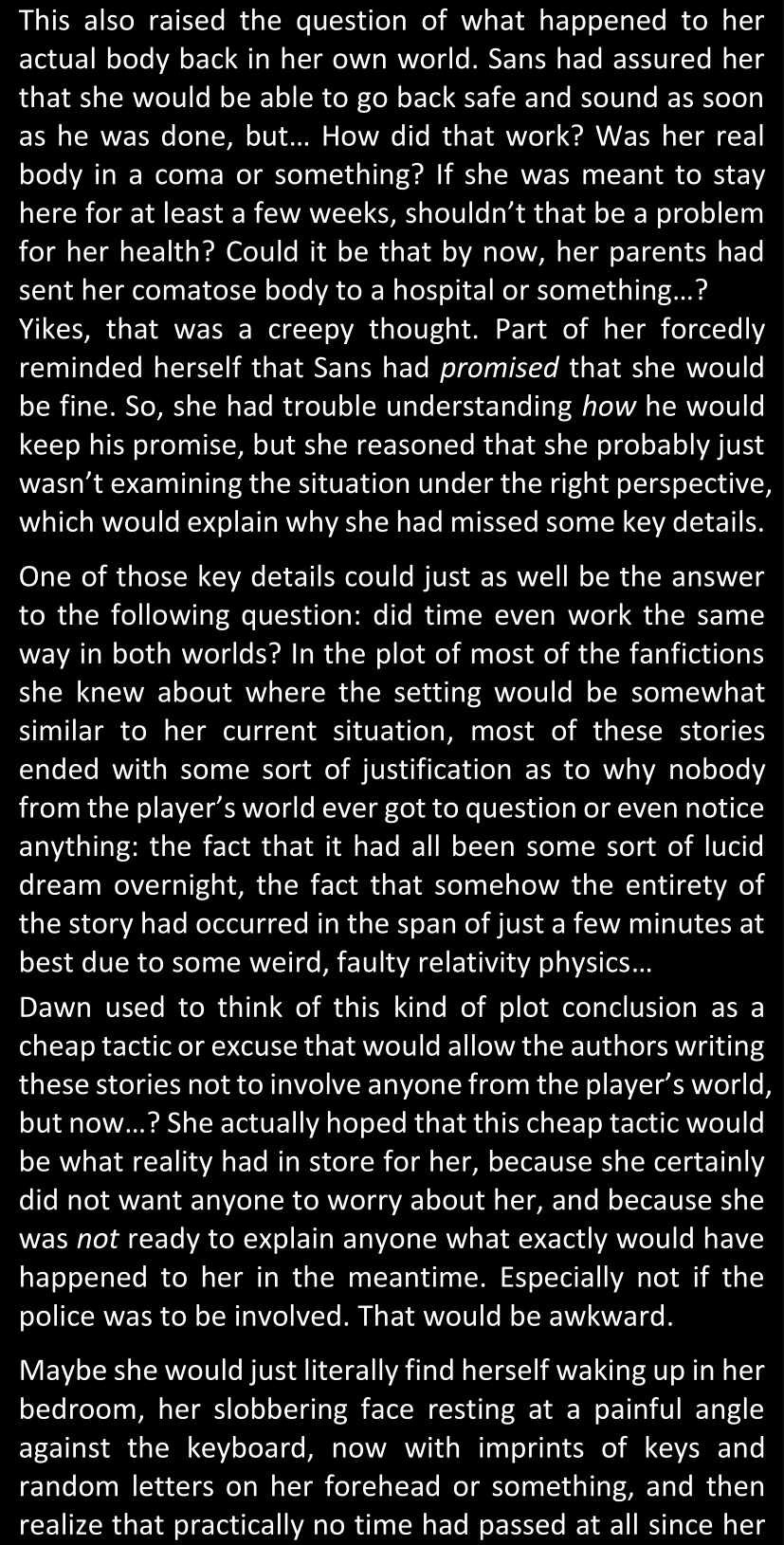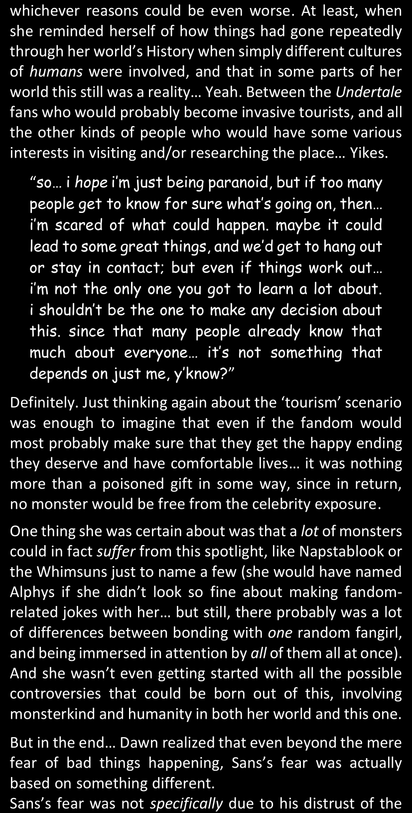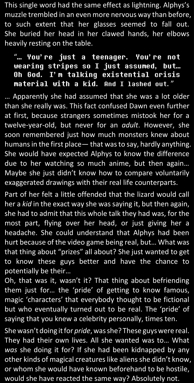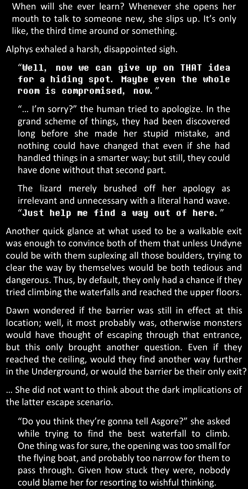 Even after she’s more awake and calmed down, Dawn is still scared of Sans and avoids looking at him. When she asks him what happened to the player while she was unconscious, Sans tells her that he once again had no other choice but to kill Frisk and that this time, they did not Reload for the two hours that followed. Dawn grows some more resentment as she wonders why Sans wasn’t able to get the player on their side, and why he was so adamant on being the only one to ever talk to them; but she doesn’t ask him anything else, feeling too uncomfortable to continue the conversation. Some more doubts appear in her mind (“Maybe he simply doesn’t want or need the player to be on their side for some reason?”), but the mental image of Sans’s cold-blooded face upon killing Frisk makes her too afraid to continue digging, as she is growing more and more terrified of what could happen if her suspicions were right.