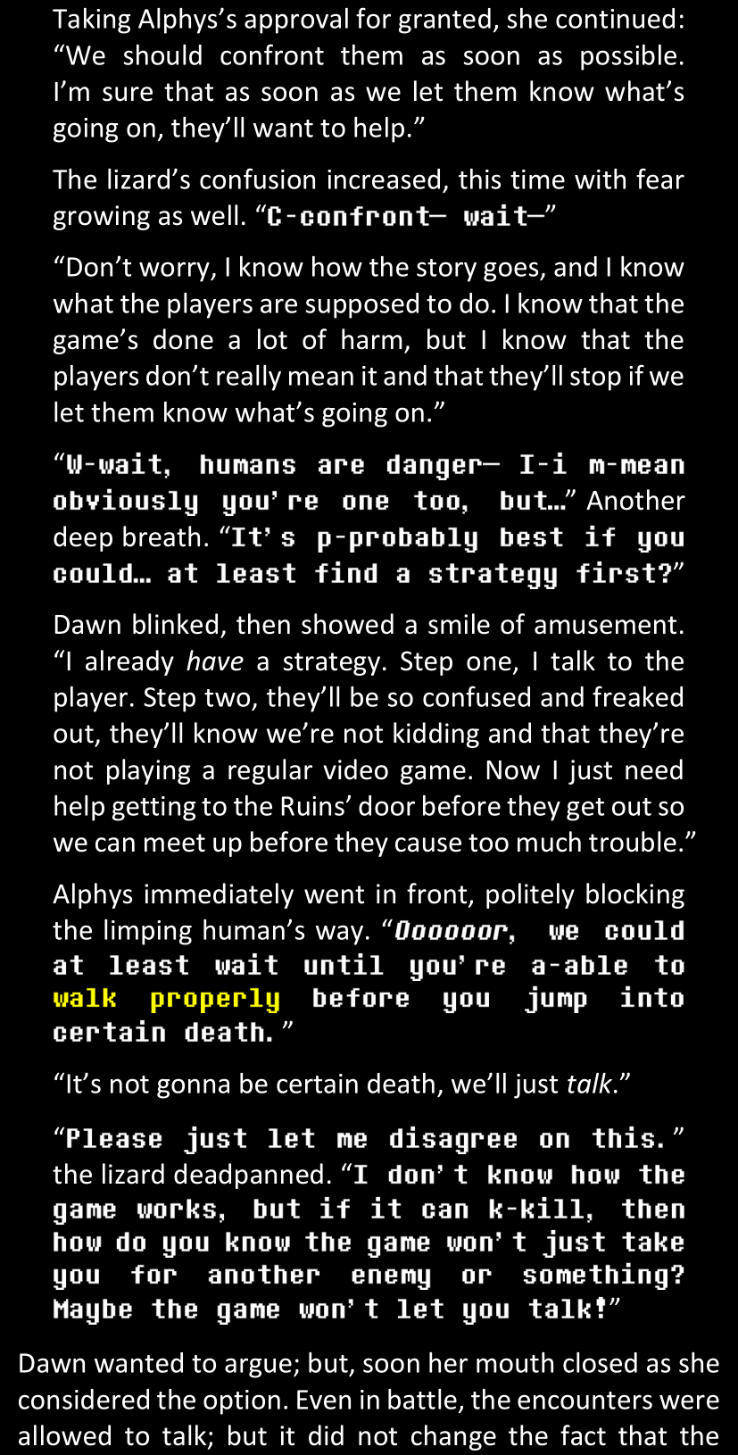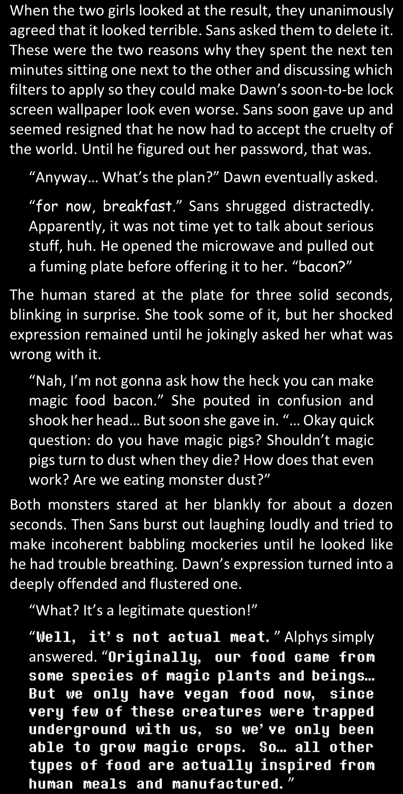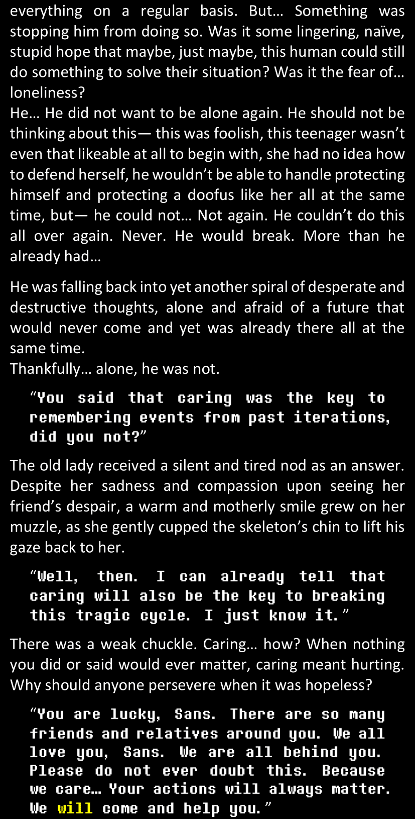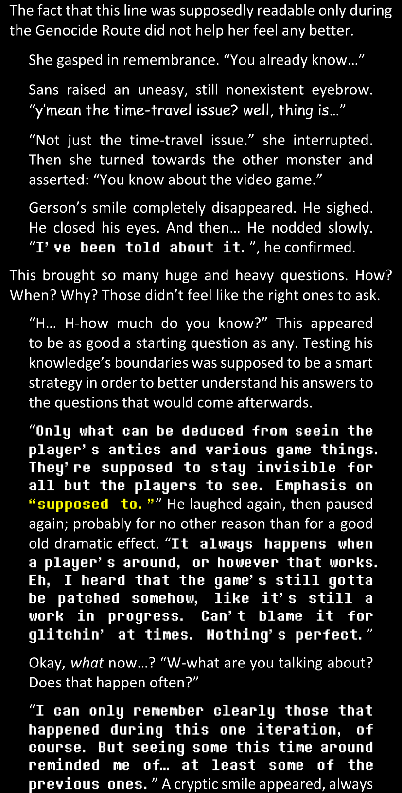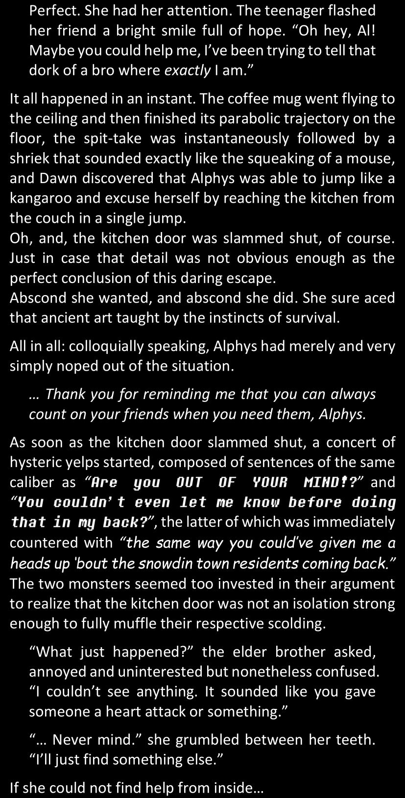 Even after she’s more awake and calmed down, Dawn is still scared of Sans and avoids looking at him. When she asks him what happened to the player while she was unconscious, Sans tells her that he once again had no other choice but to kill Frisk and that this time, they did not Reload for the two hours that followed. Dawn grows some more resentment as she wonders why Sans wasn’t able to get the player on their side, and why he was so adamant on being the only one to ever talk to them; but she doesn’t ask him anything else, feeling too uncomfortable to continue the conversation. Some more doubts appear in her mind (“Maybe he simply doesn’t want or need the player to be on their side for some reason?”), but the mental image of Sans’s cold-blooded face upon killing Frisk makes her too afraid to continue digging, as she is growing more and more terrified of what could happen if her suspicions were right.