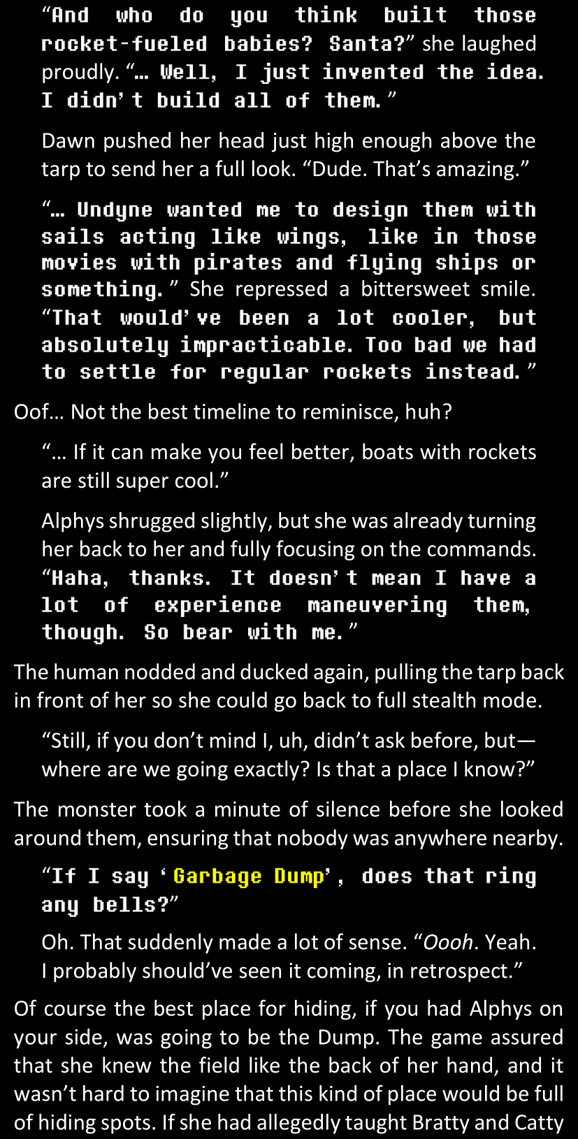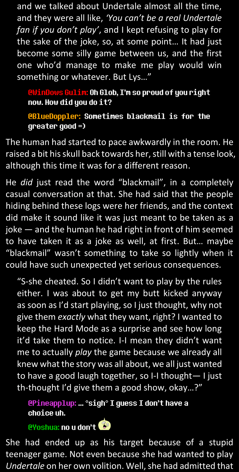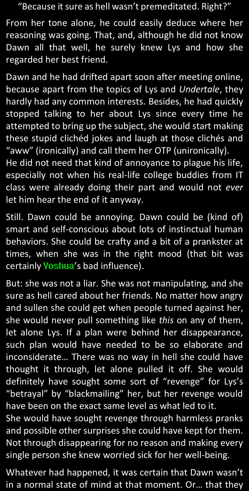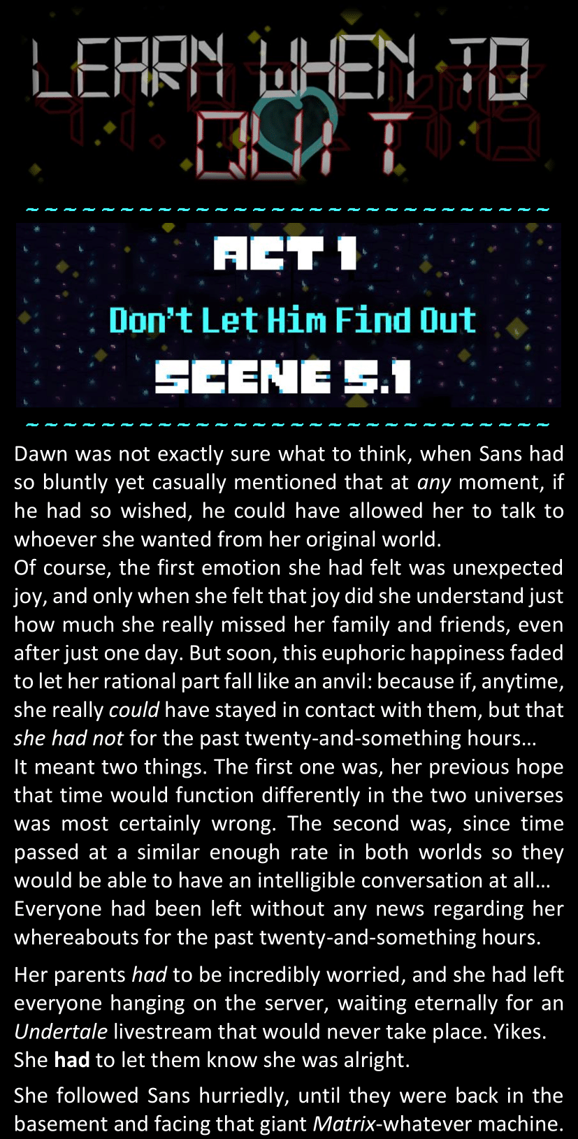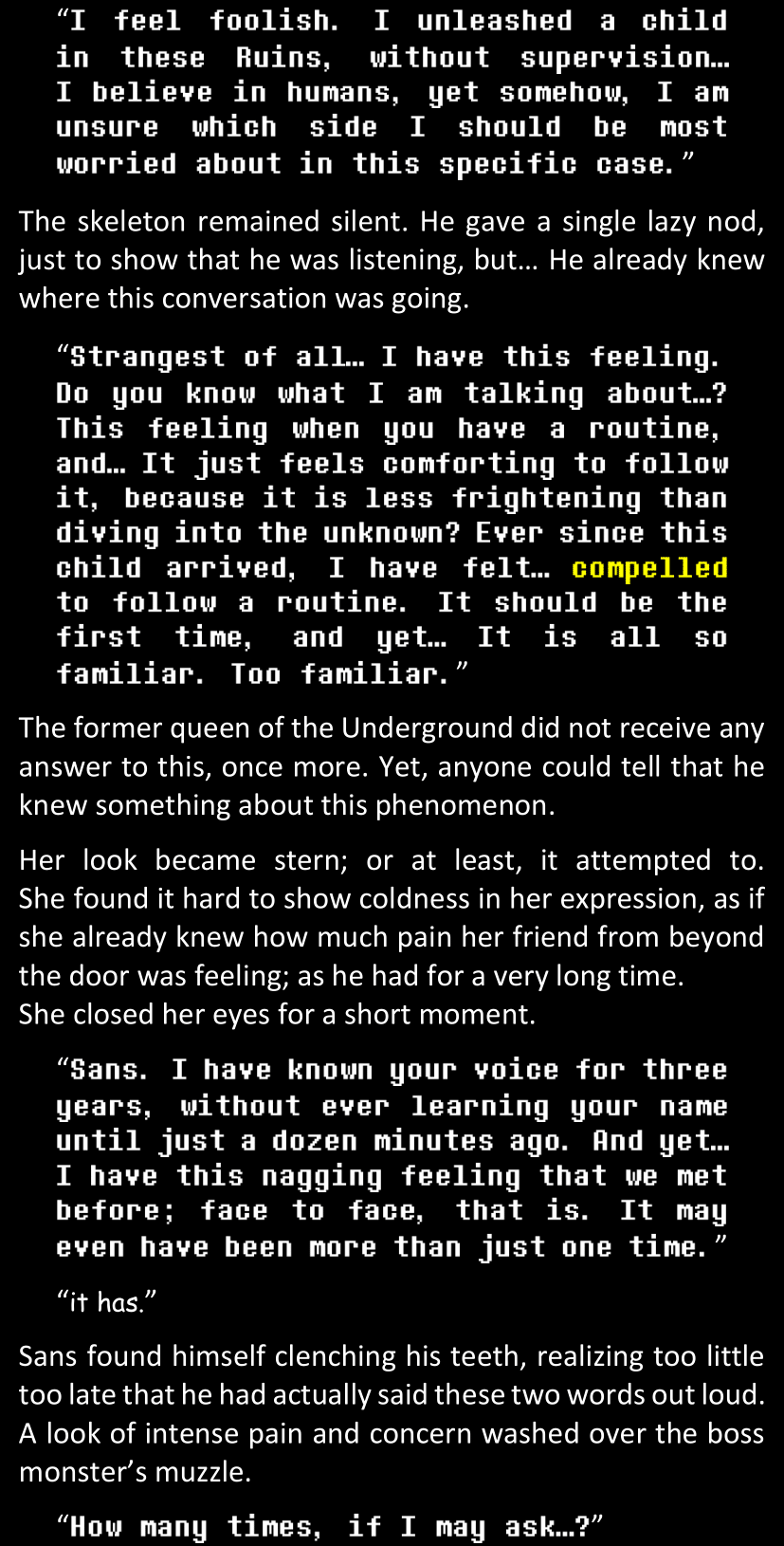Even after she’s more awake and calmed down, Dawn is still scared of Sans and avoids looking at him. When she asks him what happened to the player while she was unconscious, Sans tells her that he once again had no other choice but to kill Frisk and that this time, they did not Reload for the two hours that followed. Dawn grows some more resentment as she wonders why Sans wasn’t able to get the player on their side, and why he was so adamant on being the only one to ever talk to them; but she doesn’t ask him anything else, feeling too uncomfortable to continue the conversation. Some more doubts appear in her mind (“Maybe he simply doesn’t want or need the player to be on their side for some reason?”), but the mental image of Sans’s cold-blooded face upon killing Frisk makes her too afraid to continue digging, as she is growing more and more terrified of what could happen if her suspicions were right.