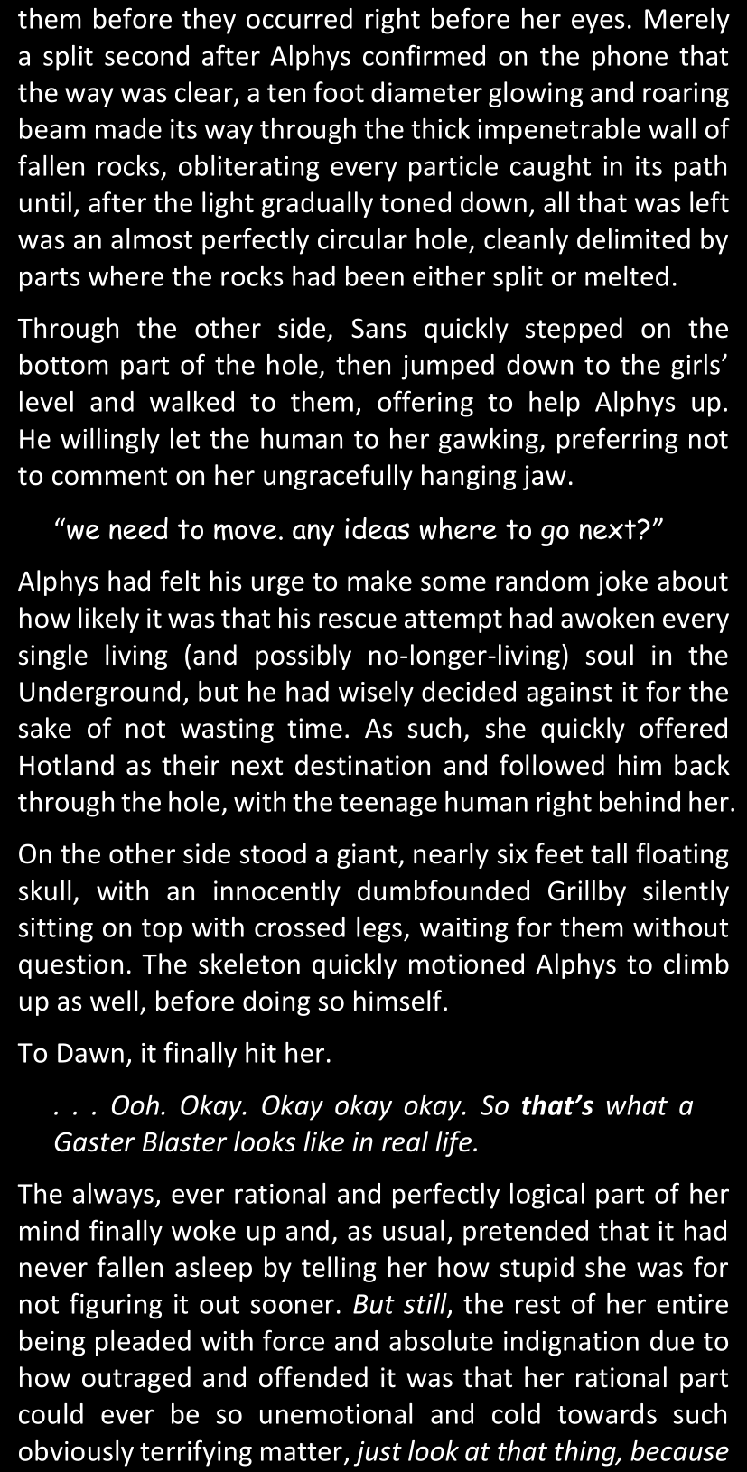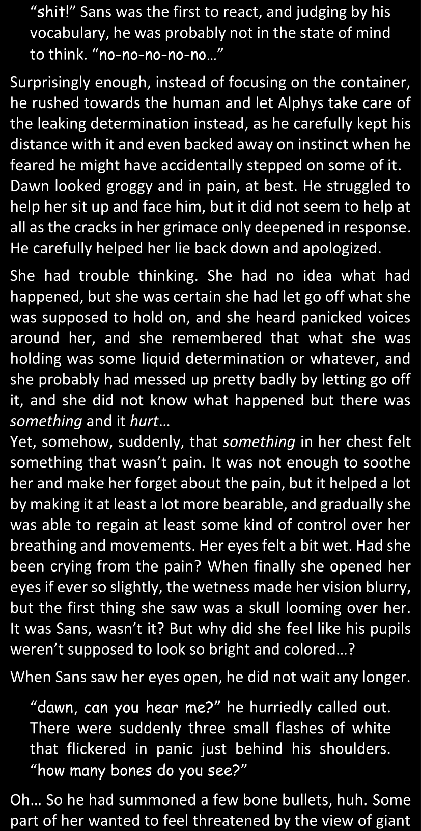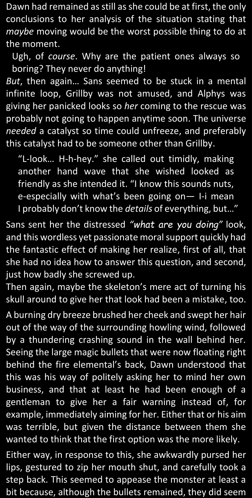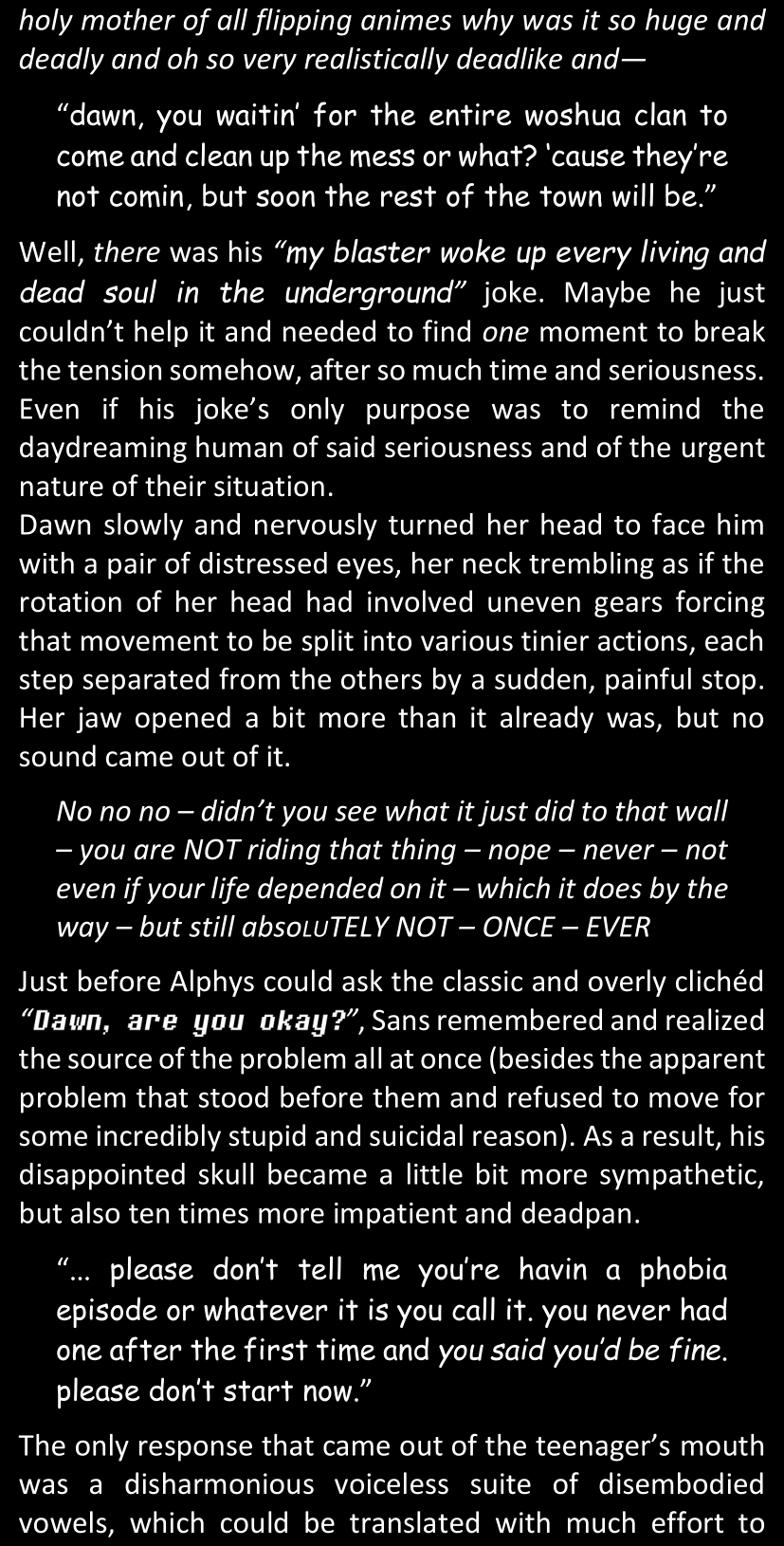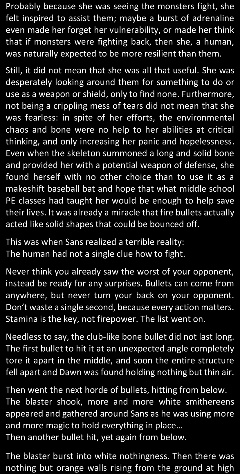 The narrator could spend a sentence or two pointing out that Sans was deliberately holding off on his shortcuts until the very last moment, even coming to Dawn by riding a blaster instead of just teleporting by her side. But it would be detrimental to linger on it, because most of the description for the fight is spent under Dawn’s perspective. She is starting to have a panic attack because of the current action and chaos reminding her of events from both chapters 9-11 and, even more vividly, the fact that Sans murdered Frisk just a few minutes earlier.