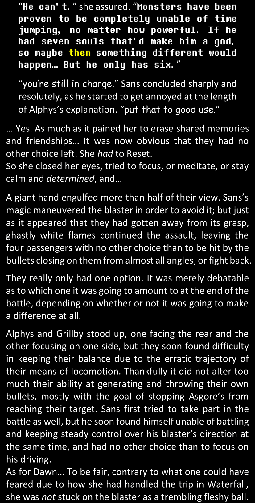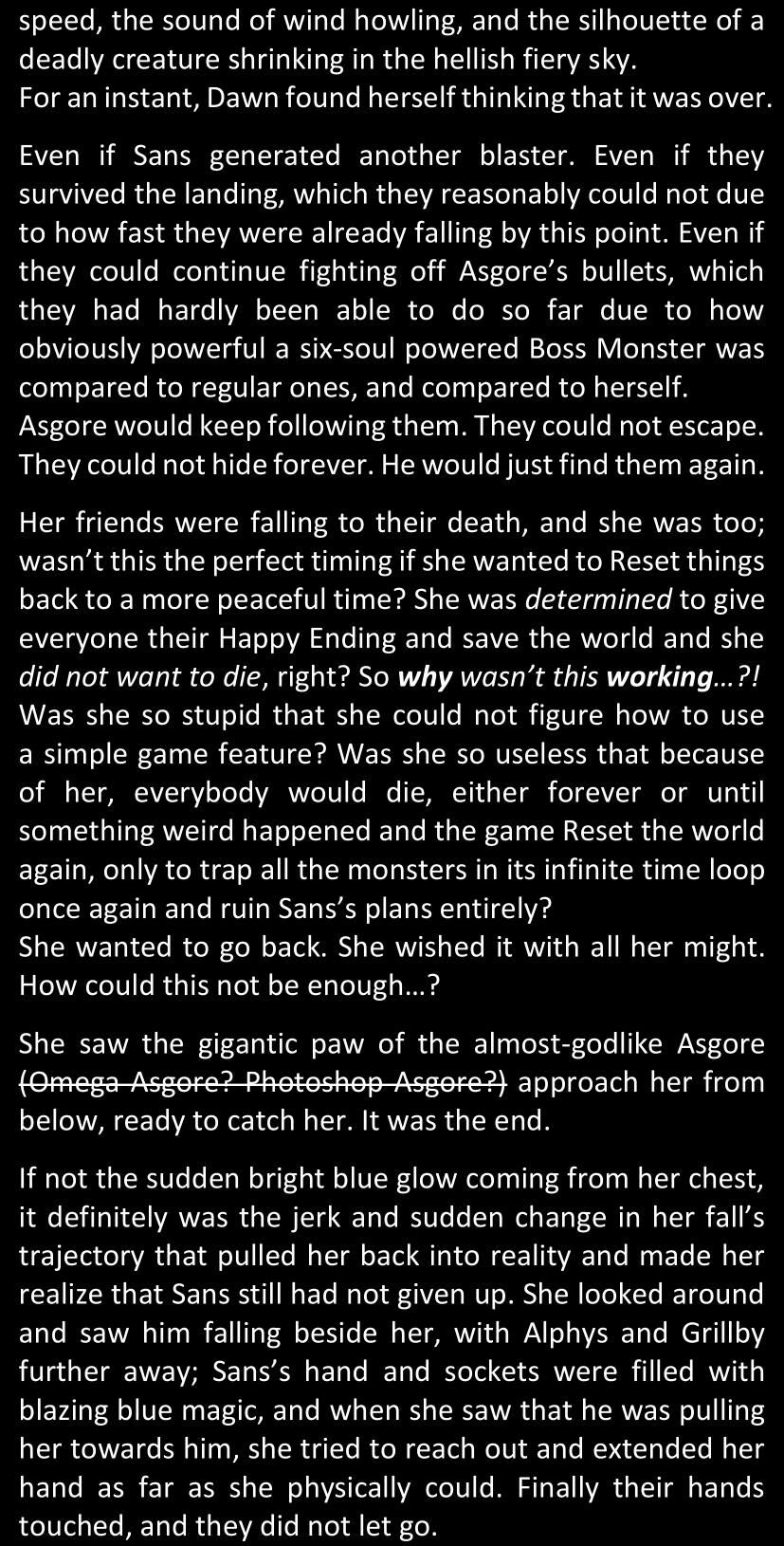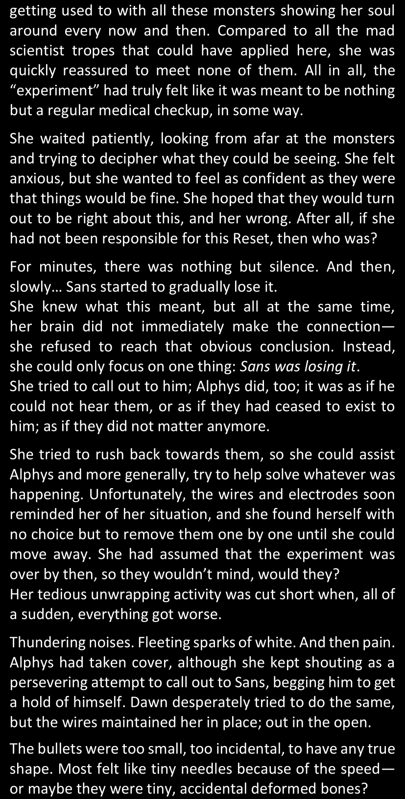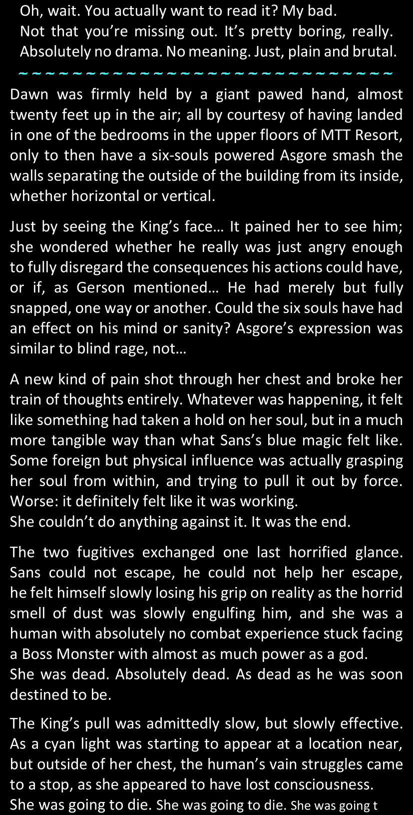 The narrator could spend a sentence or two pointing out that Sans was deliberately holding off on his shortcuts until the very last moment, even coming to Dawn by riding a blaster instead of just teleporting by her side. But it would be detrimental to linger on it, because most of the description for the fight is spent under Dawn’s perspective. She is starting to have a panic attack because of the current action and chaos reminding her of events from both chapters 9-11 and, even more vividly, the fact that Sans murdered Frisk just a few minutes earlier.
