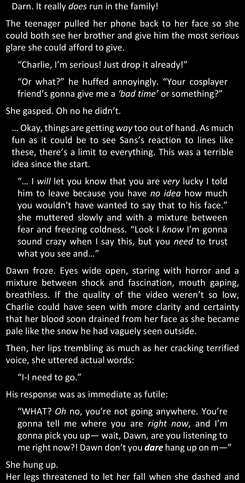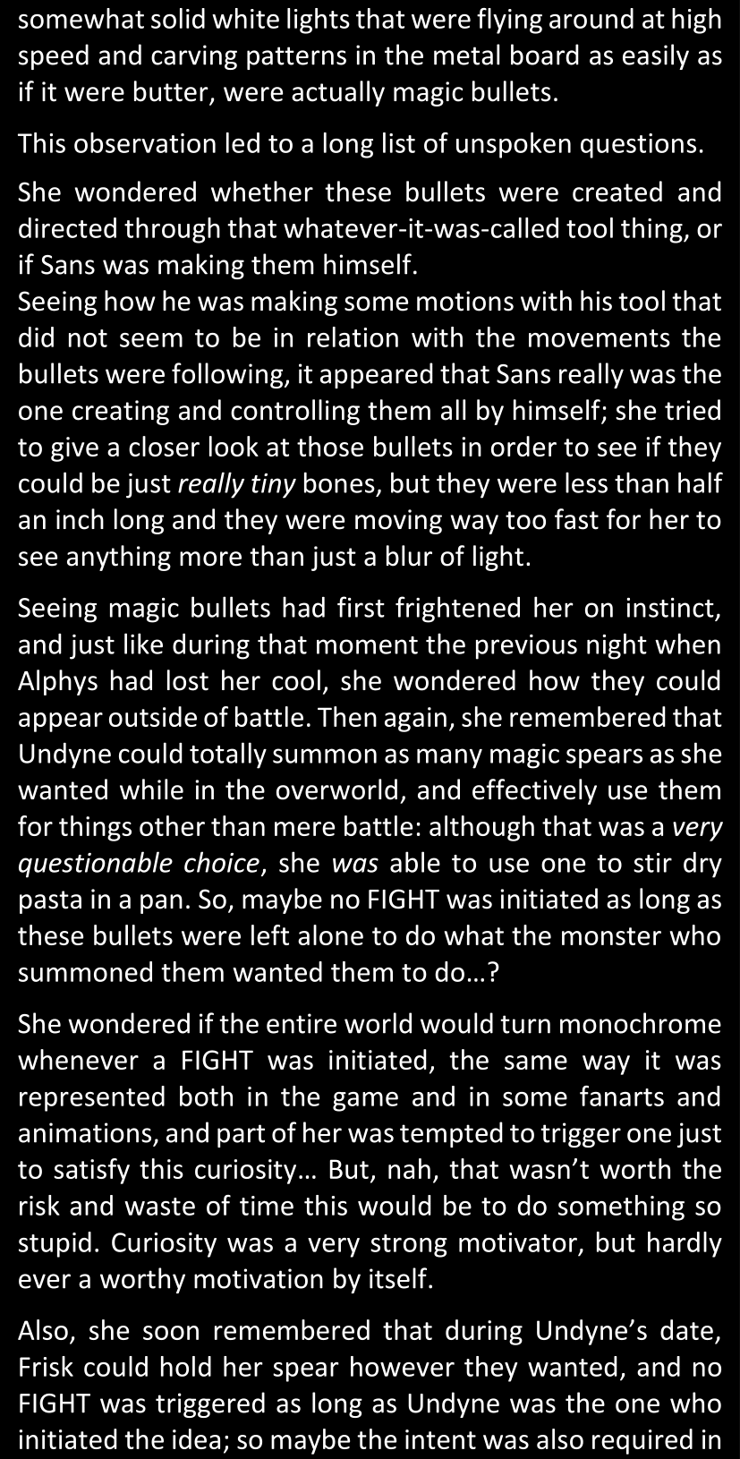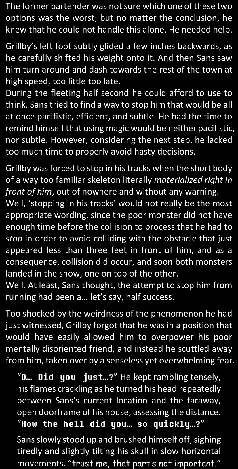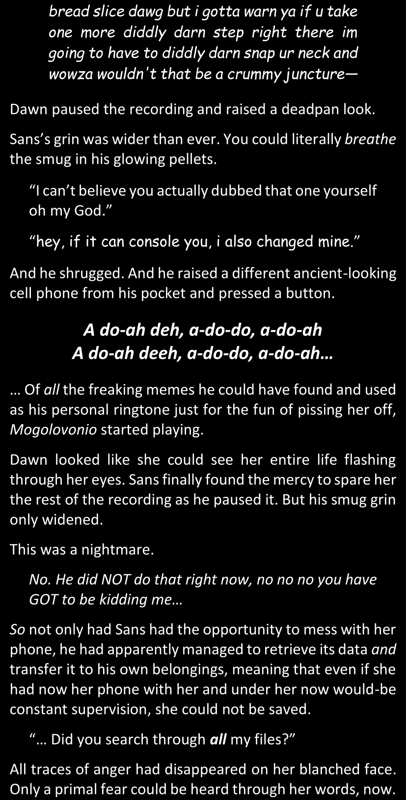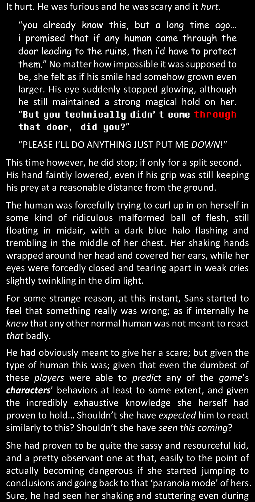 The narrator could spend a sentence or two pointing out that Sans was deliberately holding off on his shortcuts until the very last moment, even coming to Dawn by riding a blaster instead of just teleporting by her side. But it would be detrimental to linger on it, because most of the description for the fight is spent under Dawn’s perspective. She is starting to have a panic attack because of the current action and chaos reminding her of events from both chapters 9-11 and, even more vividly, the fact that Sans murdered Frisk just a few minutes earlier.