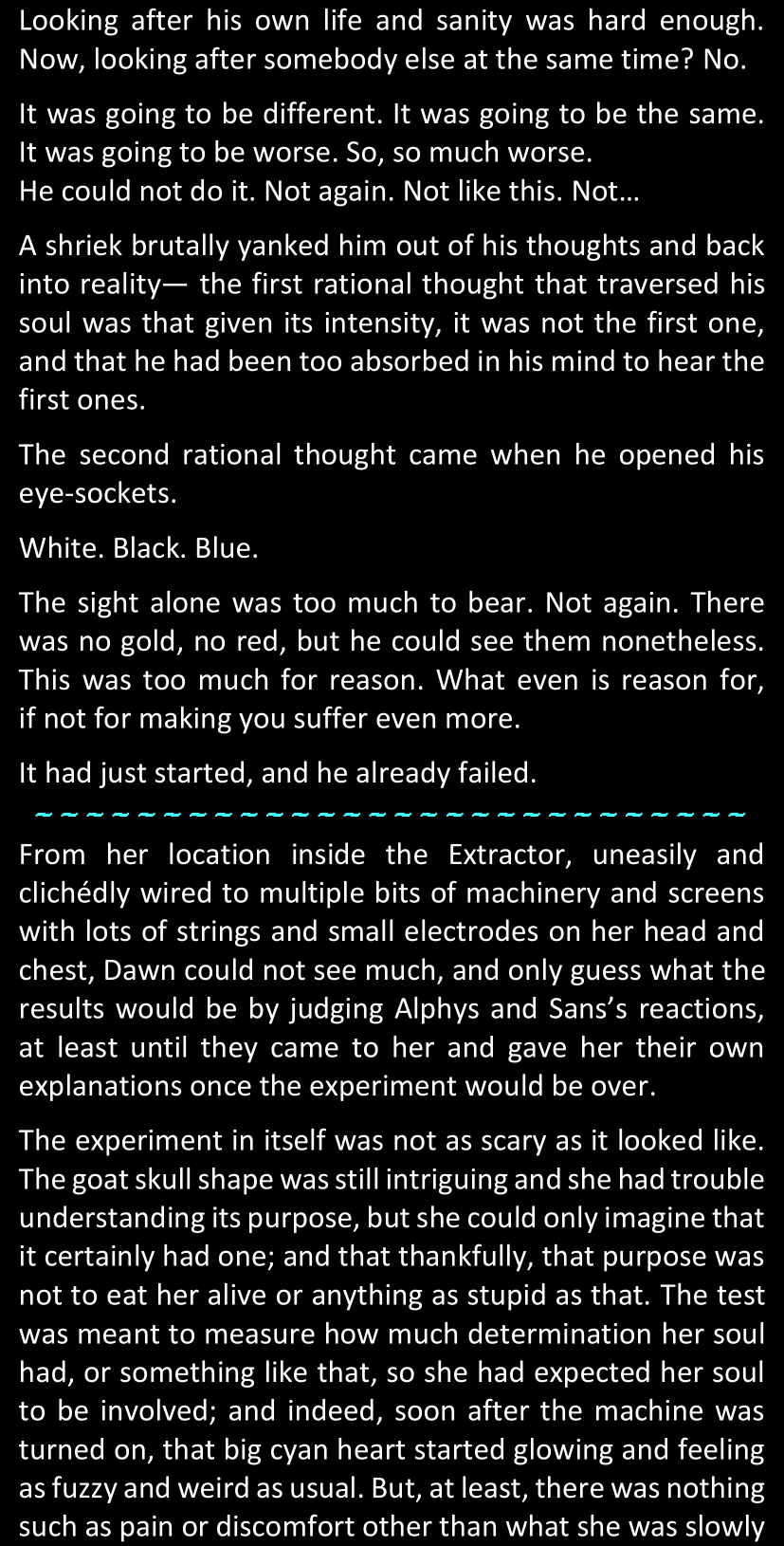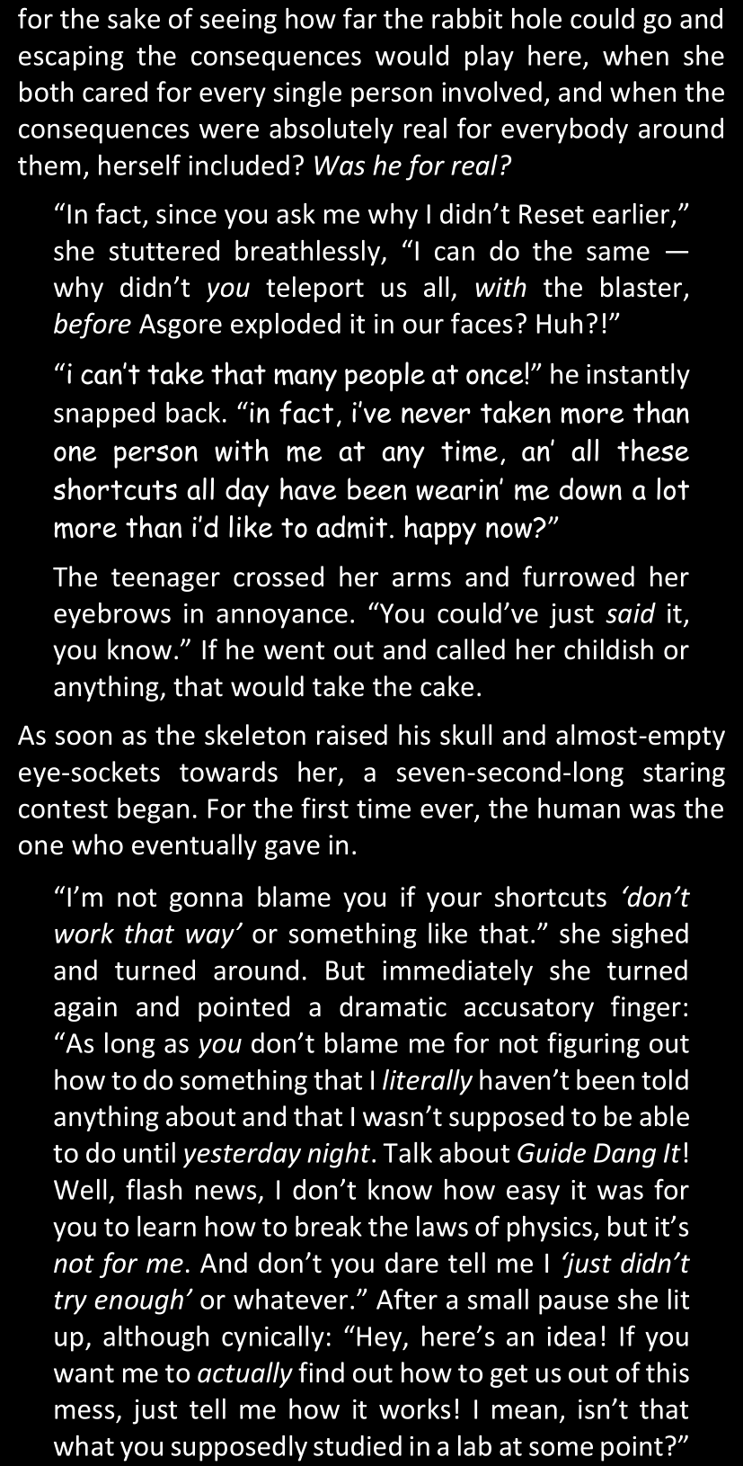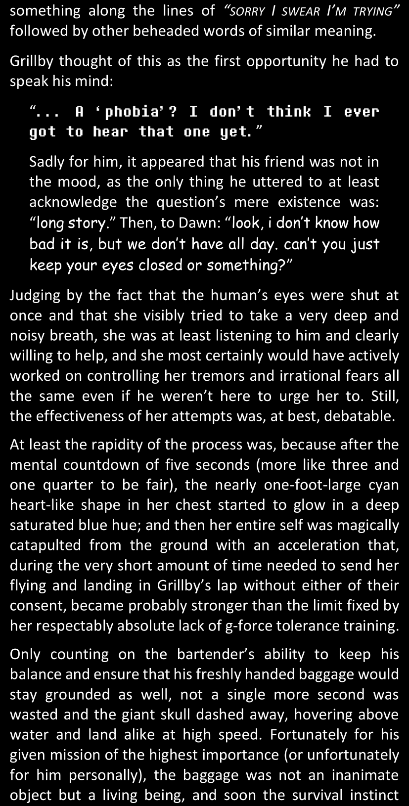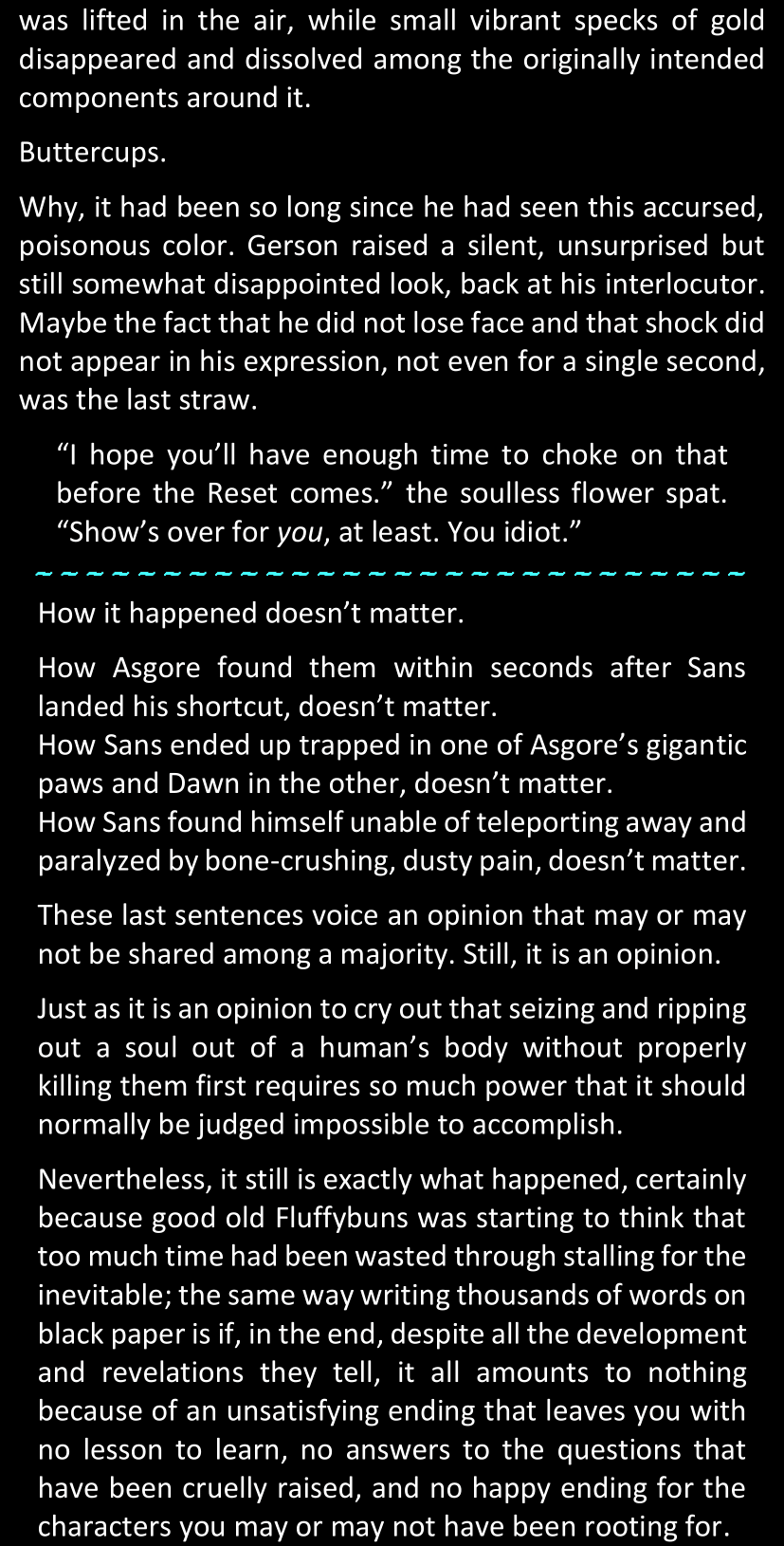 The narrator could spend a sentence or two pointing out that Sans was deliberately holding off on his shortcuts until the very last moment, even coming to Dawn by riding a blaster instead of just teleporting by her side. But it would be detrimental to linger on it, because most of the description for the fight is spent under Dawn’s perspective. She is starting to have a panic attack because of the current action and chaos reminding her of events from both chapters 9-11 and, even more vividly, the fact that Sans murdered Frisk just a few minutes earlier.