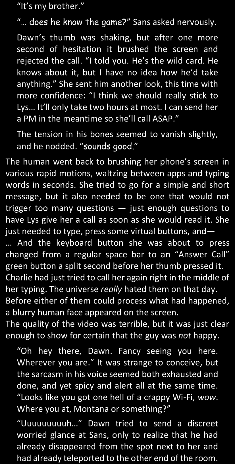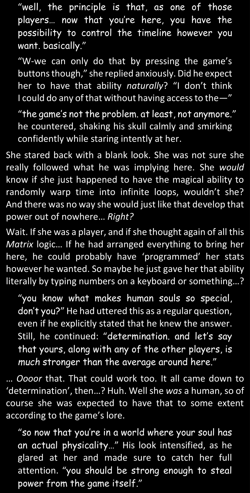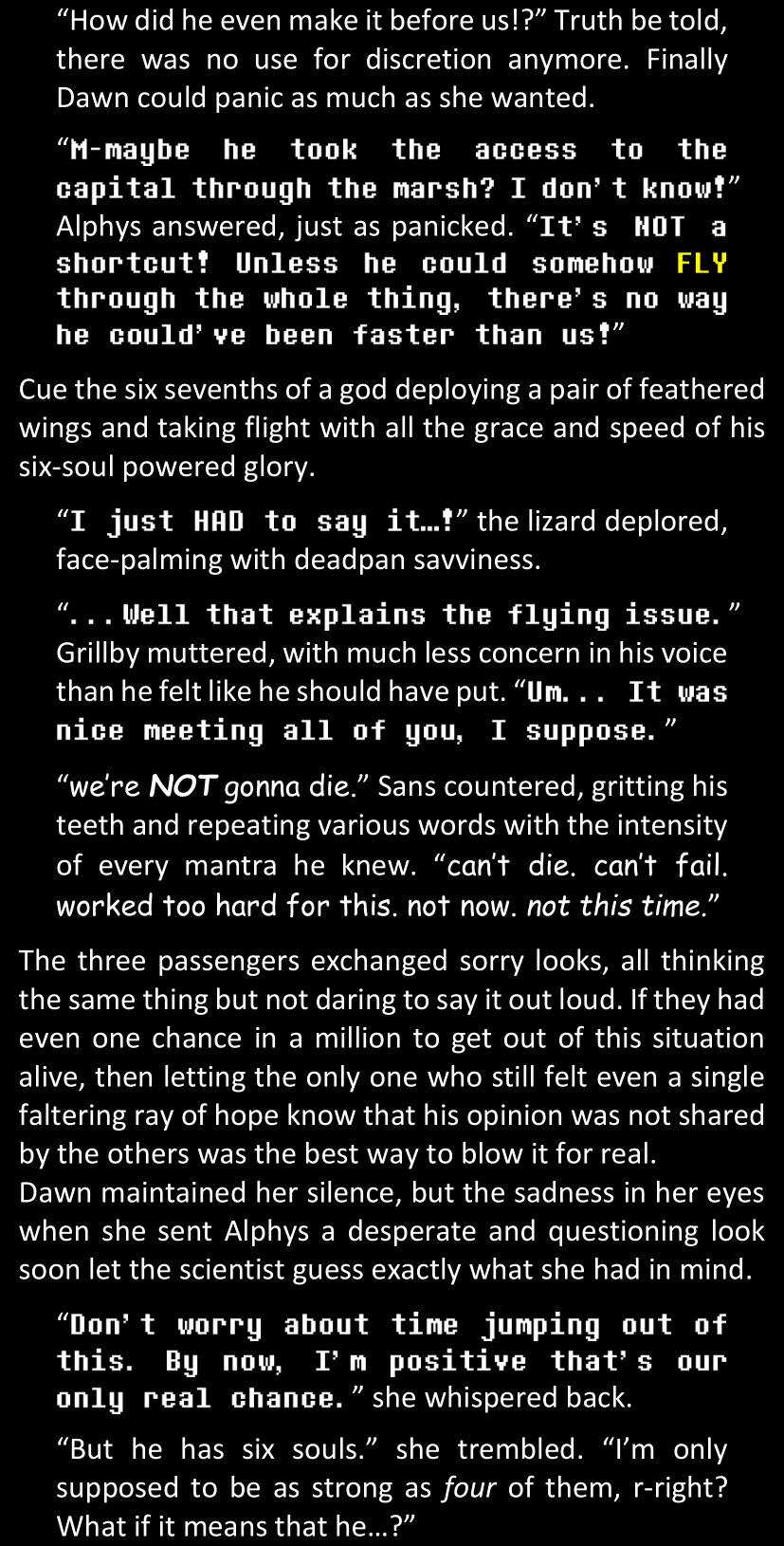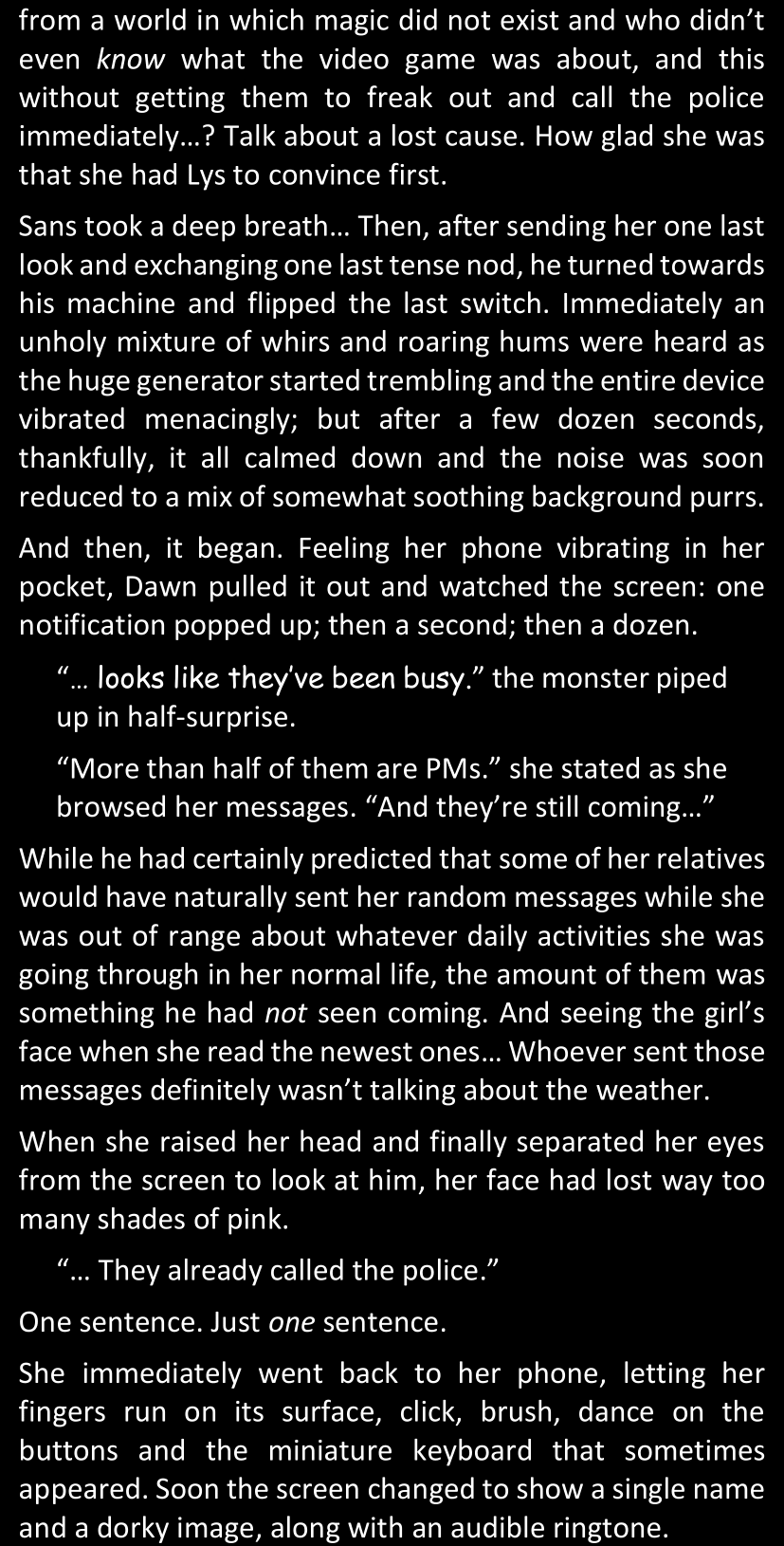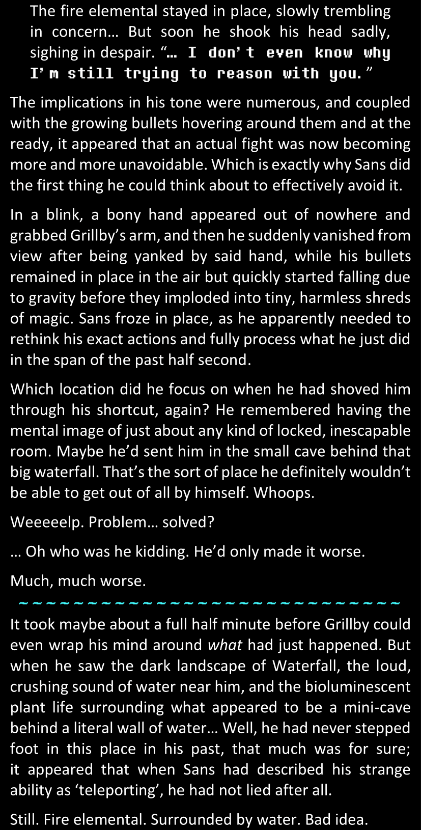 The narrator could spend a sentence or two pointing out that Sans was deliberately holding off on his shortcuts until the very last moment, even coming to Dawn by riding a blaster instead of just teleporting by her side. But it would be detrimental to linger on it, because most of the description for the fight is spent under Dawn’s perspective. She is starting to have a panic attack because of the current action and chaos reminding her of events from both chapters 9-11 and, even more vividly, the fact that Sans murdered Frisk just a few minutes earlier.