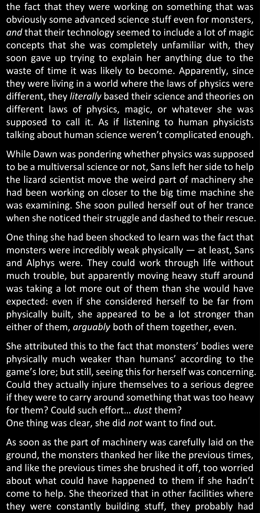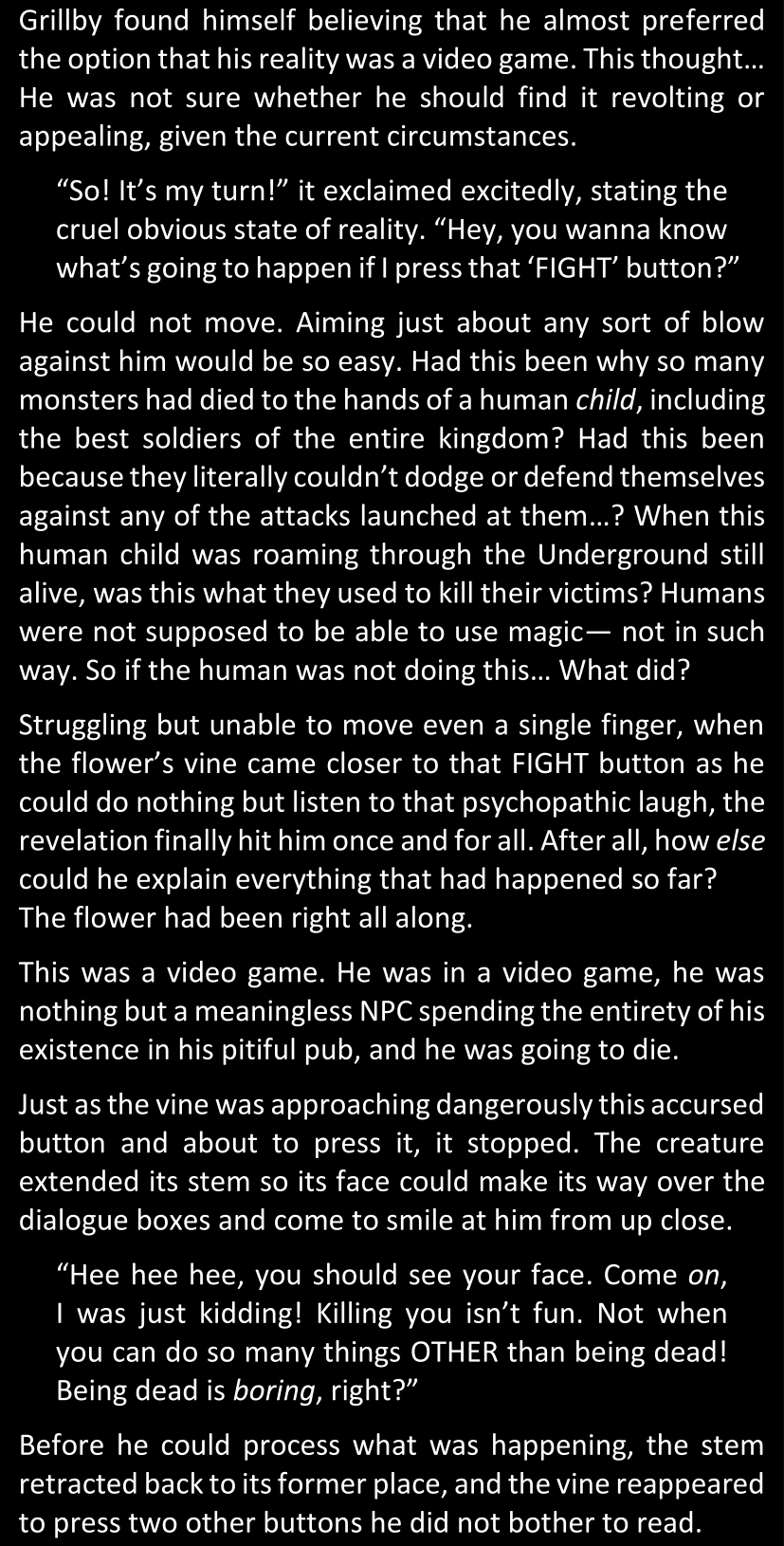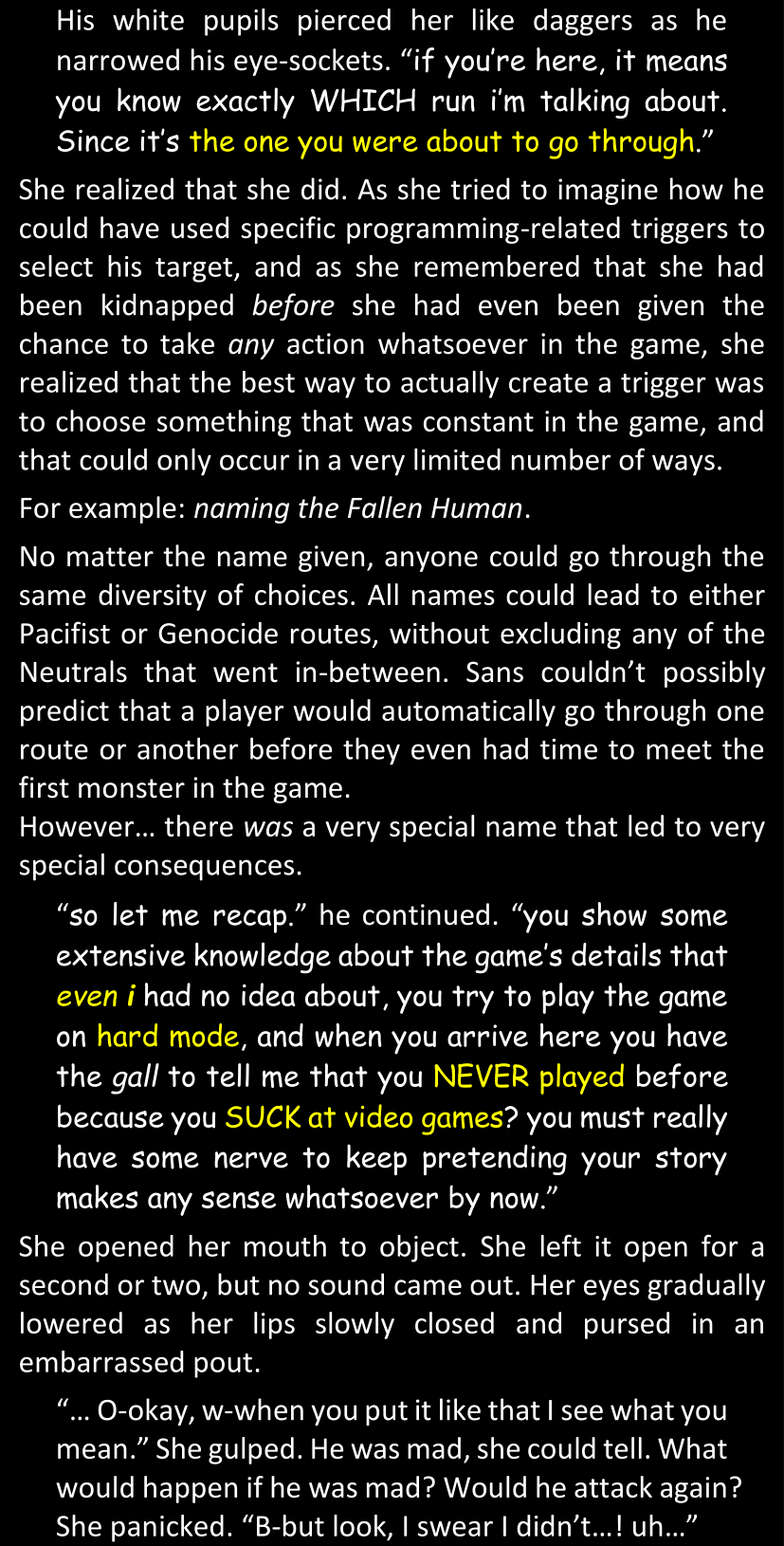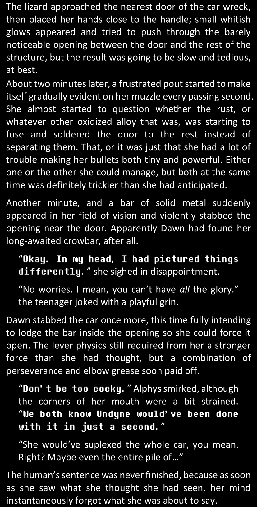 The narrator could spend a sentence or two pointing out that Sans was deliberately holding off on his shortcuts until the very last moment, even coming to Dawn by riding a blaster instead of just teleporting by her side. But it would be detrimental to linger on it, because most of the description for the fight is spent under Dawn’s perspective. She is starting to have a panic attack because of the current action and chaos reminding her of events from both chapters 9-11 and, even more vividly, the fact that Sans murdered Frisk just a few minutes earlier.