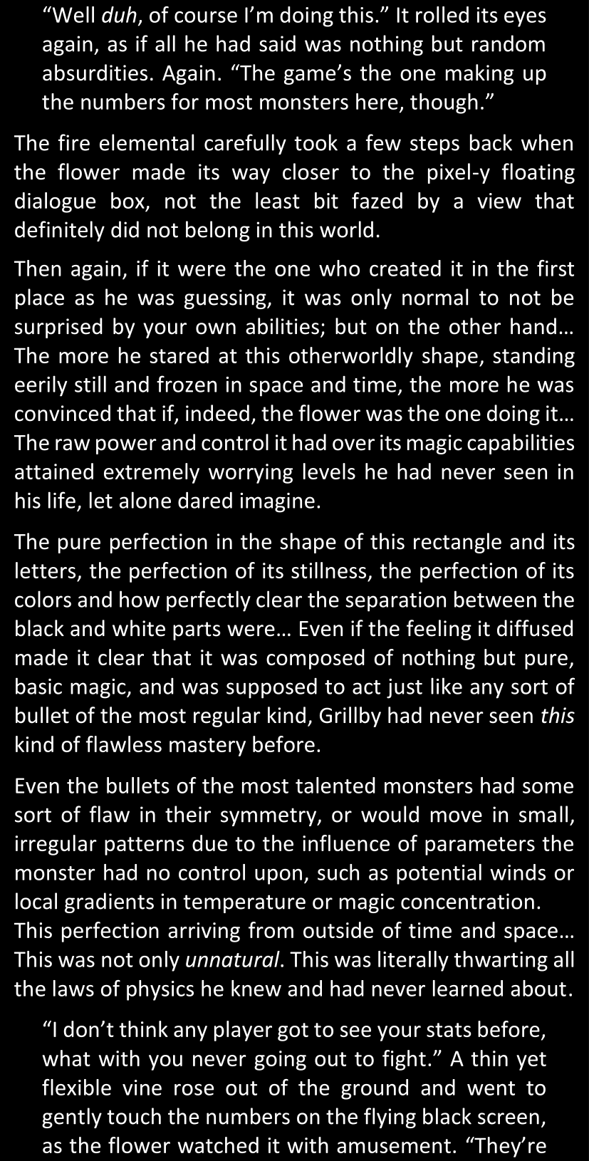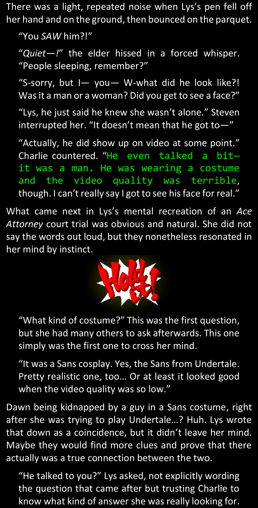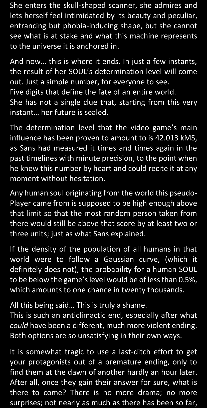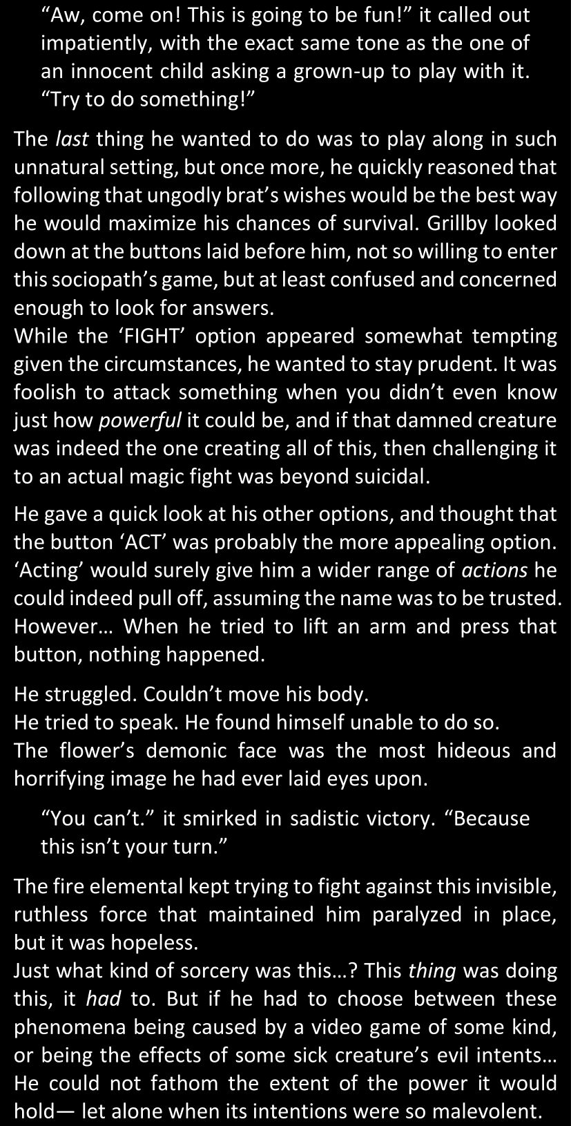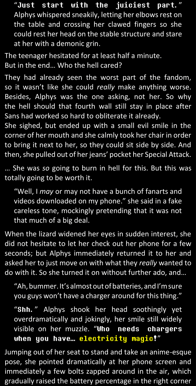 The narrator could spend a sentence or two pointing out that Sans was deliberately holding off on his shortcuts until the very last moment, even coming to Dawn by riding a blaster instead of just teleporting by her side. But it would be detrimental to linger on it, because most of the description for the fight is spent under Dawn’s perspective. She is starting to have a panic attack because of the current action and chaos reminding her of events from both chapters 9-11 and, even more vividly, the fact that Sans murdered Frisk just a few minutes earlier.