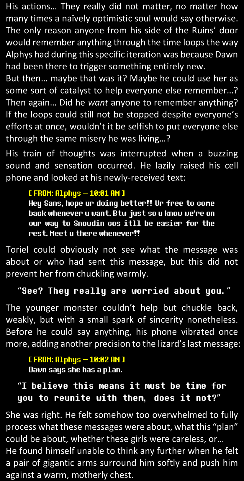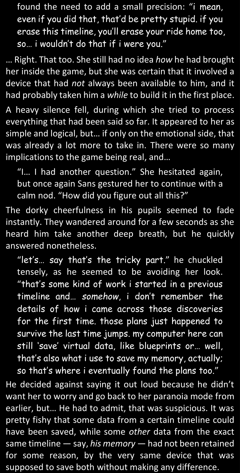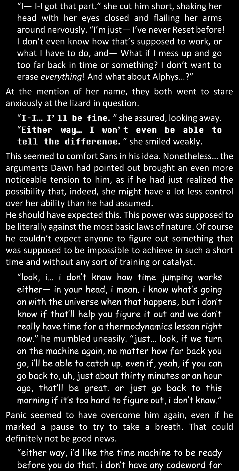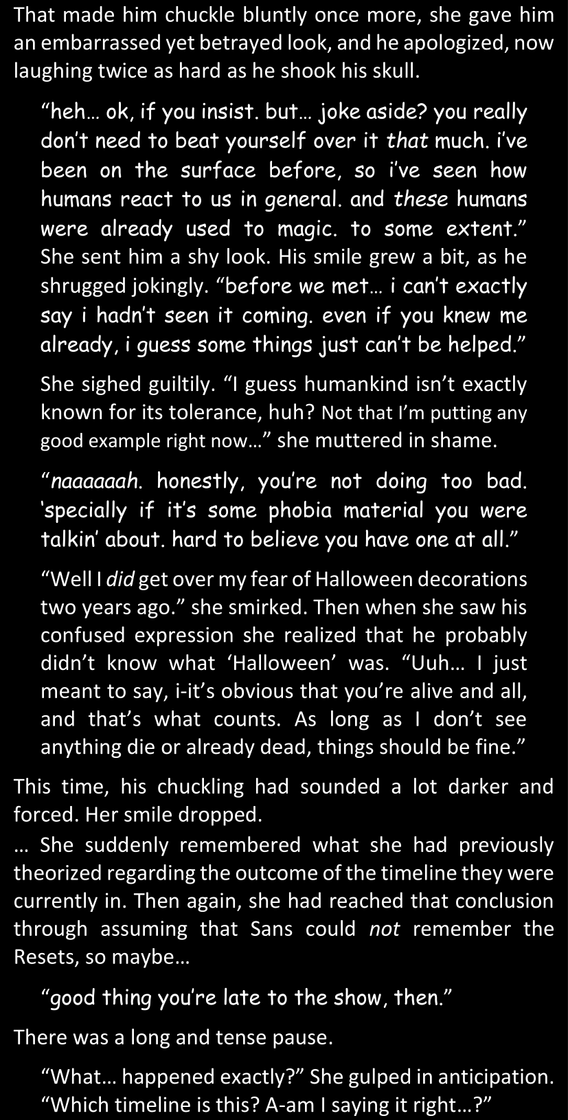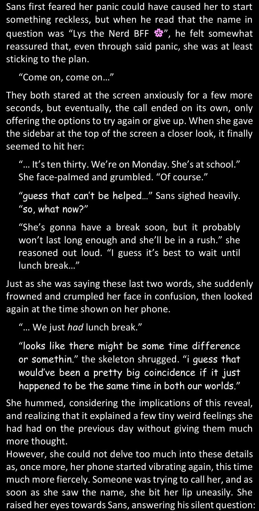 When Sans finally gets to see Dawn’s phone, he sees that the time it shows is still that of her original world… and he realizes that from her perspective, since she is the only one who is not affected by the Resets at all, she actually has been awake and running through stressful situations for more than twenty-four hours straight. He suddenly understands a lot more why she was so exhausted and emotionally unstable.